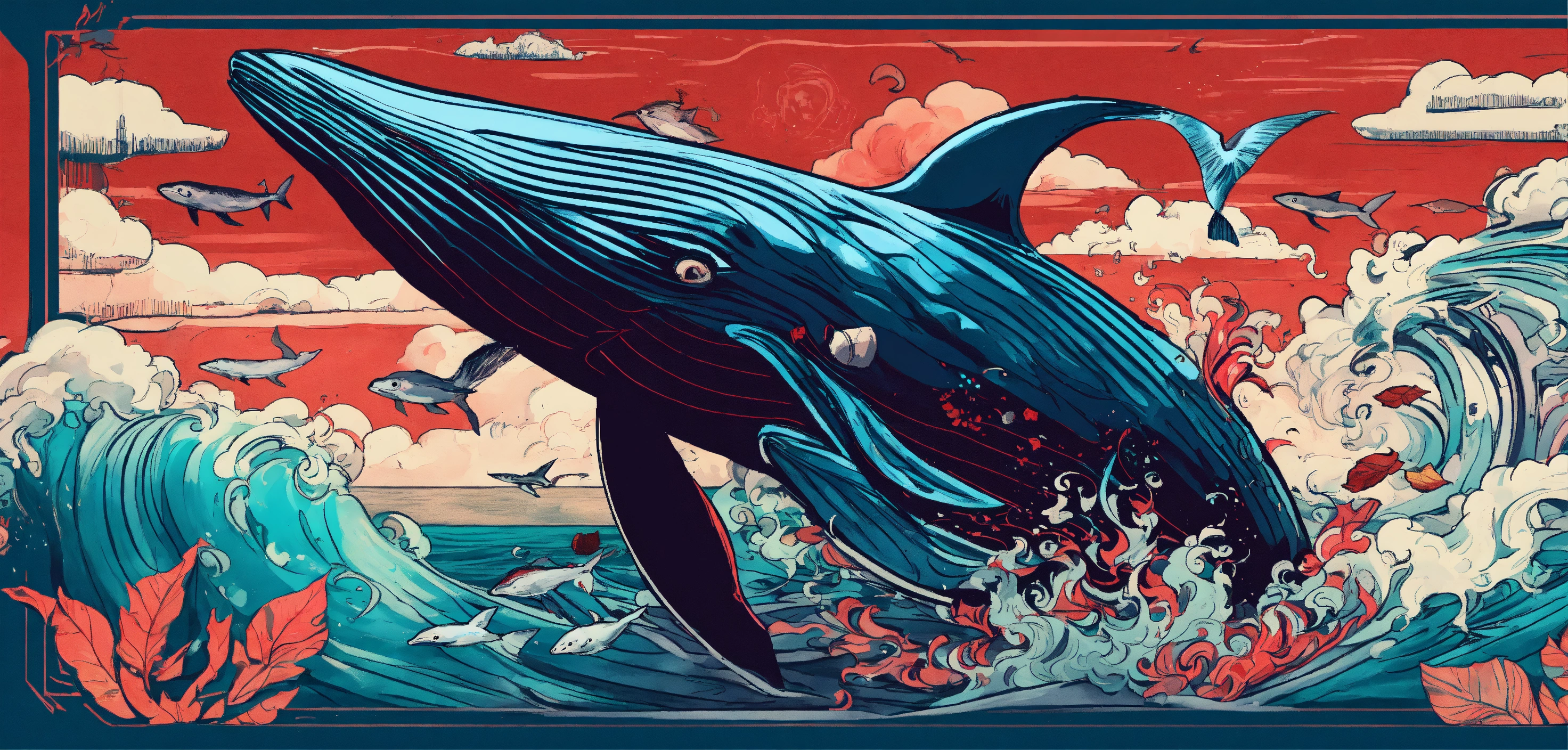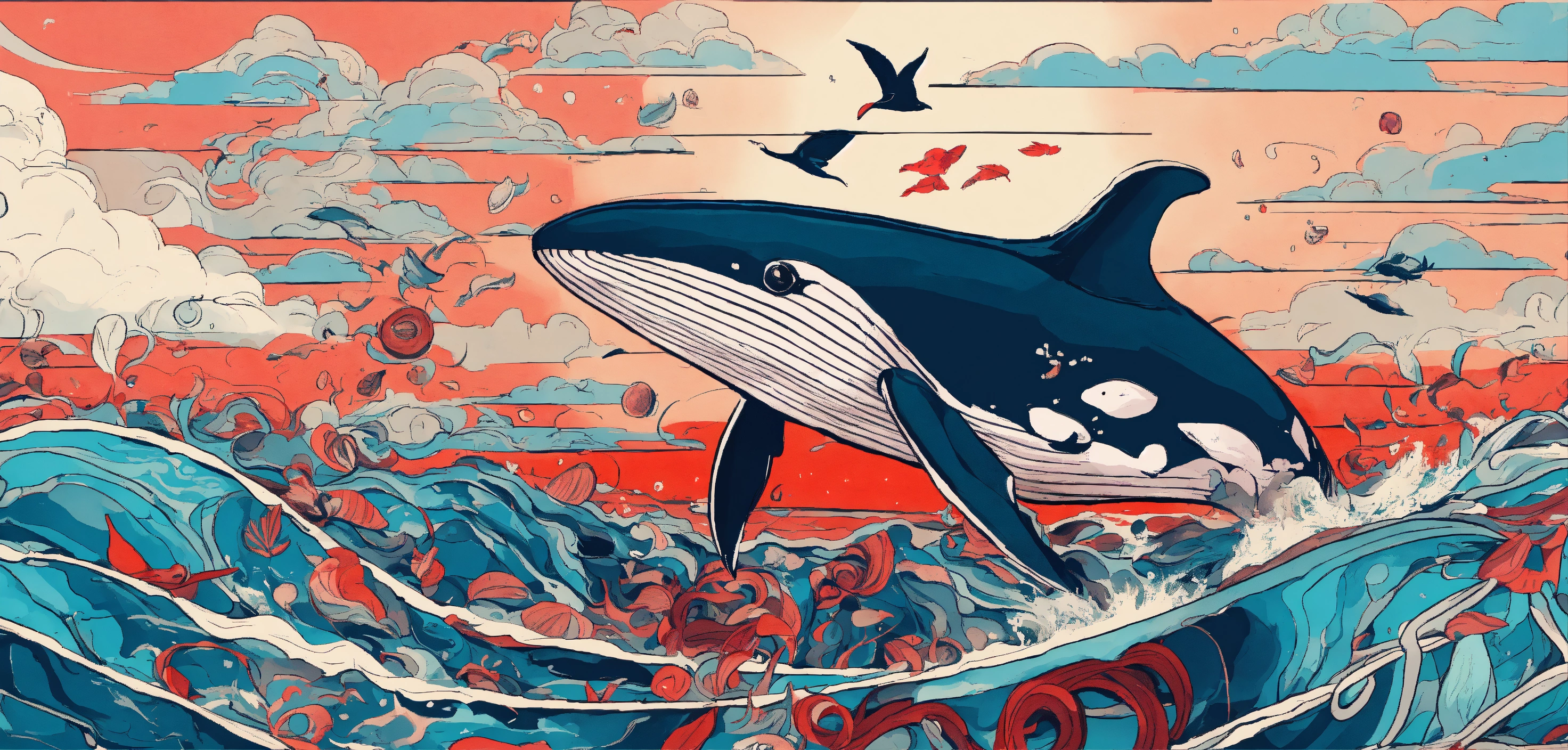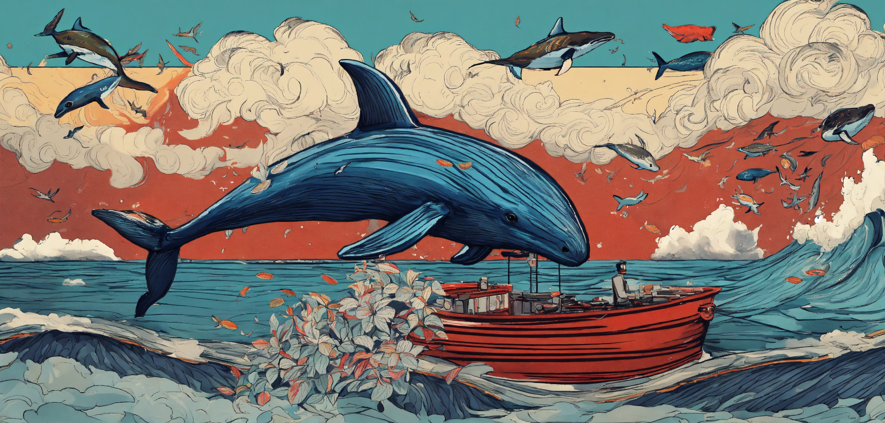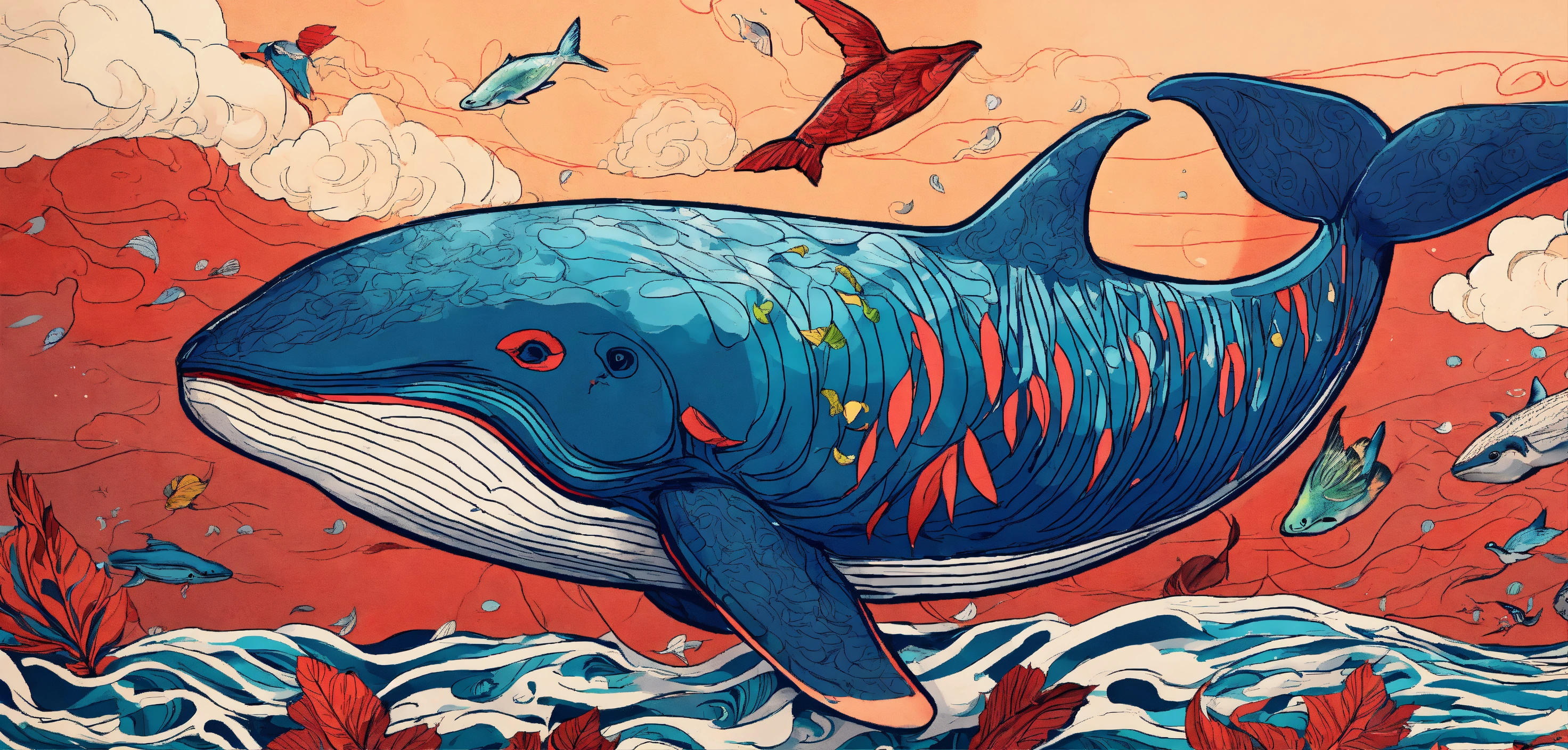 High details, bits of color, bet casino chips, hand drawn, red, gritty, realistic sketch, rough sketch, mix of bold dark lines and loose lines, bold lines, on paper, waves and clouds, whale, flying fishes with bird wings, leafs