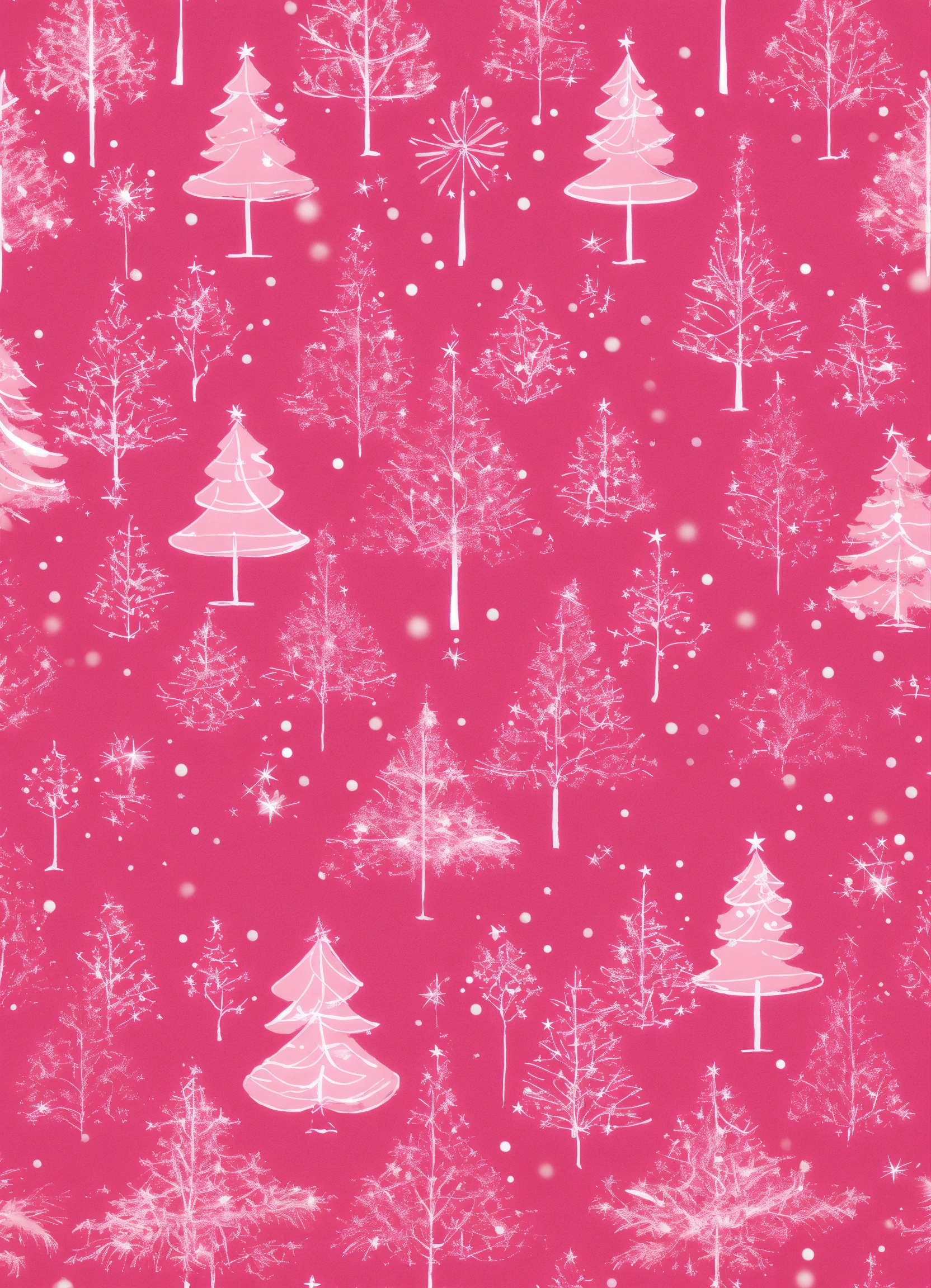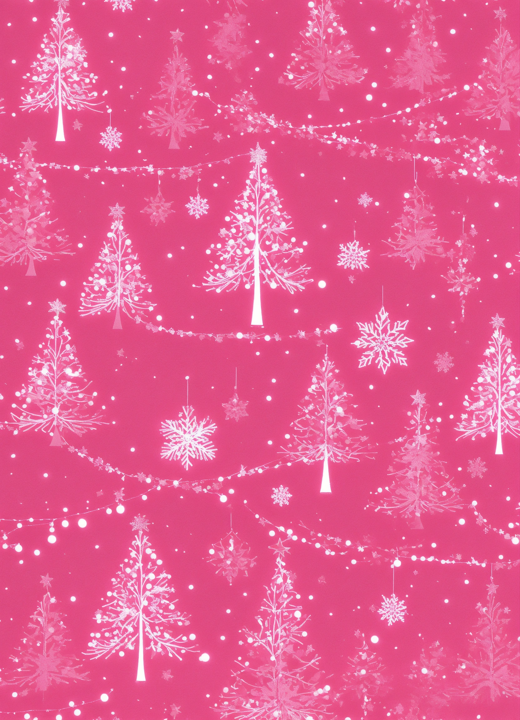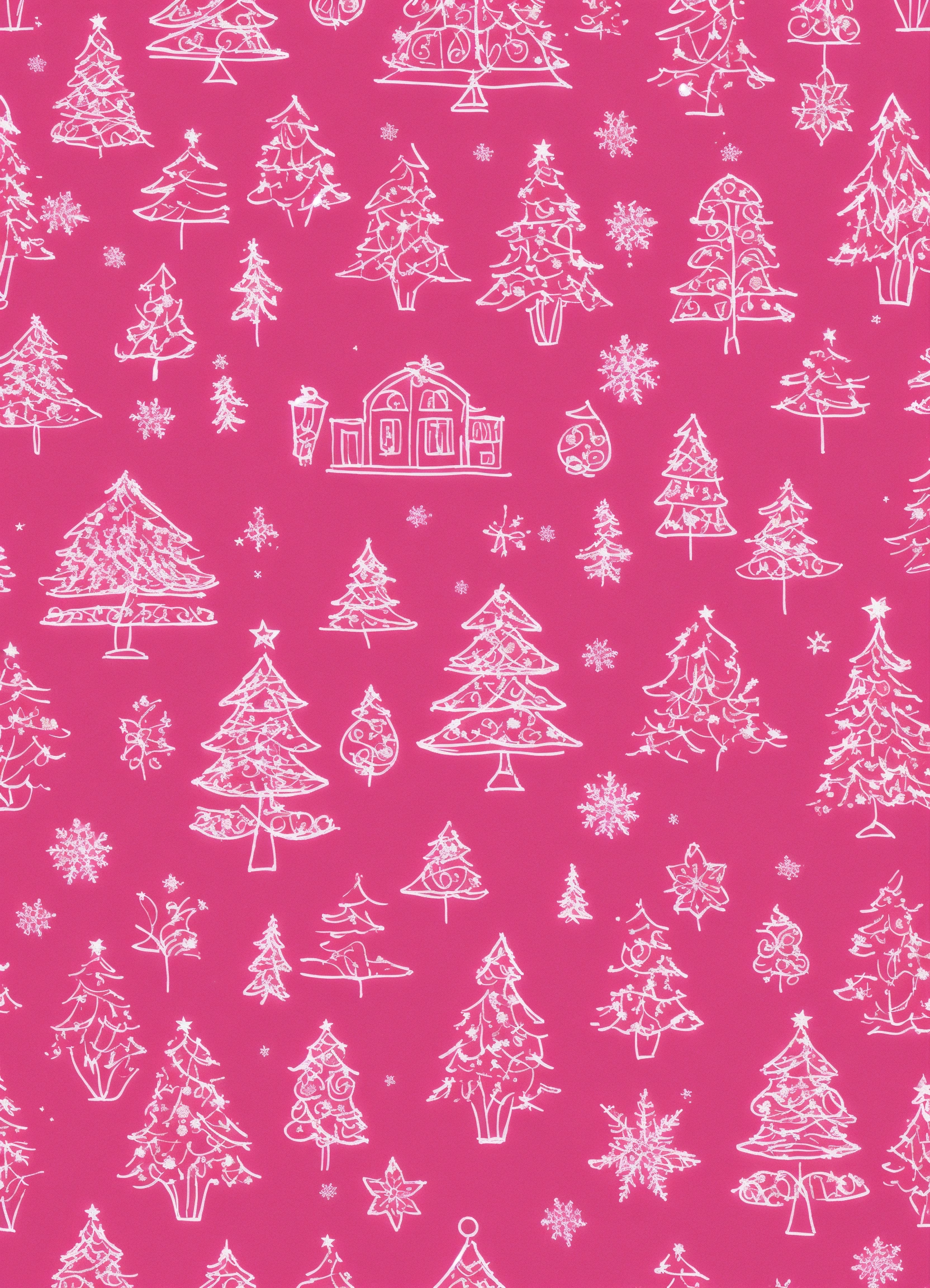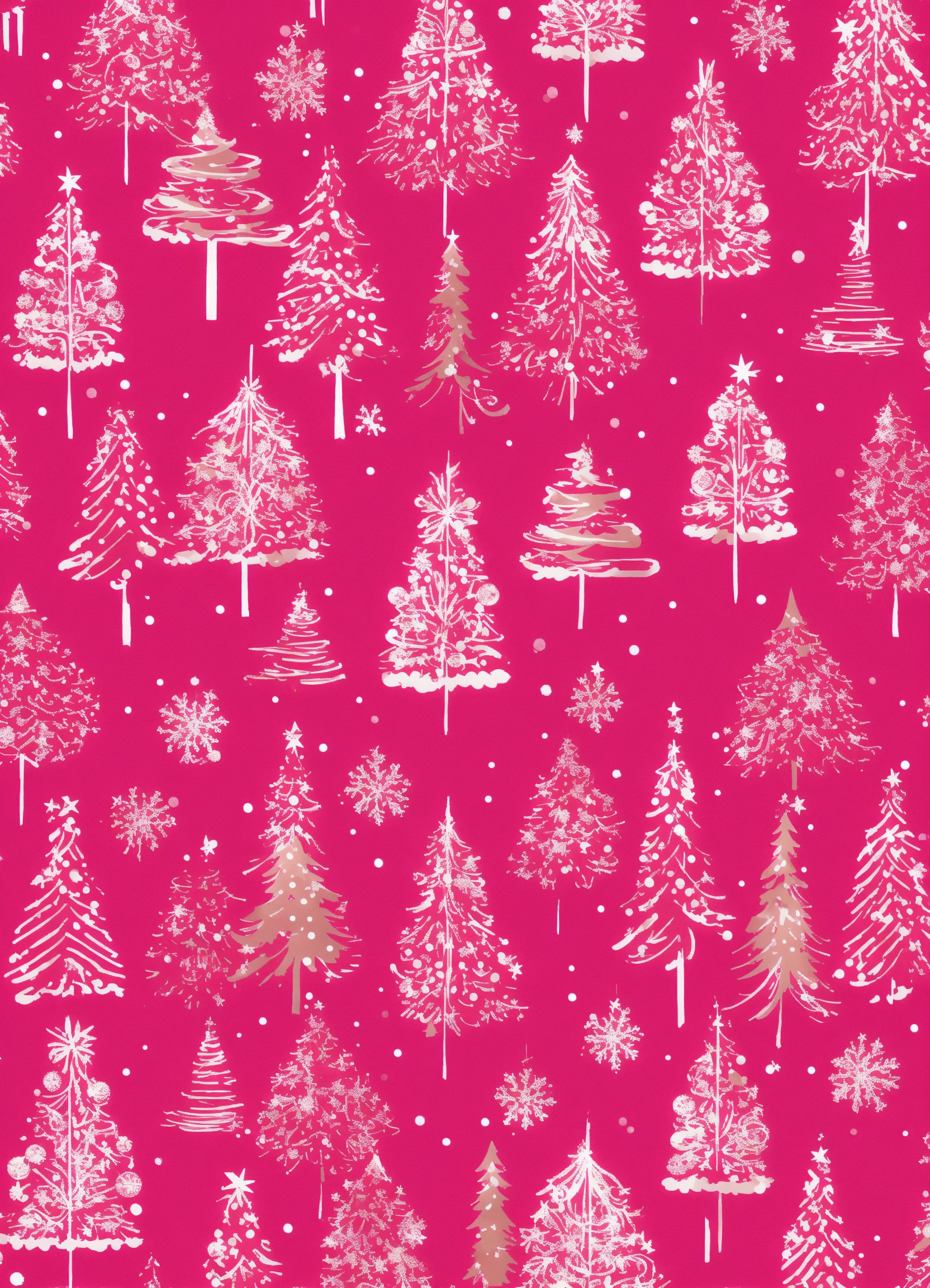 Create seamless gift wrapping paper. everything luxury, high end and elegant, on a vibrant pink background christmas scene unfolds. christmas tree, adorned with a classic pattern, takes center stage. the tree features elegant branches and is decorated with sparkling ornaments that catch the light. positioned towards the middle of the image, the tree's height and shape create a focal point pink background enhances the festive atmosphere, adding a touch of cheer and playfulness to the scene. the bright color provides a striking contrast to the silhouettes in earthy tones. the christmas tree is not the only one in this joyful display, as smaller versions are found throughout the image. scattered across the pink background, the pink background, with its warm and inviting hue, evokes a sense of joy and celebration. it envelops the entire image, filling it with a merry and lighthearted atmosphere. the choice of pink as the backdrop adds a modern twist to