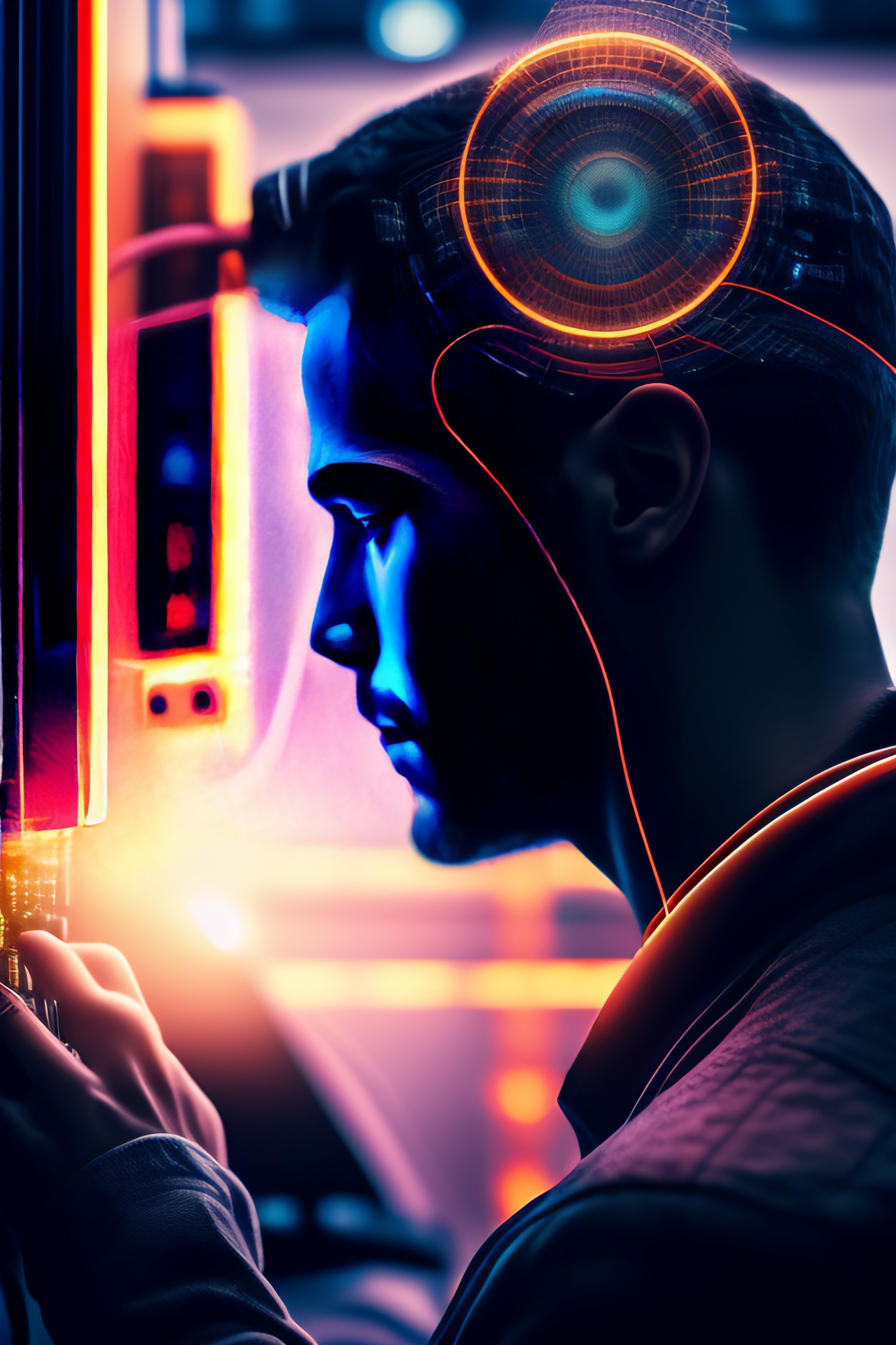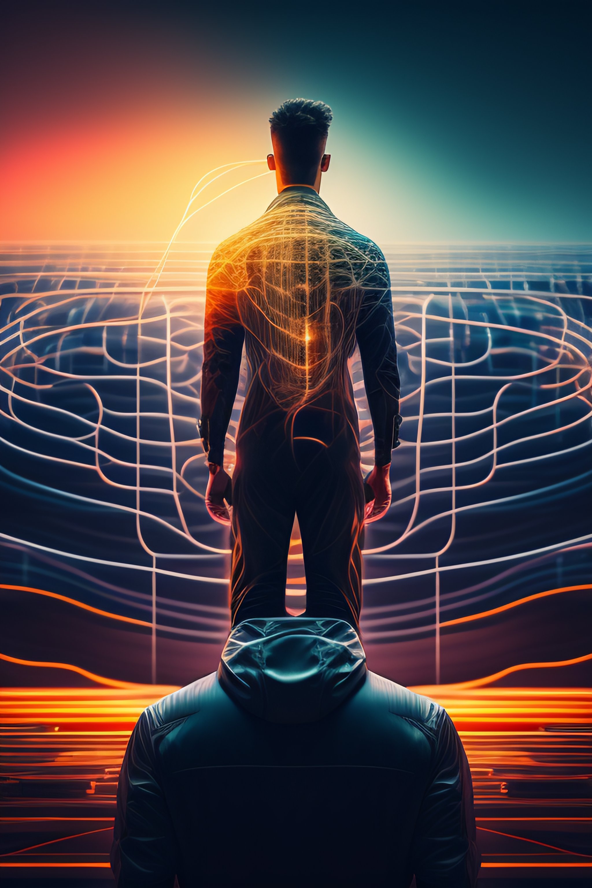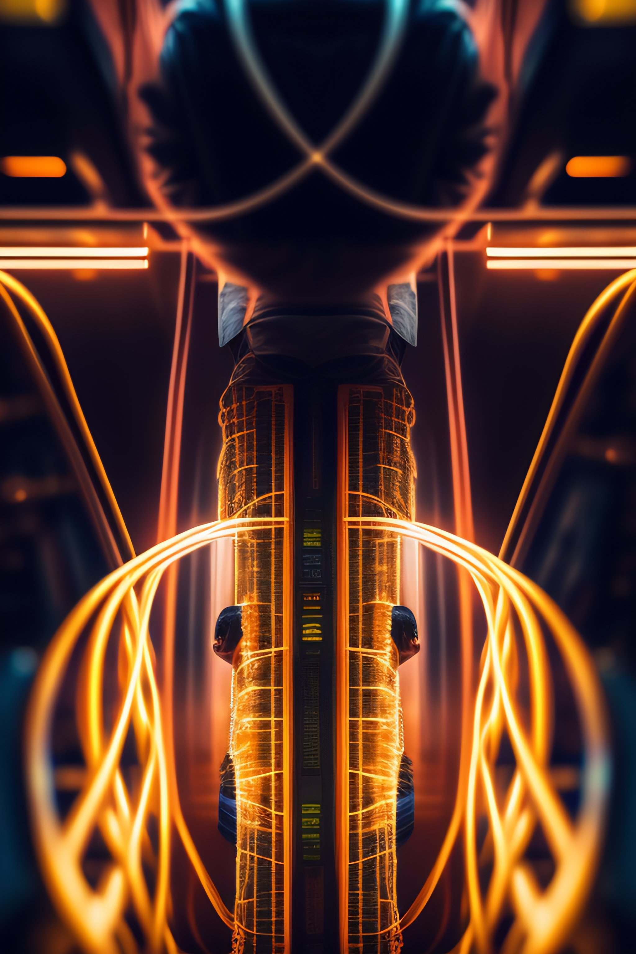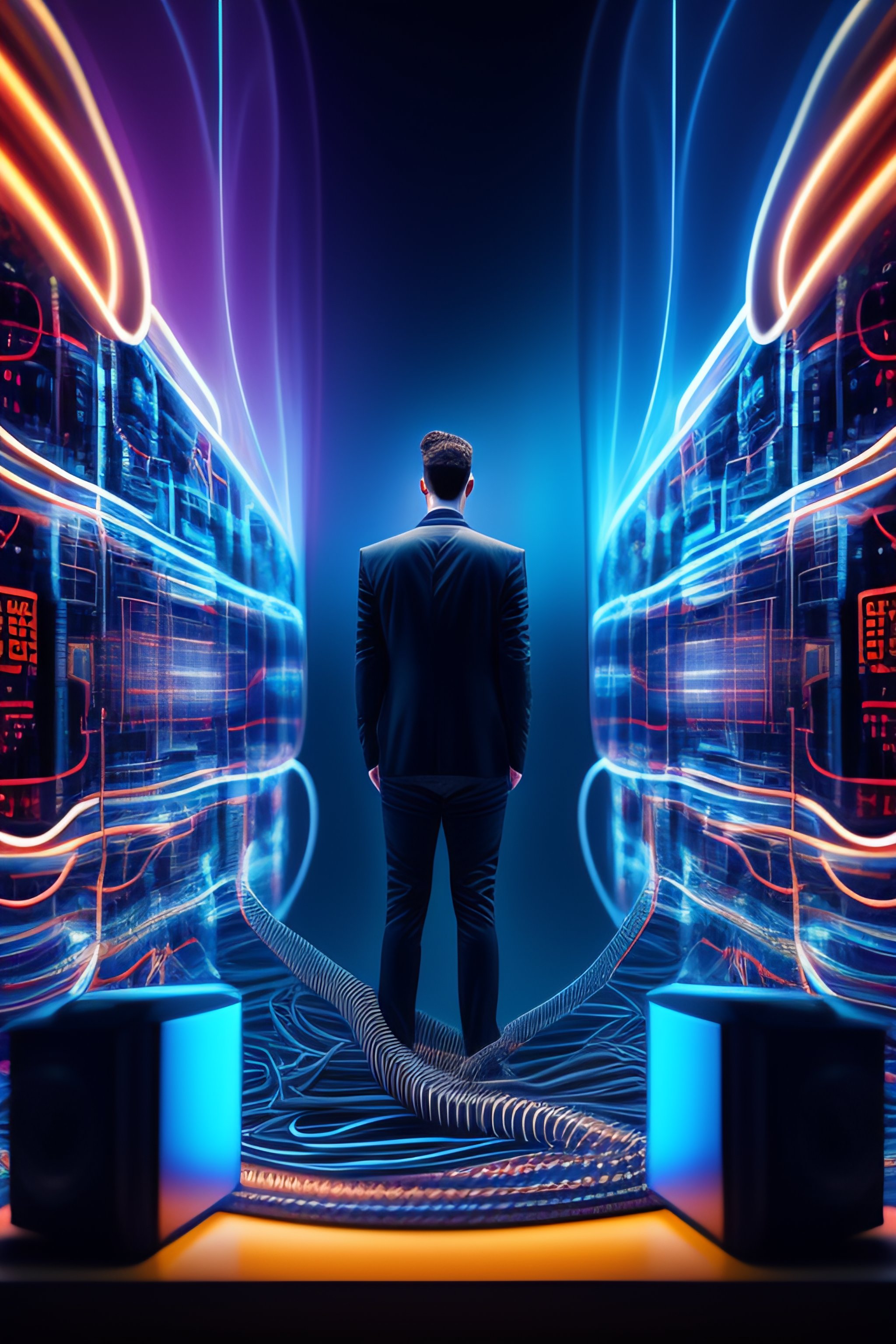 "this dynamic image captures a man in the midst of a technological frenzy. the man is shown standing within a towering computer tower, surrounded by a tangle of wires and cables. the cables snake around his feet and up his body, seeming to pulse with energy. the man's face is contorted in concentration, his eyes narrowed as he peers into the depths of the computer. his hands are outstretched, as if he is trying to connect with the machine on a deeper level. the overall effect is one of intense focus and connection, as if the man is lost in a world of data and code. the high-resolution details and skillful rendering of the image bring the scene to life, making it a true work of art. whether you appreciate technology or simply appreciate the beauty of the human form, this image is sure to captivate and inspire."