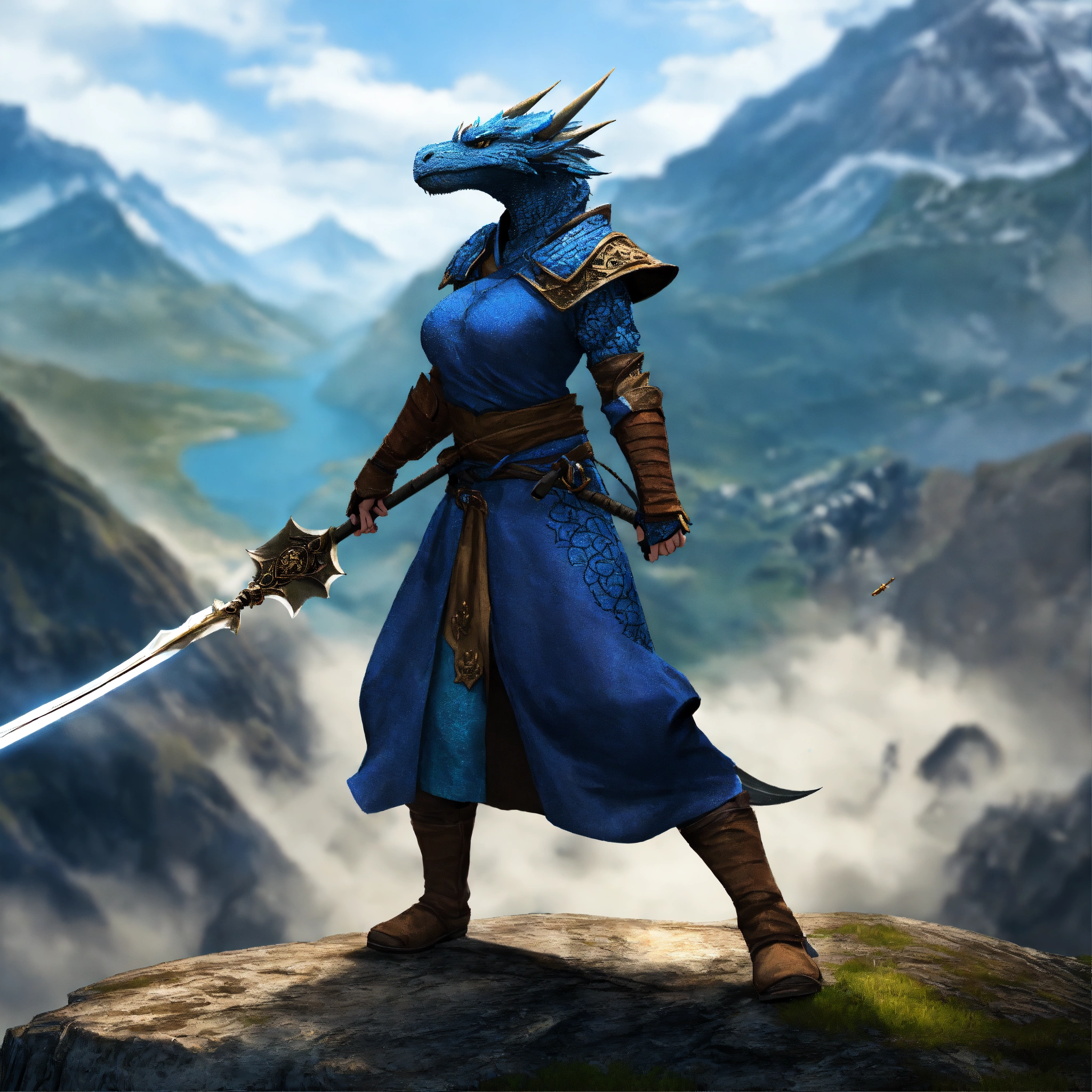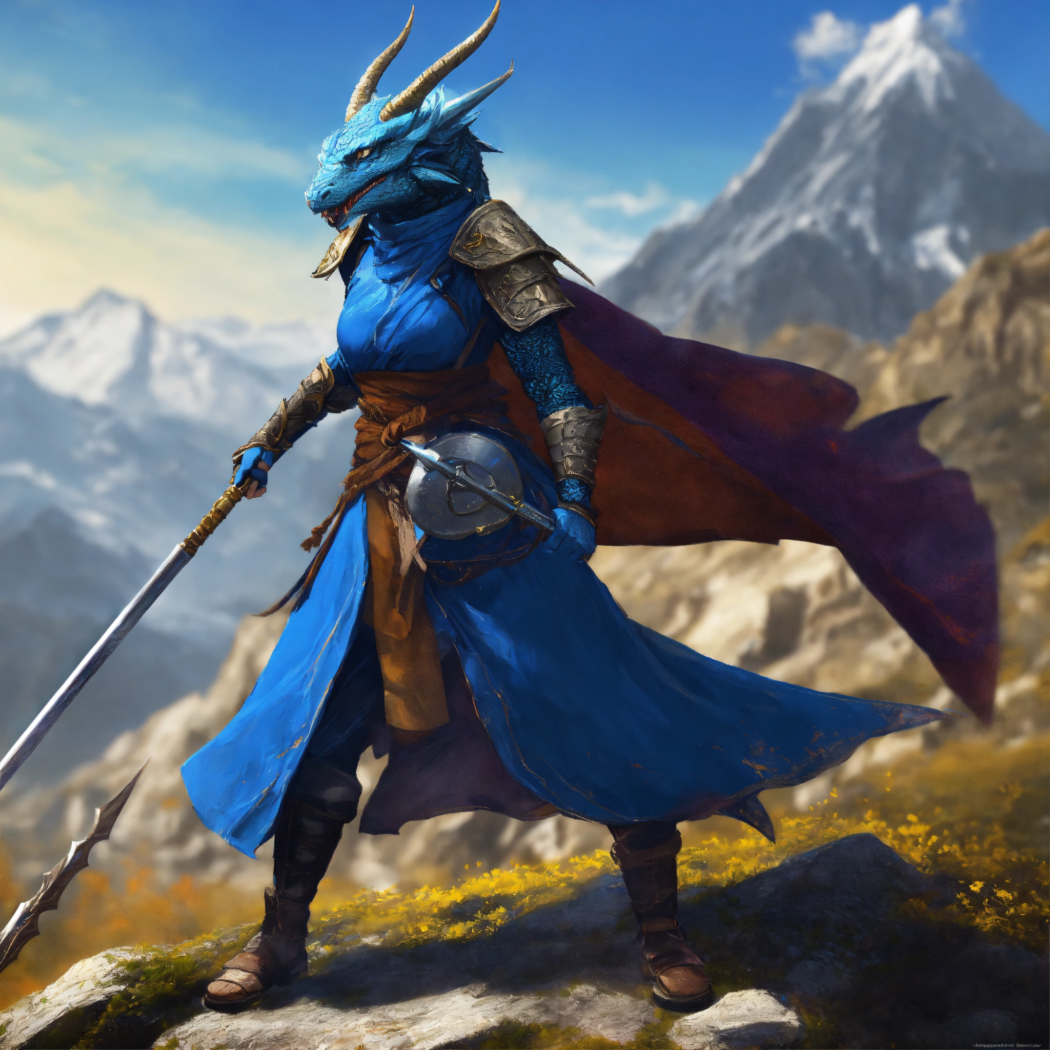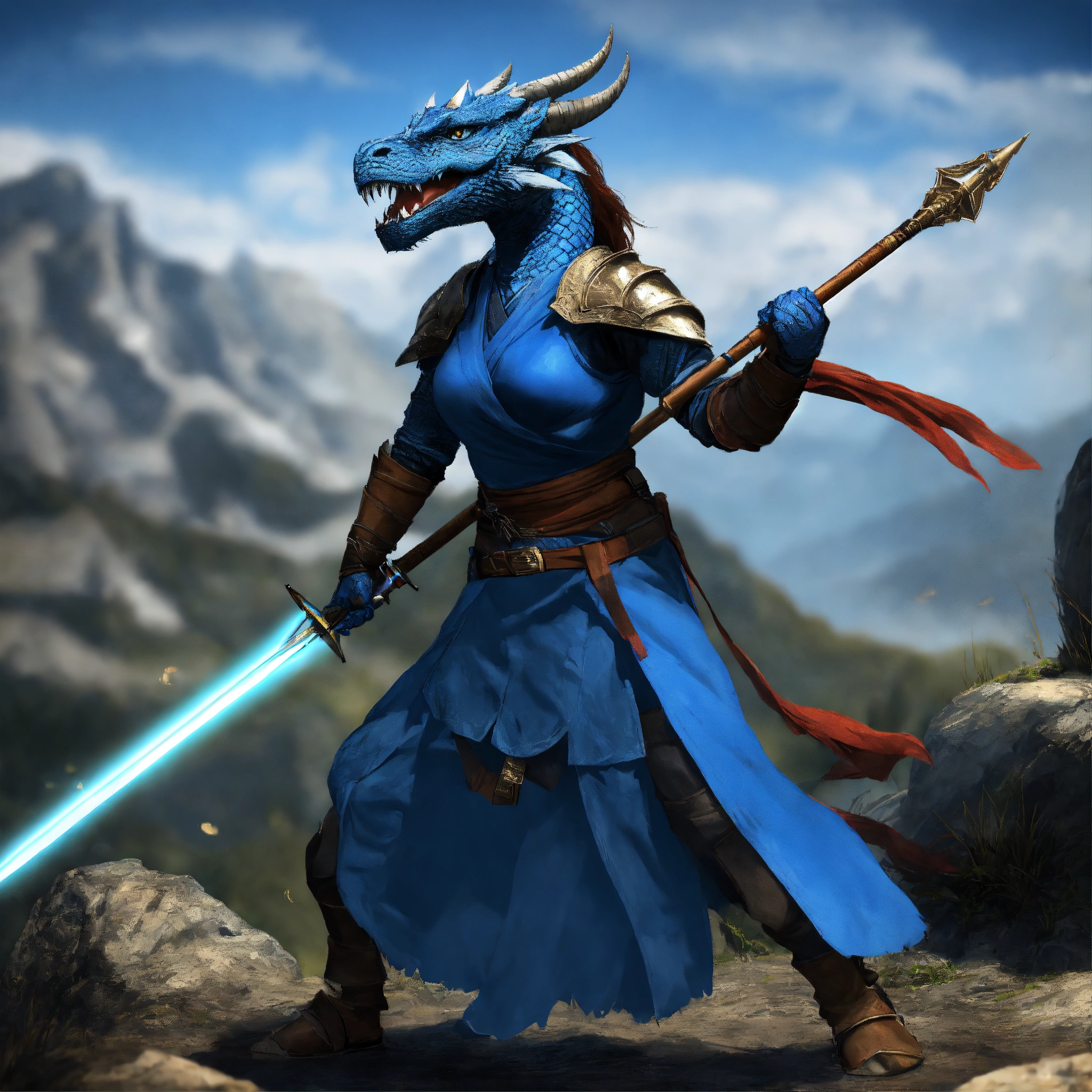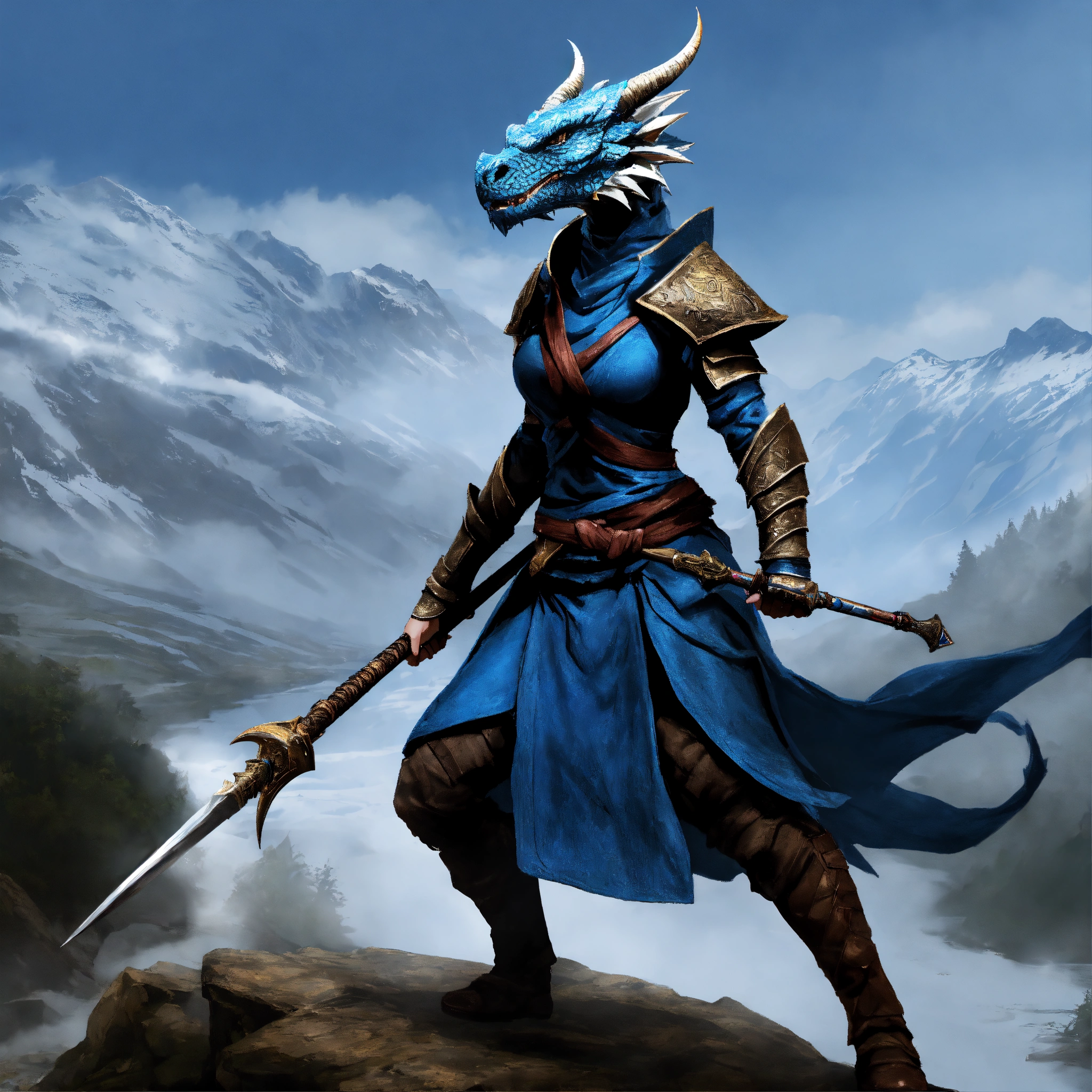 Female blue dragonborn with a spear, wearing a monk robe, defensive stance, raging, havoc, war, mountainous background, digital art