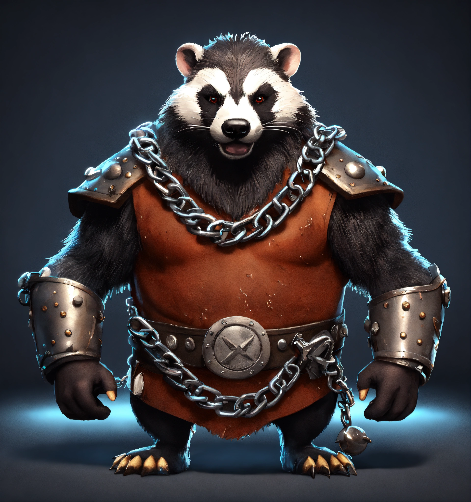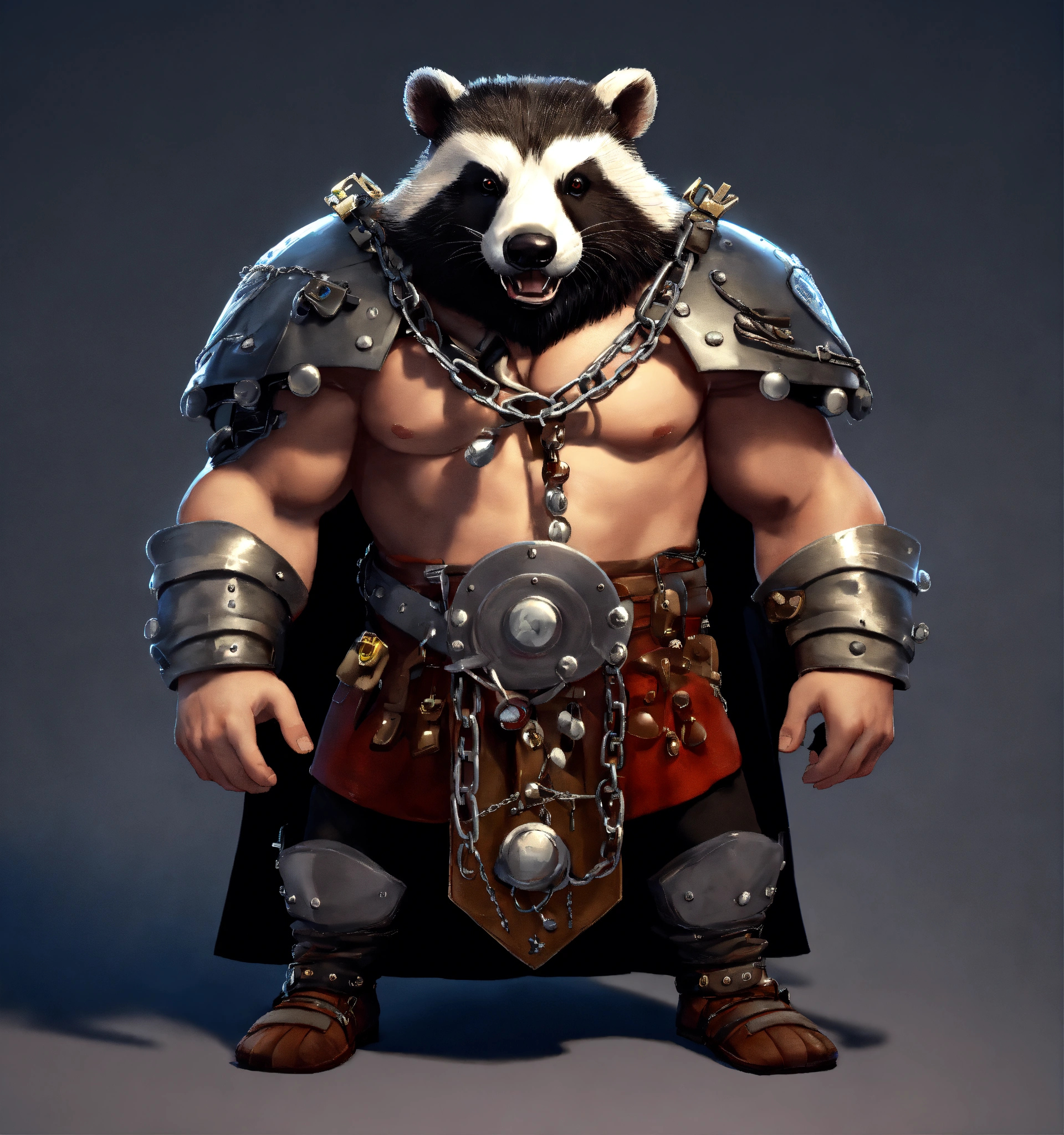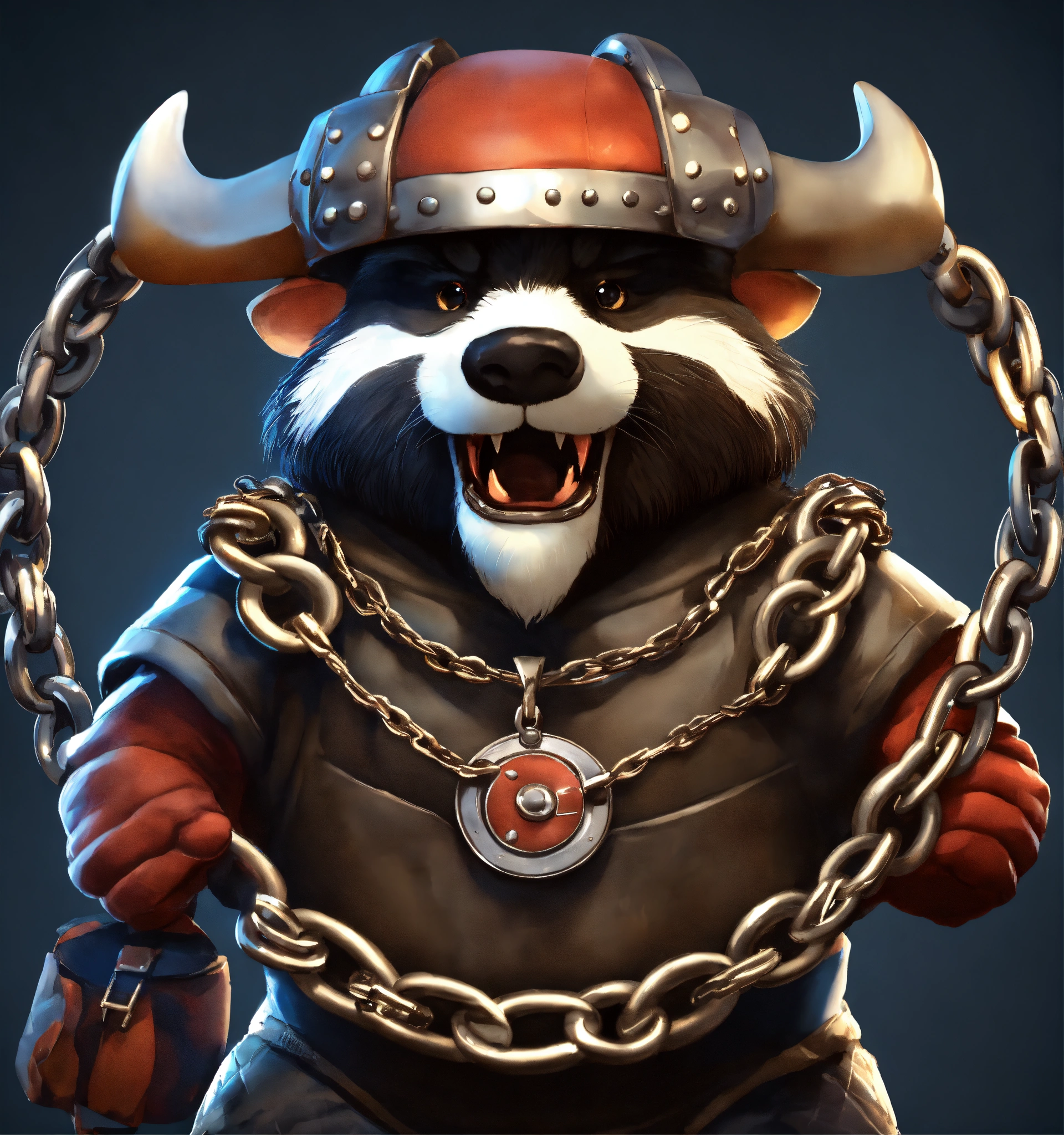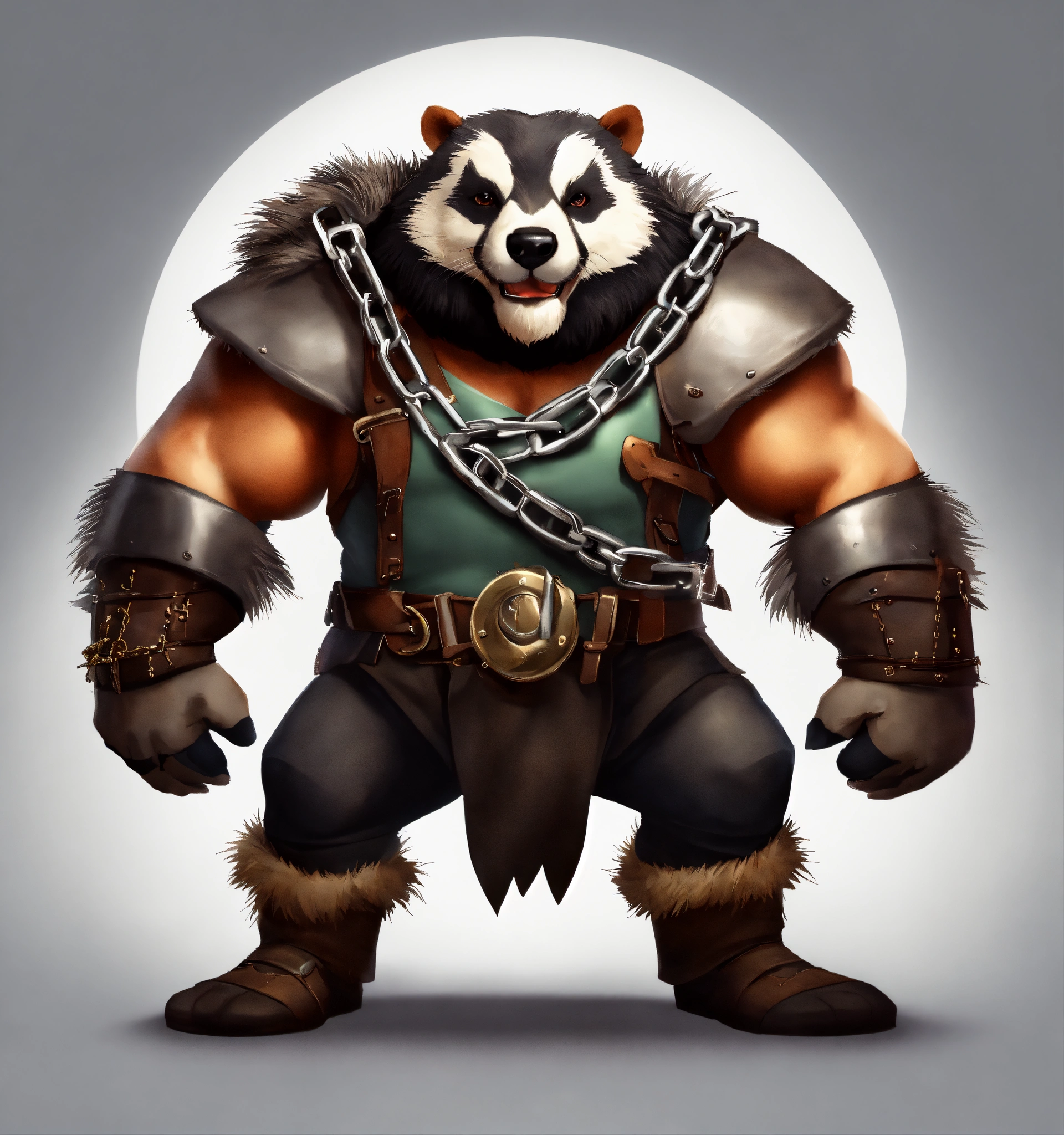 A game character cartoonish realistic heavy metal round body devious badger viking with chains