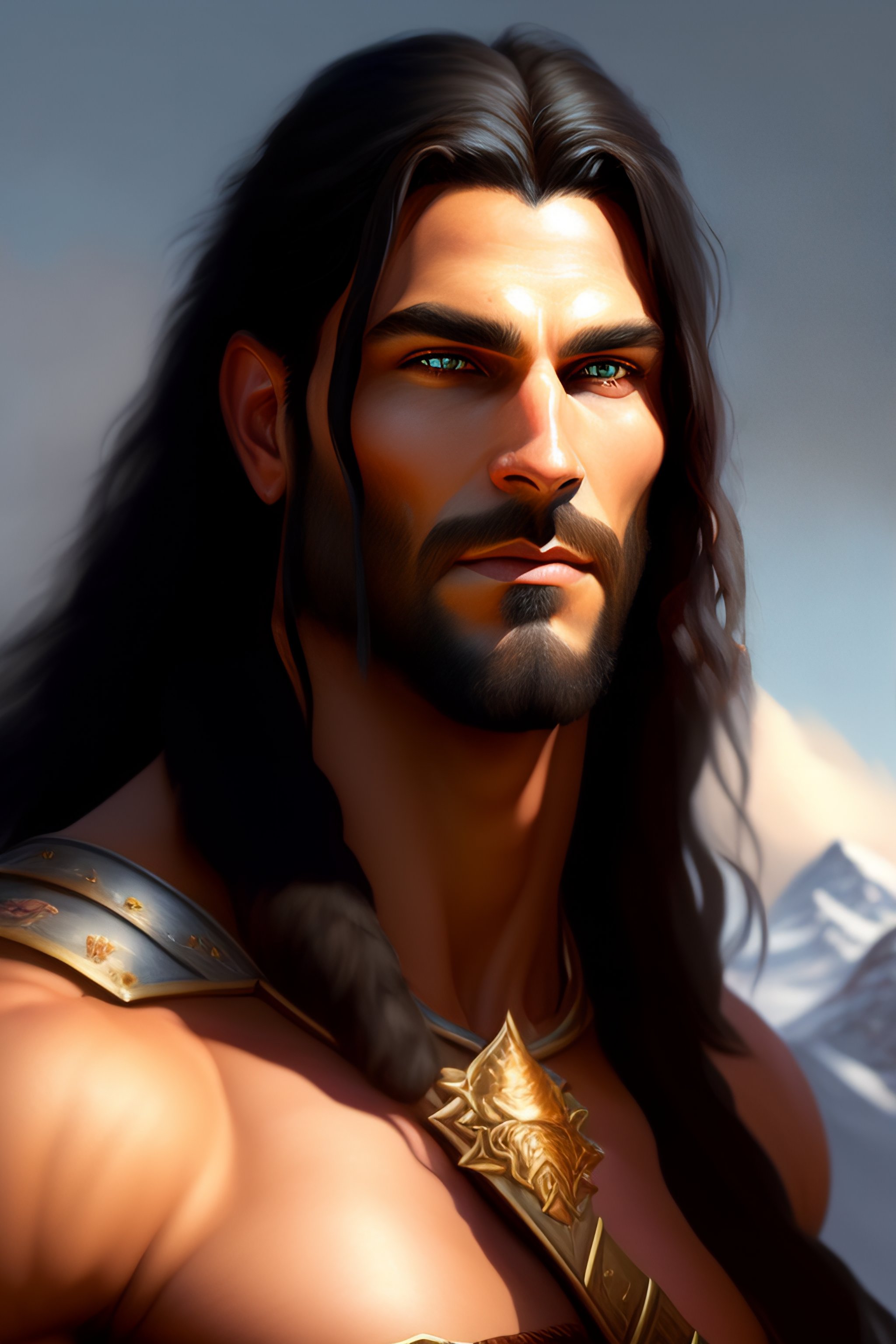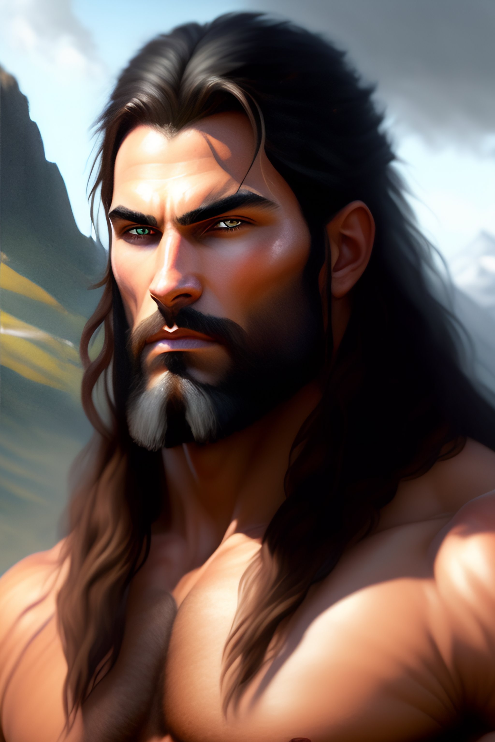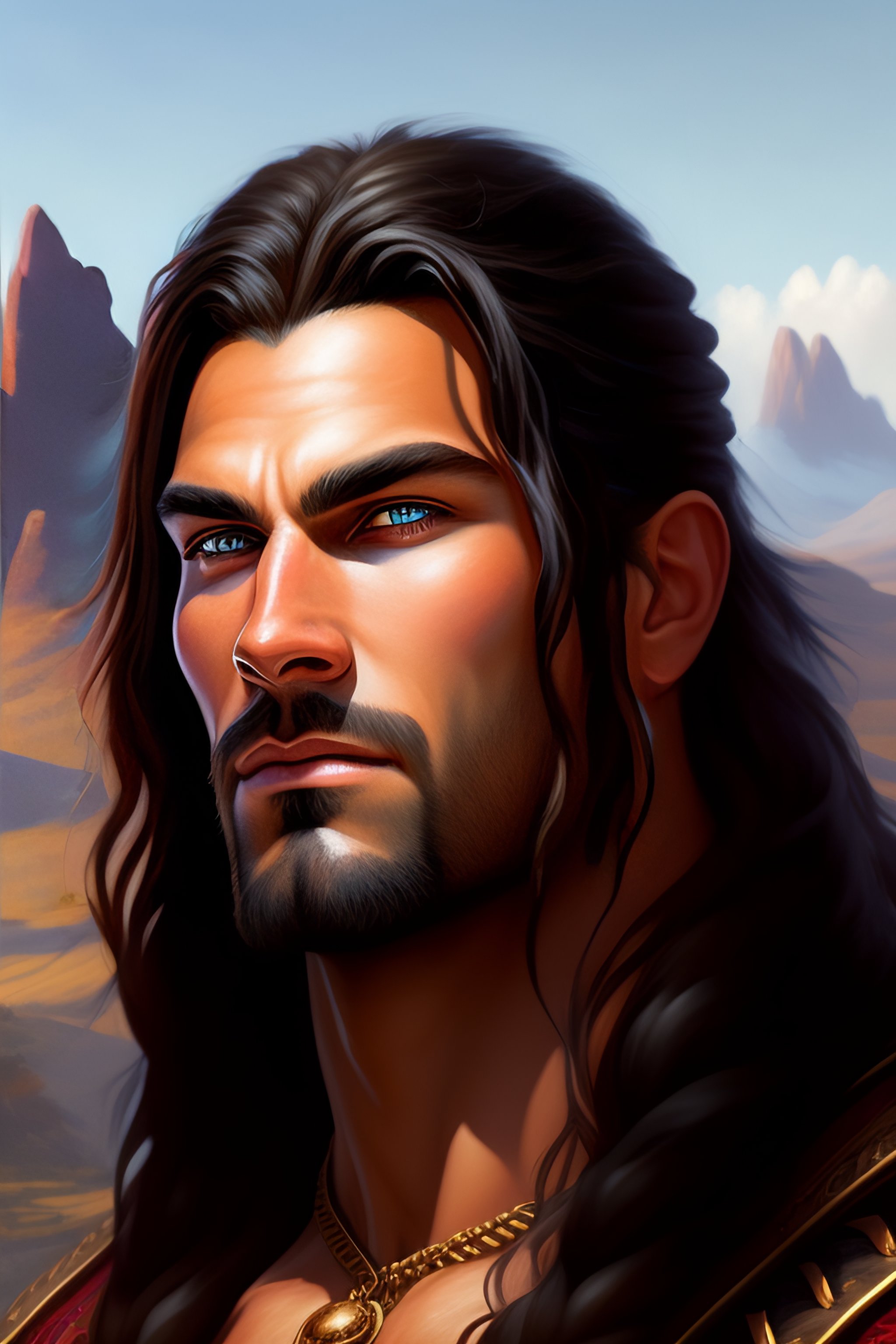 A _ fantasy _ style _ portrait _ painting _ of barbarian, no beard, long hair black, hills, oil _ painting _ unreal _ 5 _ daz. _ rpg _ portrait _ extremely _ detailed _ artgerm _ greg _ rutkowski _ greg