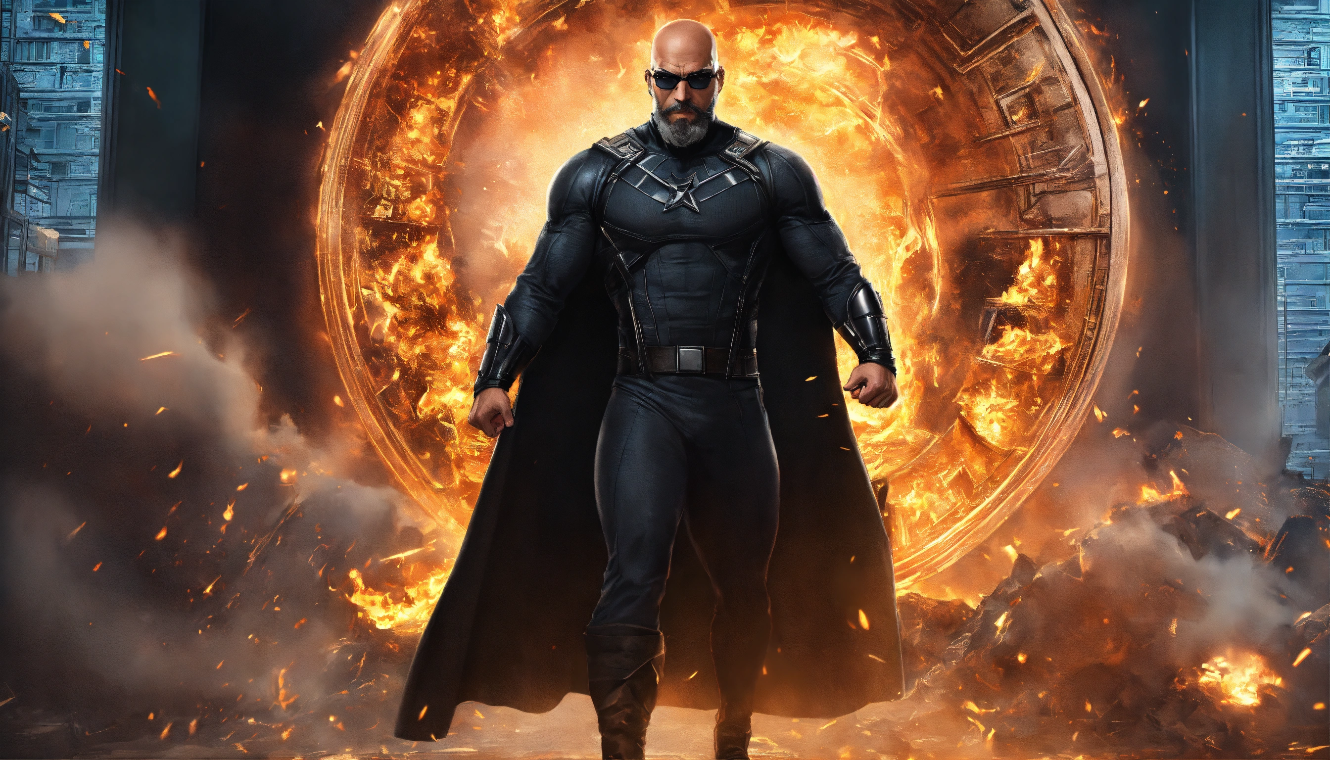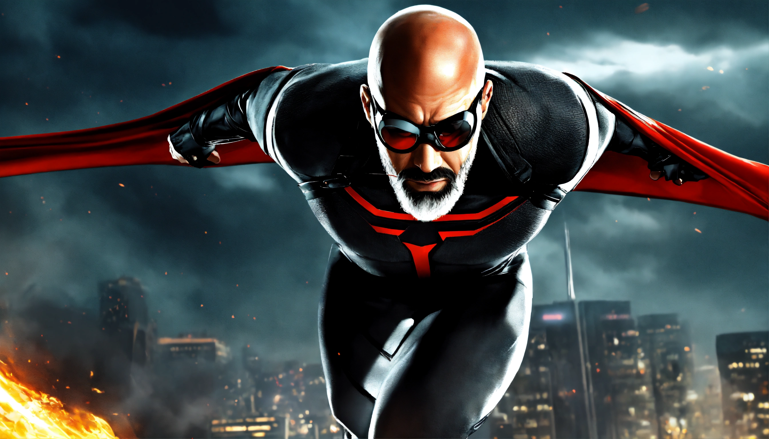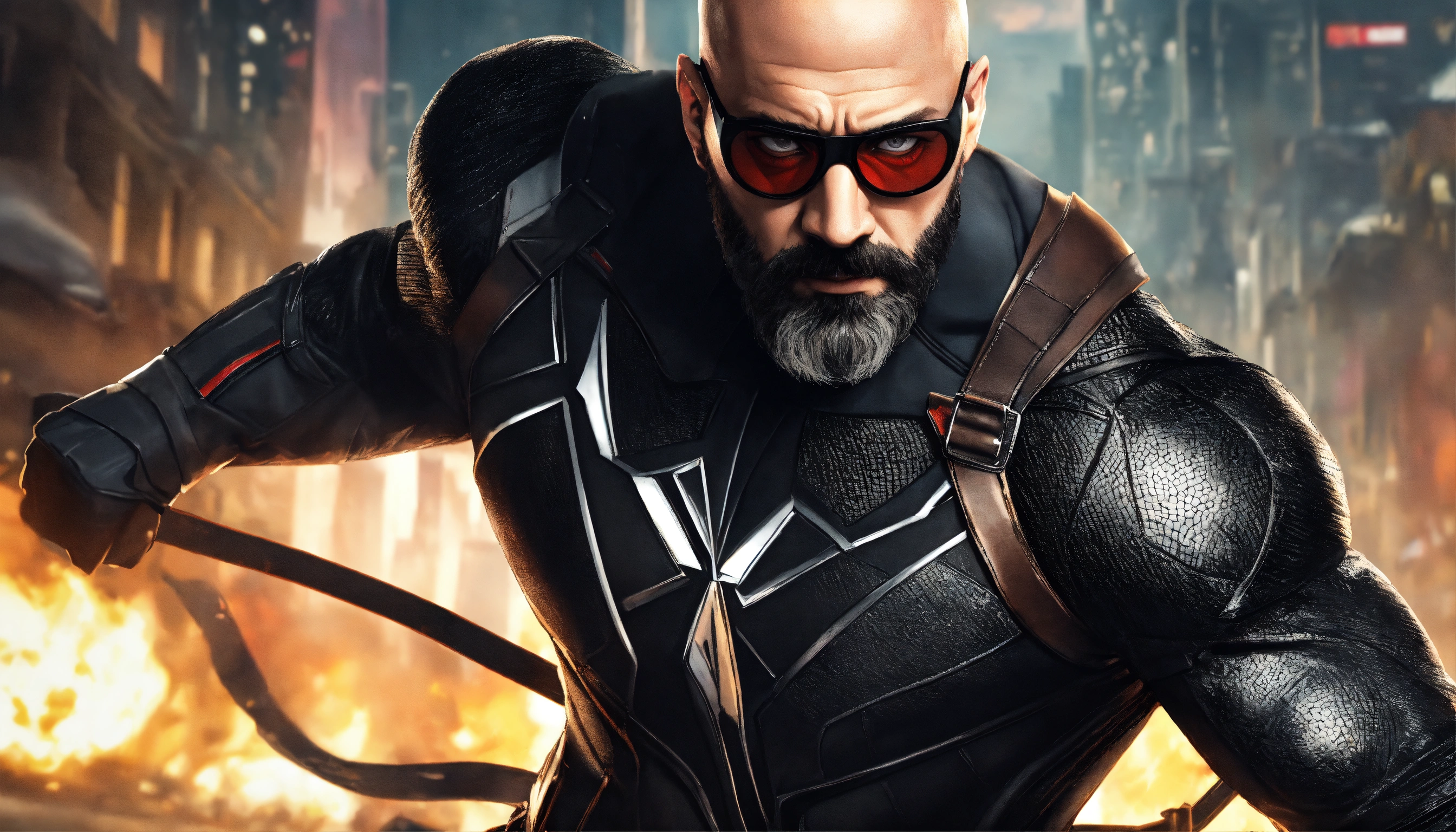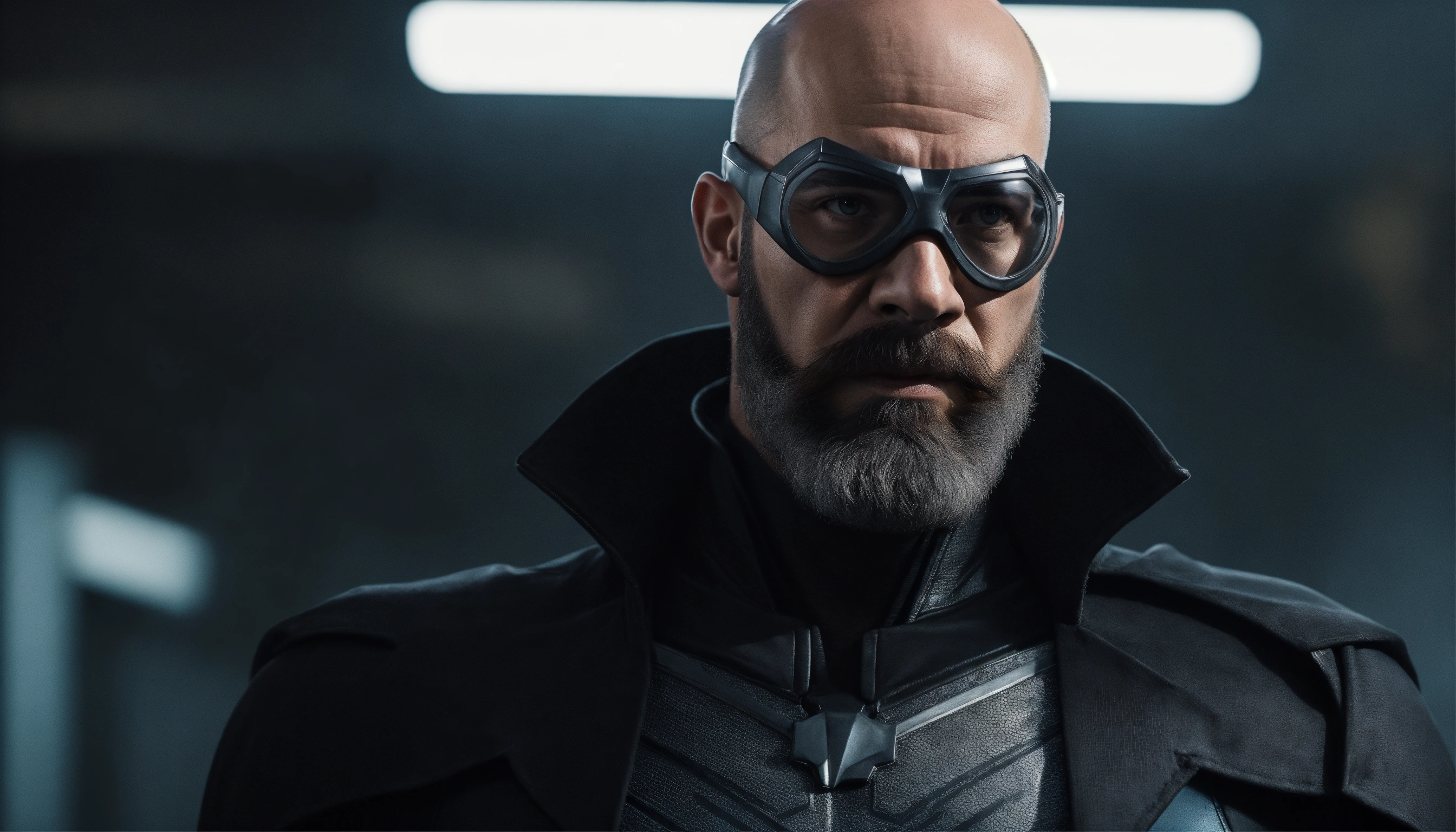 Intimidating cold grey eyes, marvel, highly detailed, black and grey sleek costume, full body, smooth, caucasian male, older, bald head, full beard, round glasses, super villain, fighting a superhero
