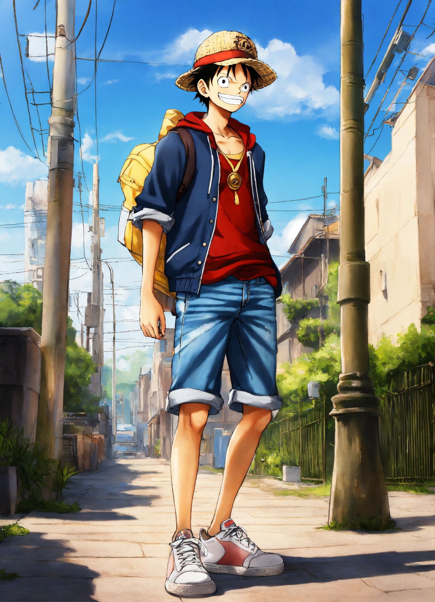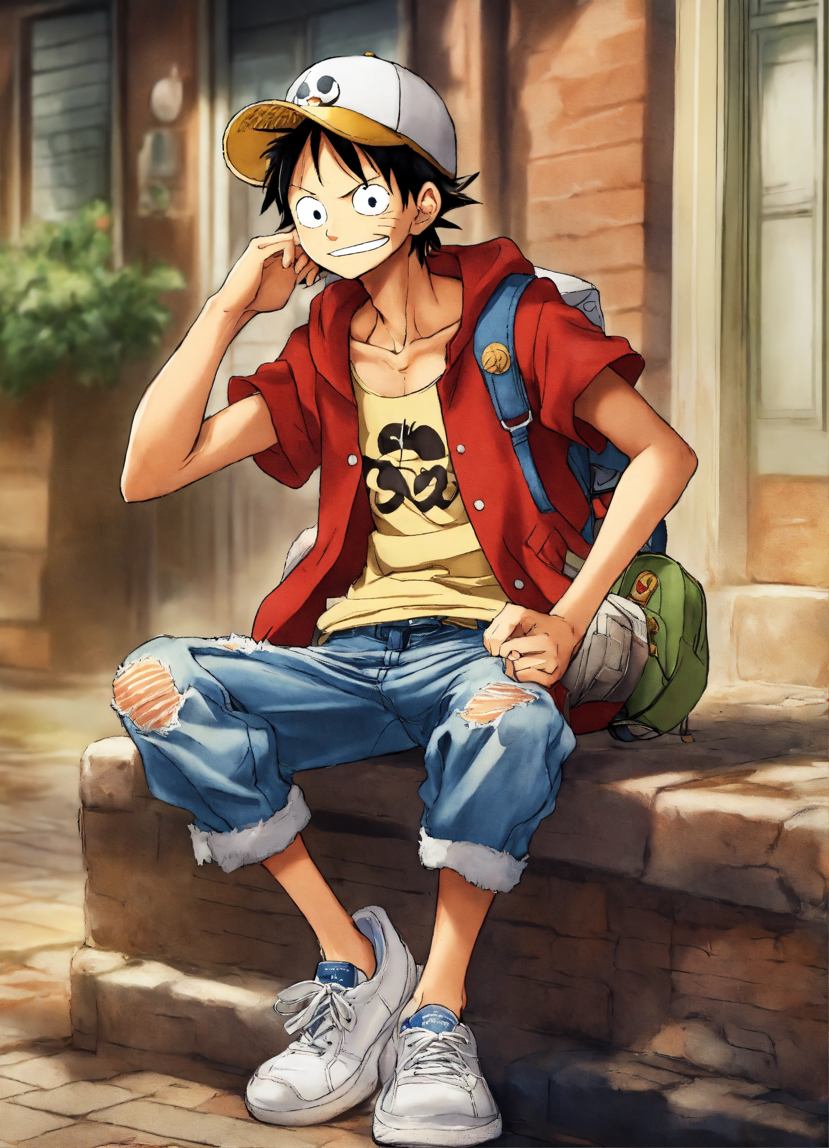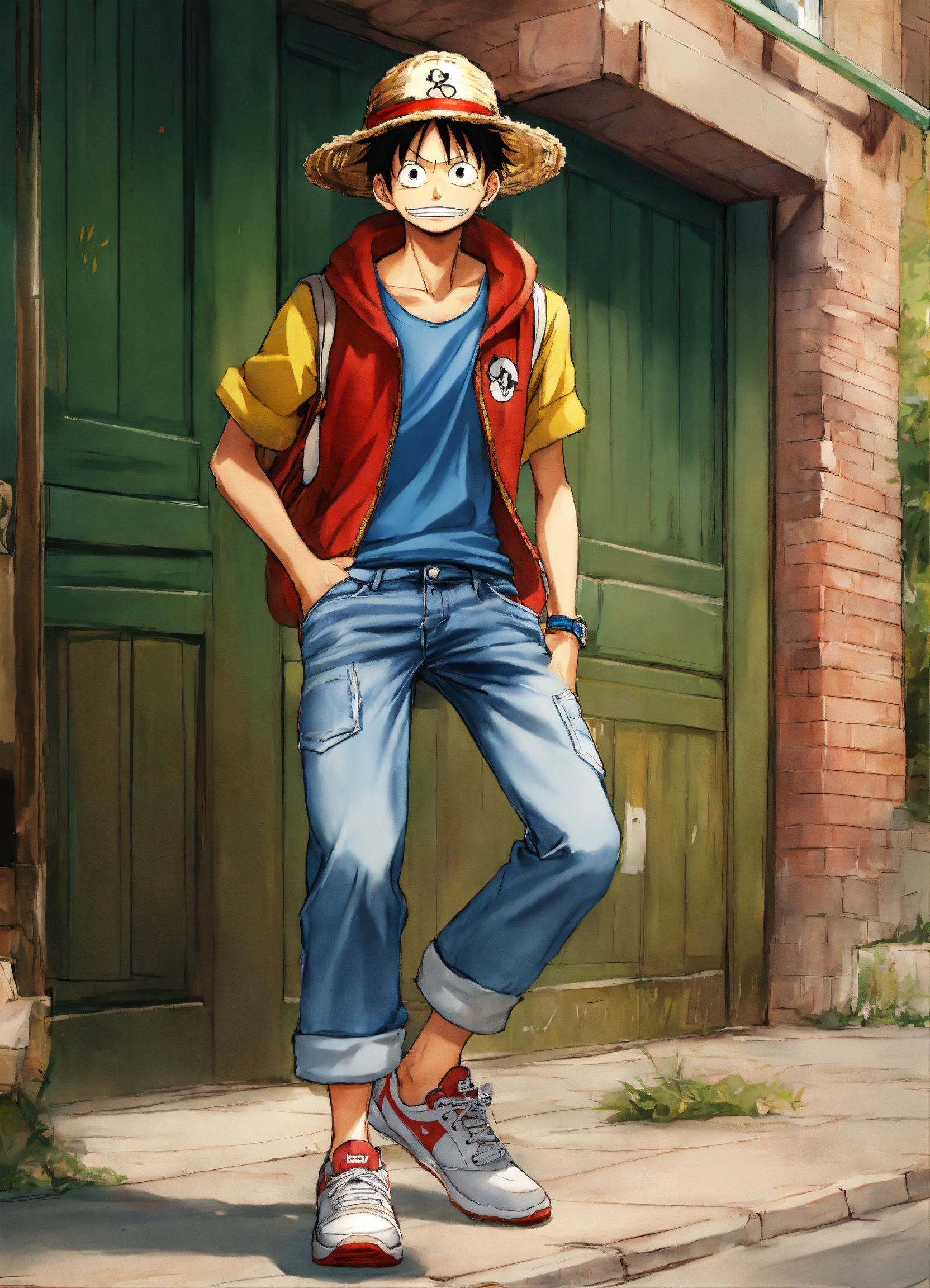 Luffy dressed in urban clothes like jeans and tennis shoes and a cap