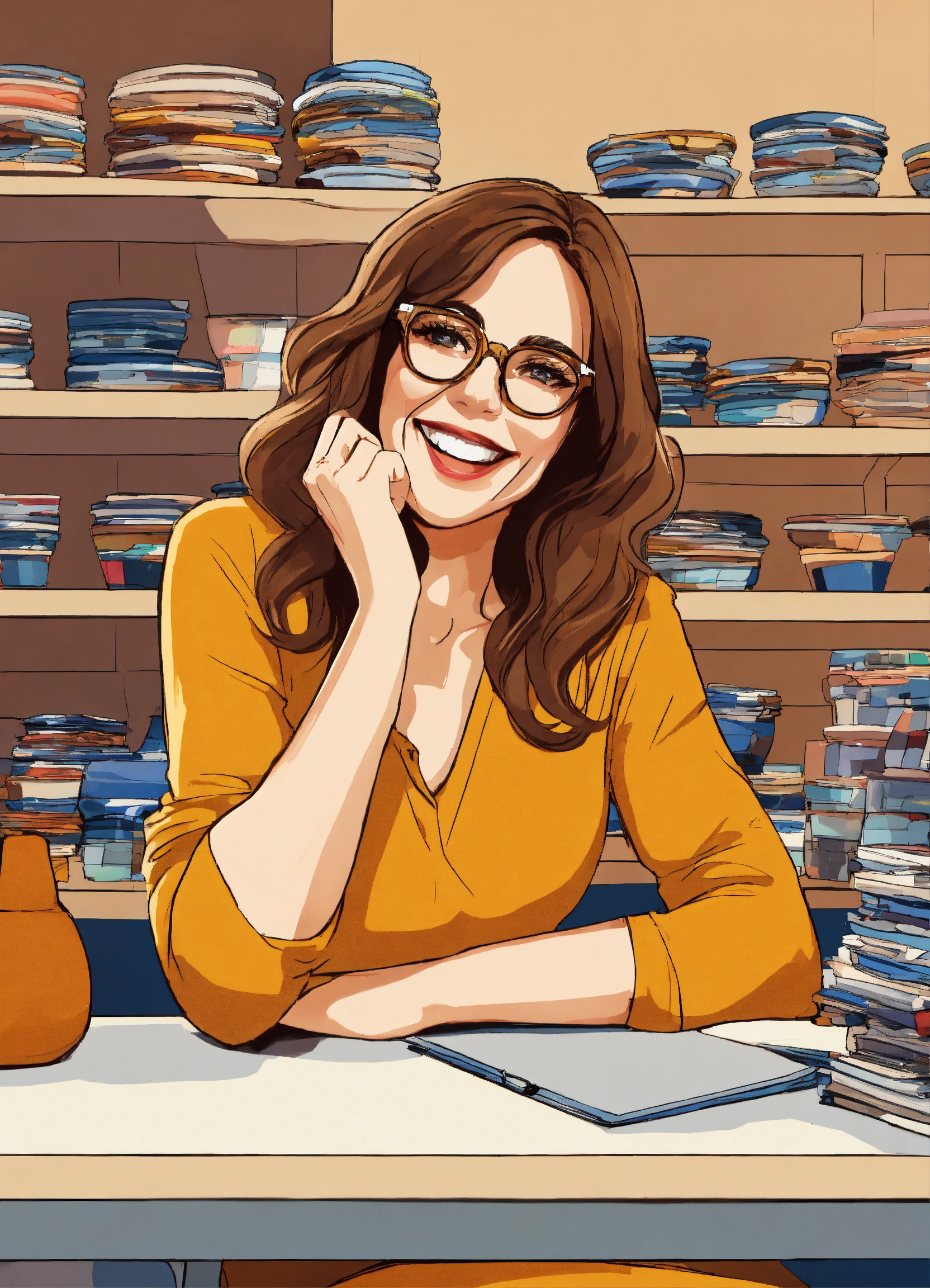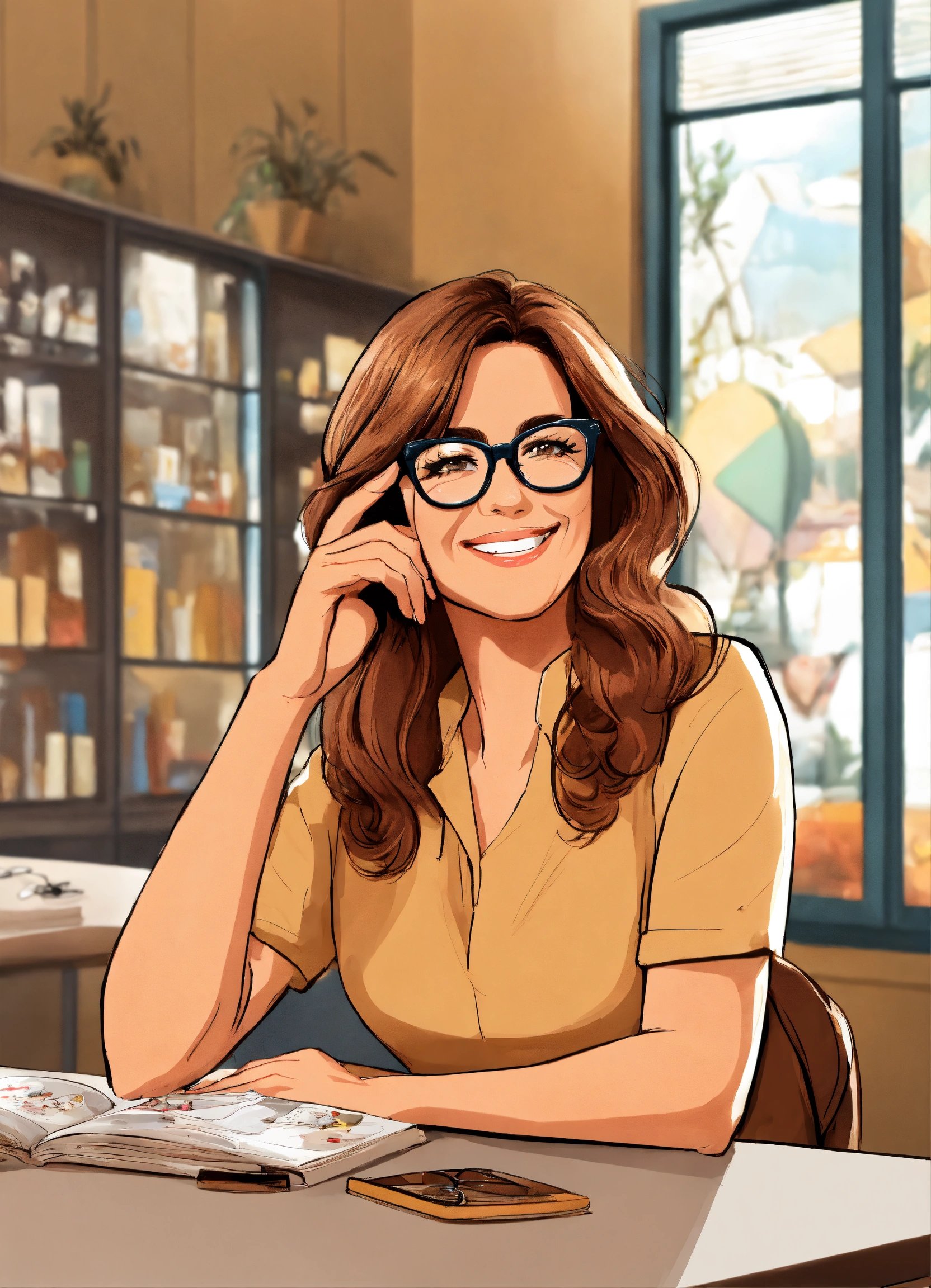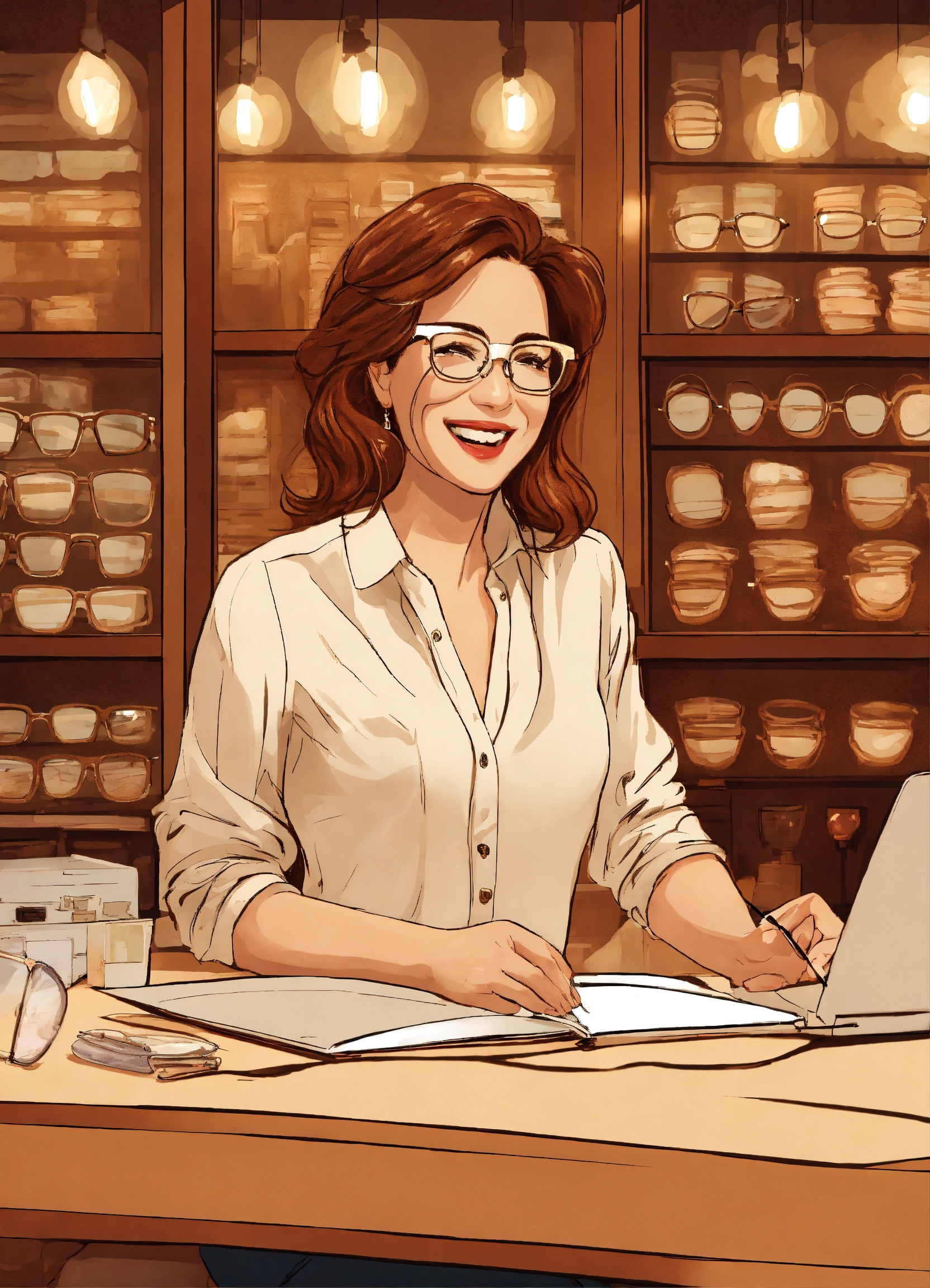 Eyewear store, 45 year old woman, smiling light brown hair glasses, table with many glasses, full figure, white furniture background with exposed glasses, cartoons style