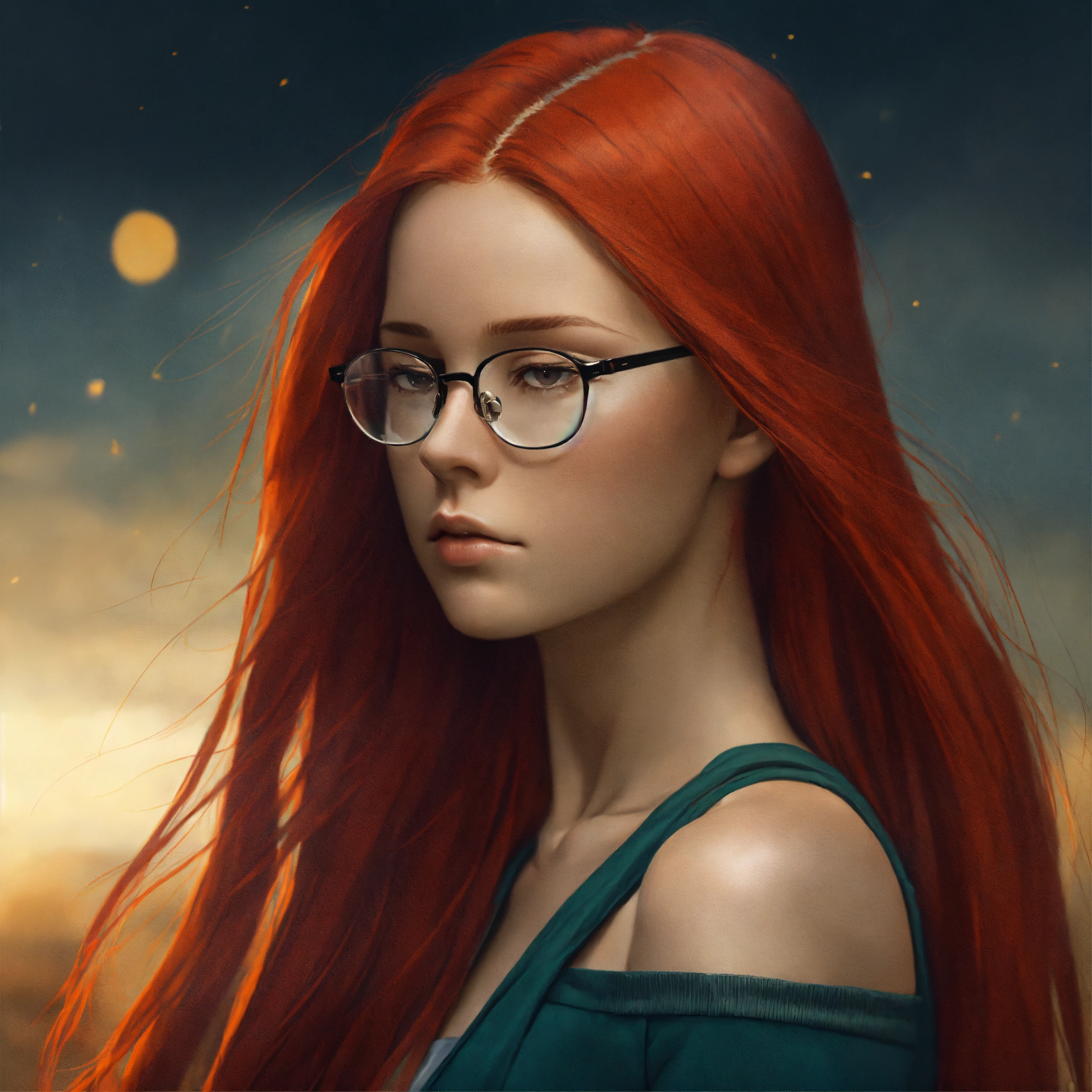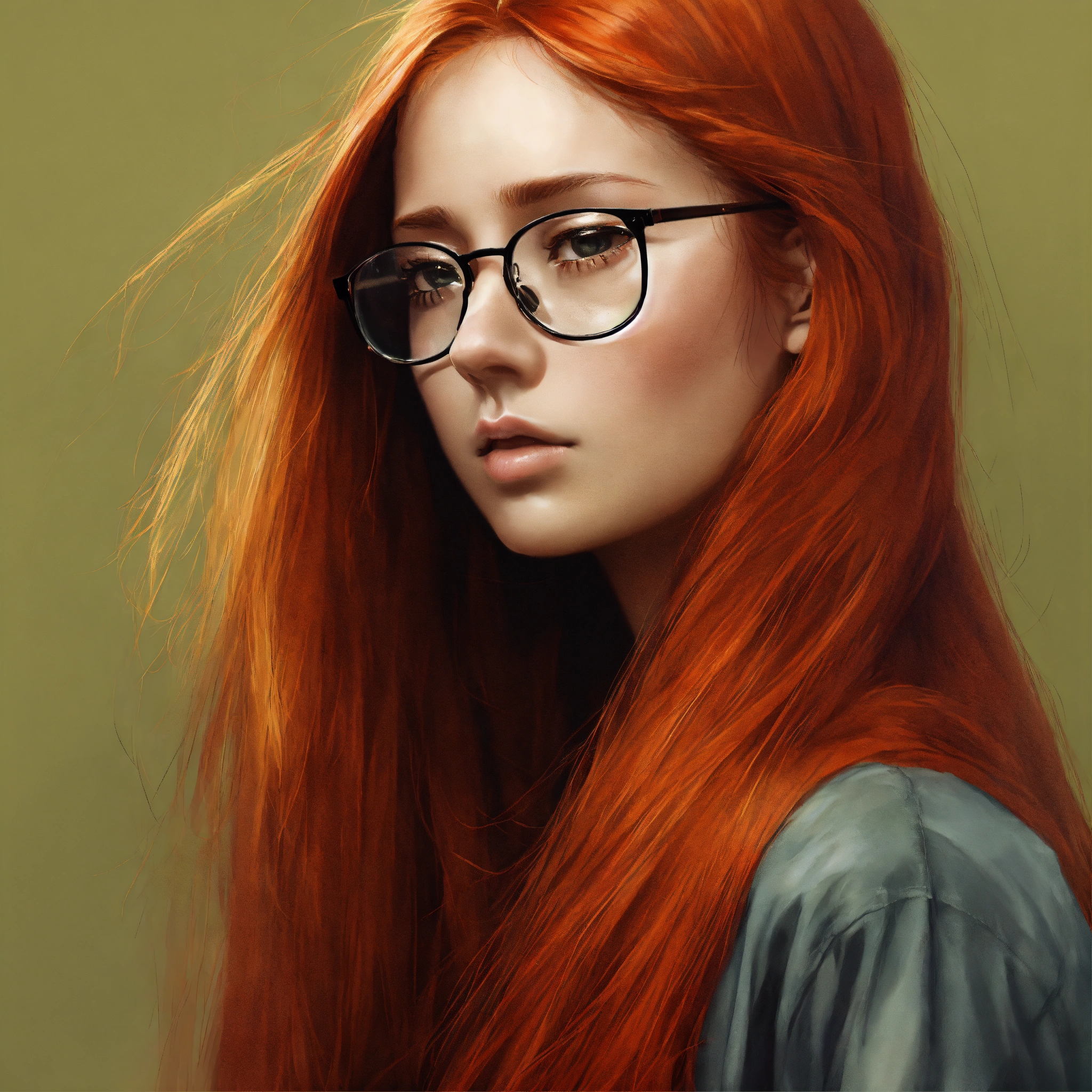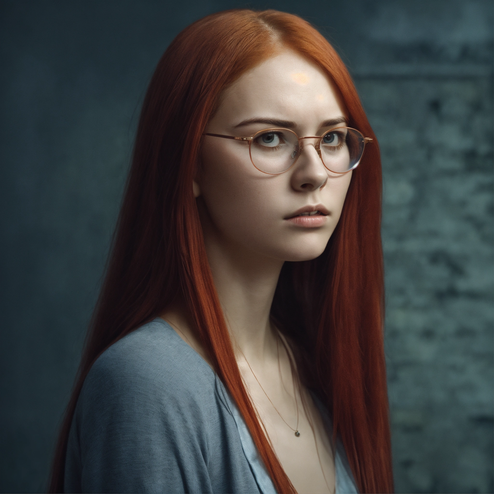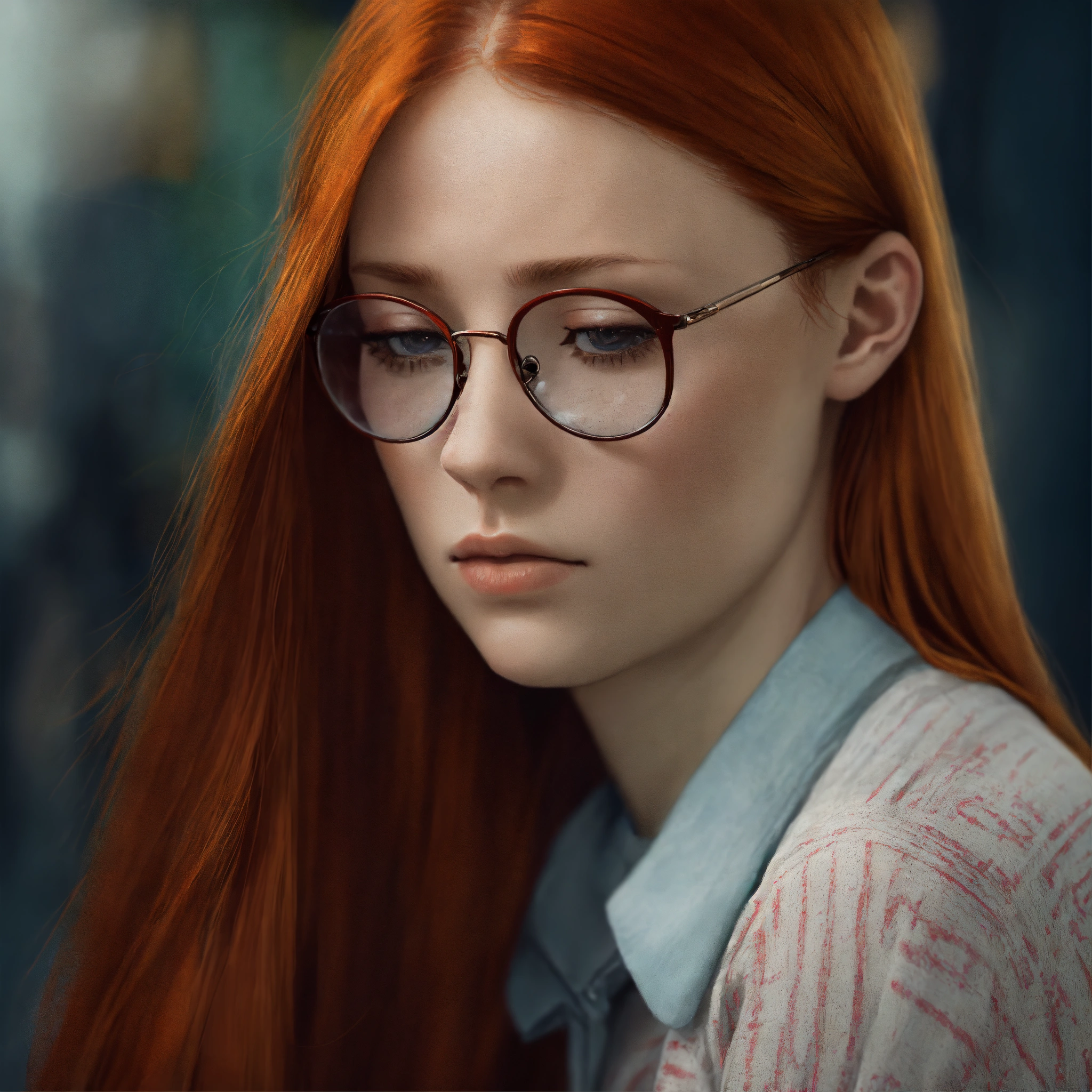 A young woman, with long straight red hair and glasses realistic image with her head down with a sad expression
