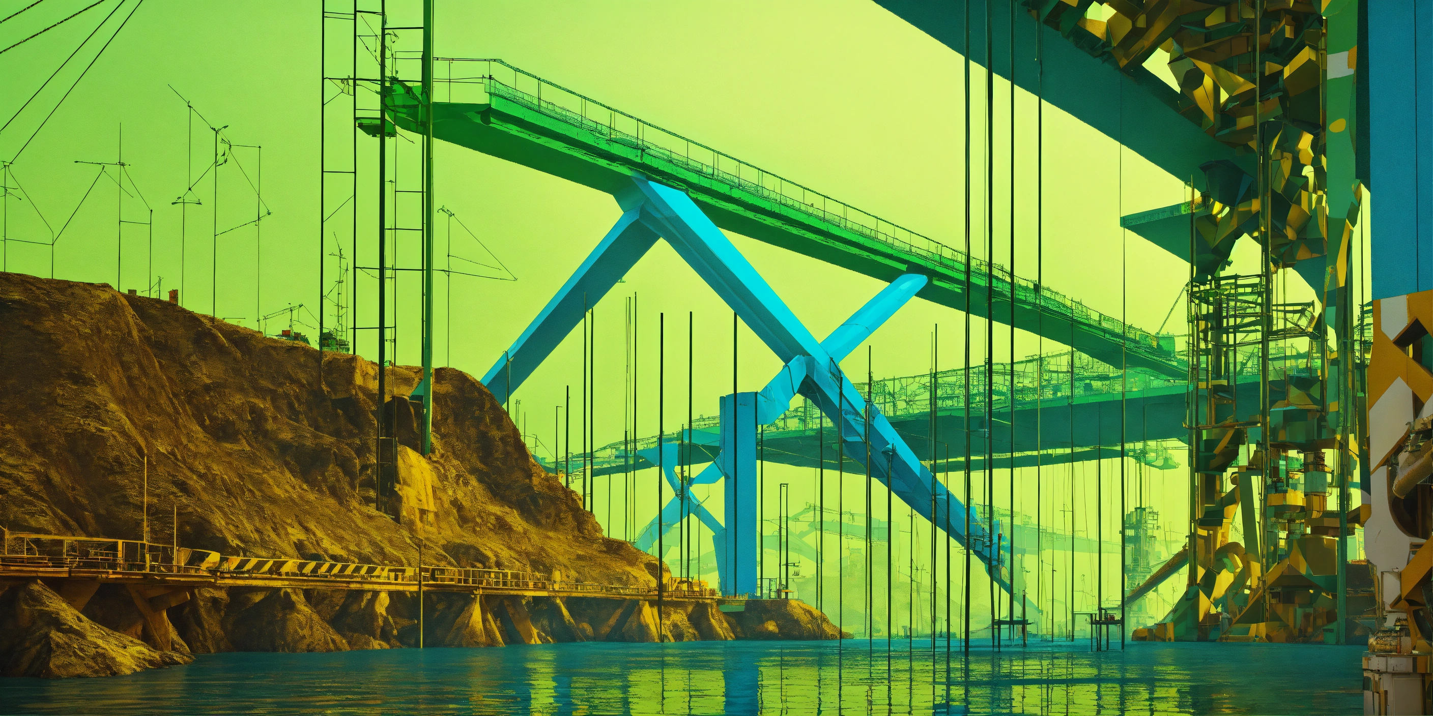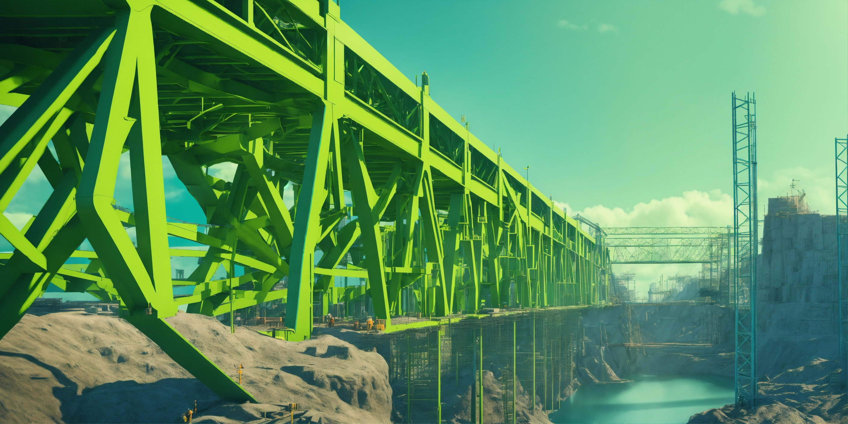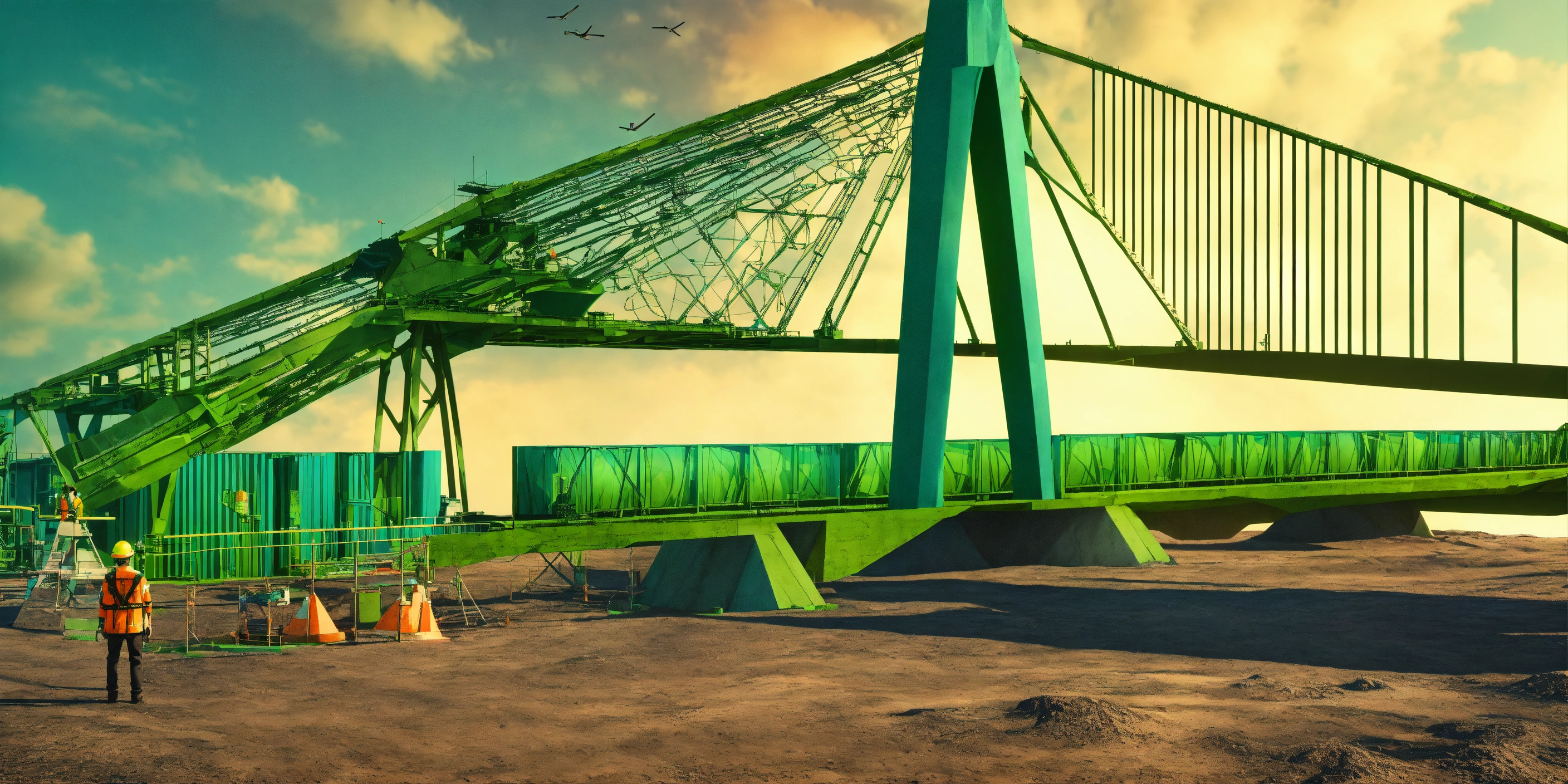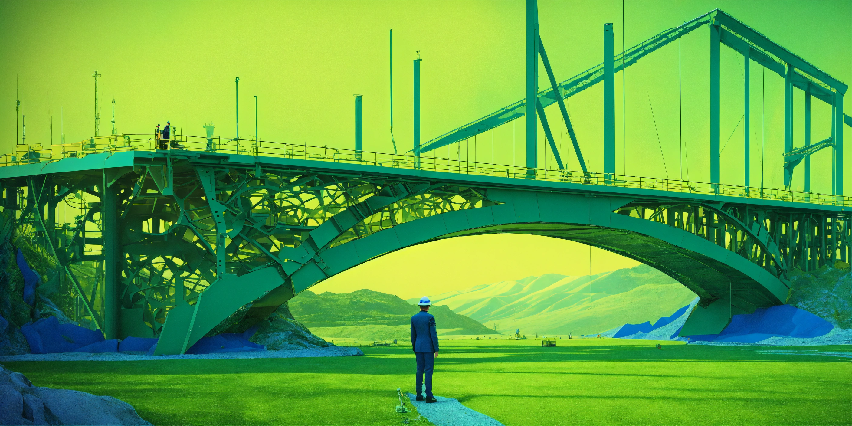 Futurist engineer supervising a bridge under-construction. surreal environment. m.c. escher visual inspiration. pop art influence, fashion. the image is colorized with green and blue and is rendered with octane to produce a photorealistic effect. 3d render representation. award winning photography.