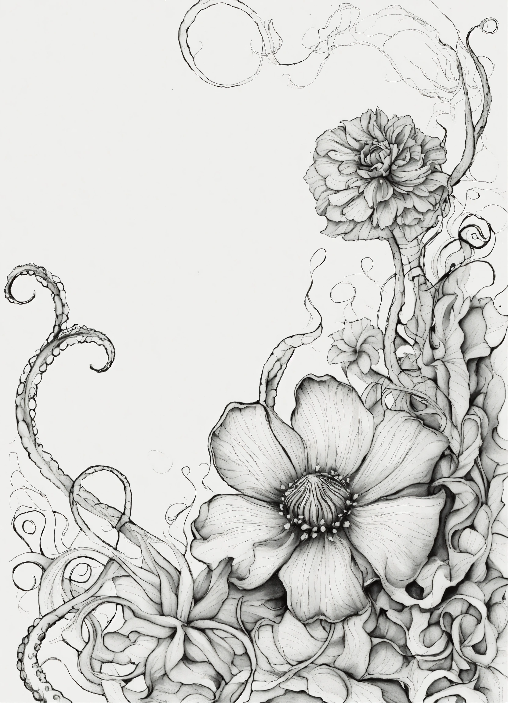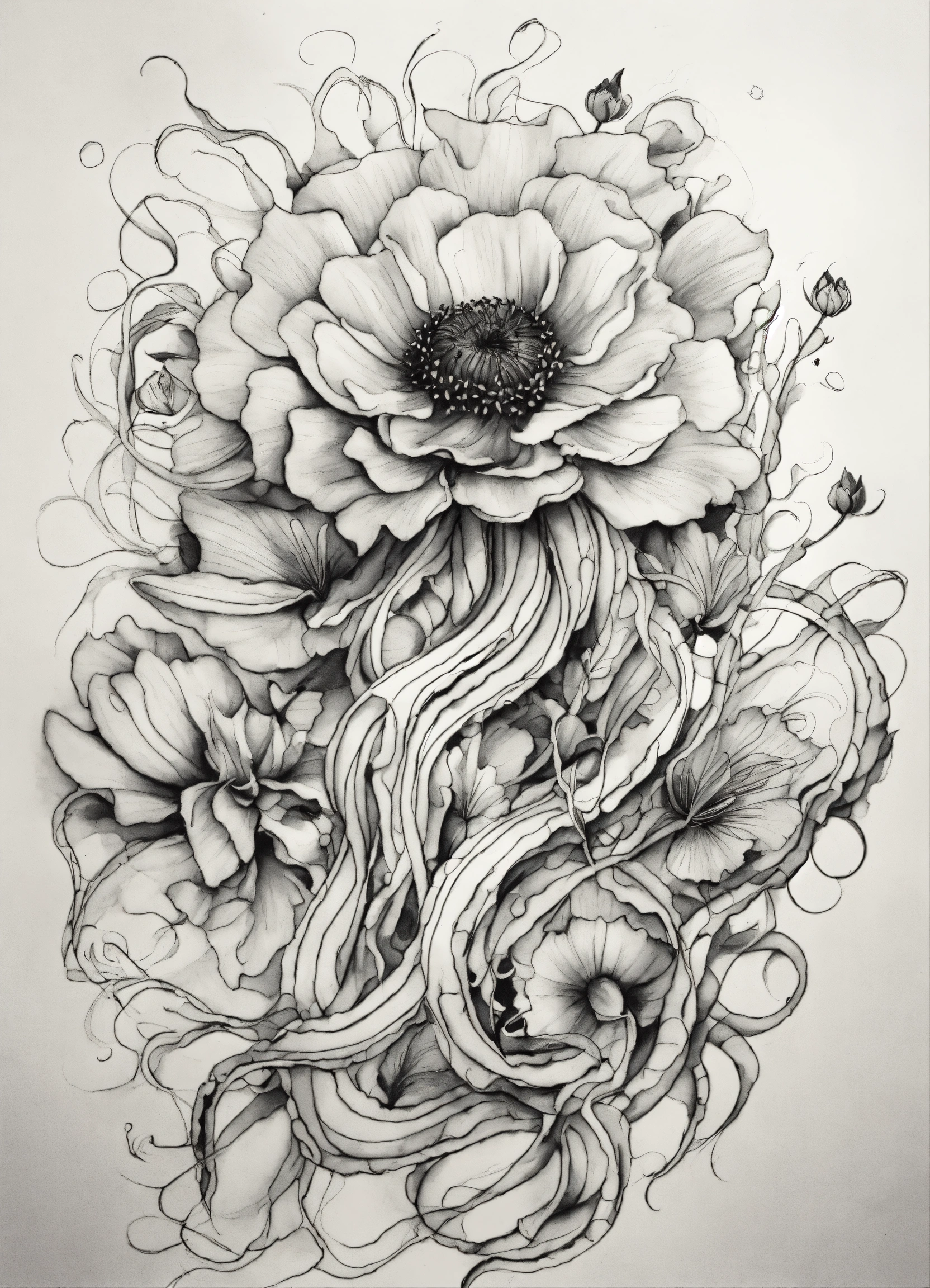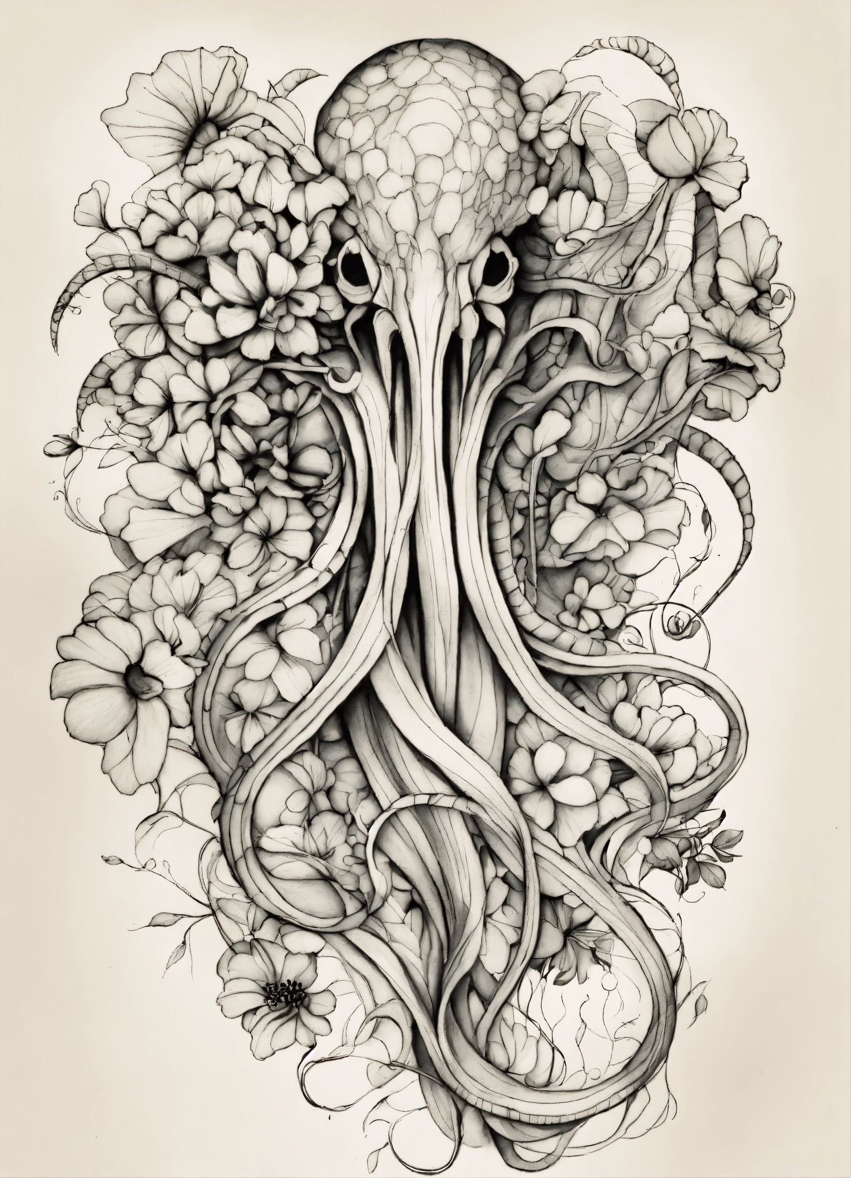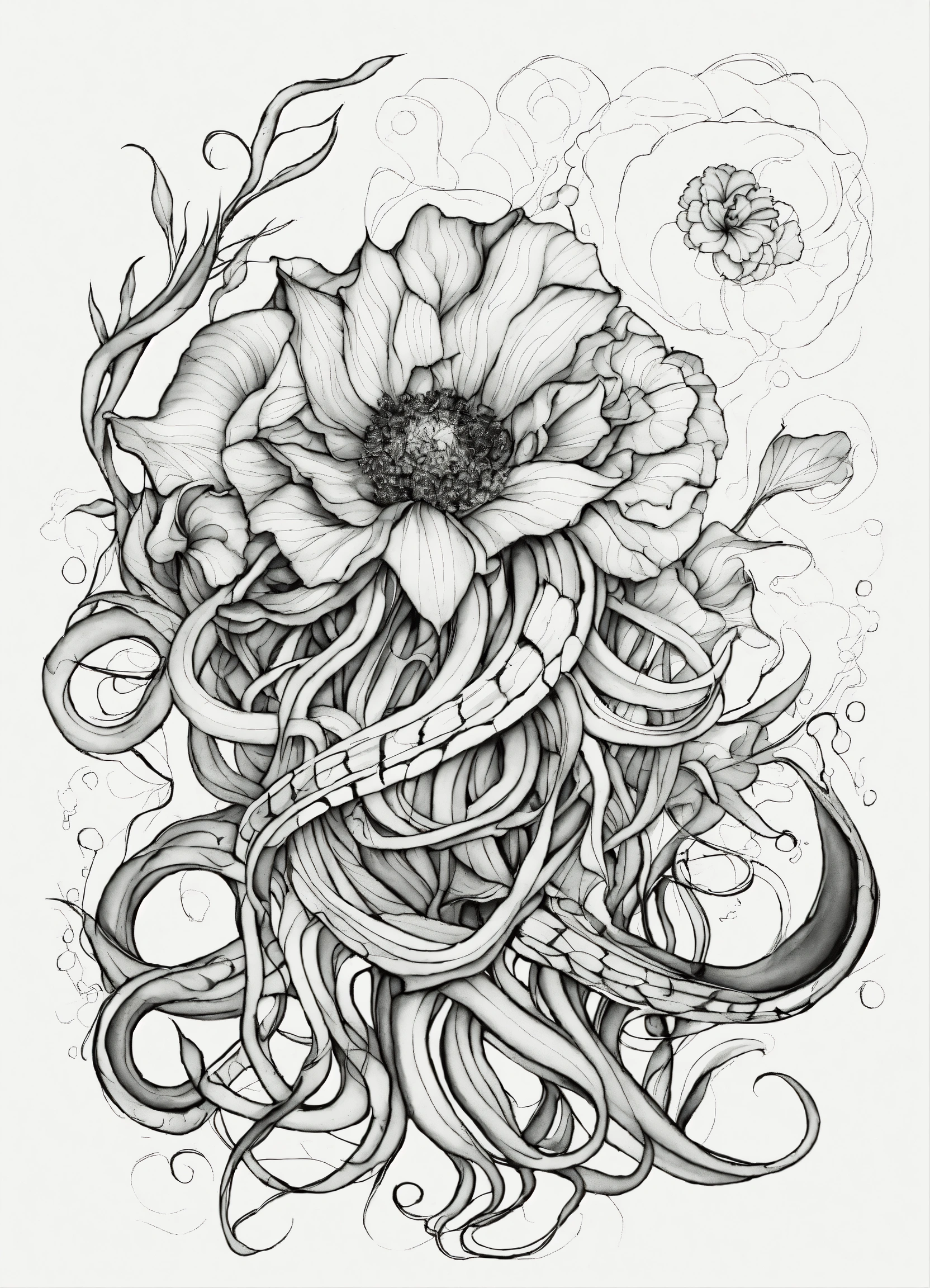 Croquis dessin simple méduseavec des tentacules fleurs, white background, tattoo style, noir et blanc