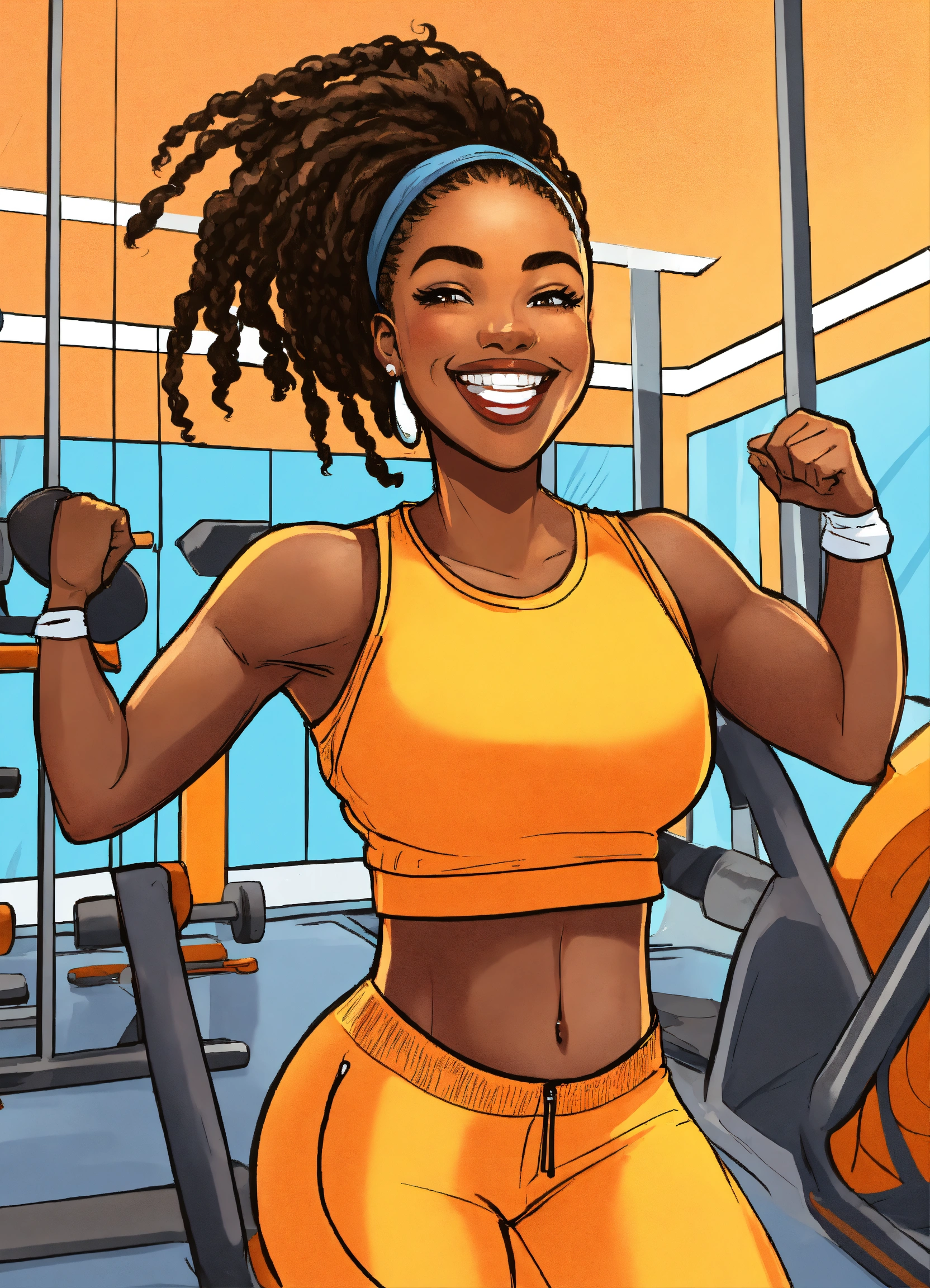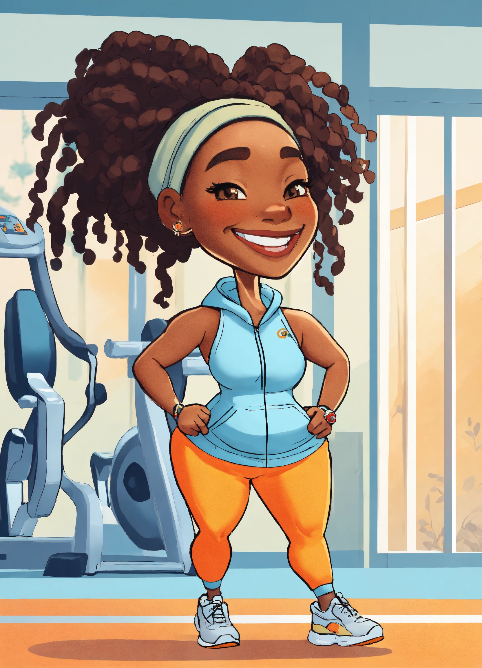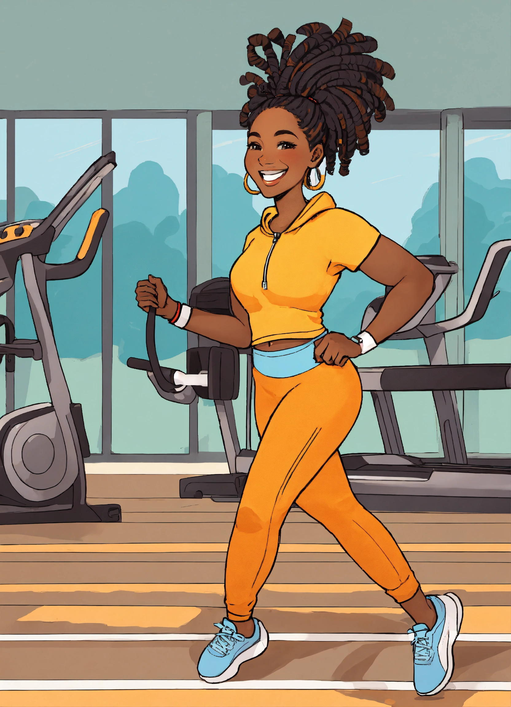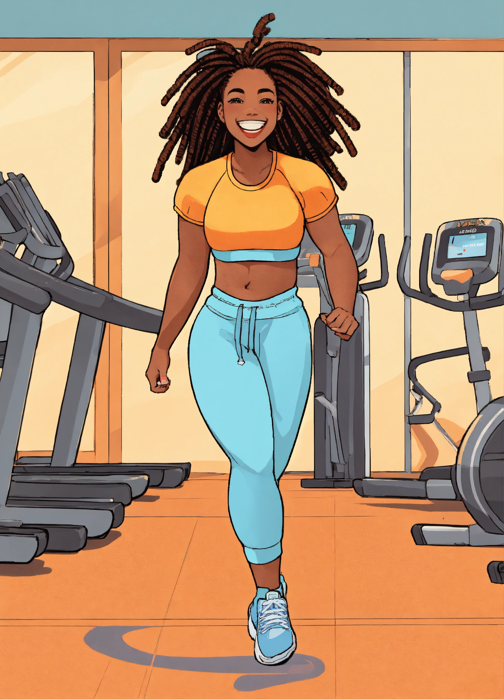 Illustrated cartoon cheerful african american woman with a big smile, with dread locs plump body, wearing a jogging suit and pastel blue yellow and orange black white exercising in a gym setting high detail illustration for book