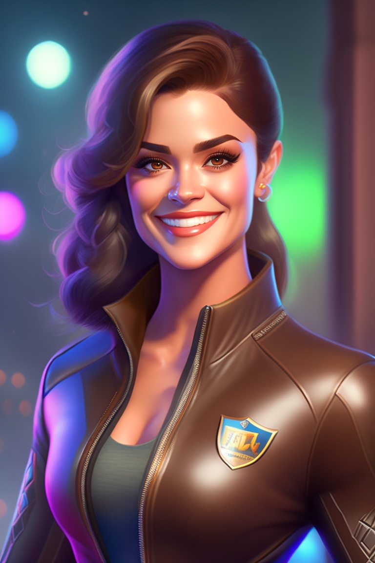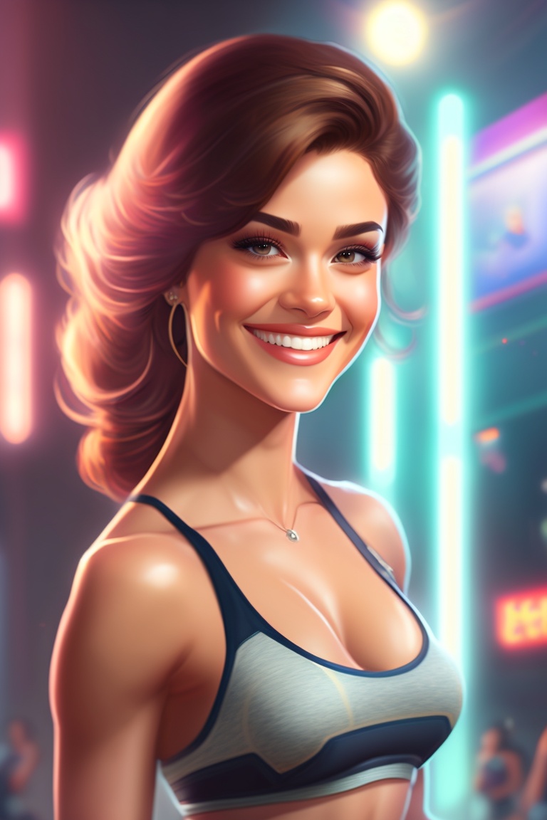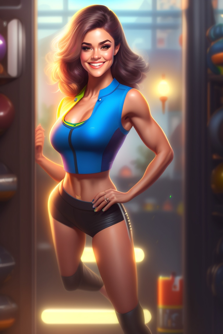 Lucy hale as fitness instructor from, smiling, full body realistic portrait, shiny clothing, highly detailed, digital painting, concept art, smooth, sharp focus, illustration, cinematic lighting