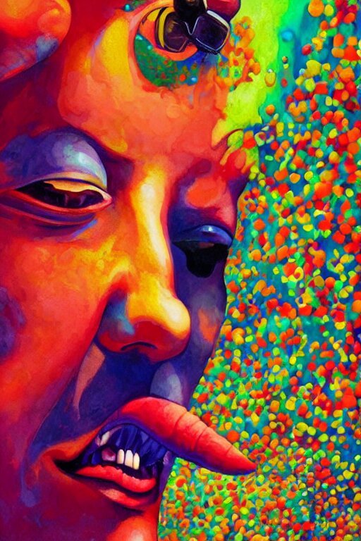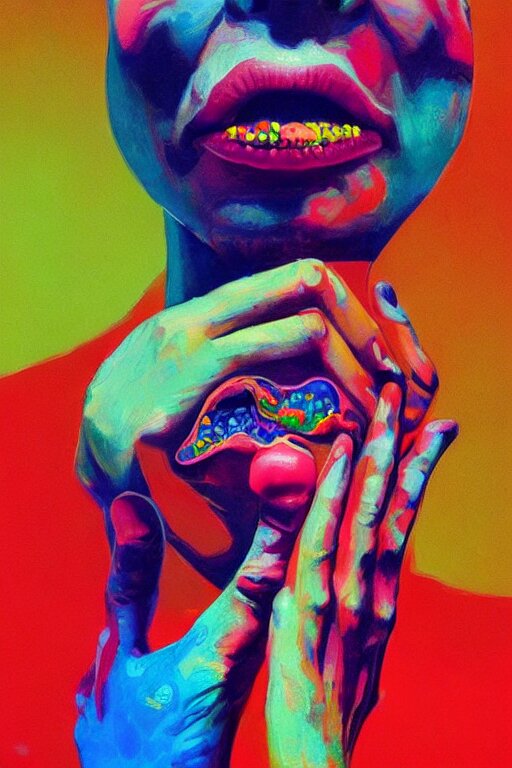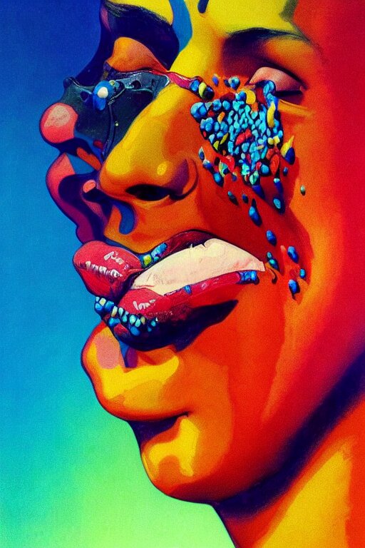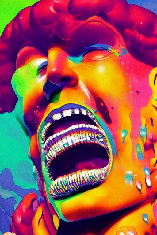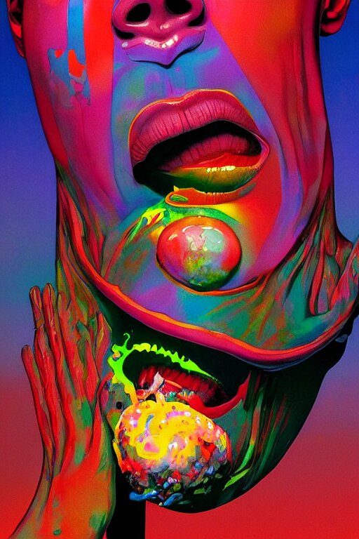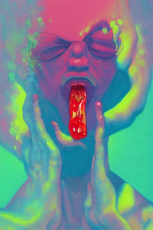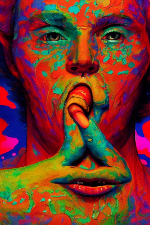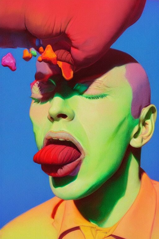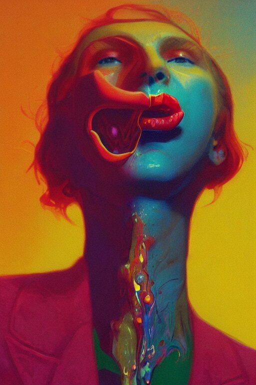 A colorful vibrant closeup portrait of a fashion model licking a tab of lsd acid on his tongue and dreaming psychedelic hallucinations, by moebius, edward hopper and james gilleard, zdzislaw beksinski, steven outram colorful flat surreal design, hd, 8 k, artstation