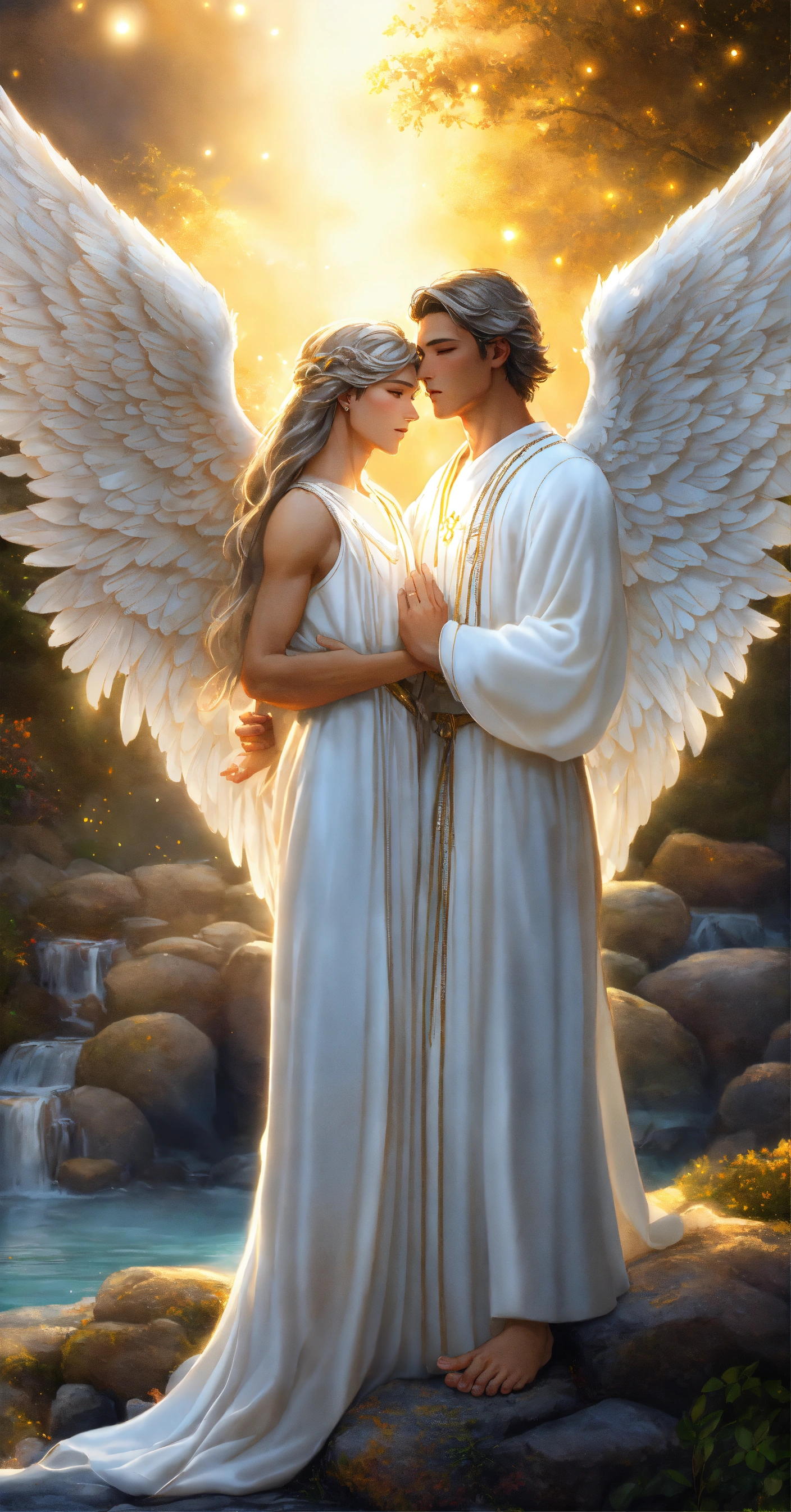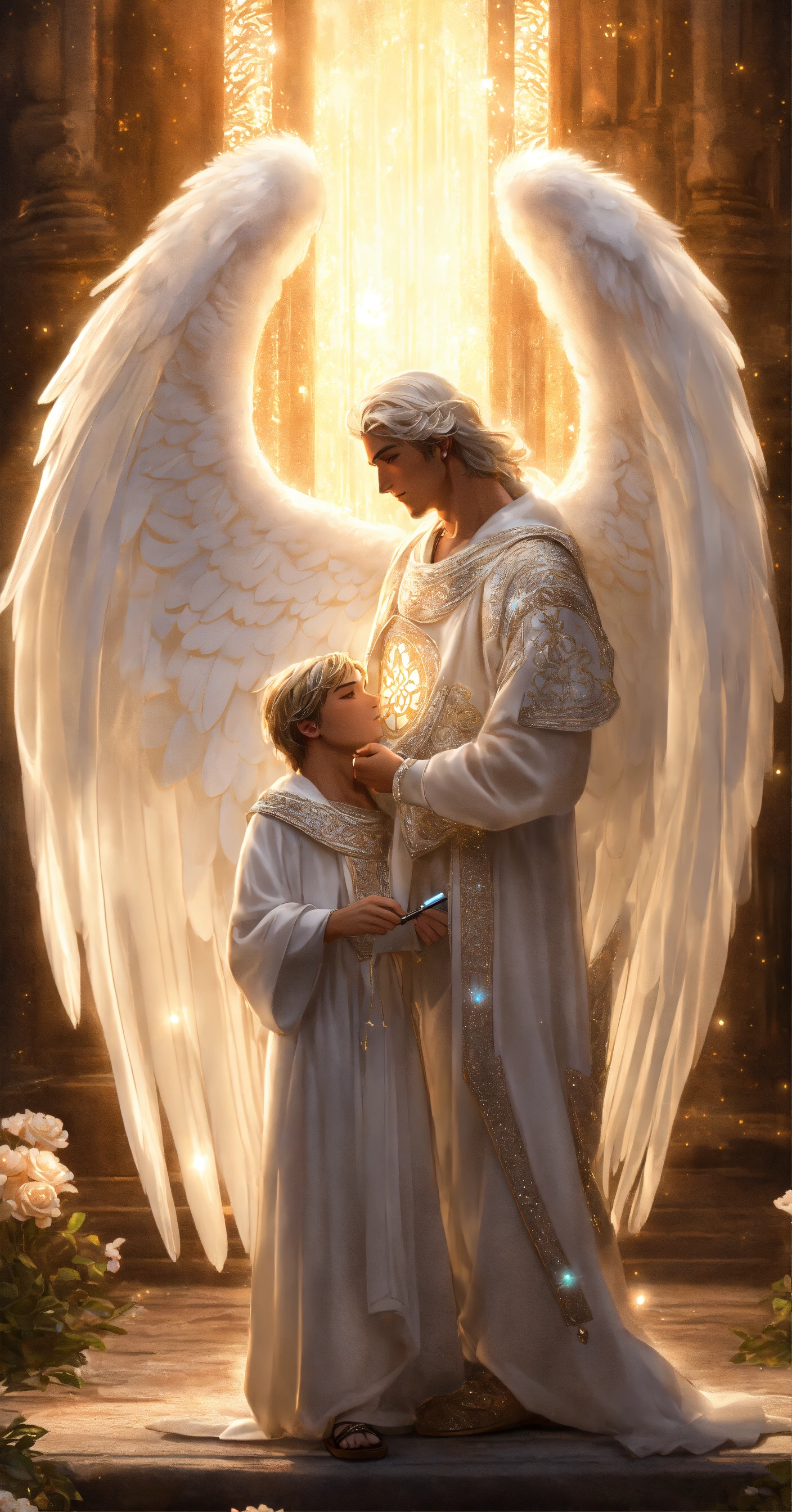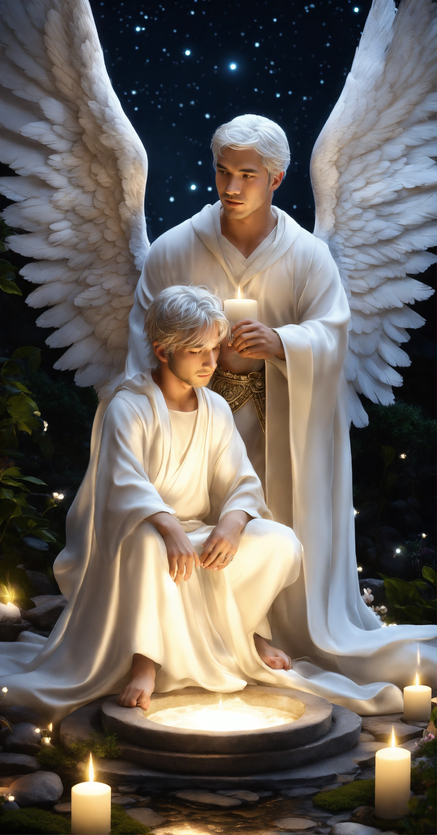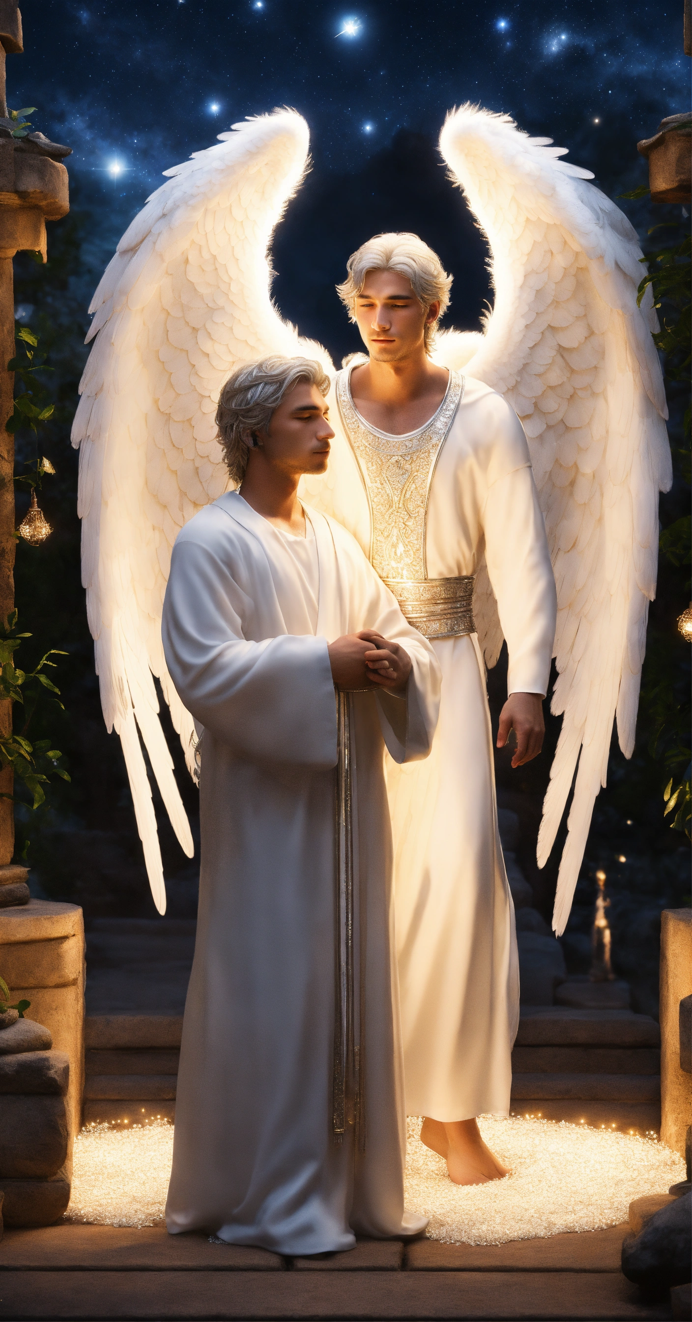 2 male guardian angels with detailed and luminous white angel wings. 1 male angel of 30 years hugging a child angel of 9 years. the 2 male angels have large, uniform luminous white wings. their faces beautiful and detailed. very clear eyes that open with a deep and penetrating look. detailed and manly white hair. white tunic-type dresses with many silver details with luminous sparkles. they are in a beautiful, detailed zen garden with a night sky. hyper-detailed, hyper-realistic illustration. realism. masterpiece. digital art, hd, high quality. high definition, high definition. 8k.