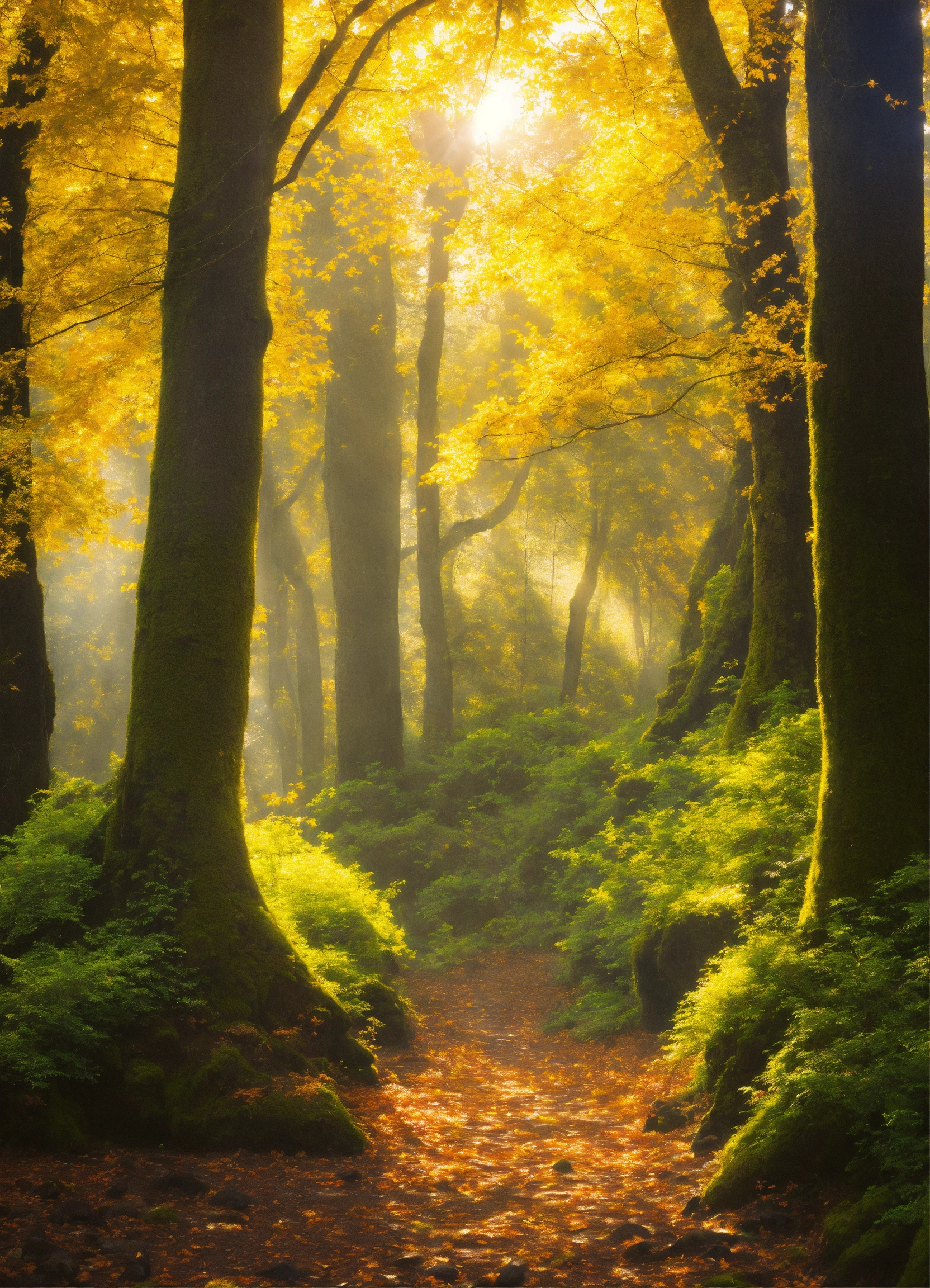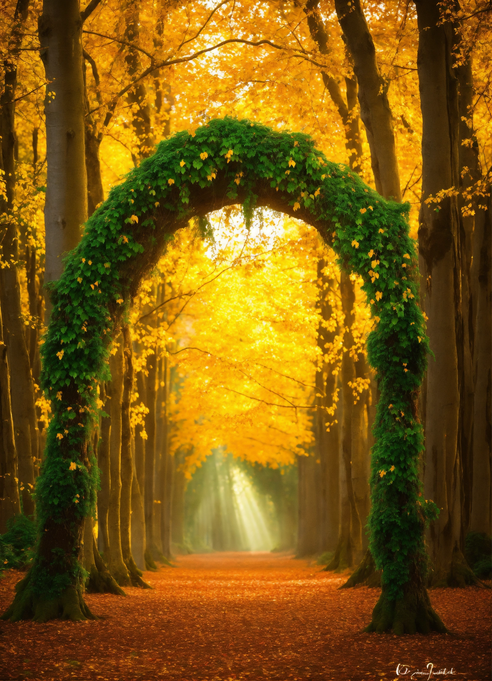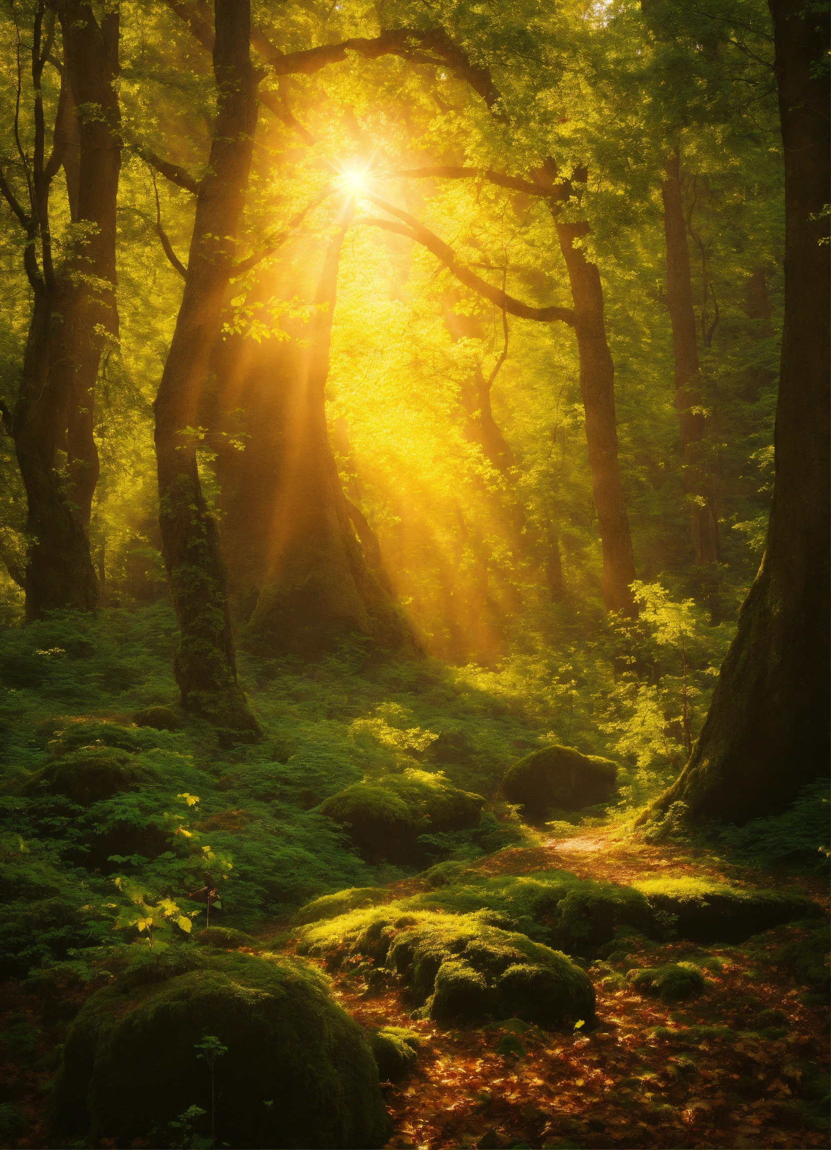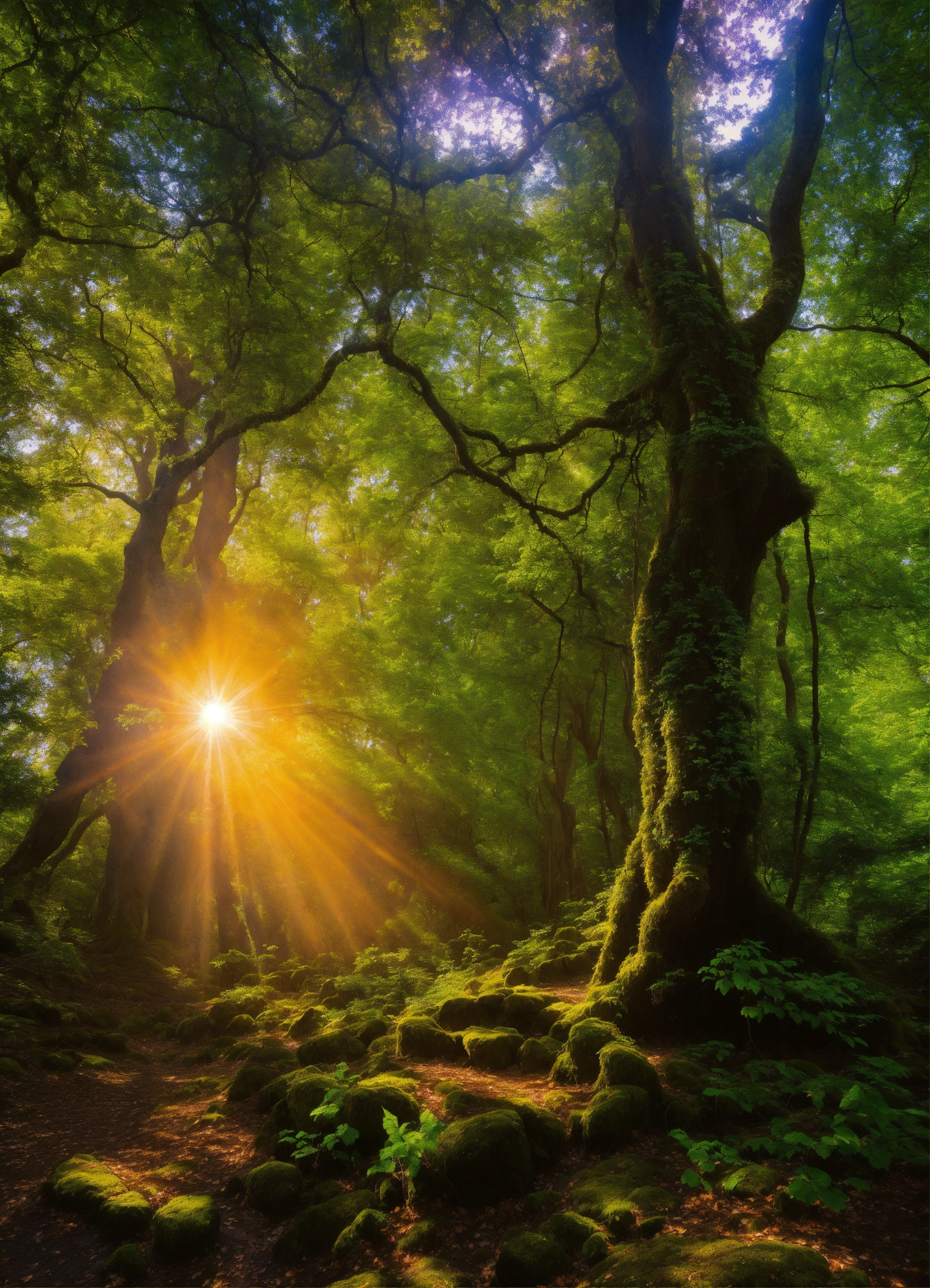 Une forêt enchantée, les arbres aux troncs d'argent et aux feuilles d'émeraude. au cœur de cette forêt, un temple ancien en ruine où une balance est en équilibre parfait, avec une pièce d'or d'un côté et un cœur battant de l'autre. des faisceaux de lumière percent la canopée, éclairant la scène d'une douceur magique.