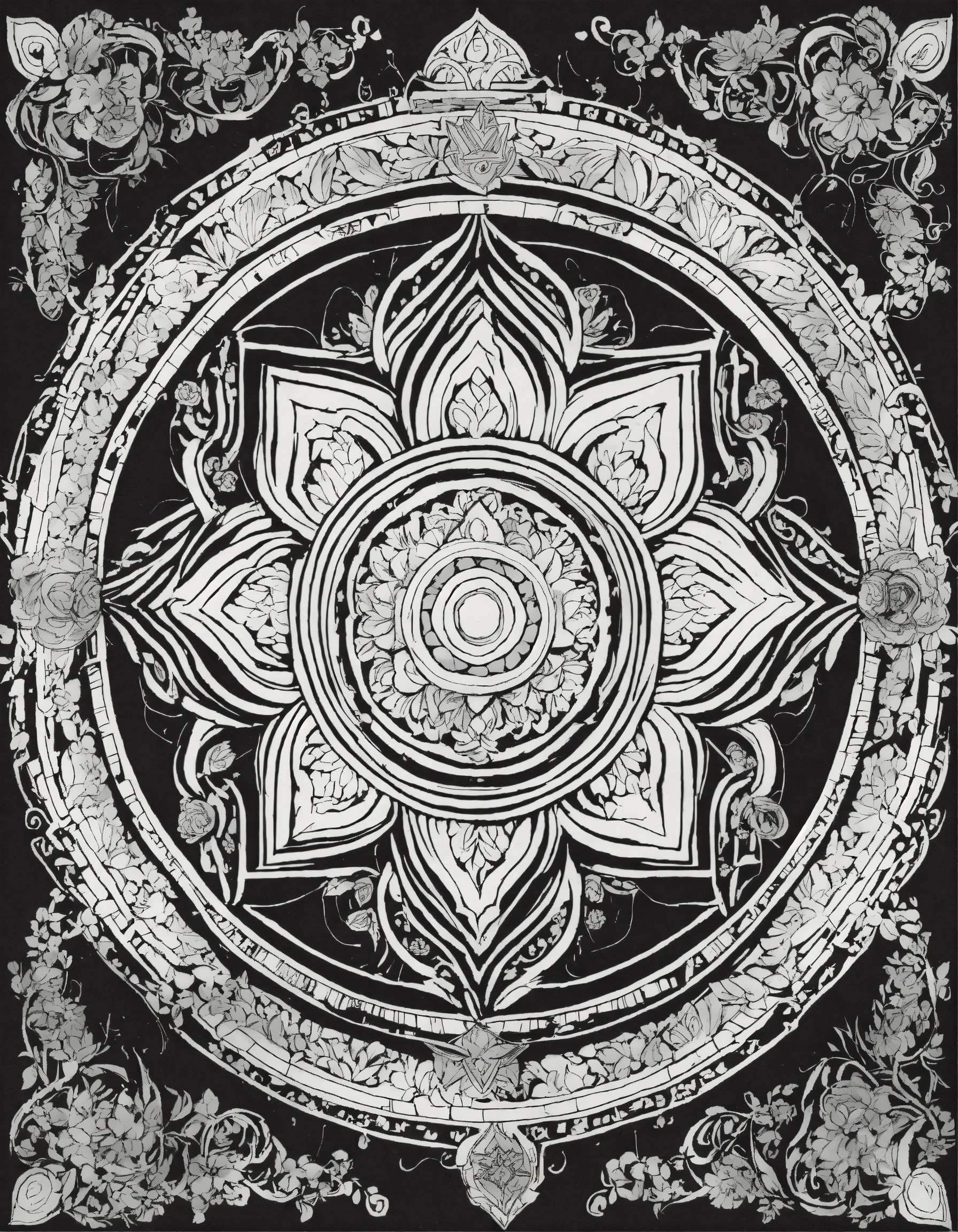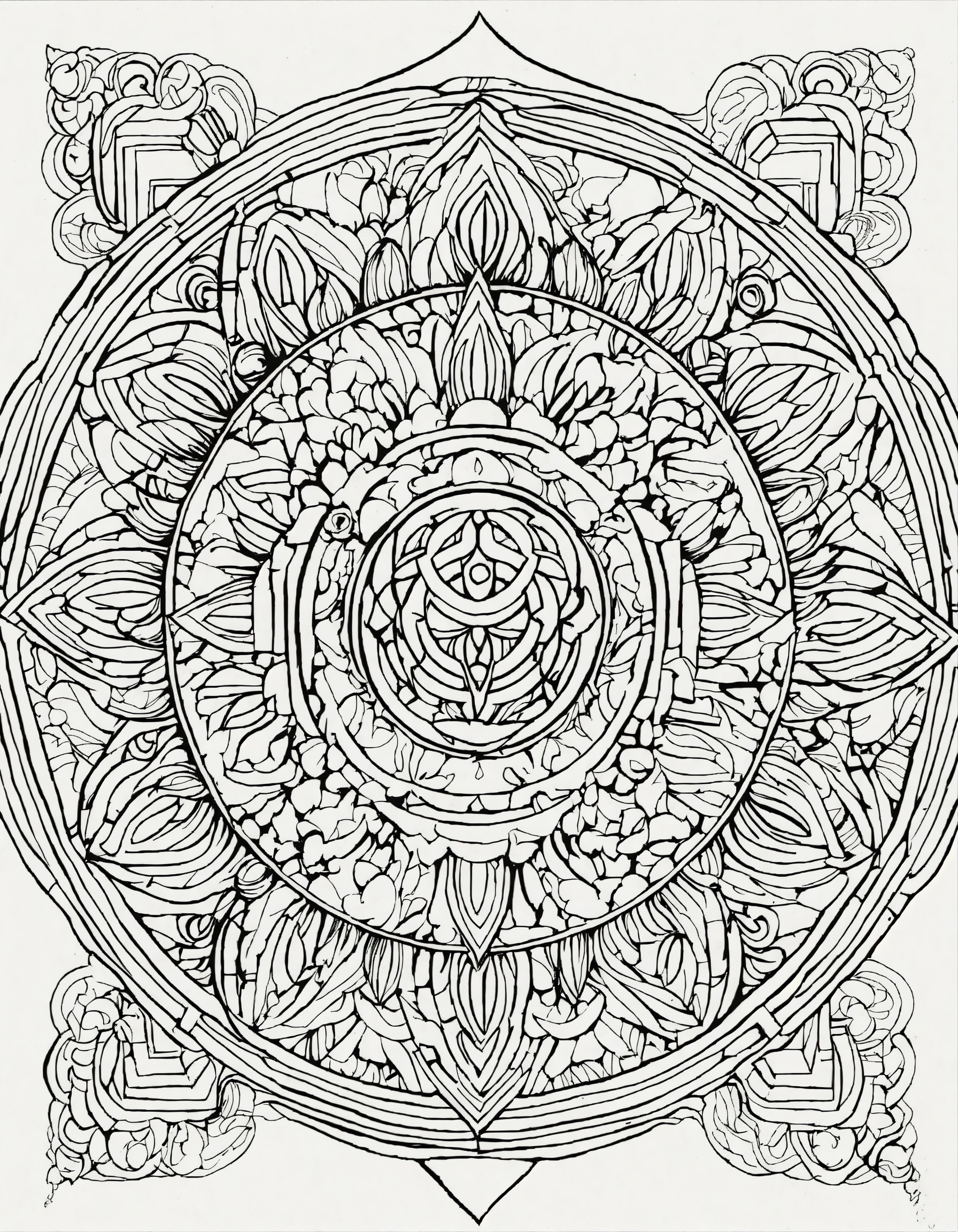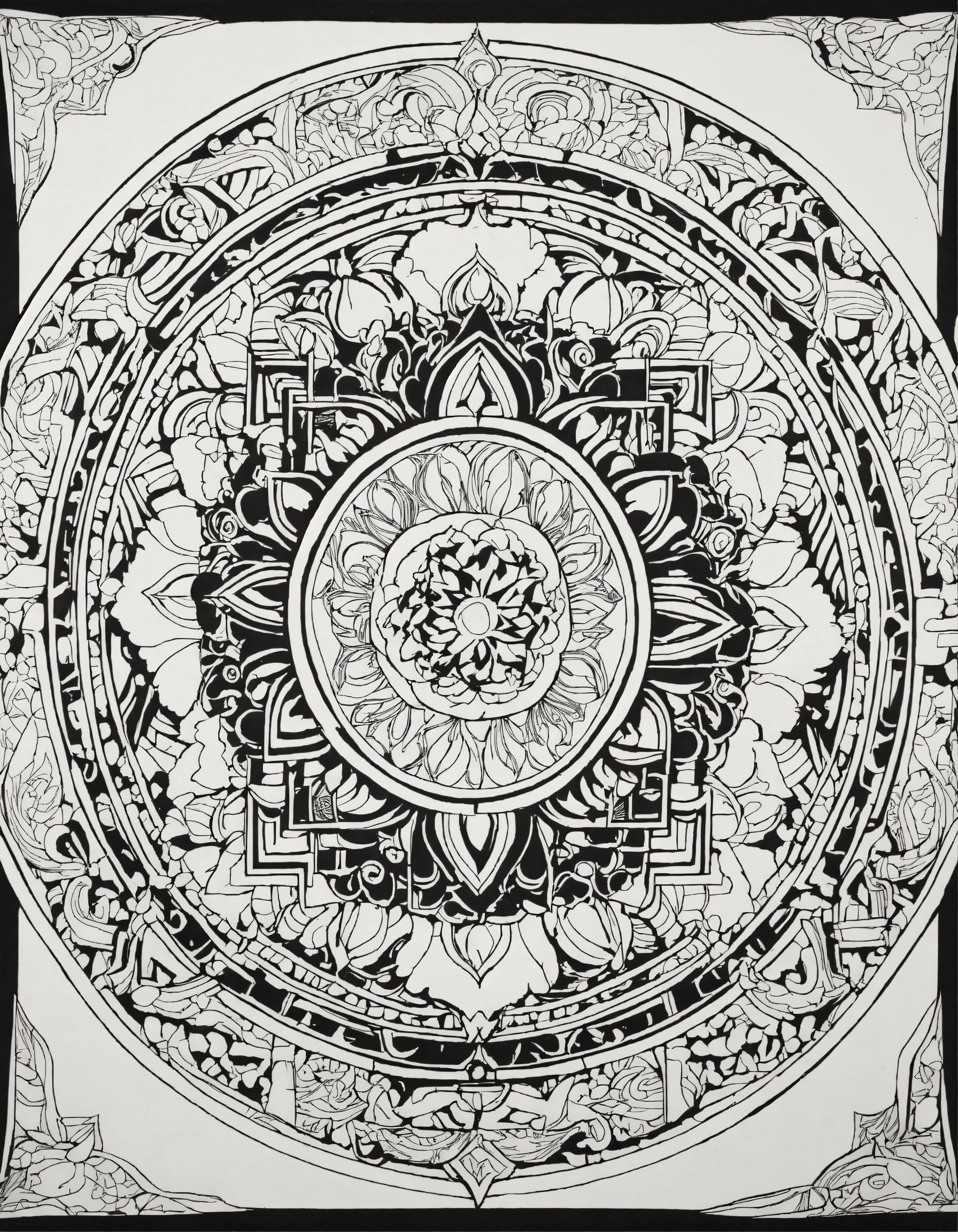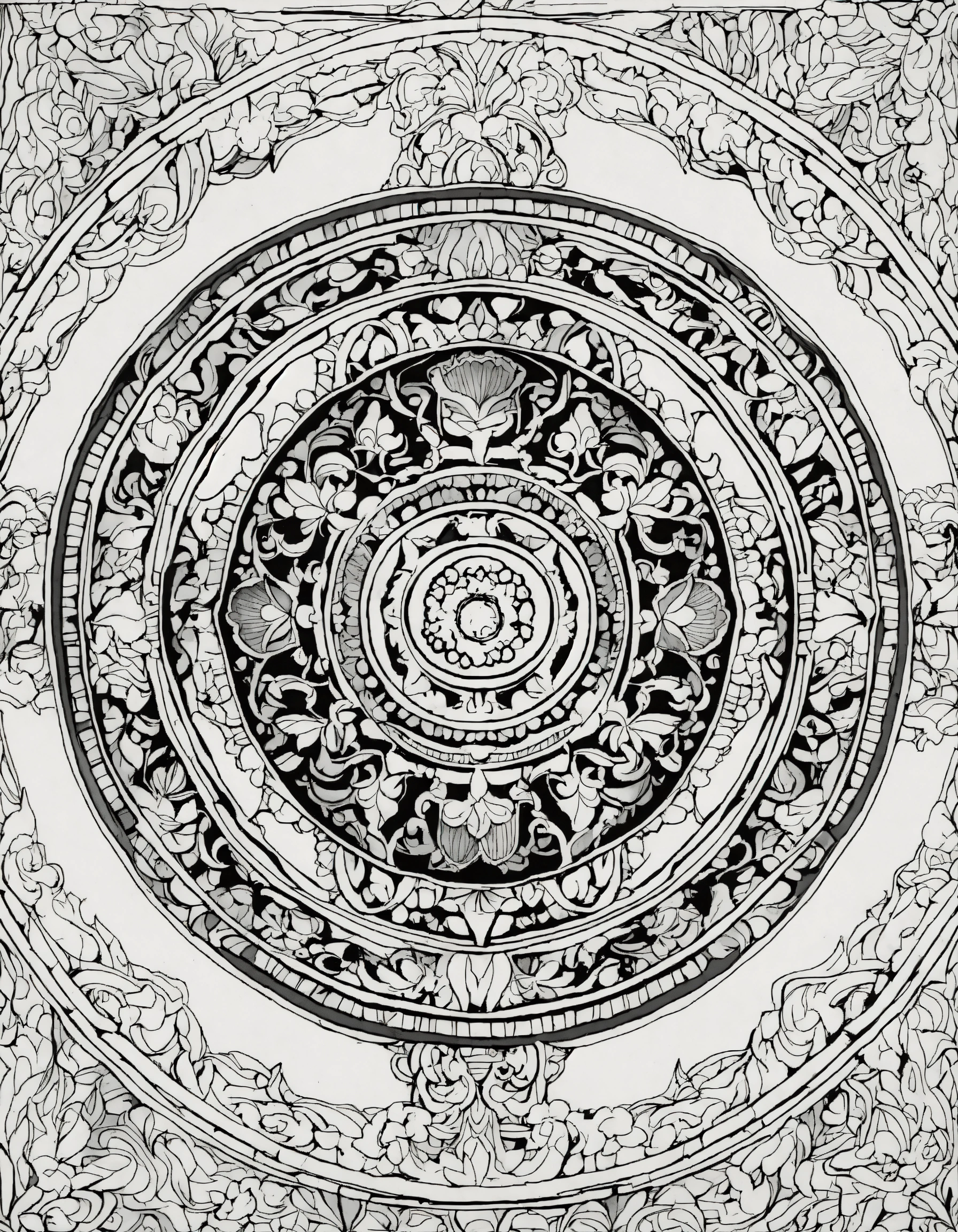 A black and white drawing for a coloring book, black thin lines, a spiritual mandala with hindu elements