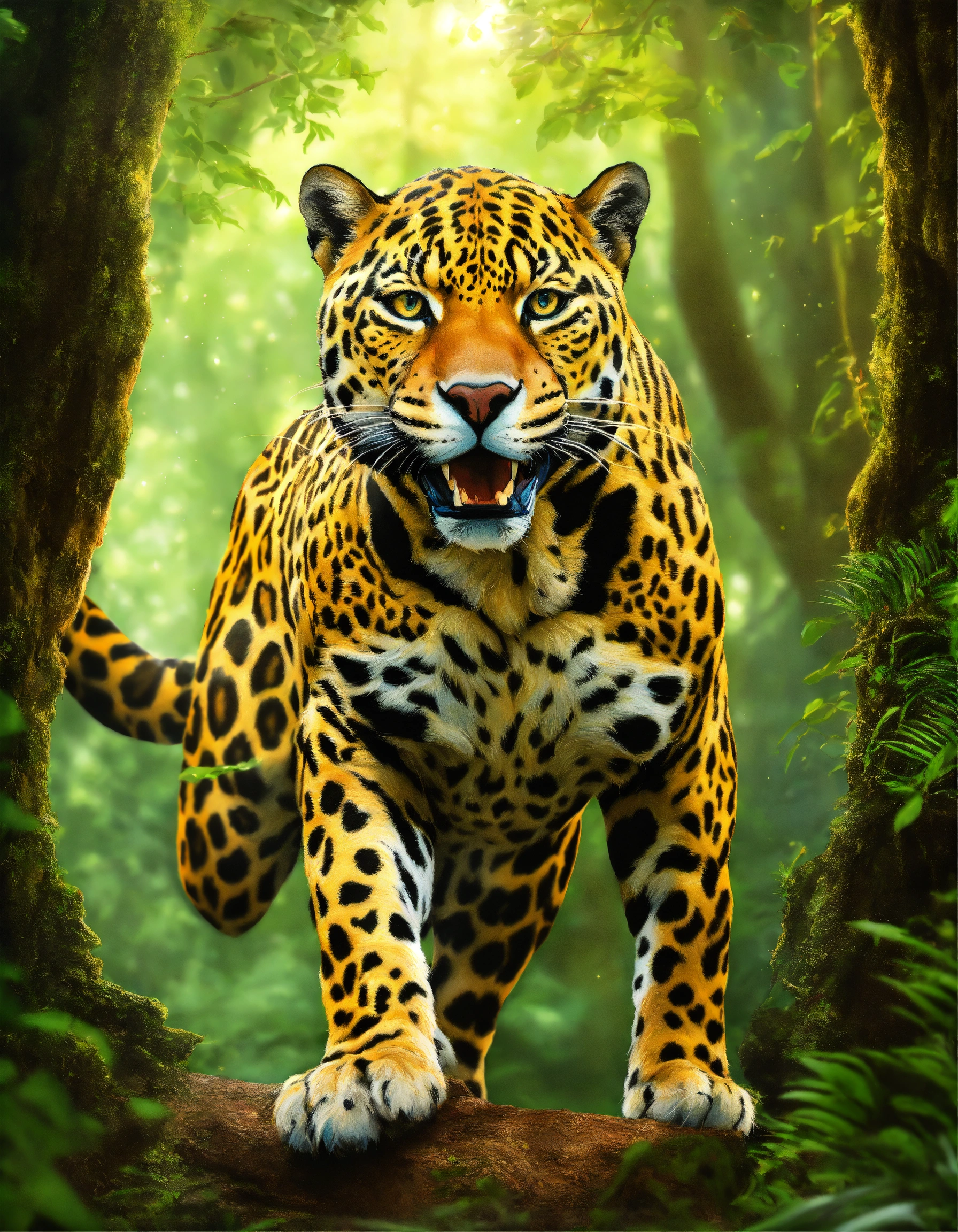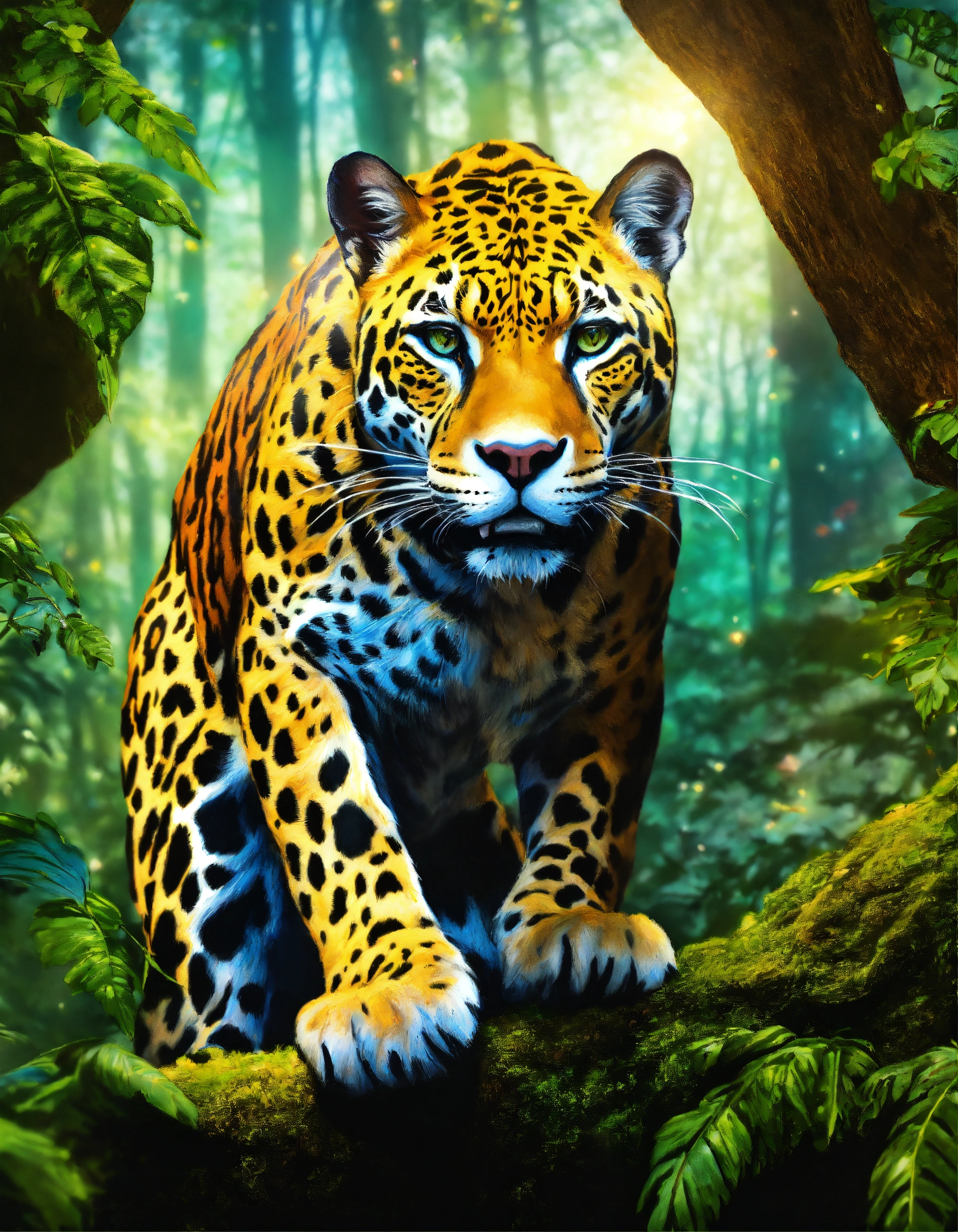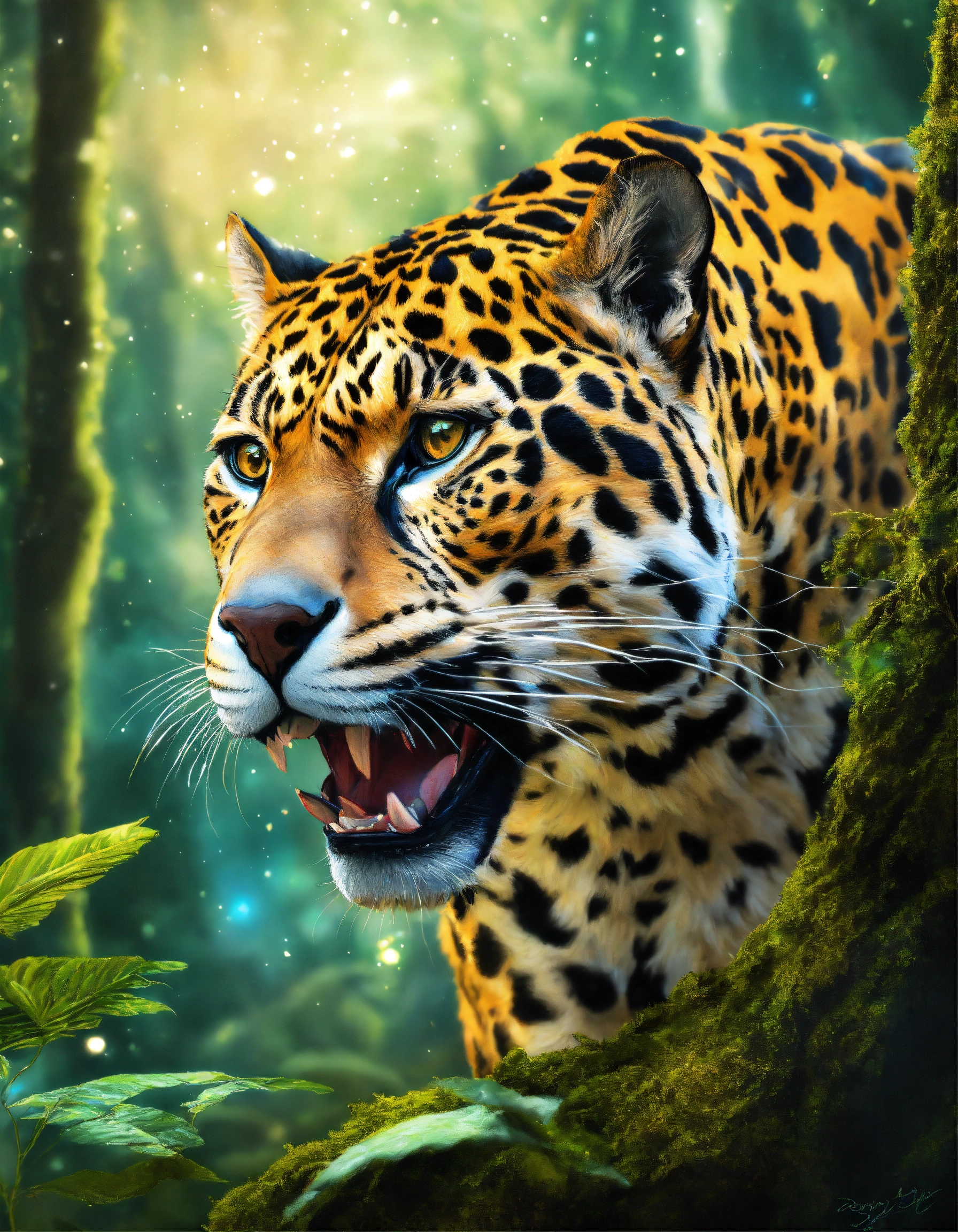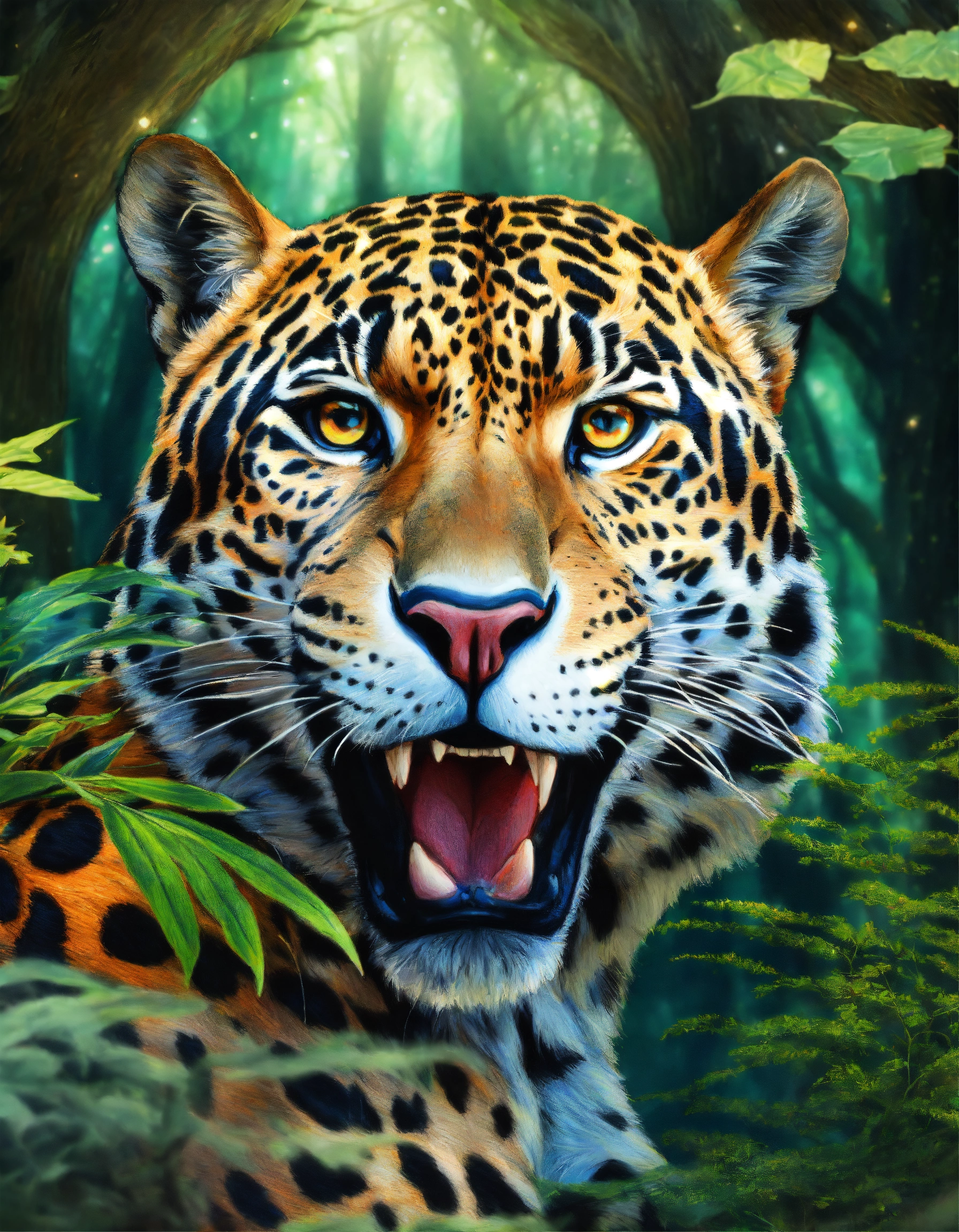 Realistic colored pencil drawing of a large and ferocious celestial enchanted jaguar, in the middle of an enchanted forest, fantasy art, cosmic elements