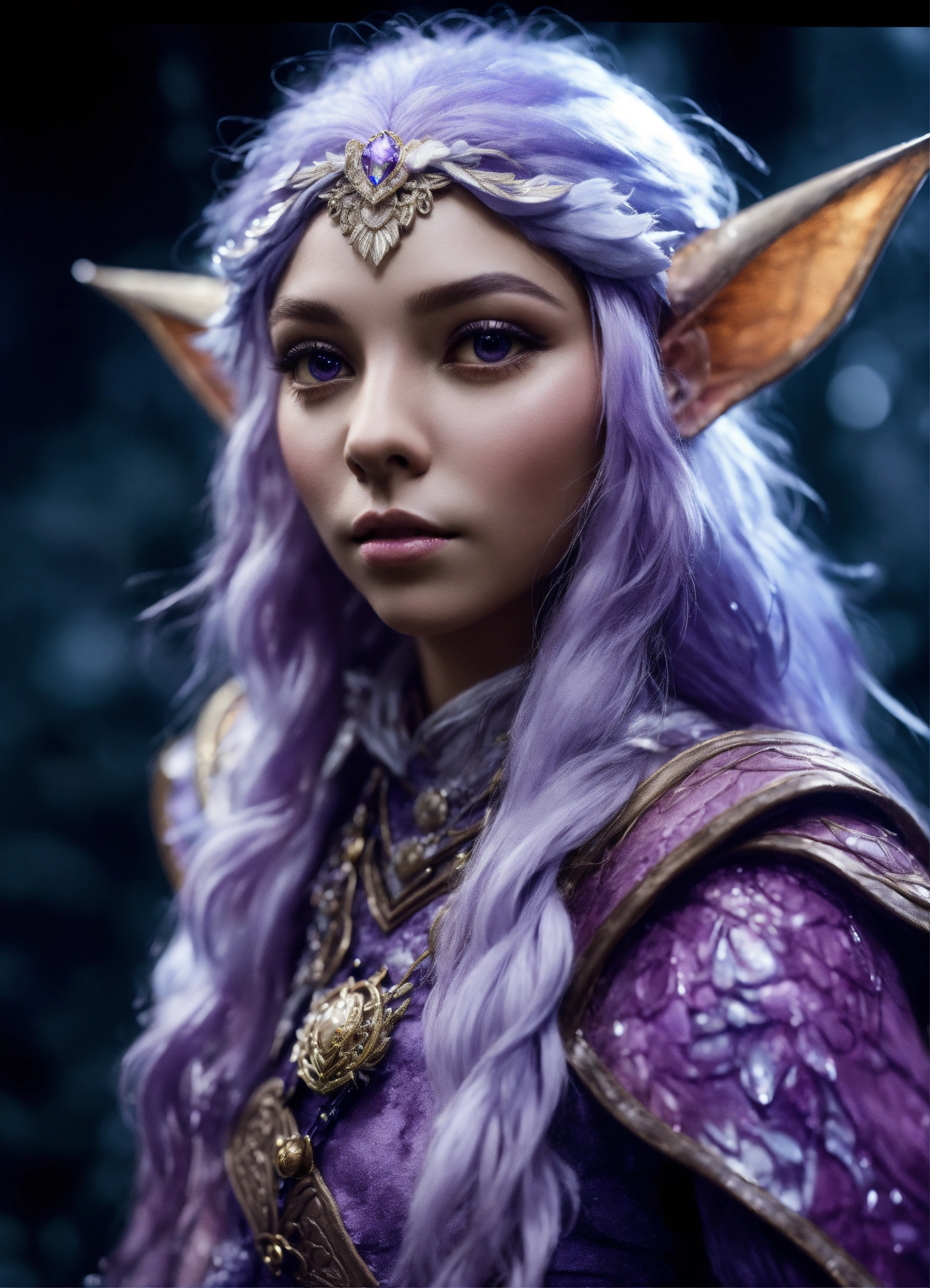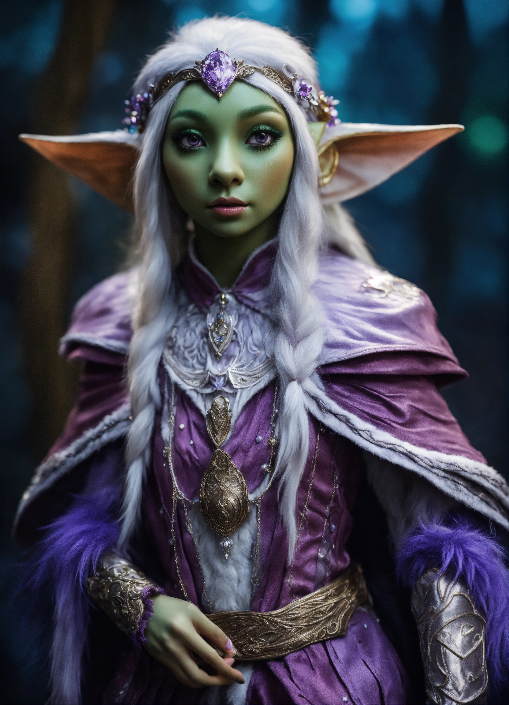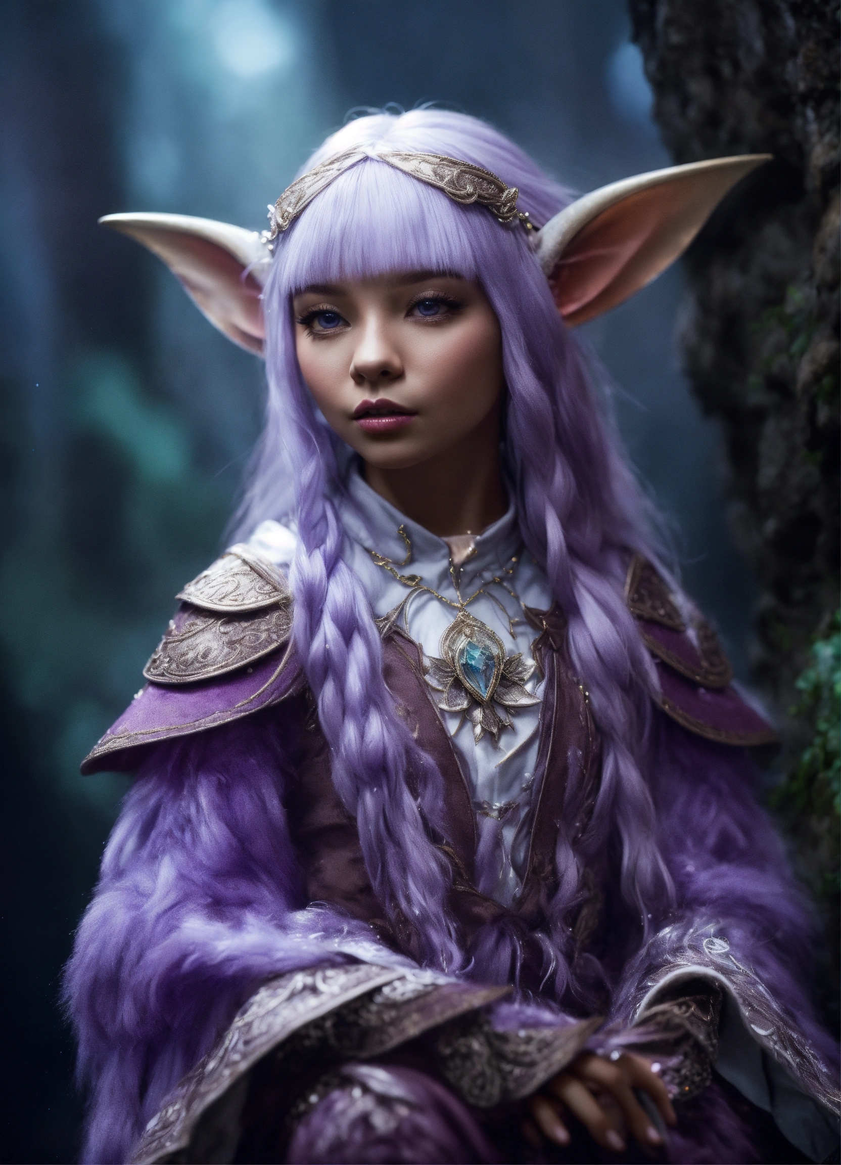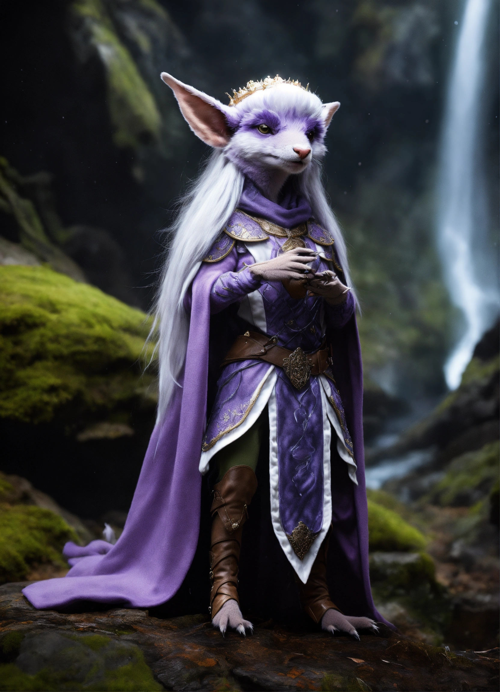 A elf extra furry animal like purple and white clothes princess full body life size from the dark crystal hyperrealistic, splash art, concept art, mid shot, intricately detailed, color depth, dramatic, high definition