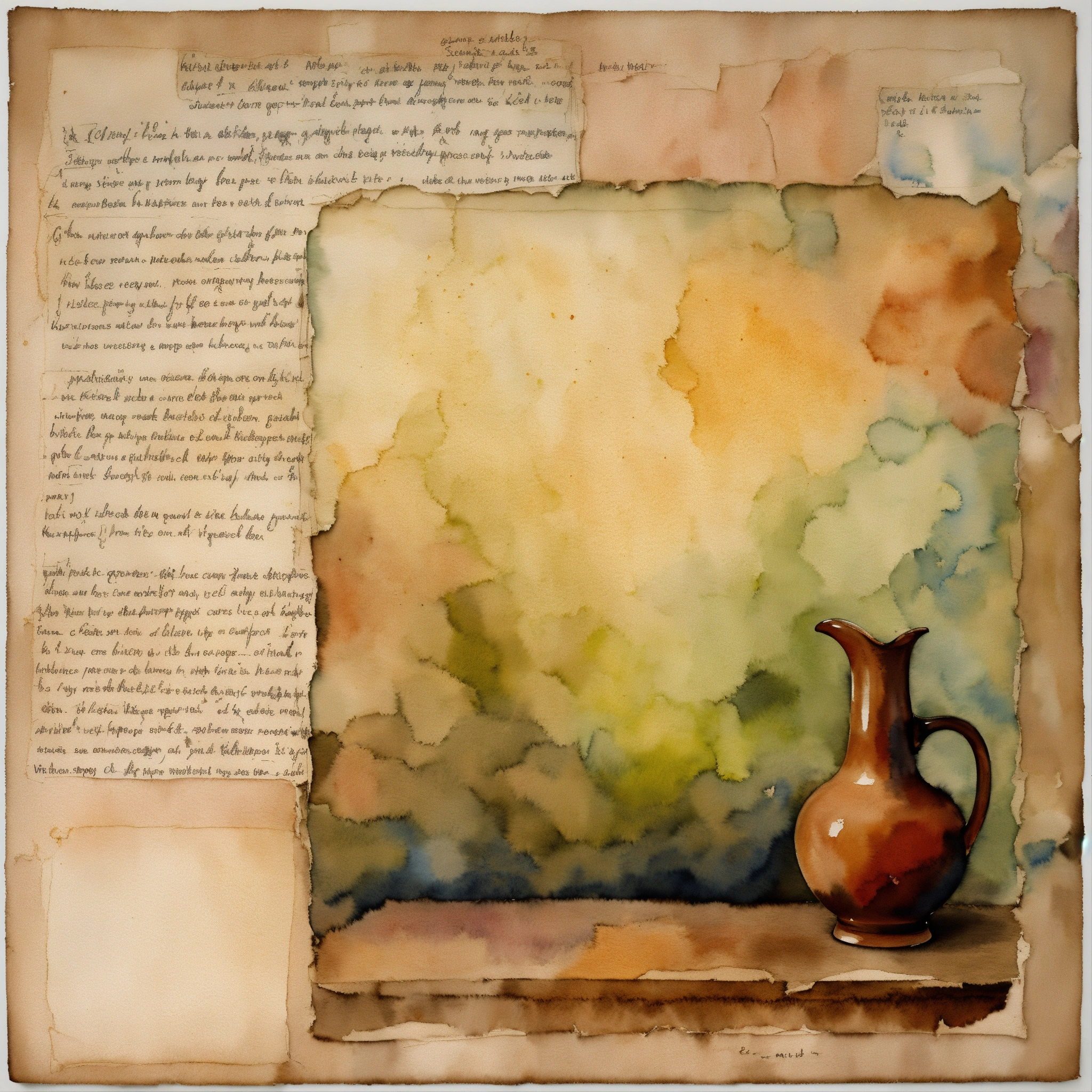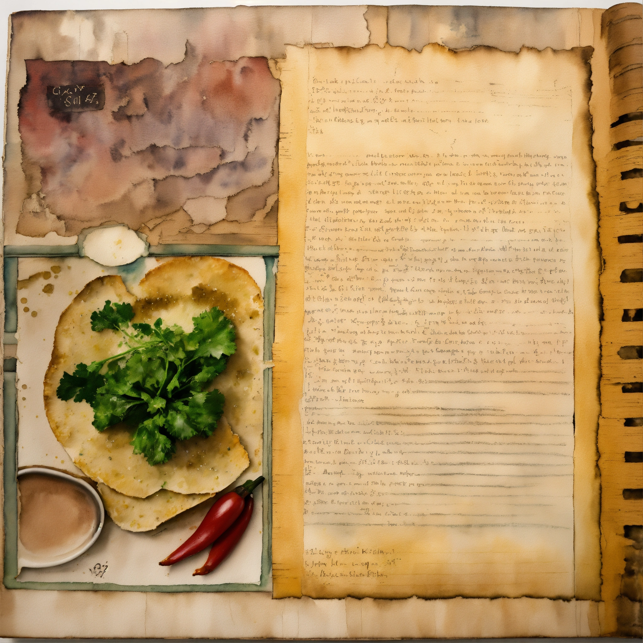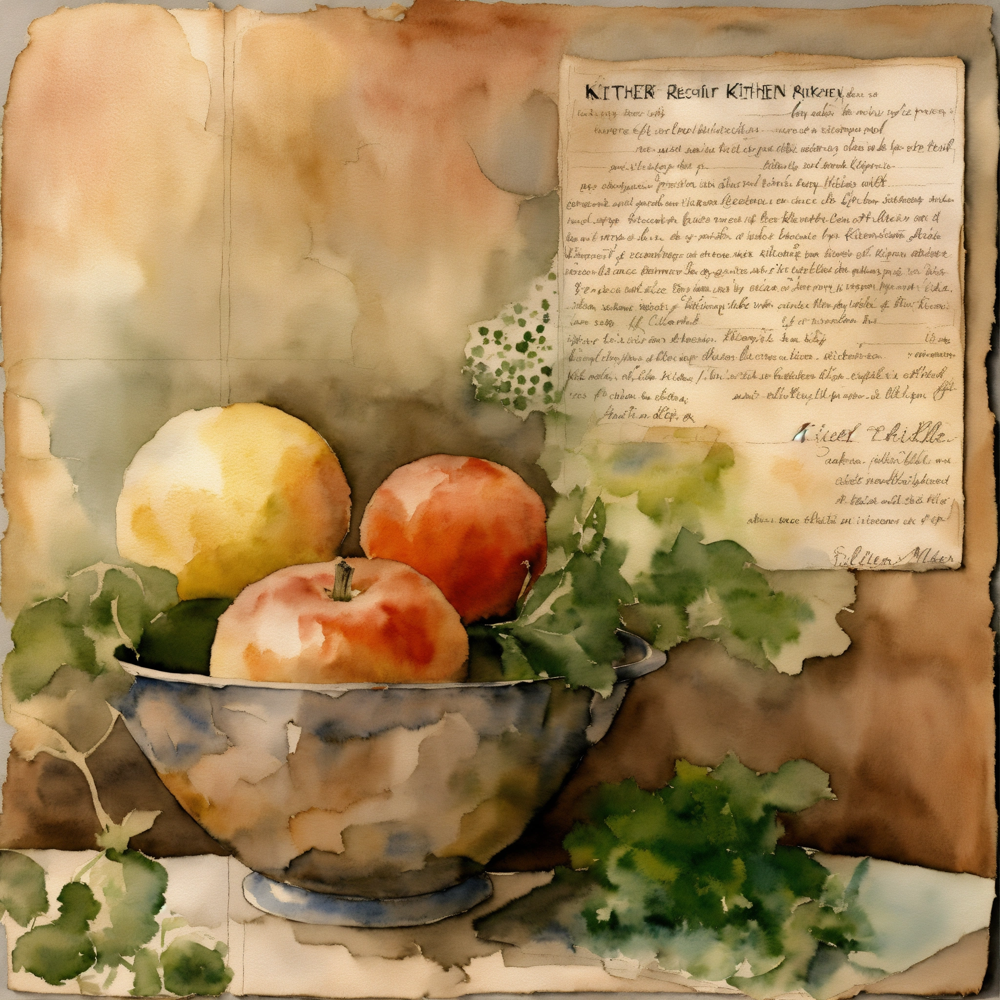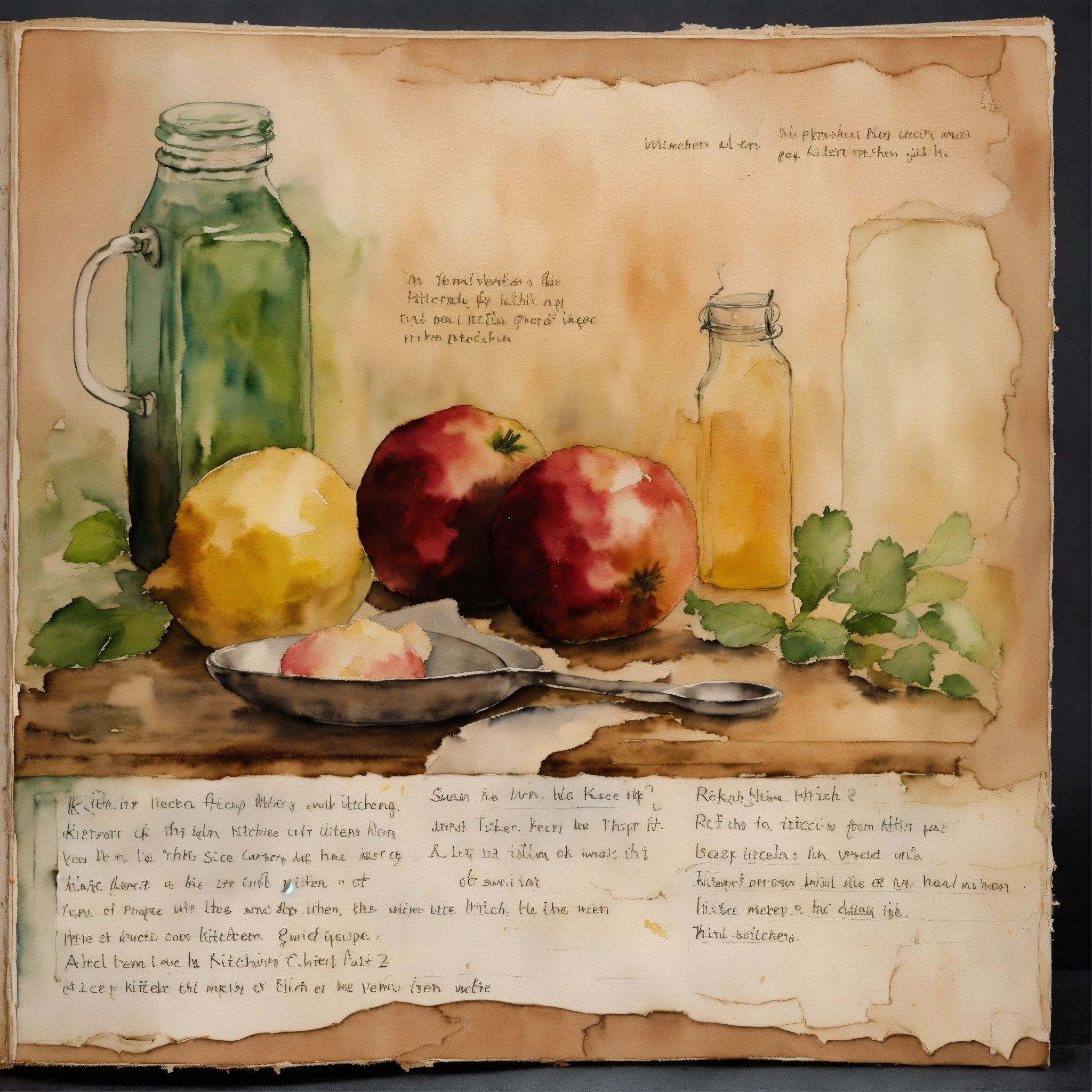 Square 12 x 12 scrapbook page of a kitchen recipe, in the form of a scrape page, watercolour painting with muted tones, a place for notes, torn edge, very minimalist, worn and tattered, stained, a very slight image of a kitchen to the right hand side blended and faded, by cicely mary barker