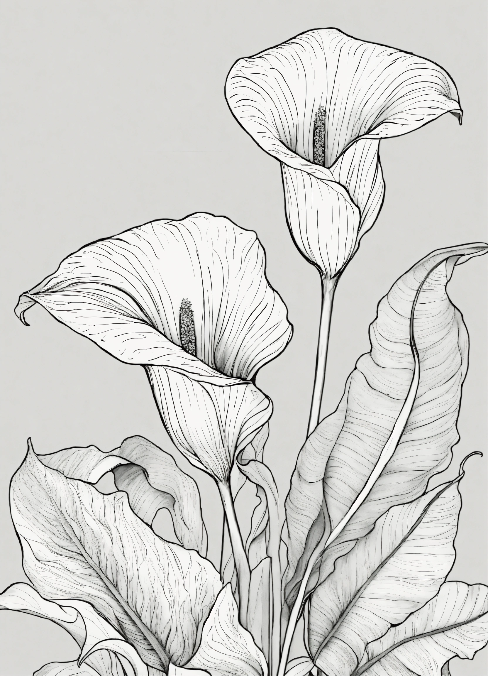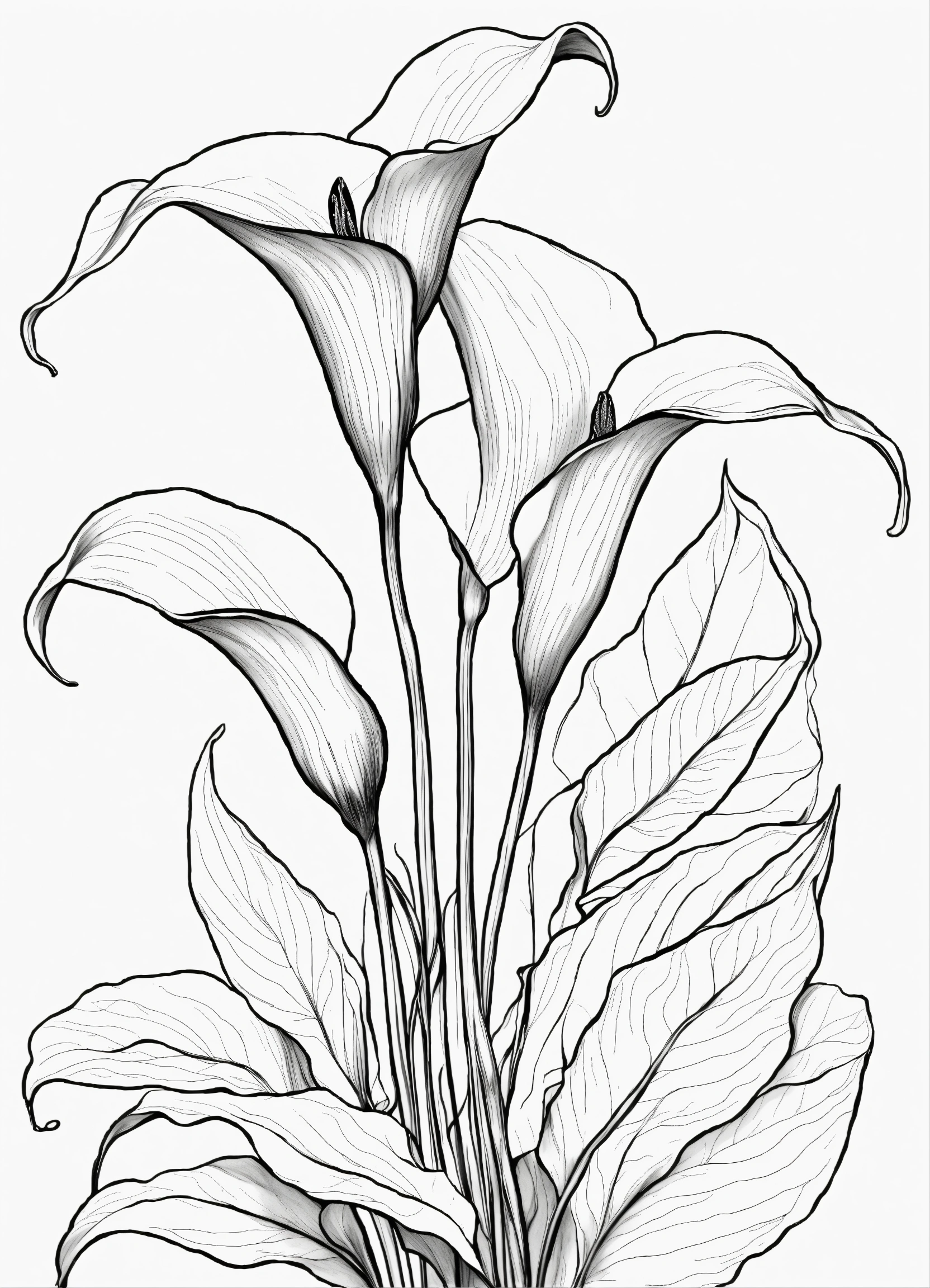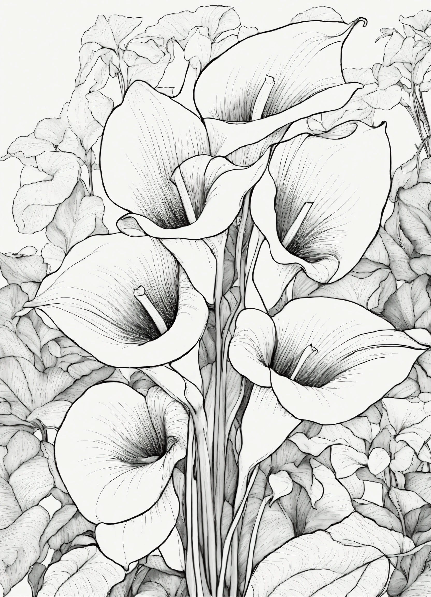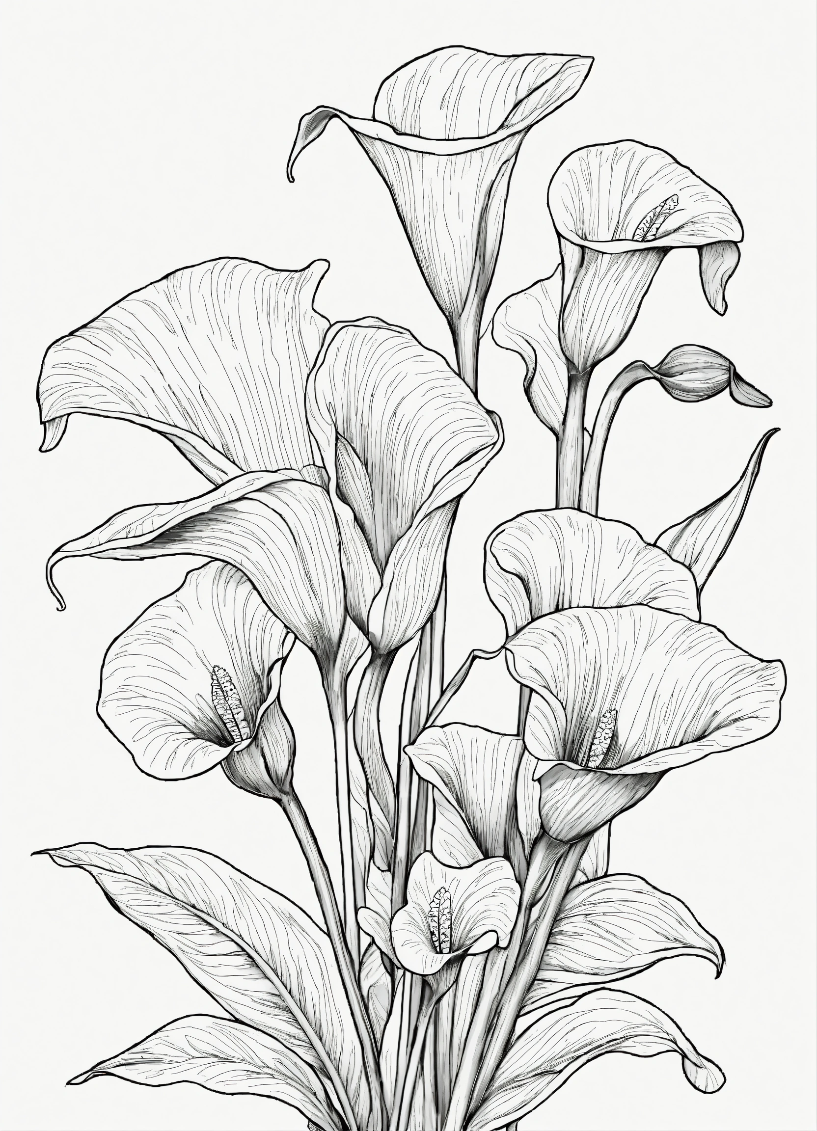 A black and white drawing for a coloring book, black thin lines. white background, the drawing of a beautiful set of calla wisterias flowers