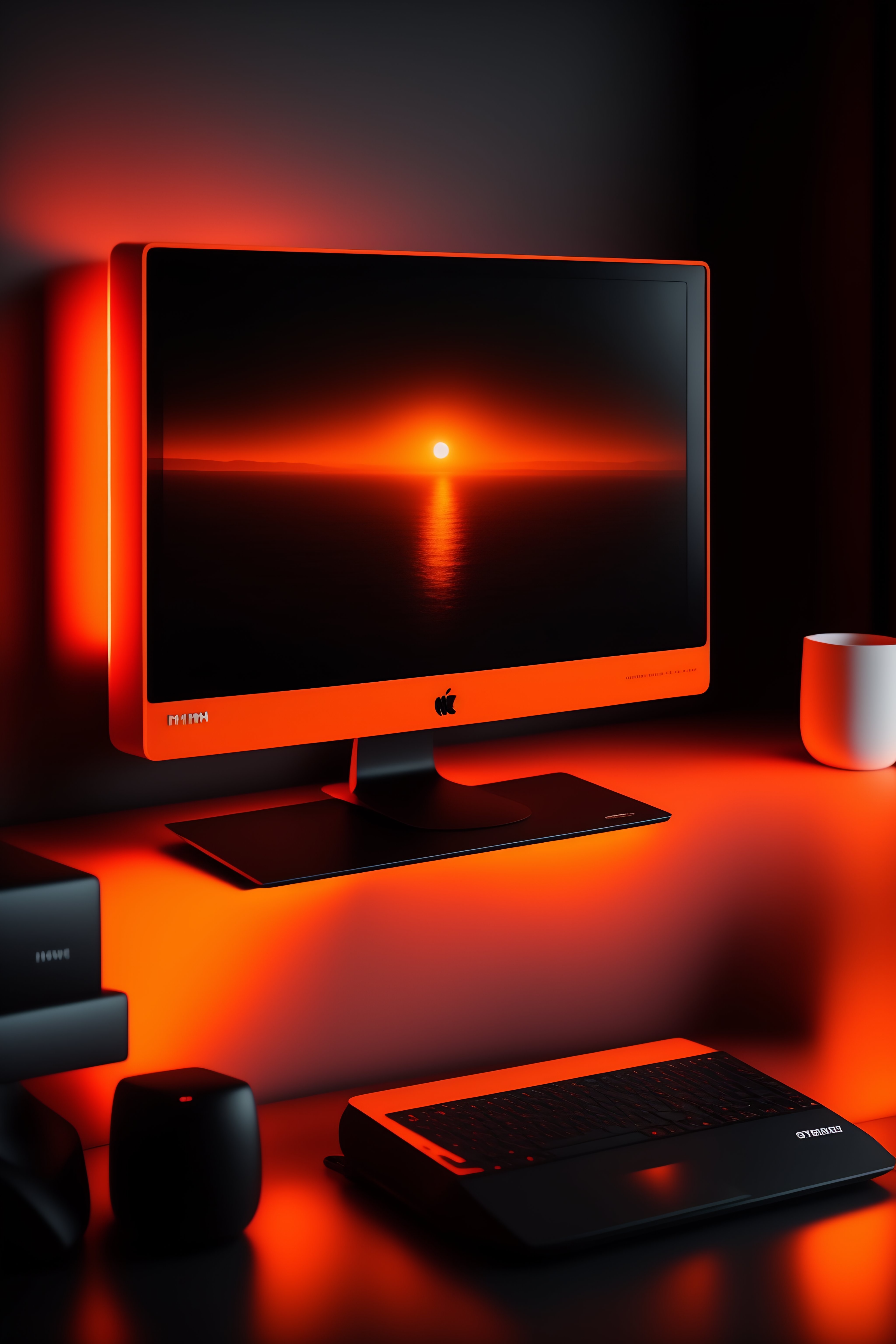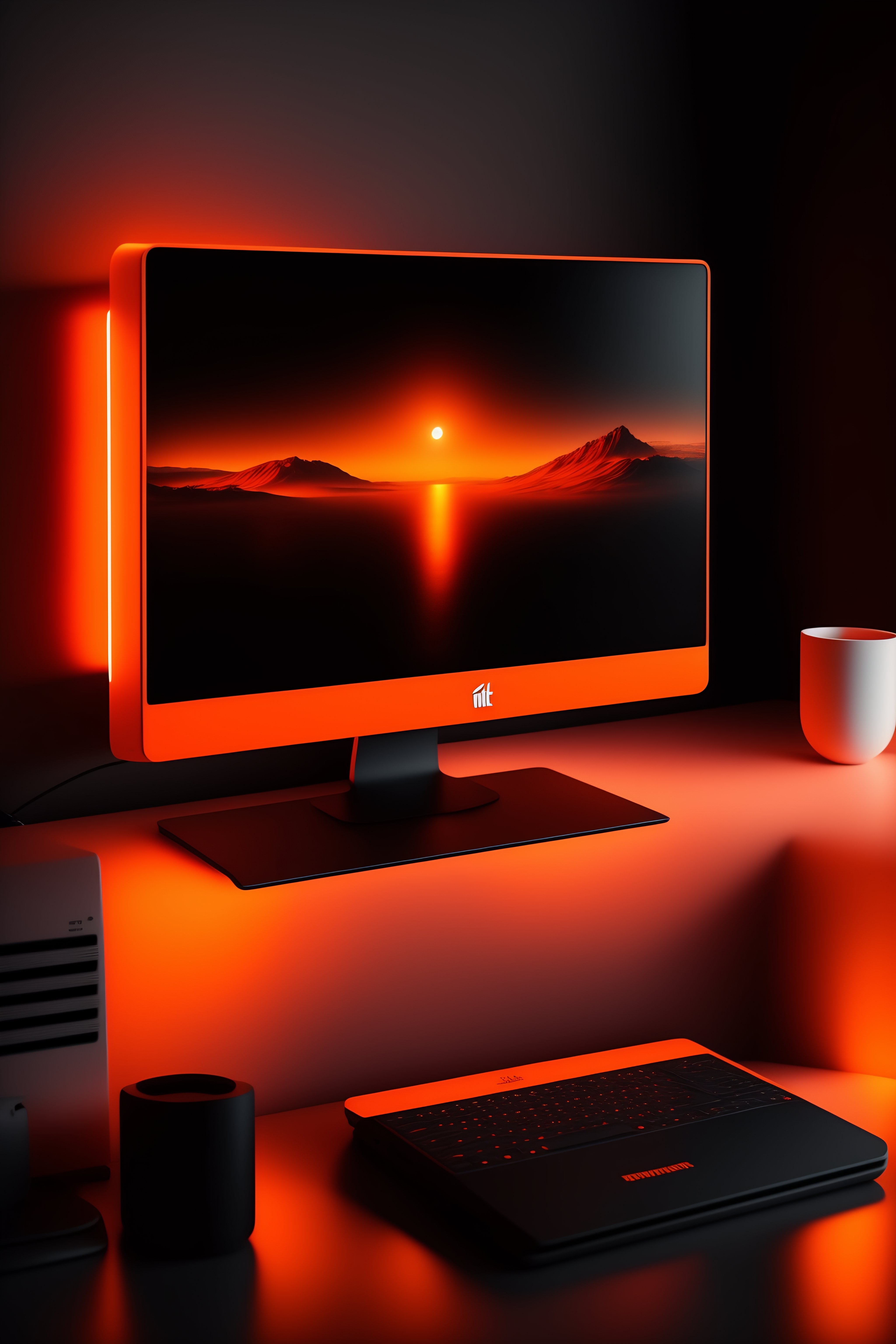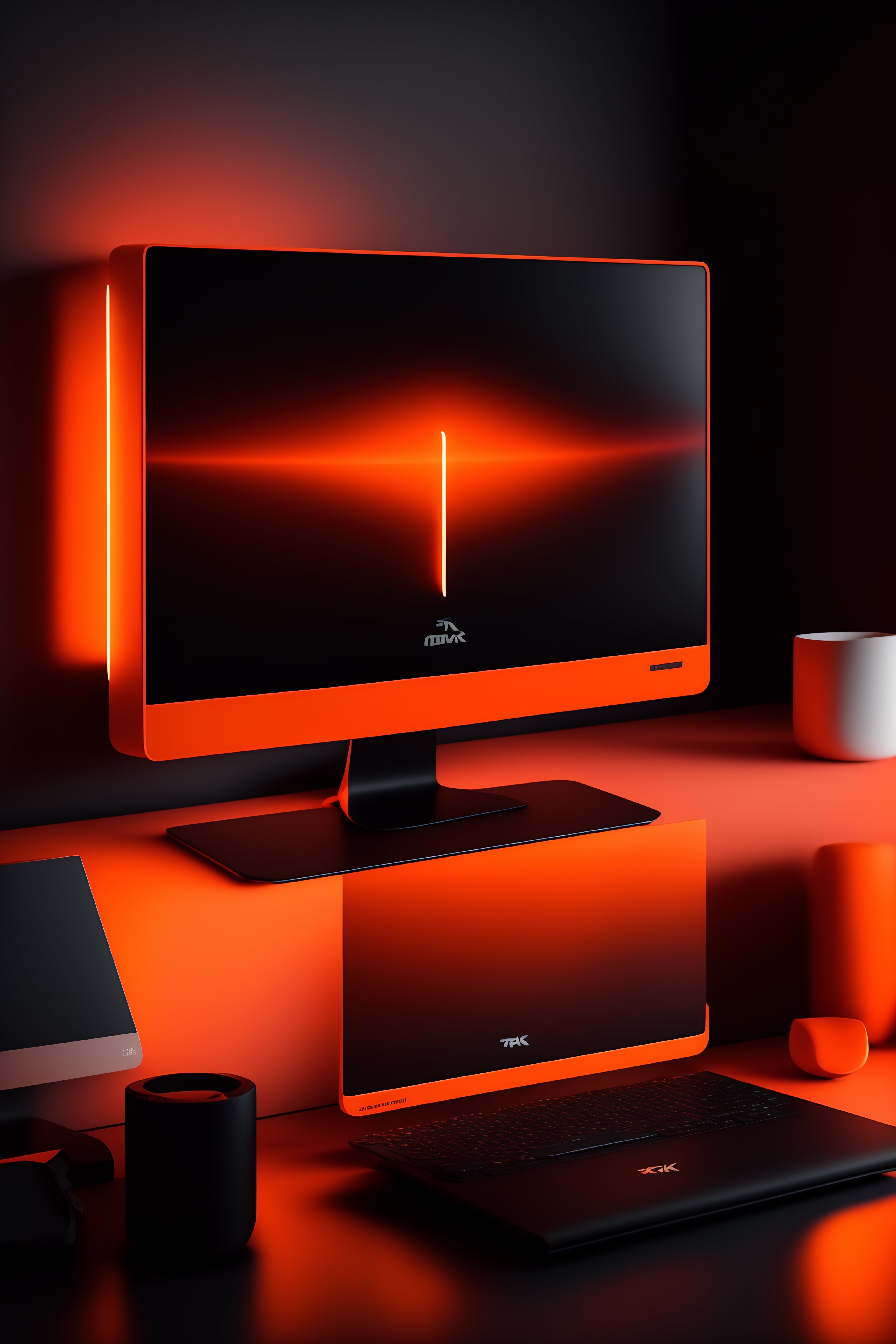 Escritorio simple moderno con dos monitor en el tope y una pc gamer, imagen realista 4k, color negro y naranja