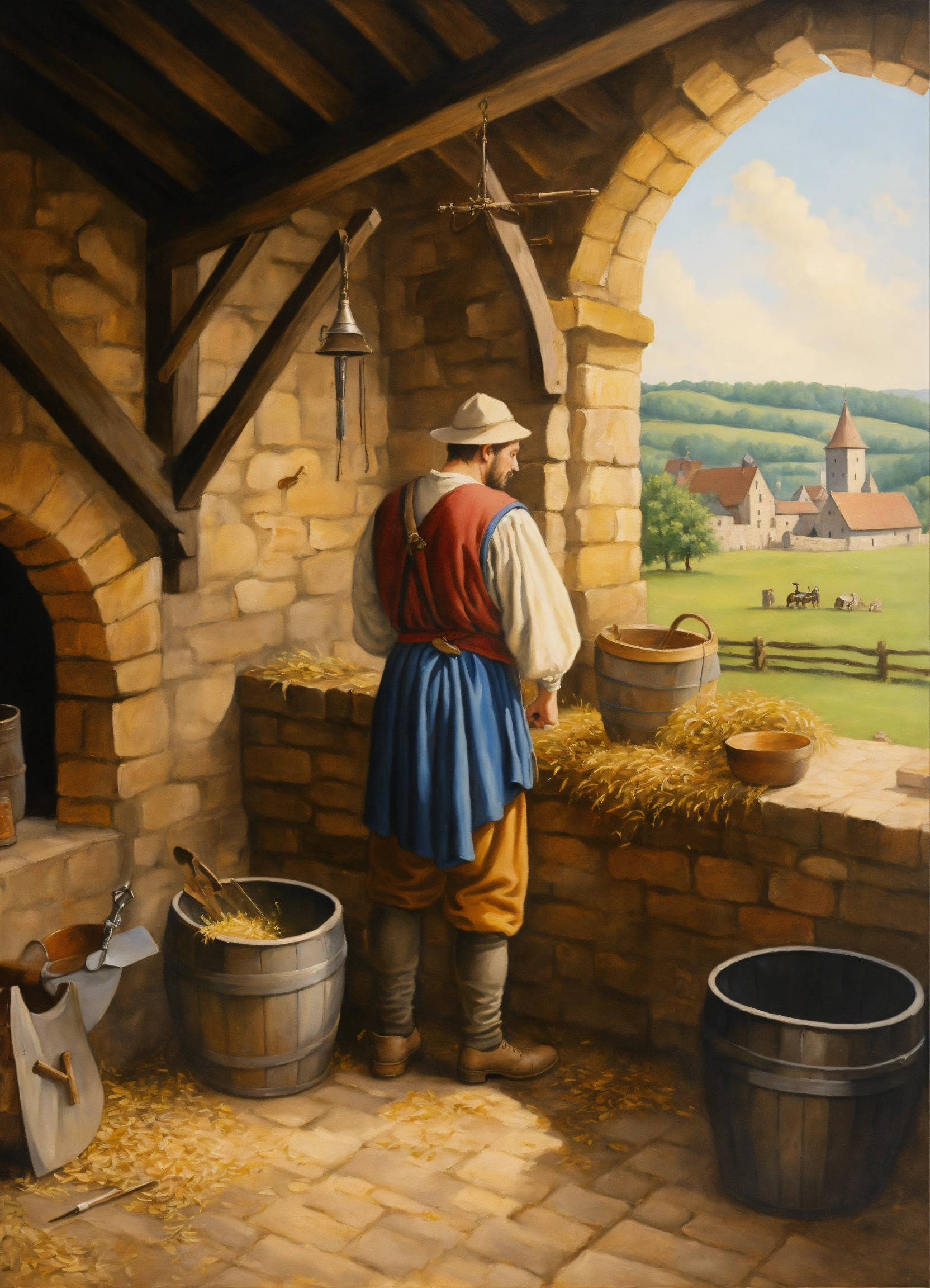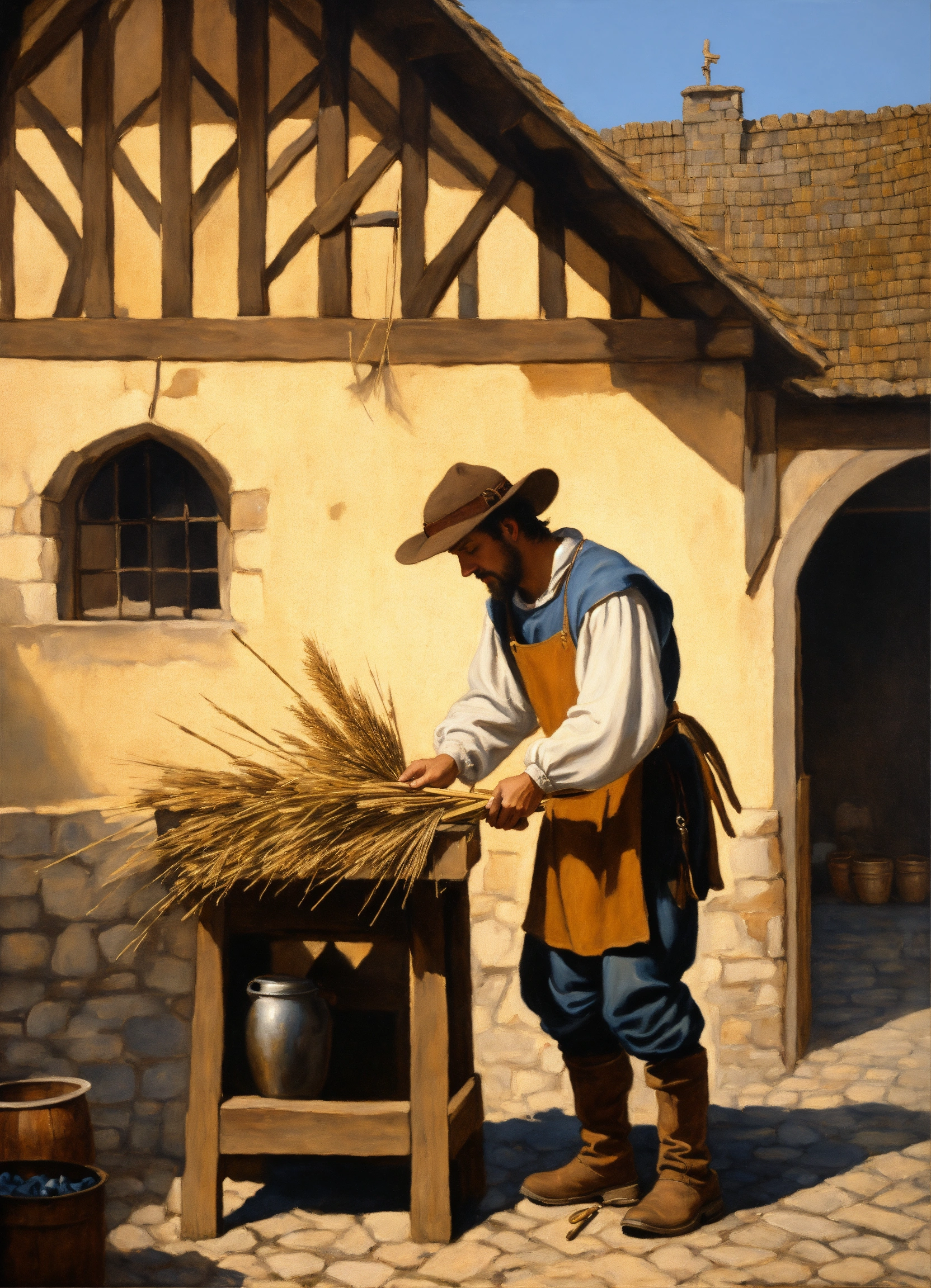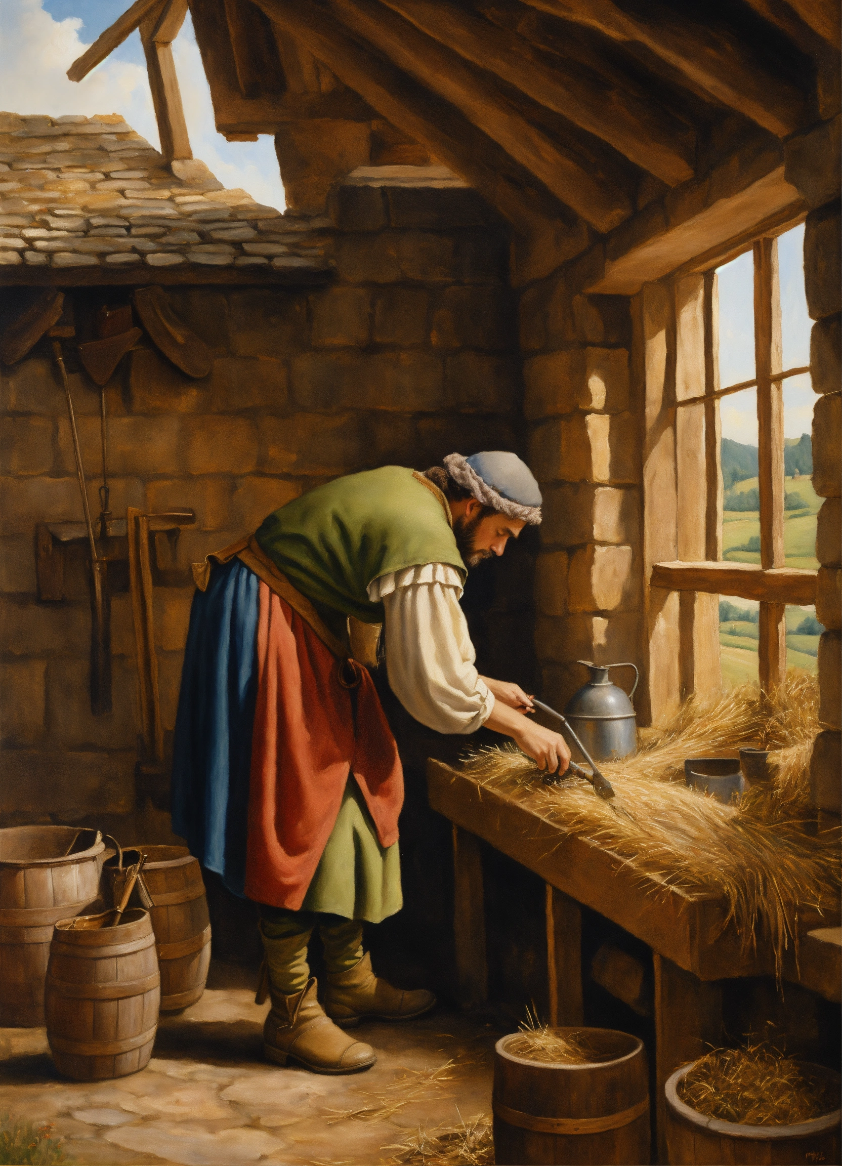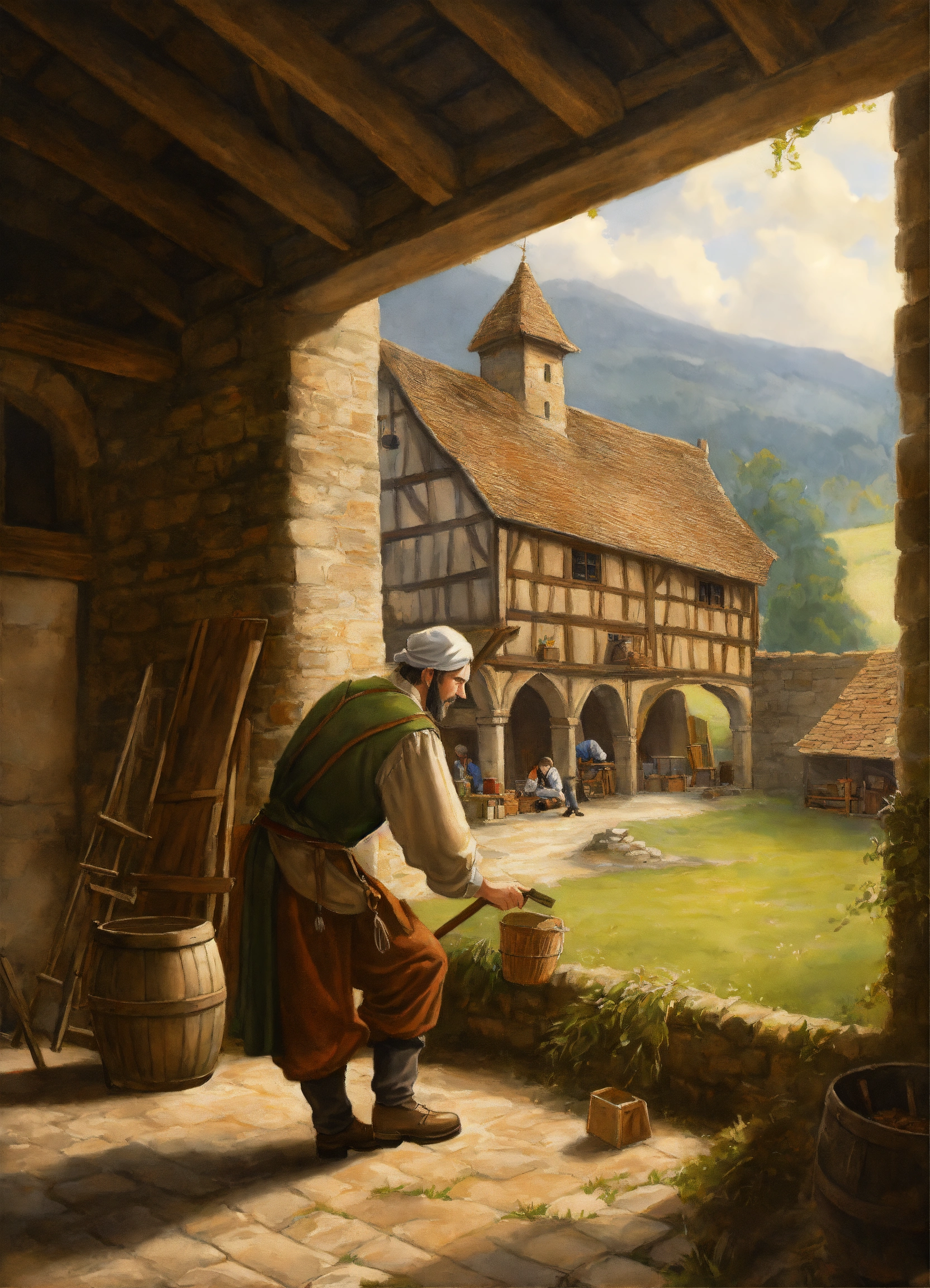 A realistic painting of a medieval peasant working on a barn in a castle courtyard