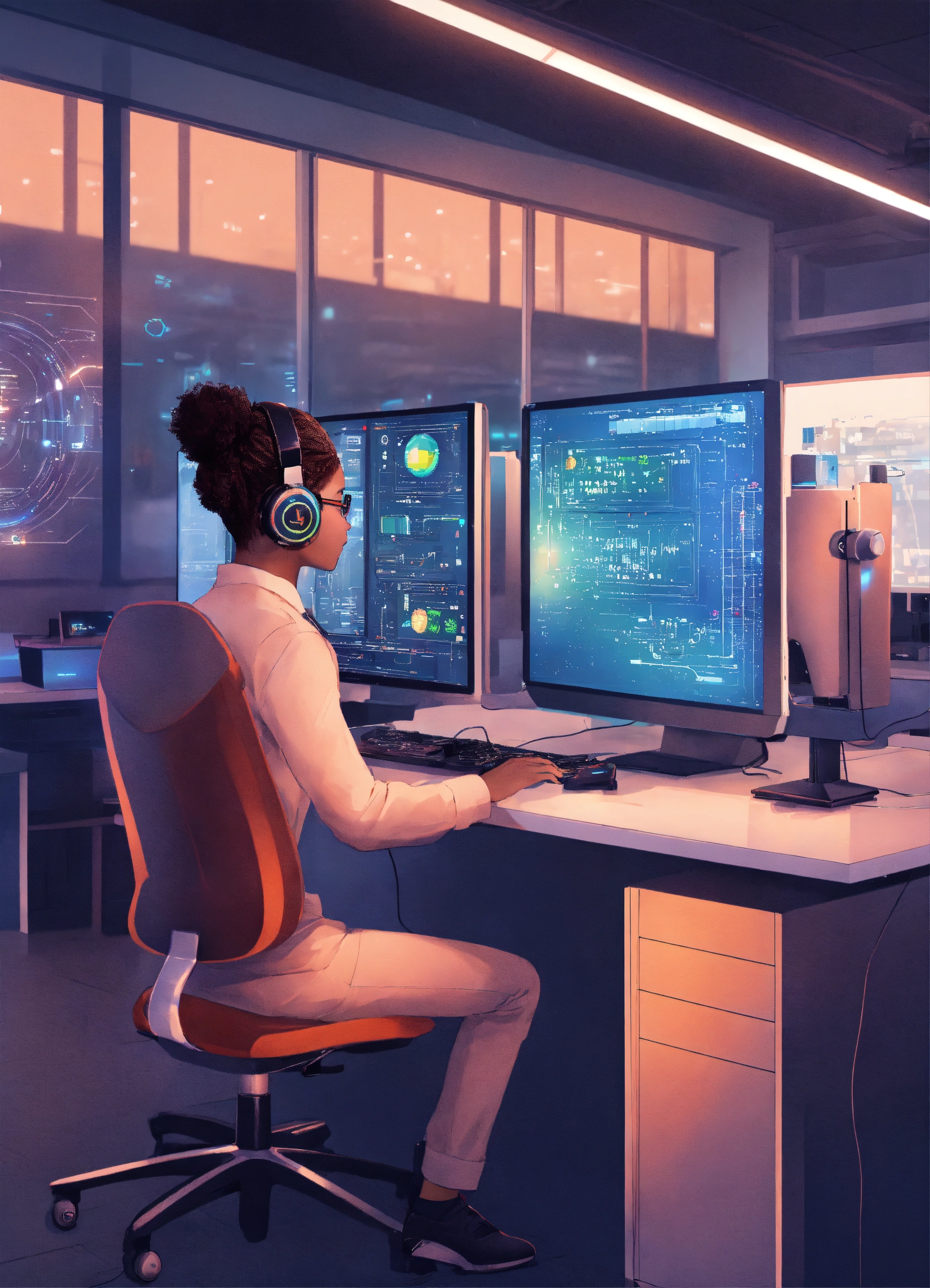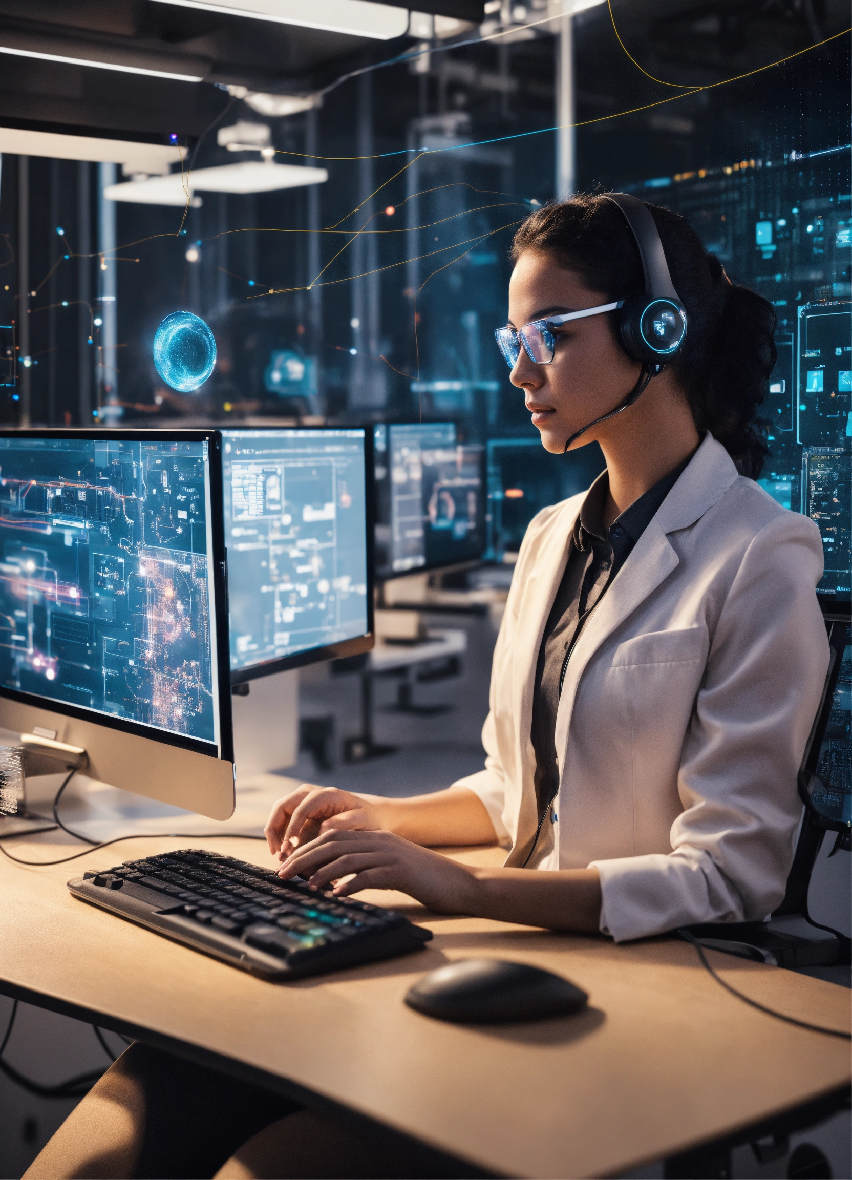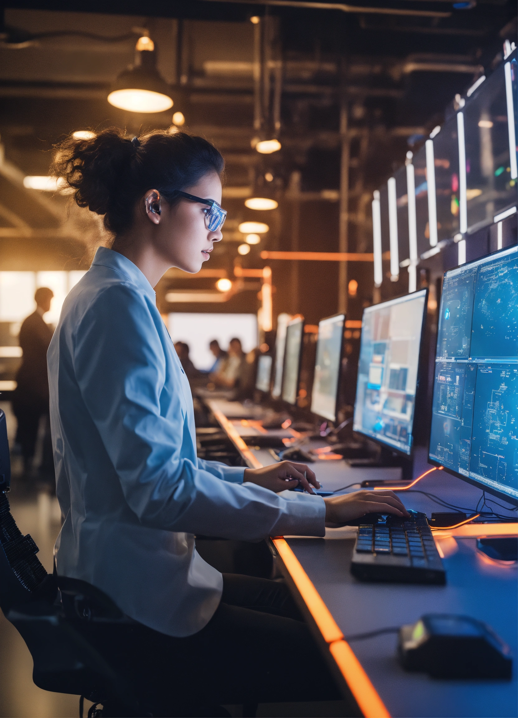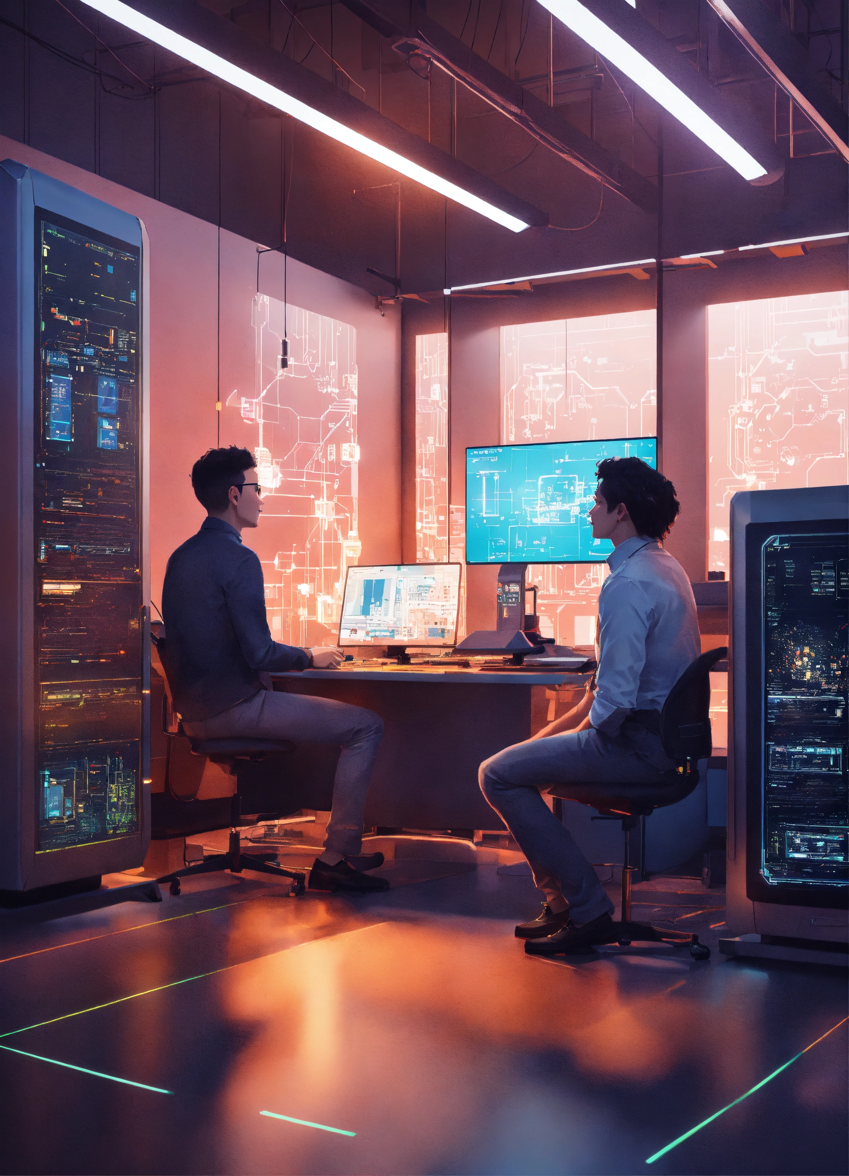 Create an image of young professionals, innovating in a technological computer lab, which is enhanced with ai-augmented machines.