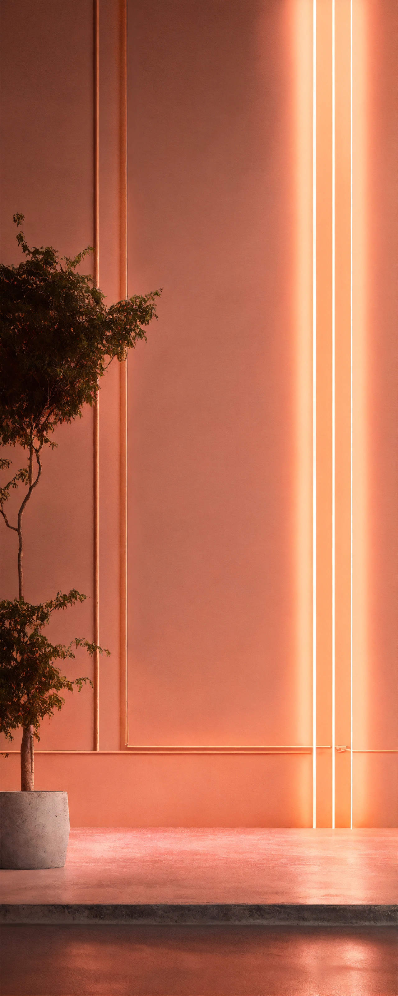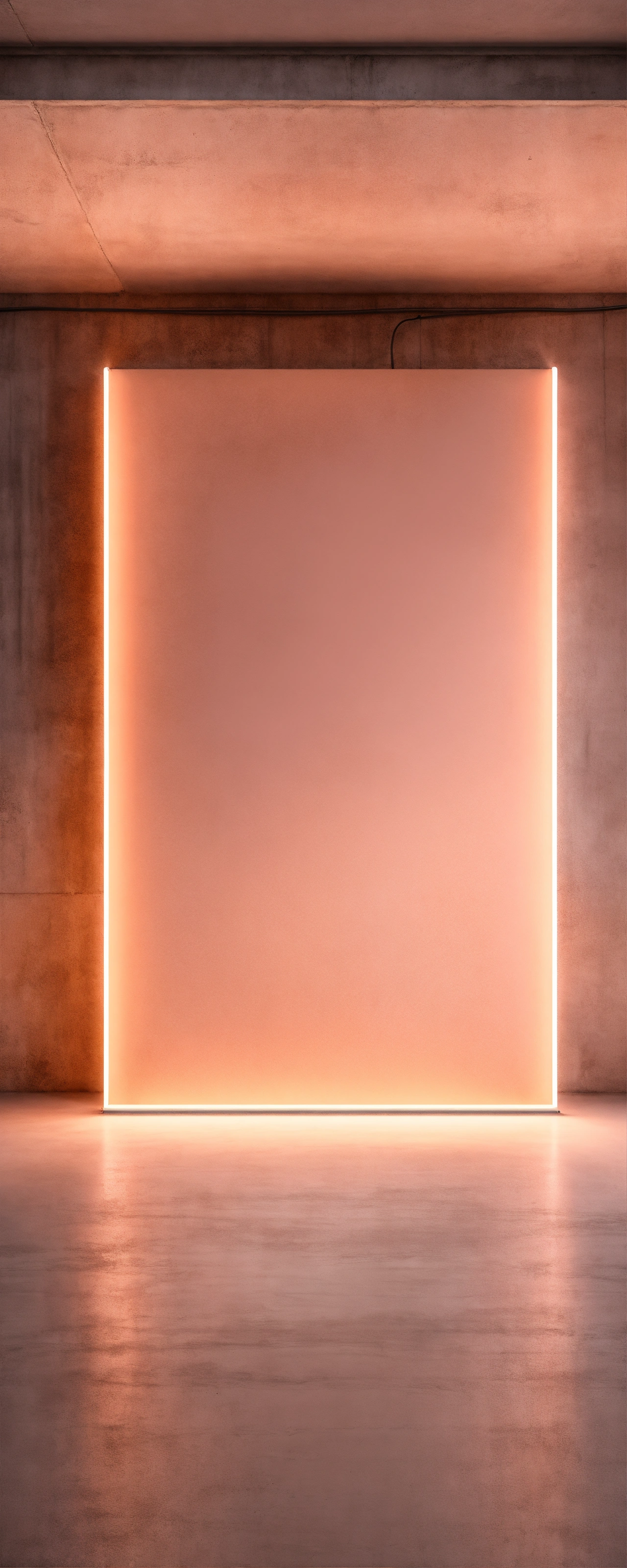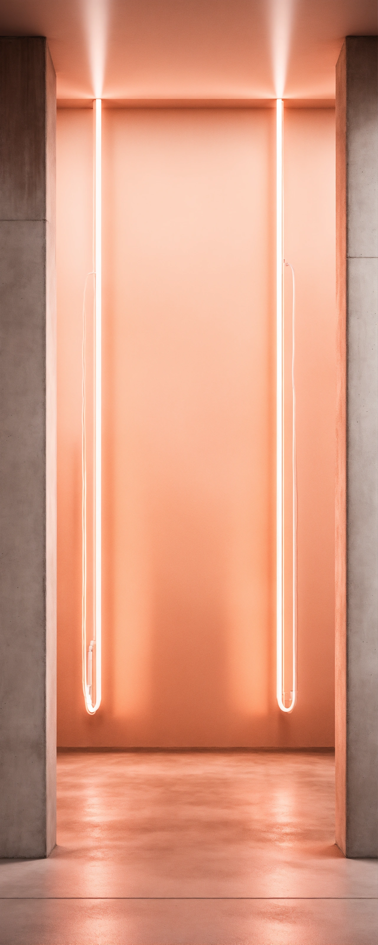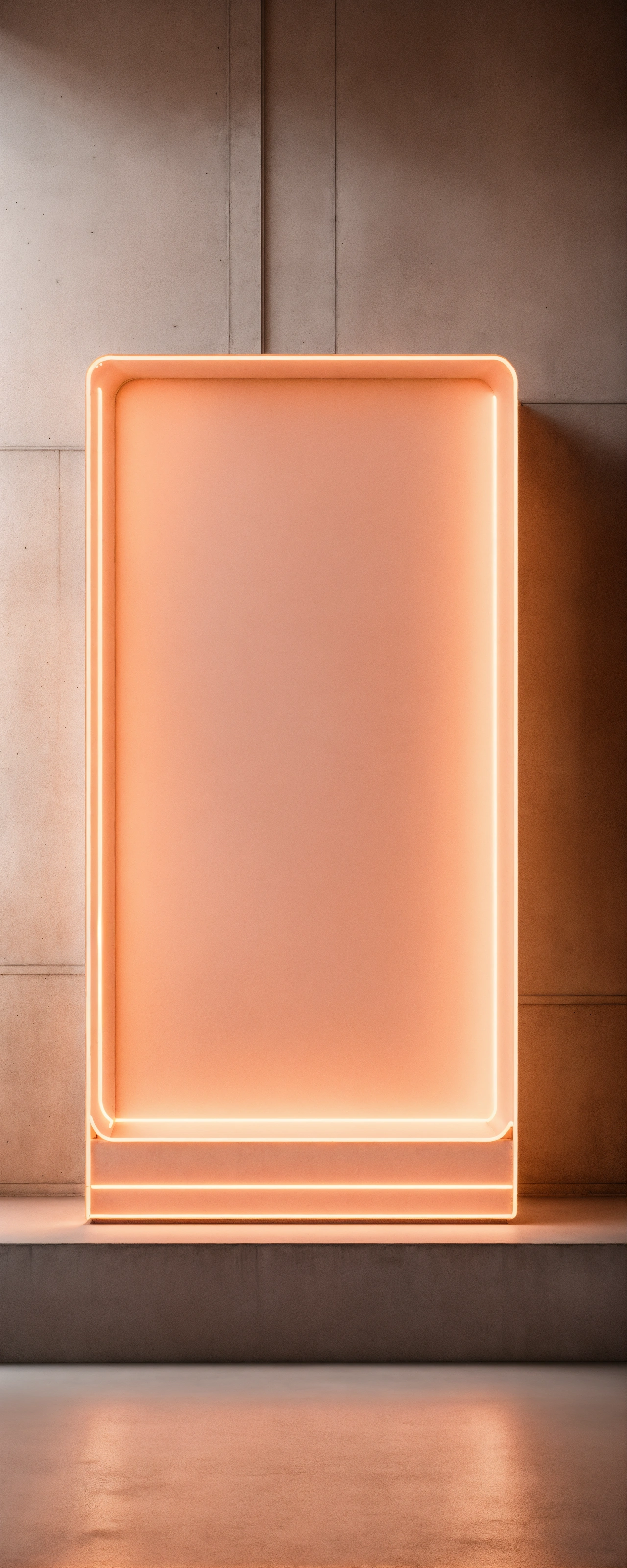 Hyperrealistic light peach neon, over concrete wall, studio off white background, big room, hyperrealistic enviroment, 8k photorrealistic