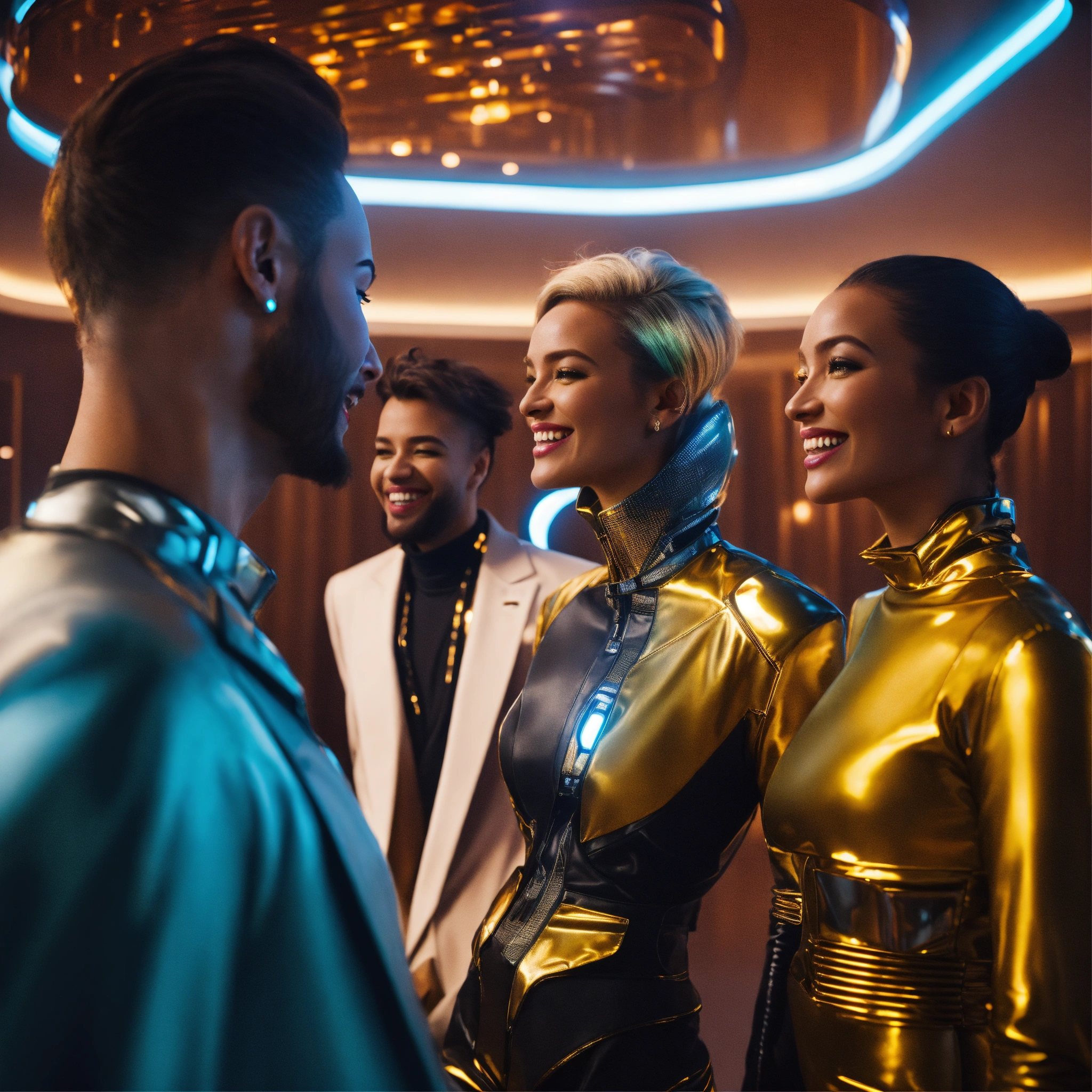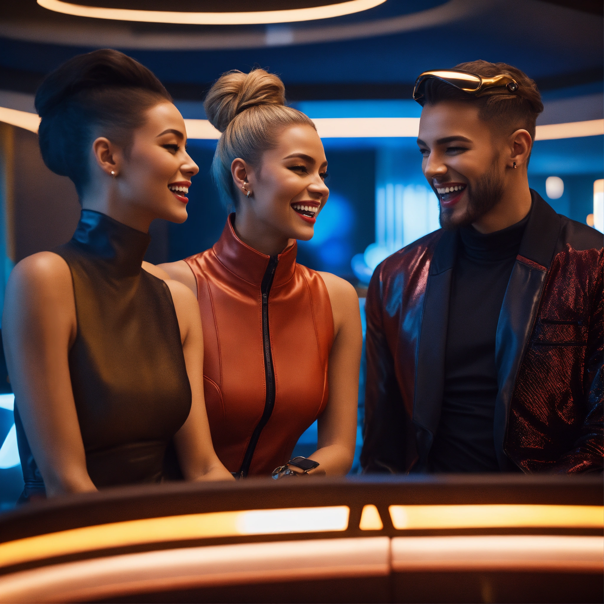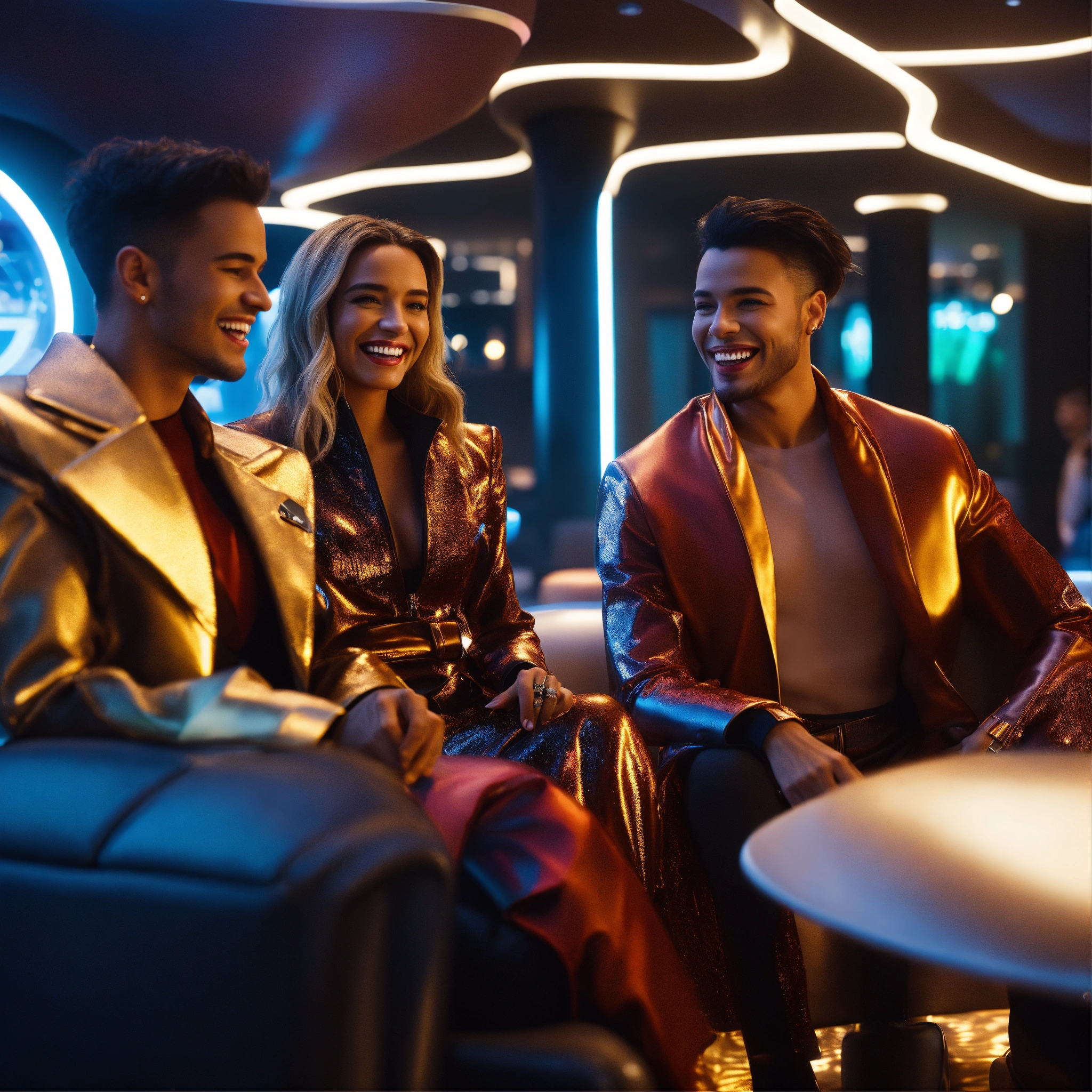 Close up of 3 beautiful male and female travelers wearing stylish futuristic clothes that are laughing and havinga good time relaxing in a luxurious space port hotel lounge reception area, realistic, futuristic, sci-fi, 8k, unreal engine, pixar, disney, zaha hadid