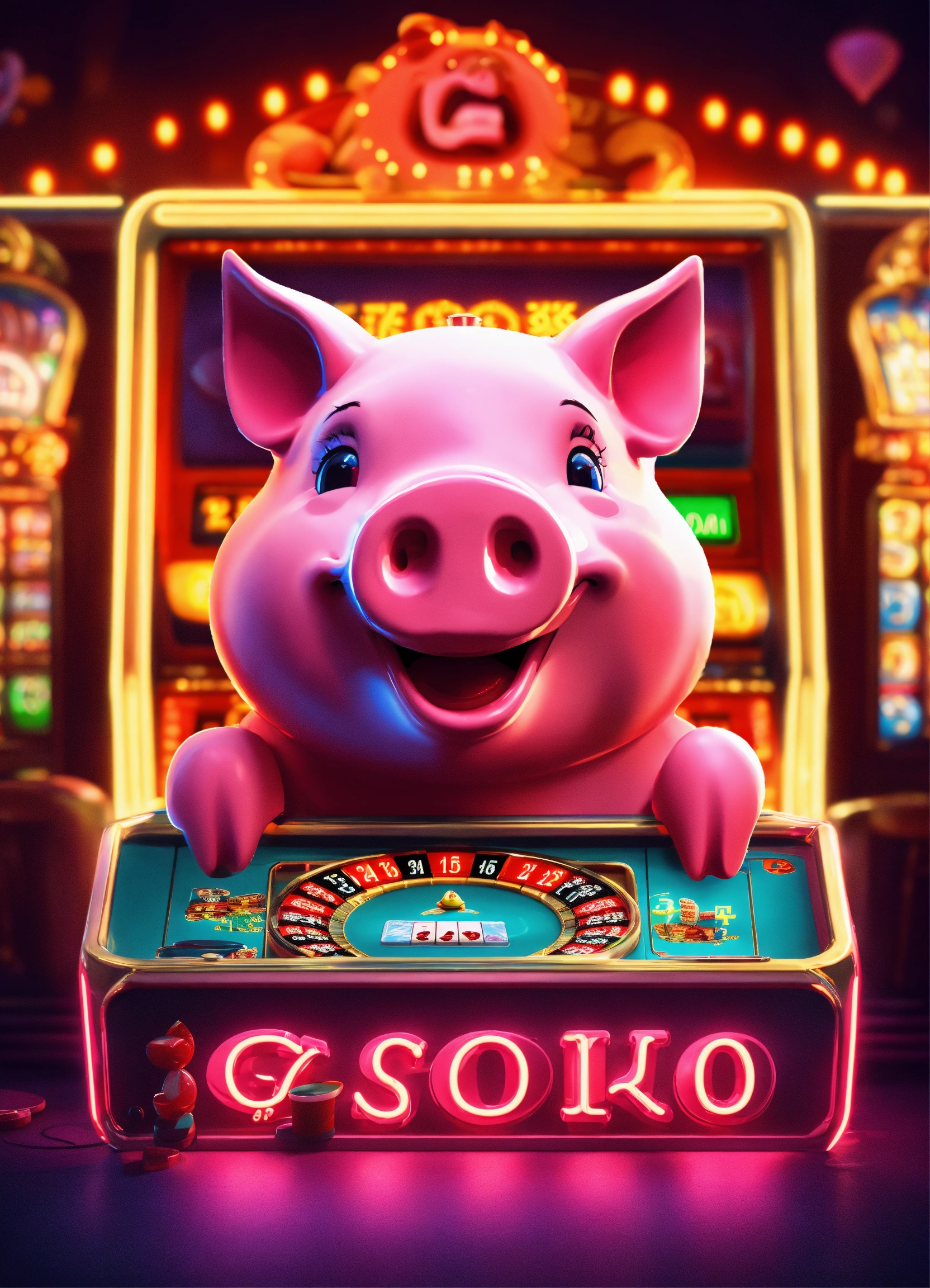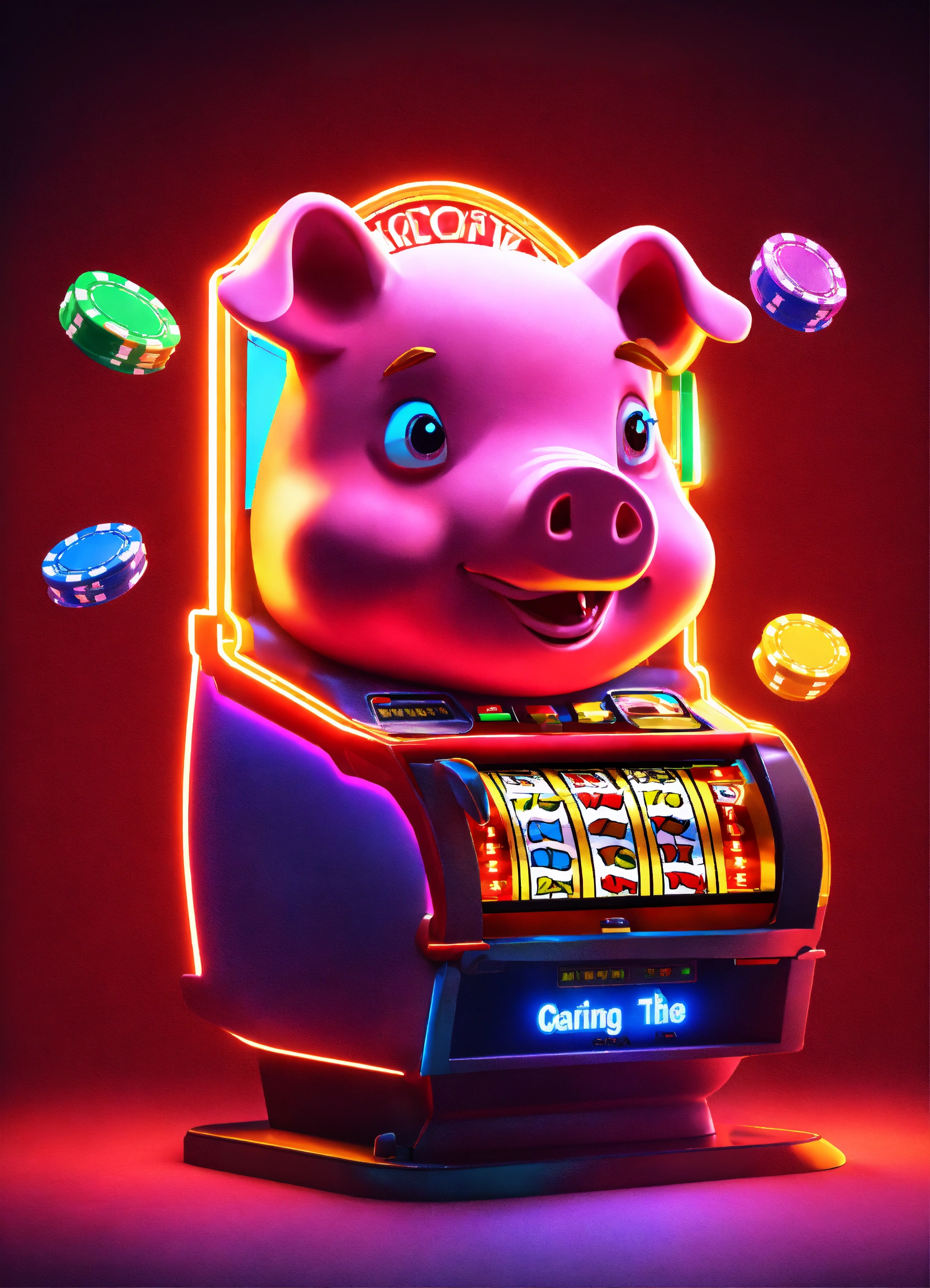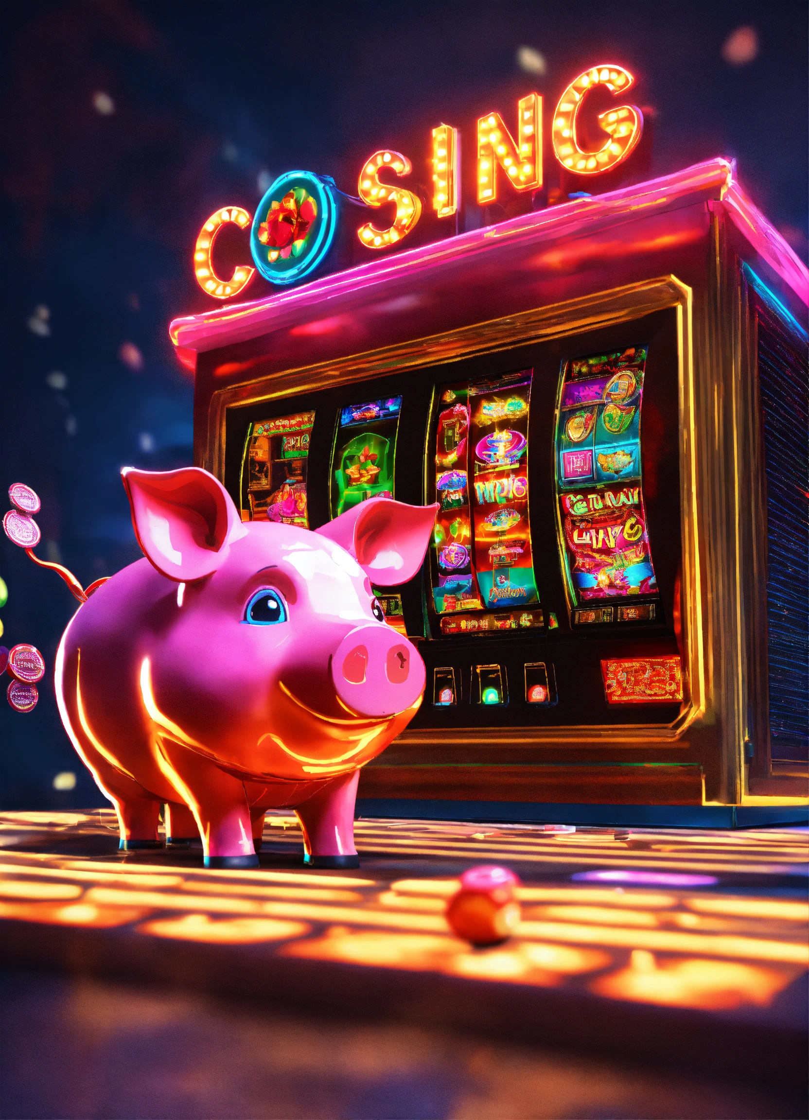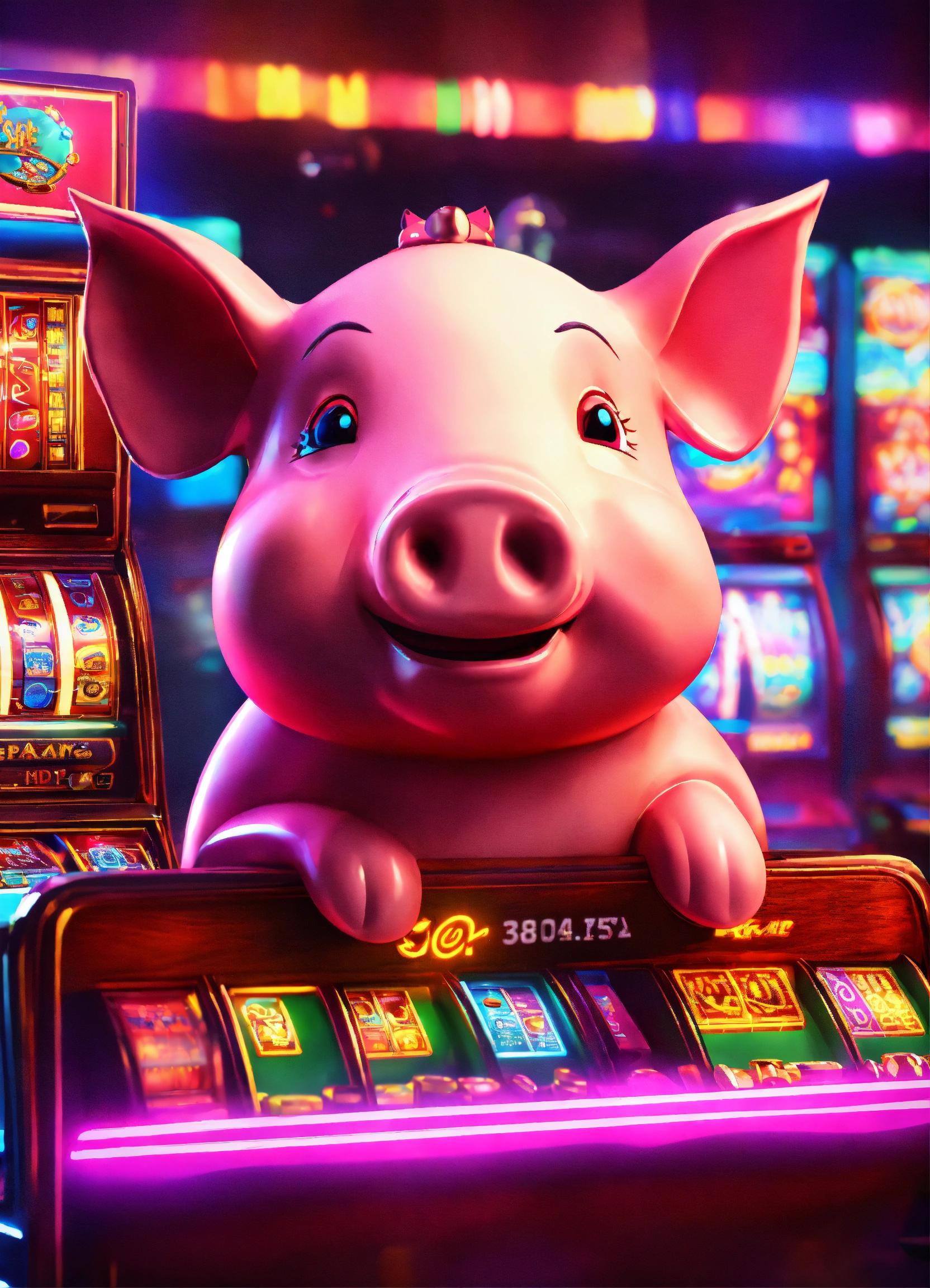 3d real cartoon pig casino slot machine in the gambling 8k neon lighting