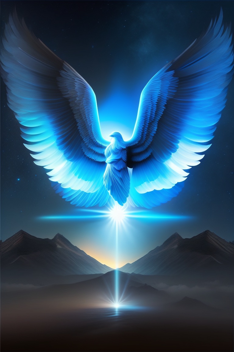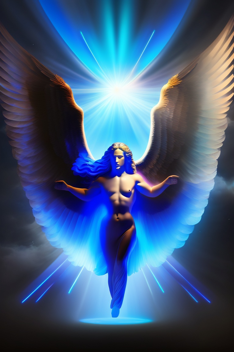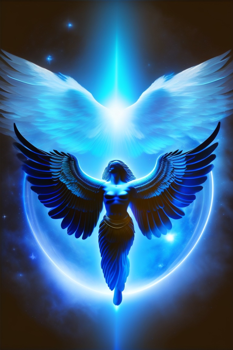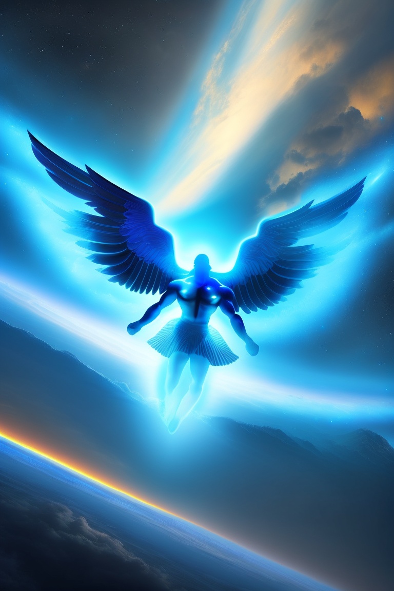A six wing cherubim being created by god, fierce, radiating, other angels created flying in the sky in the background, background a new universe of black and light blue lights
