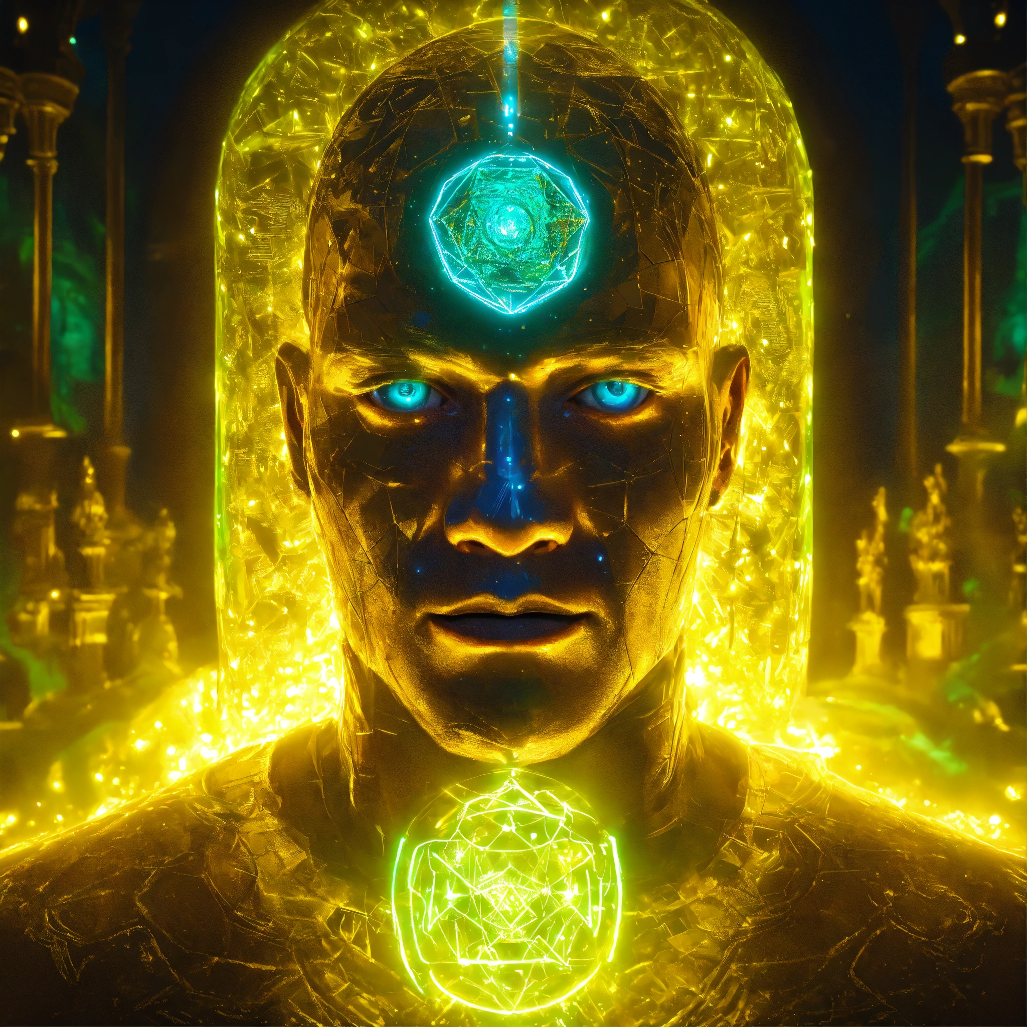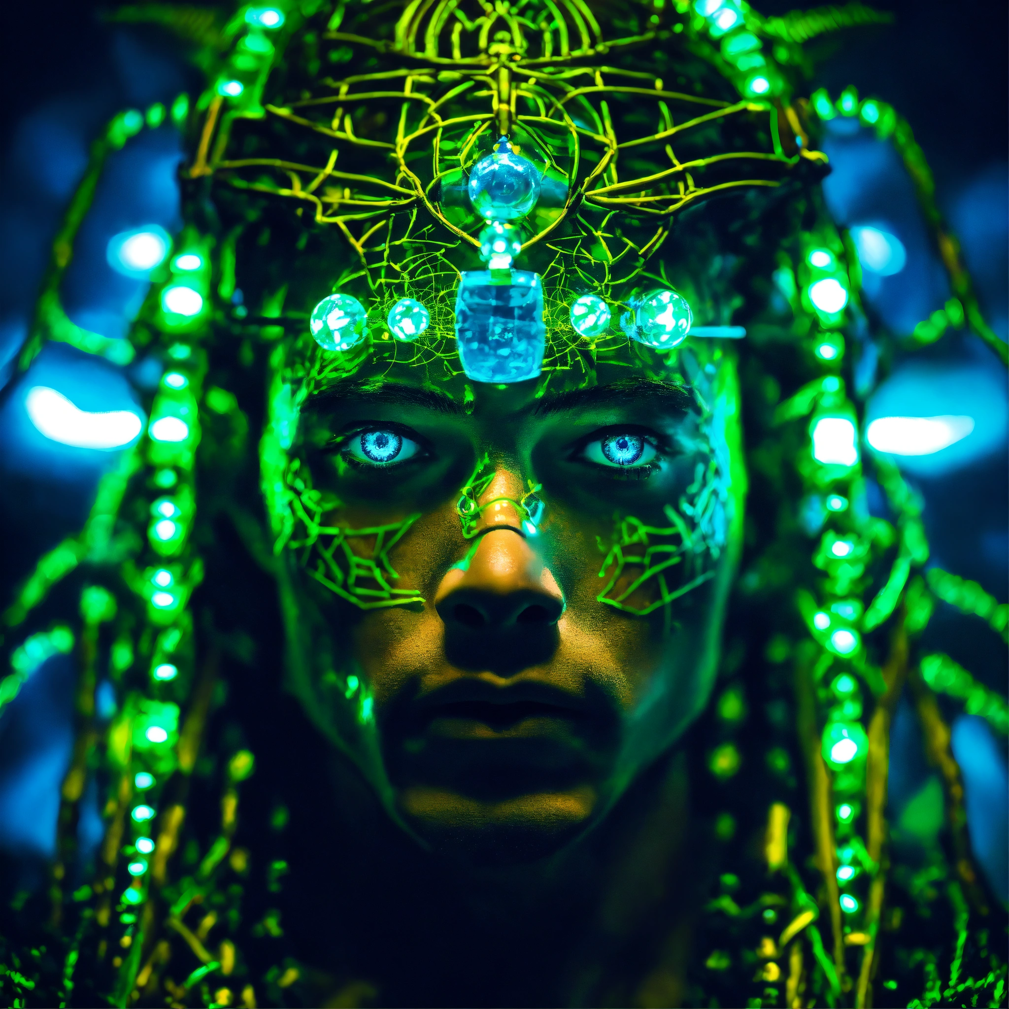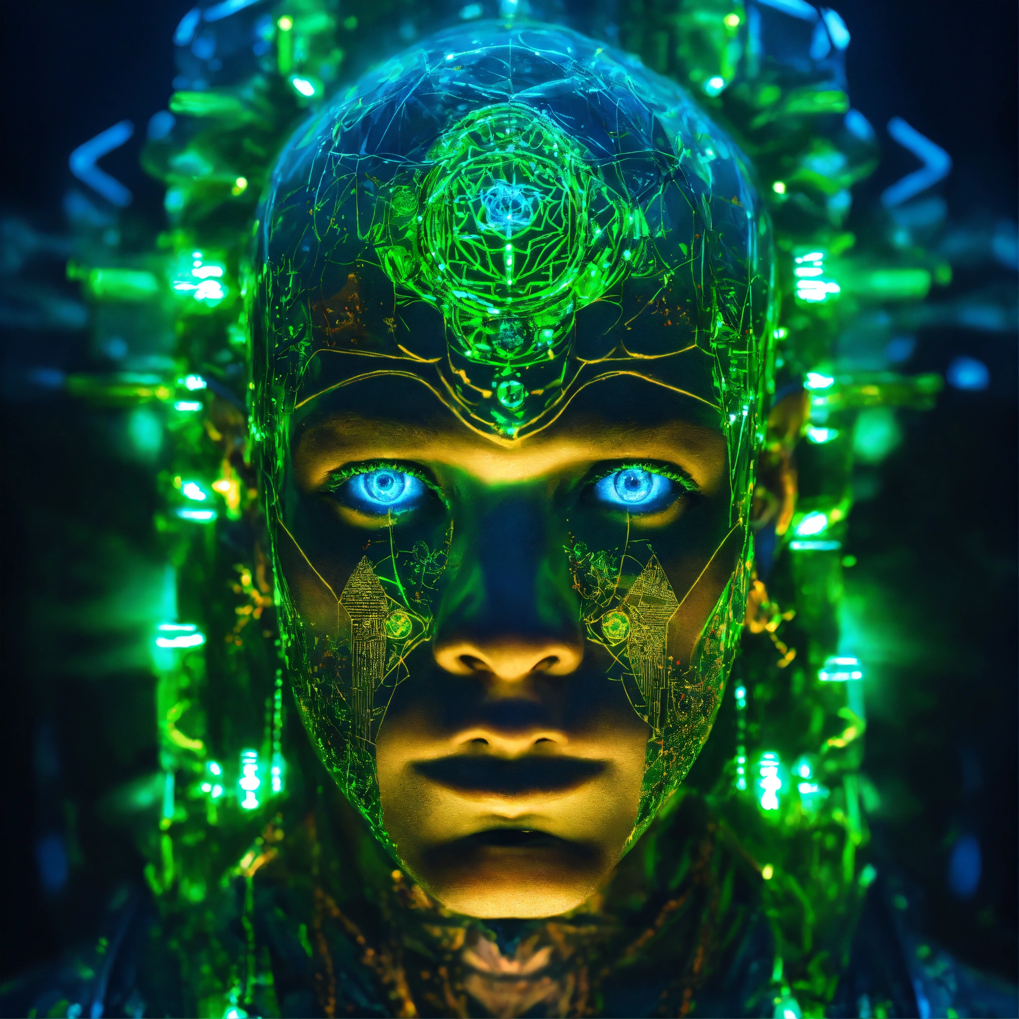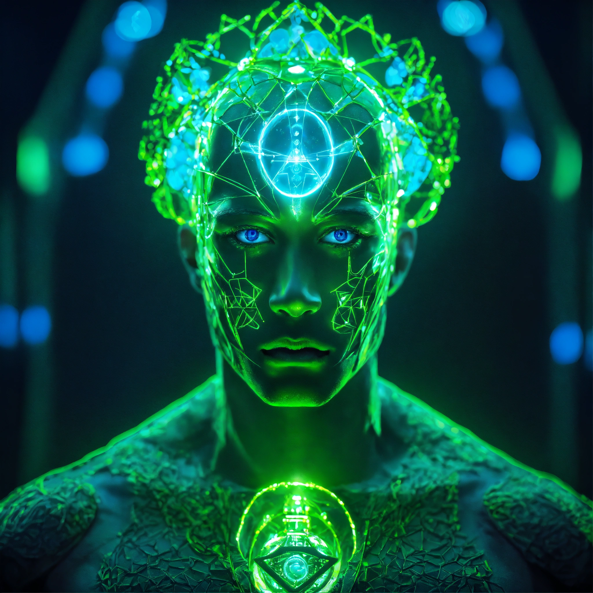 Underwater portrait photography, long exposure, powerful mystic man face portrait facing front, blue eyes. front view. front portrait, no angle. backlit. green neon glow. angelic transformer robotic face. sacred geometry patterns on the face, in the style of disney, pixar, tim burton, chronicles of narnia, beauty and the beast, and peter pan. enchanting glowing orb aura. fractal, volumetric lighting, backlit. the power of the god. god-like, spirit-like.