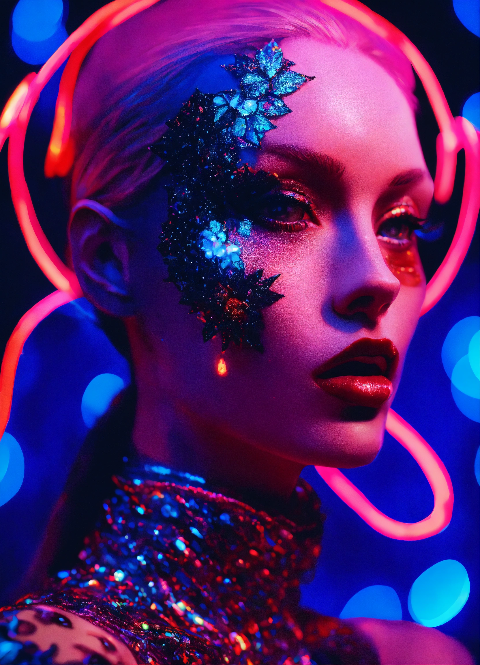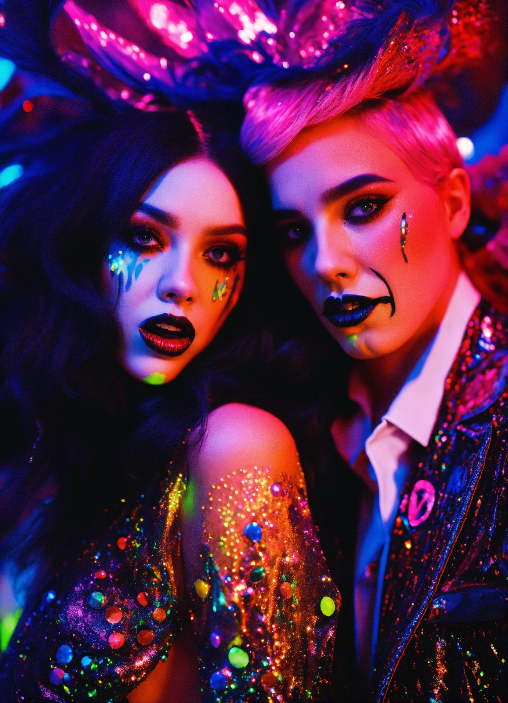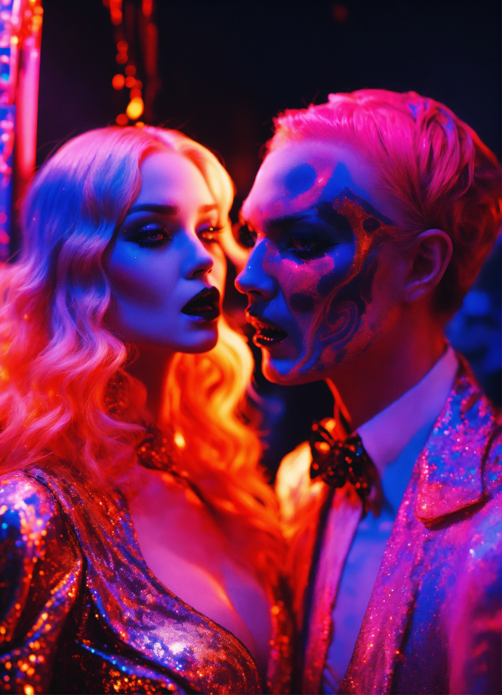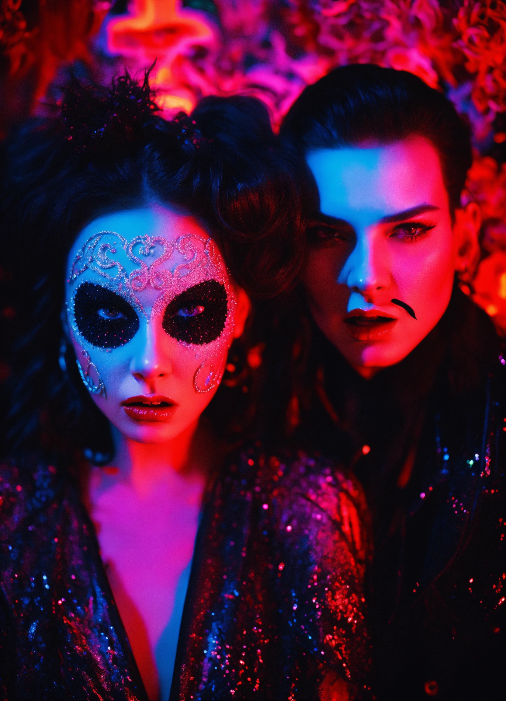 Close up portrait fashion, of a couple of scream from the movie scream dmt black light glitter neon gothic new orleans, 35mm film, art by sergio lopez, natalie shau, james jean and salvador dali