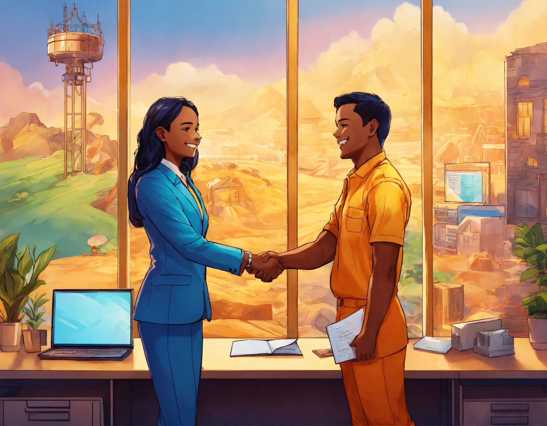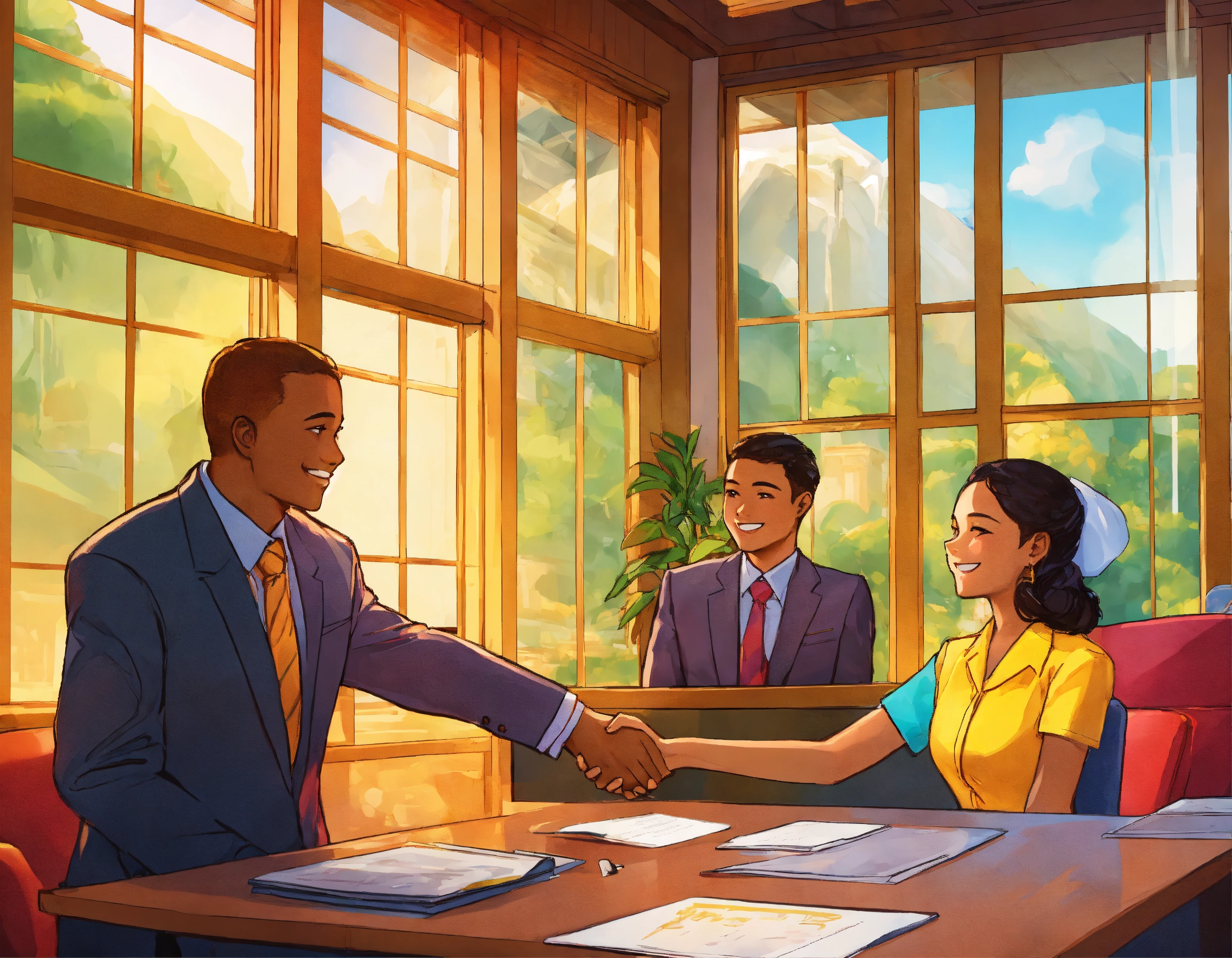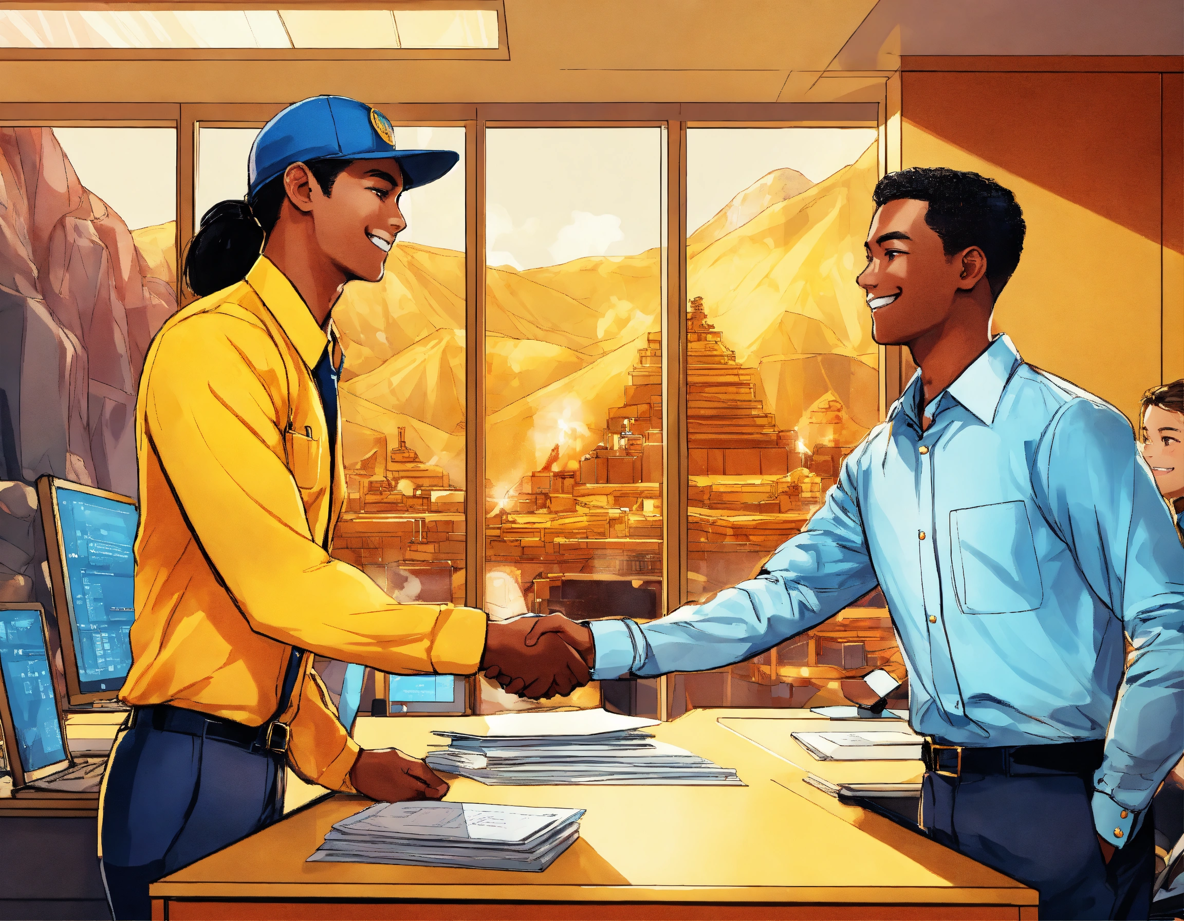 Young people in office uniforms, focused on shaking hands with investors, smiling, full body, indonesian face, indoor background gold office table in front of mining industry window, storybook illustration, 8k, by lisa frank