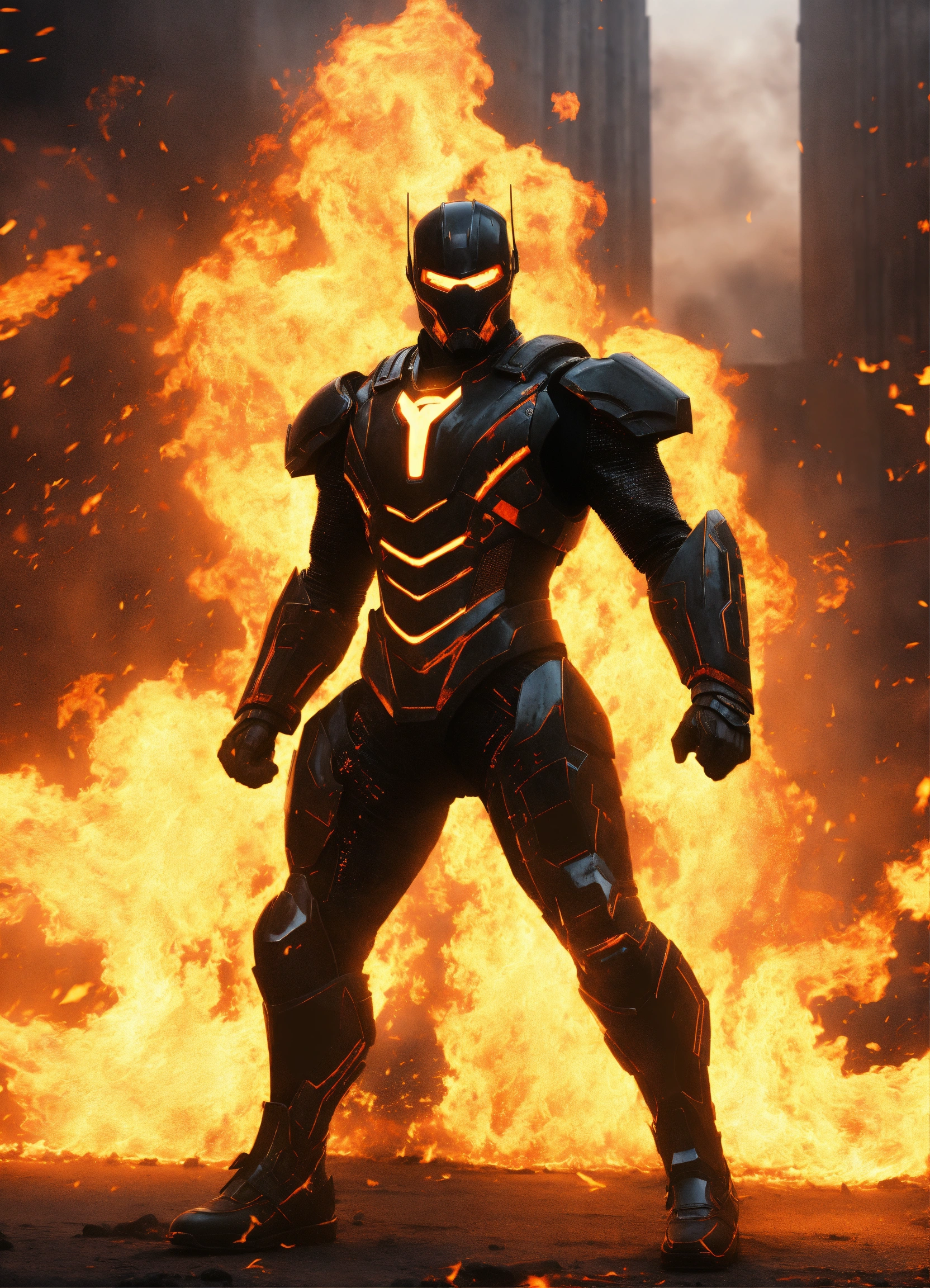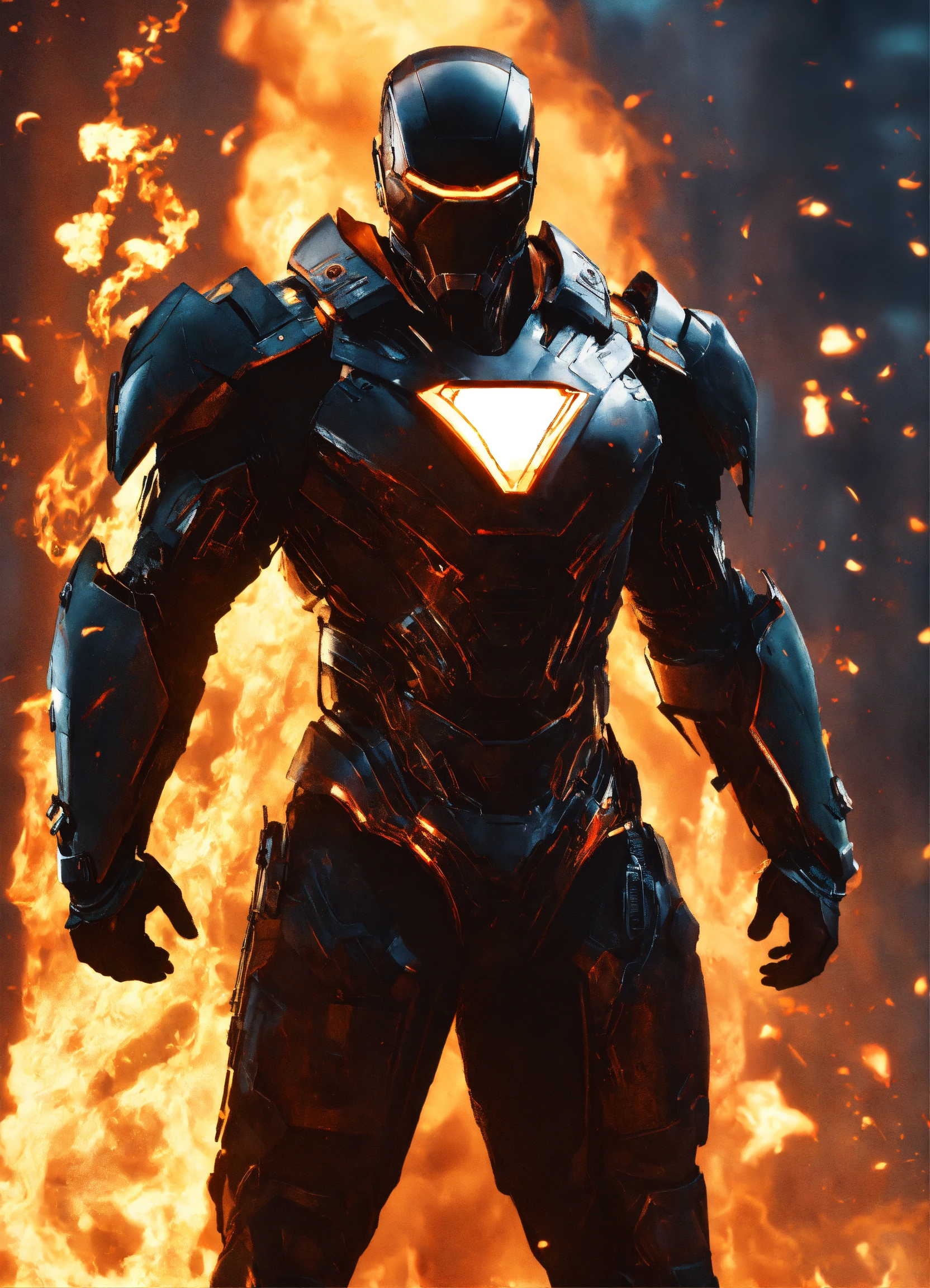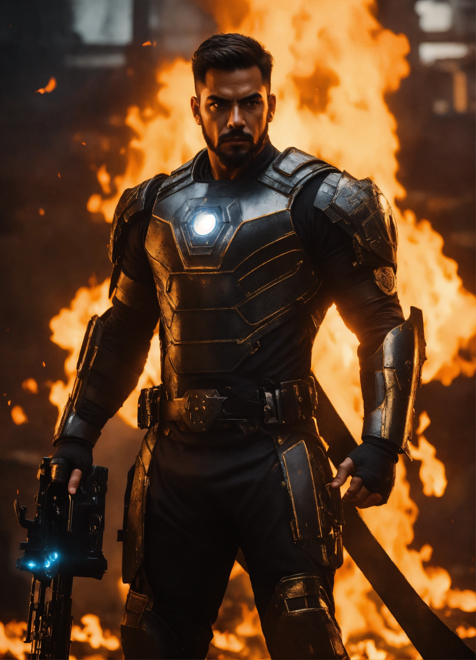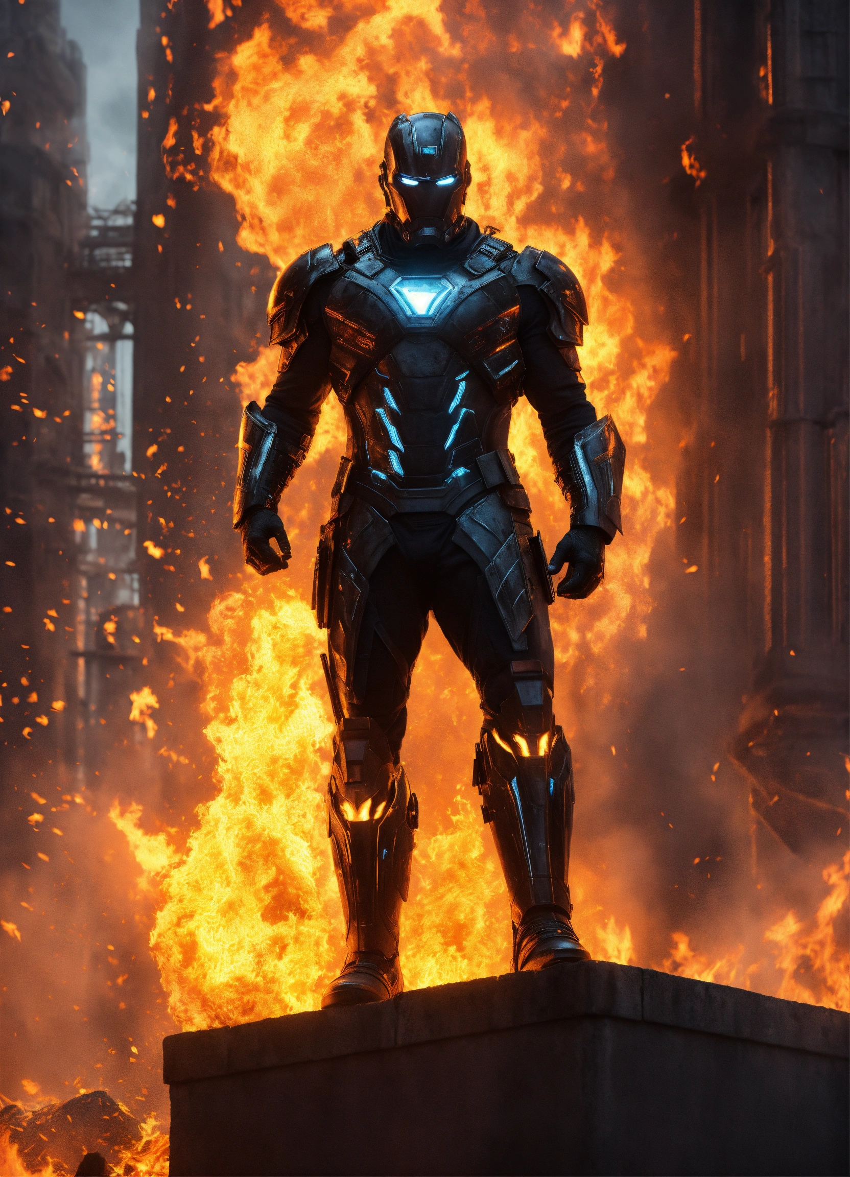 Iron mán, super héroe, traje negro, futurista, realista, brillante, con armas de fuego, de fondo torres de fondo oscuro apocalíptico, hd, 8k