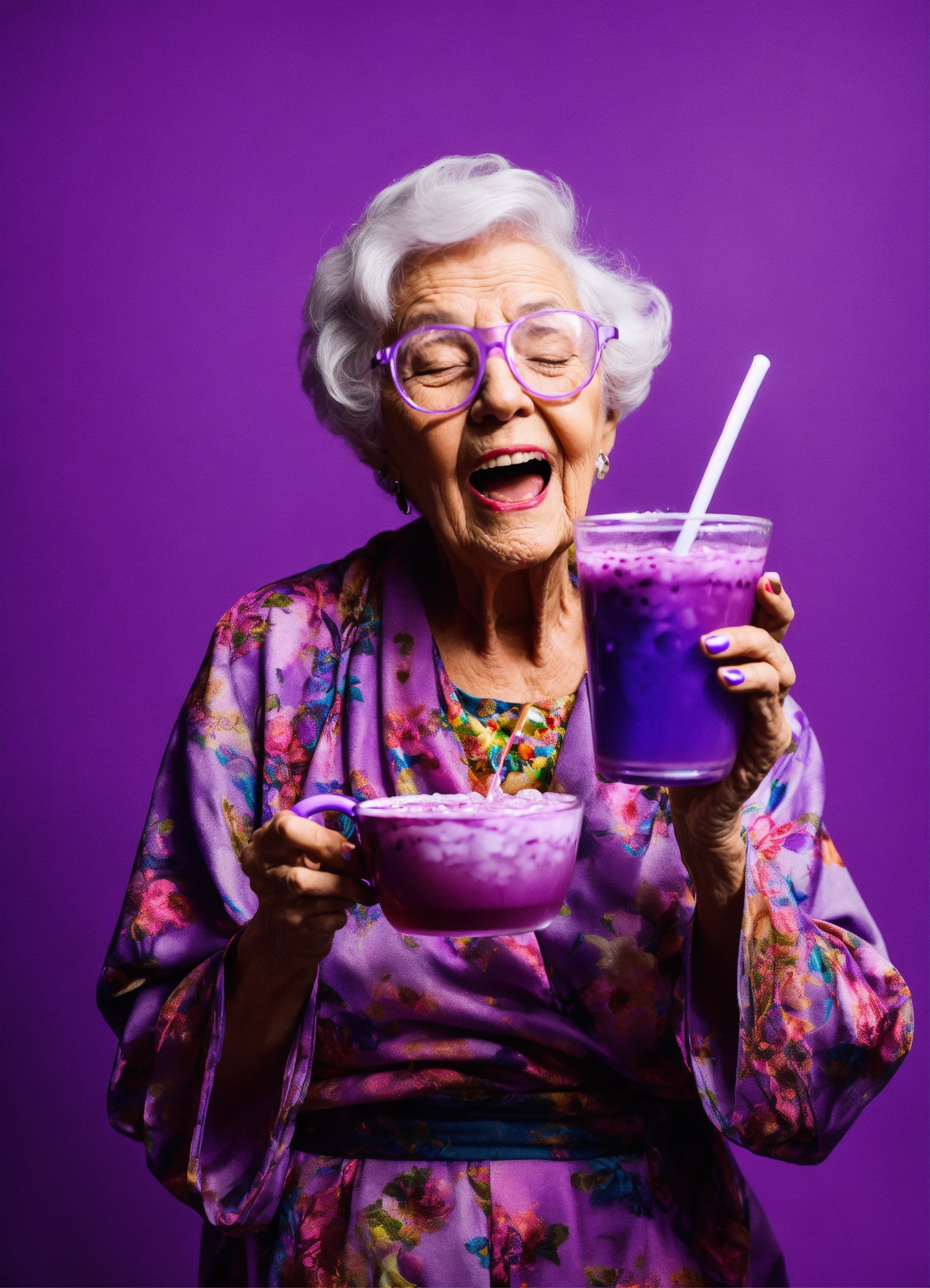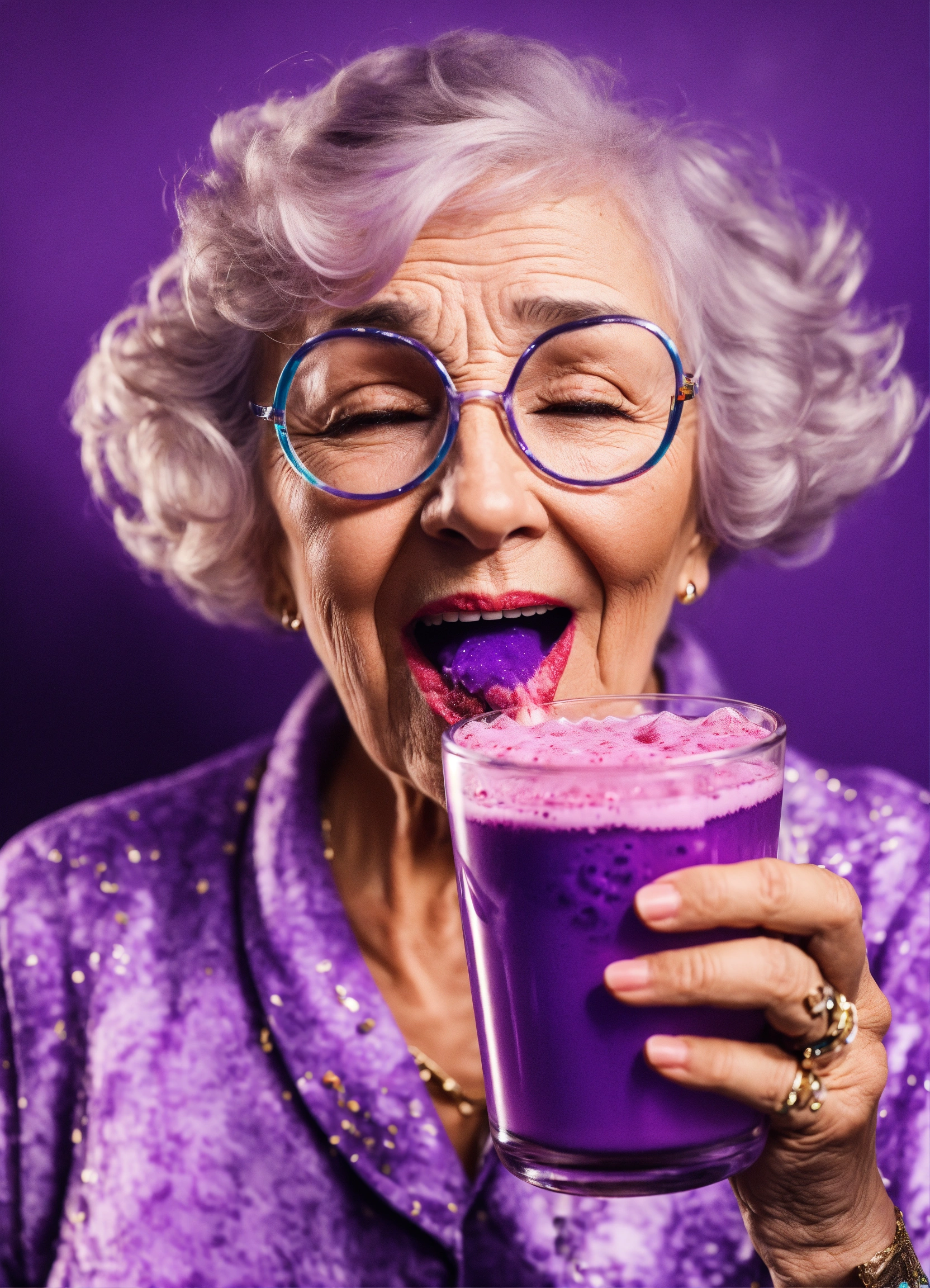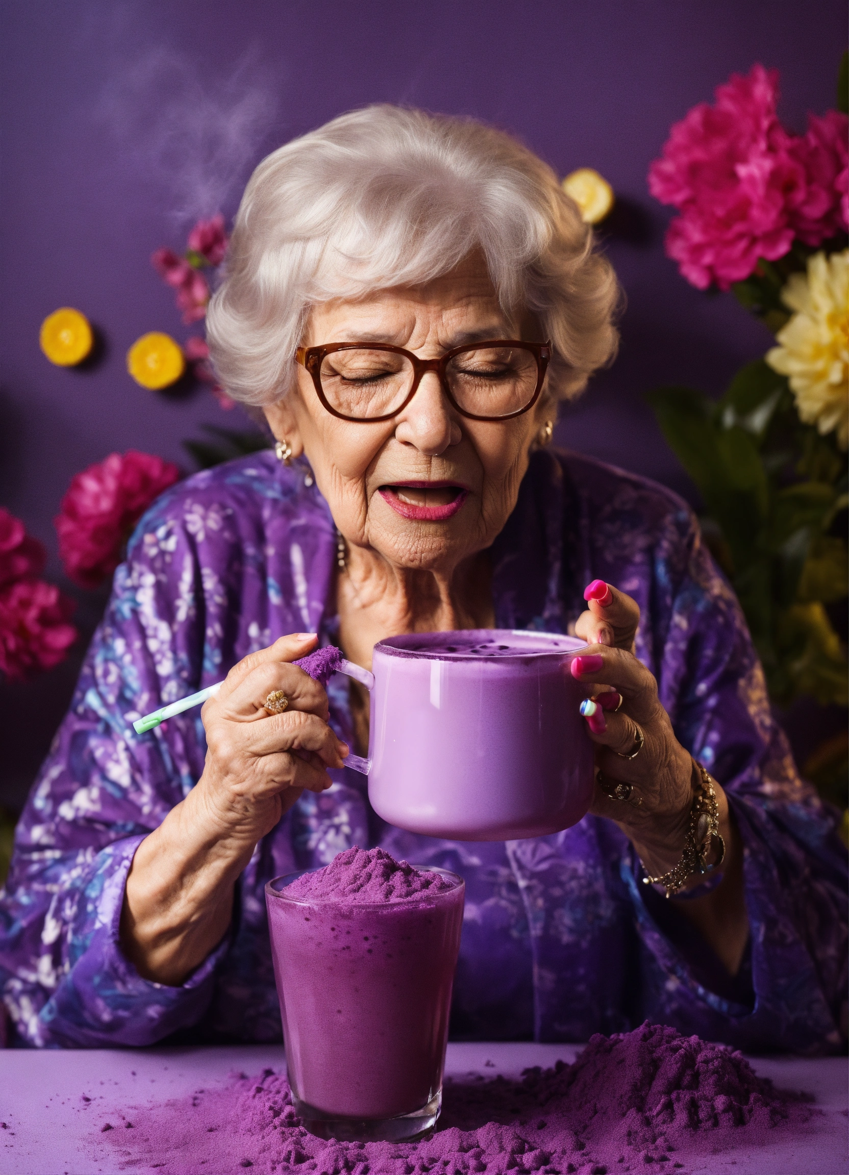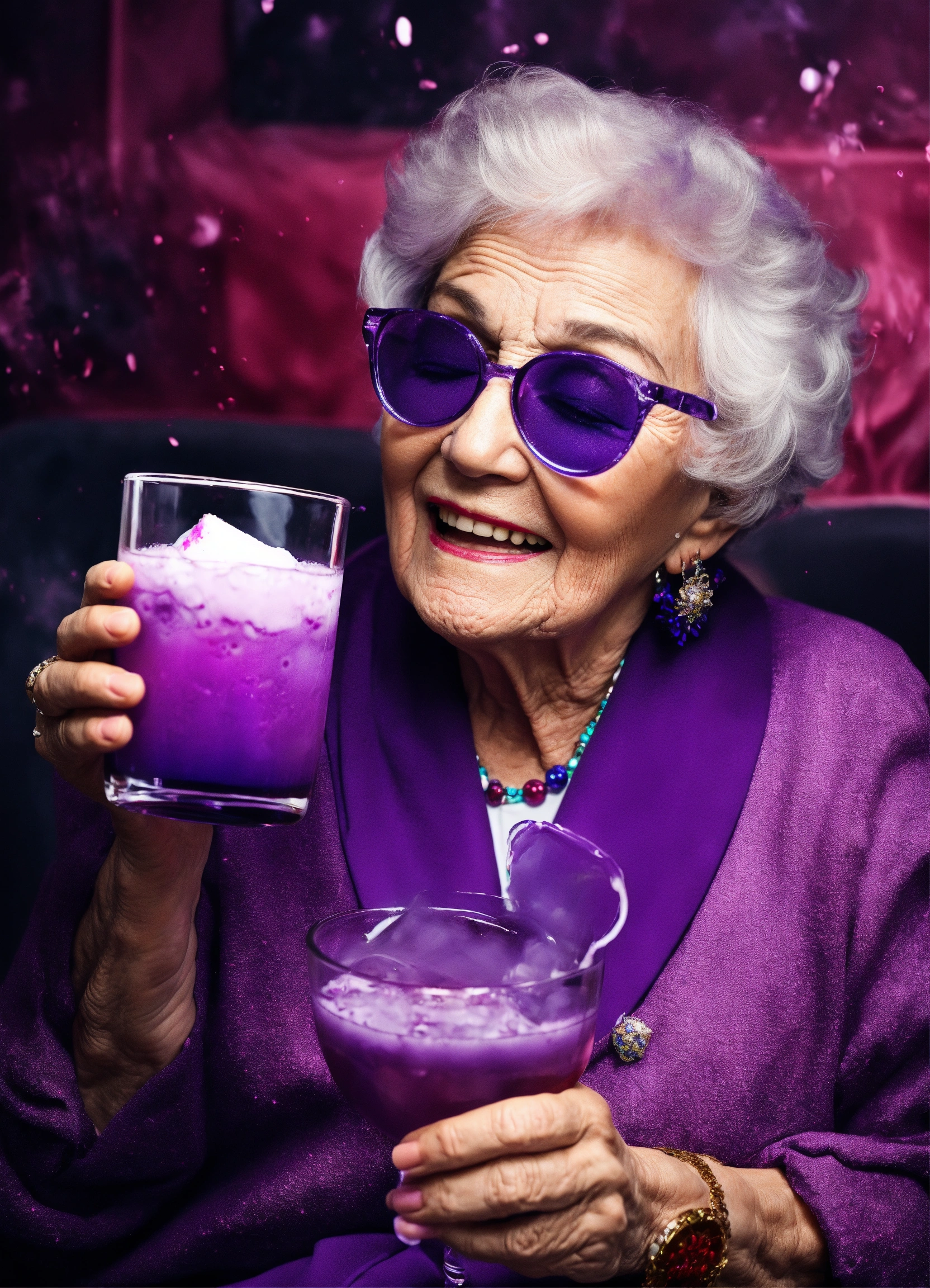 A crazy grandma snorting on purple powder while holding a purple drink as victory