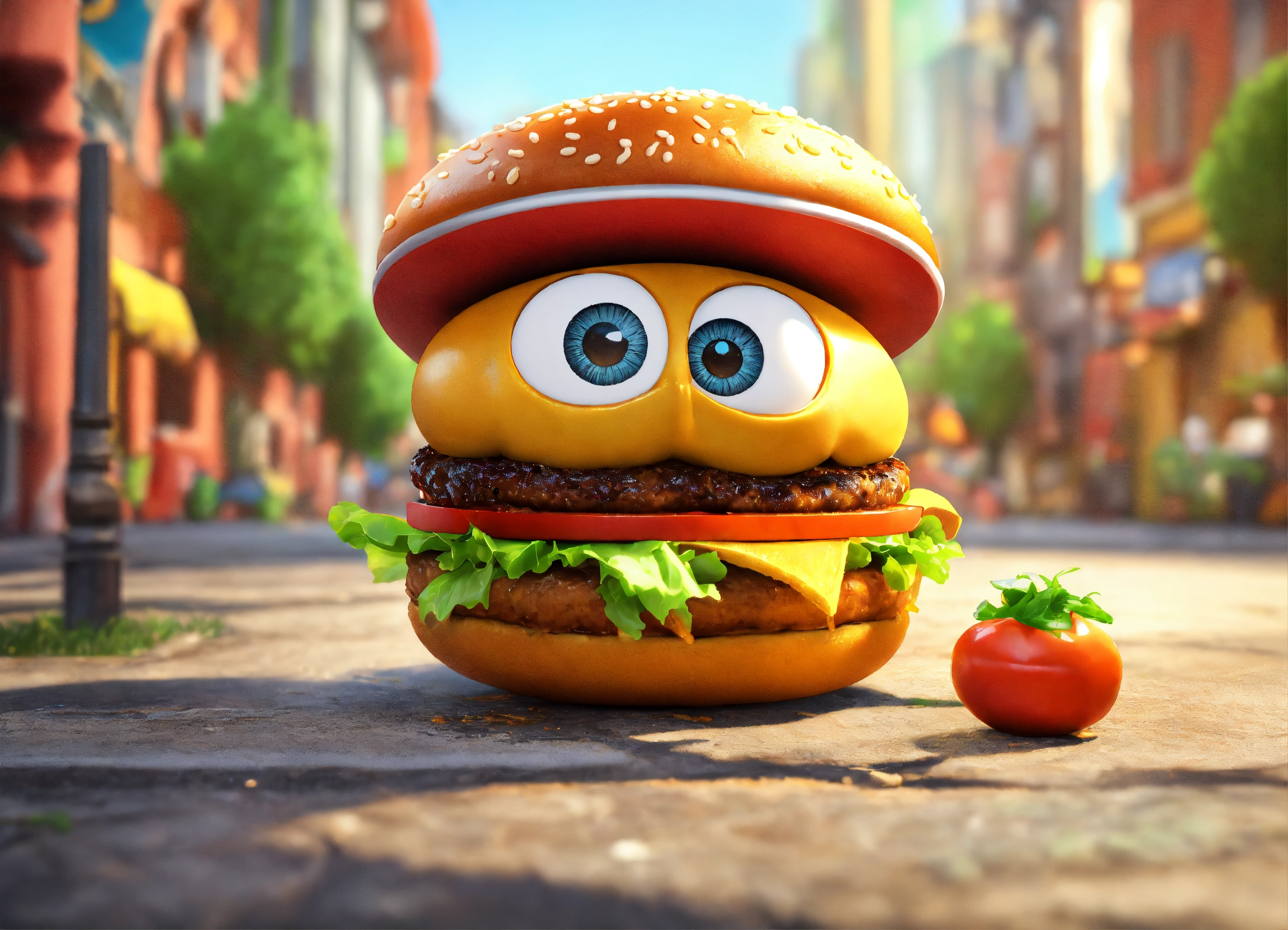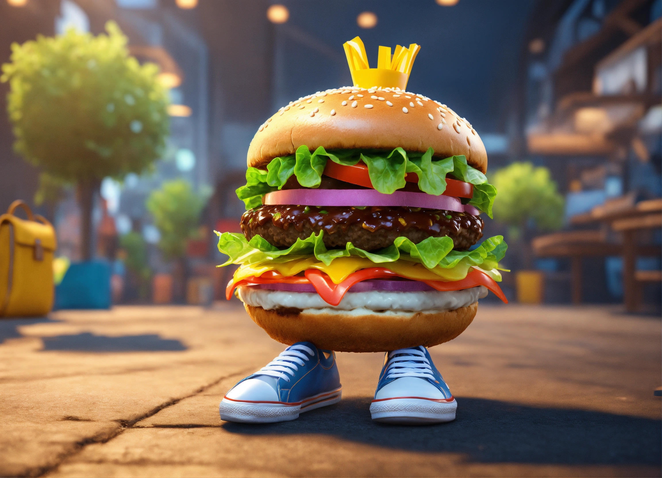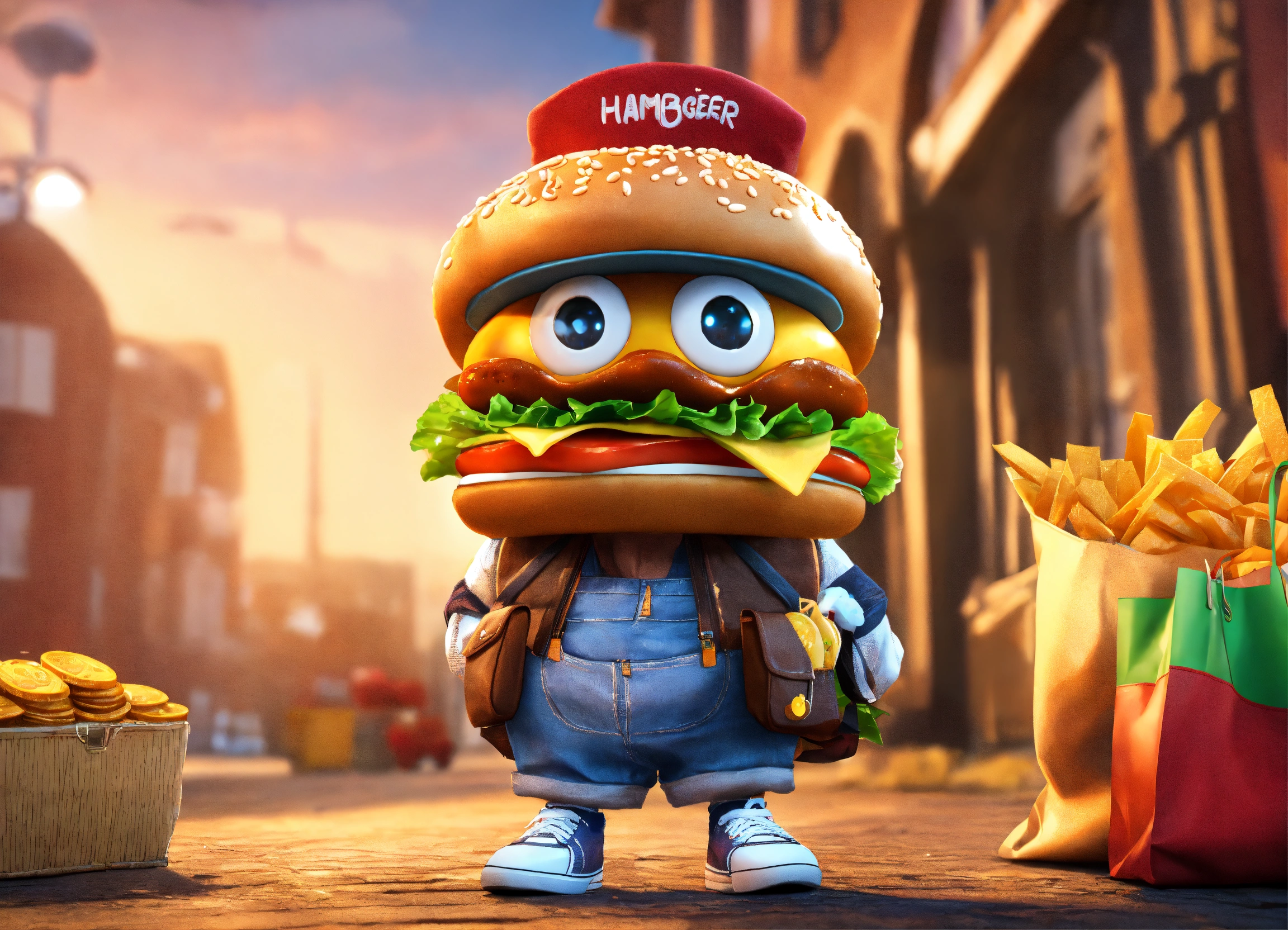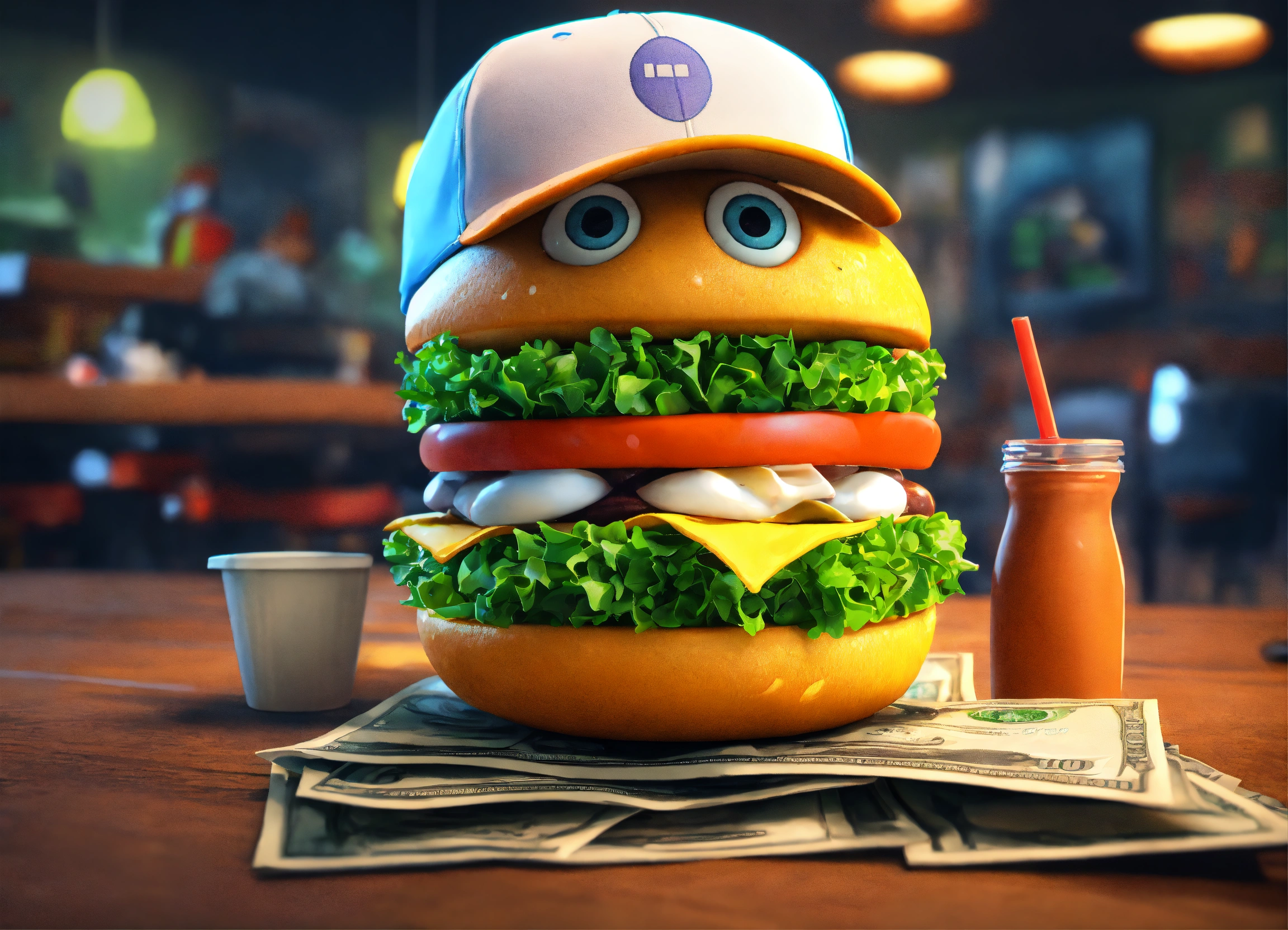 Cartoon hamburger with eyes and mouth, wearing a cap, with feet in sneakers, bags of money next to him, photorealistic, detailed, 4k, unreal engine, hdr