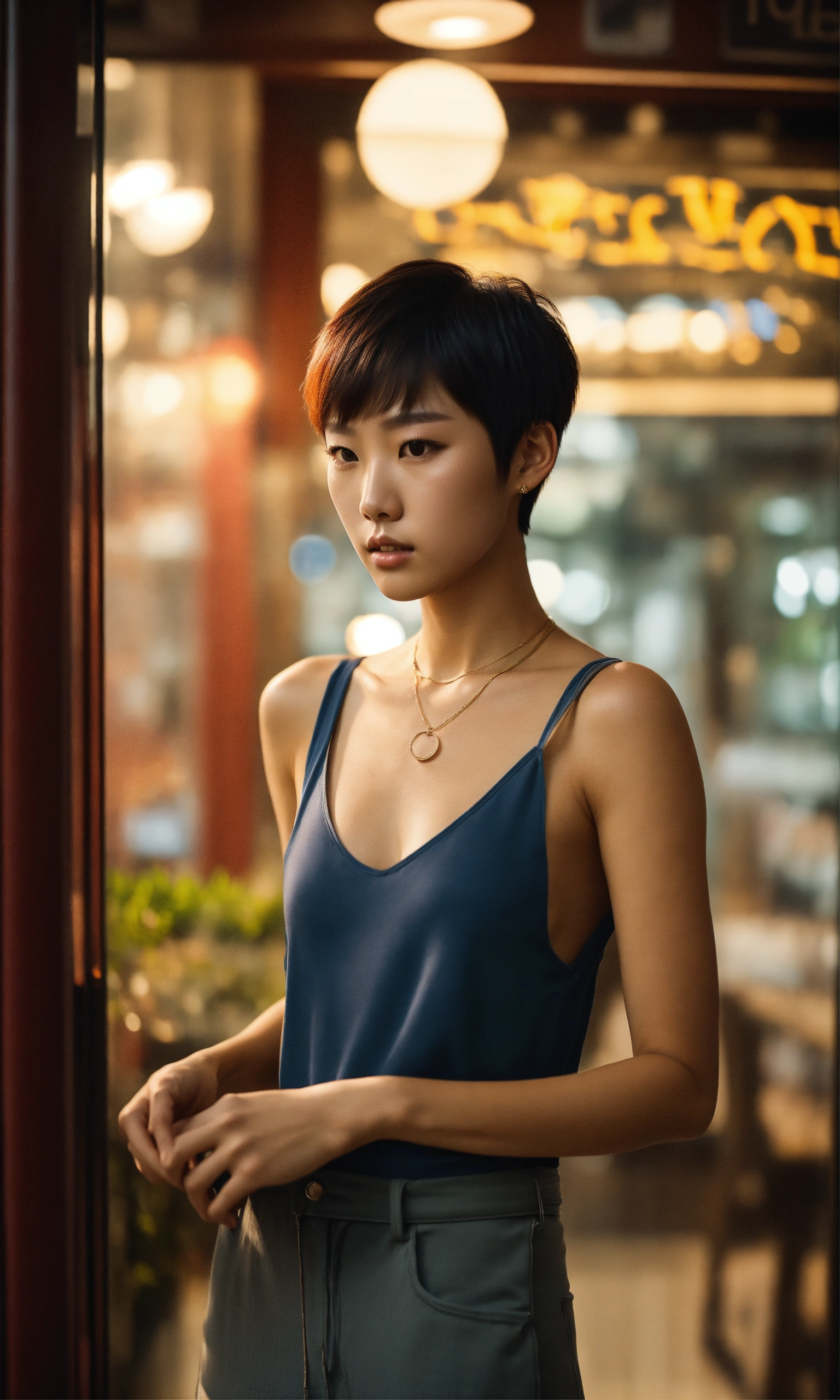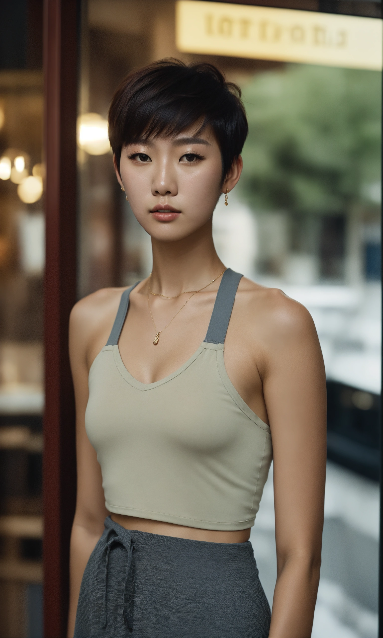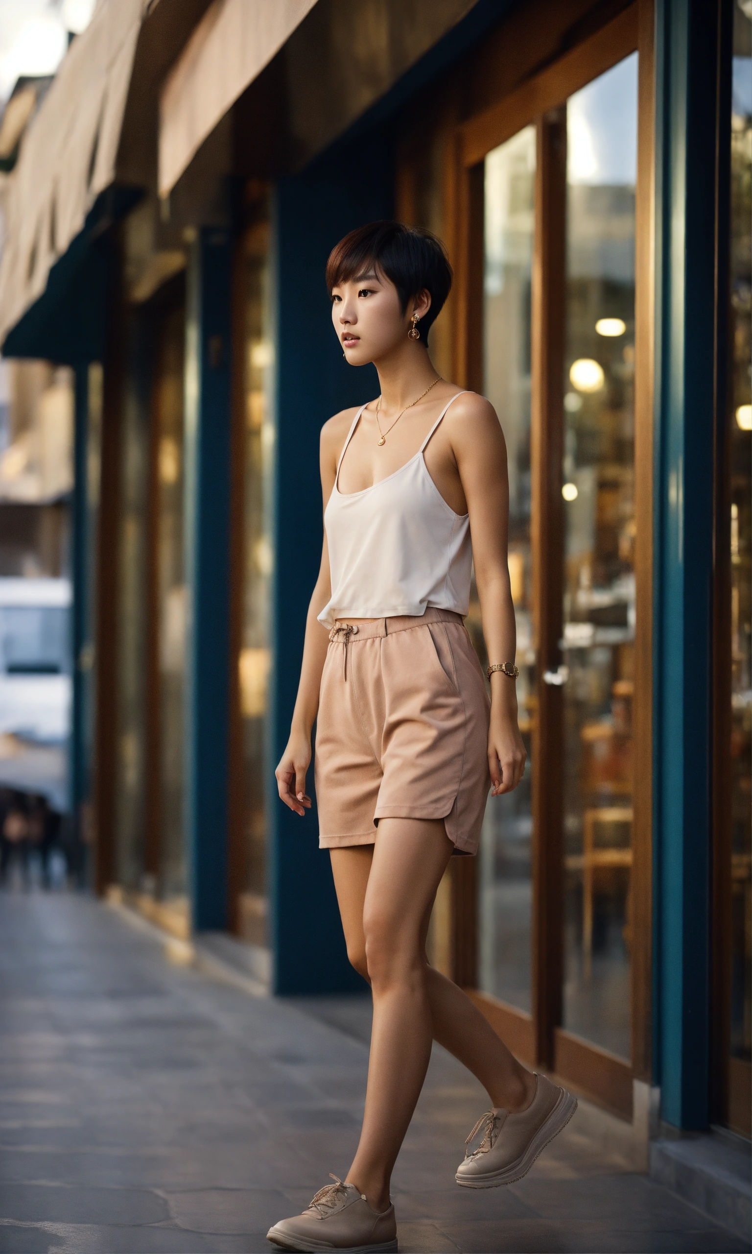 8k full body shot portrait of a sophisticated korean young fashion model in a tight tanktop with pixie cut hair, entering a restaurant in greece in the early morning, highly detailed, production cinematic, reflections on the store windows, 8k, film grain, extremely realistic, shot on hasselblad with 40 mm zeiss lens.