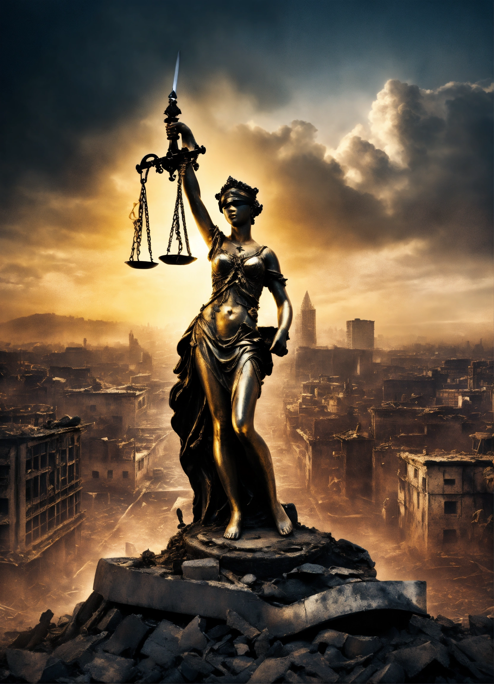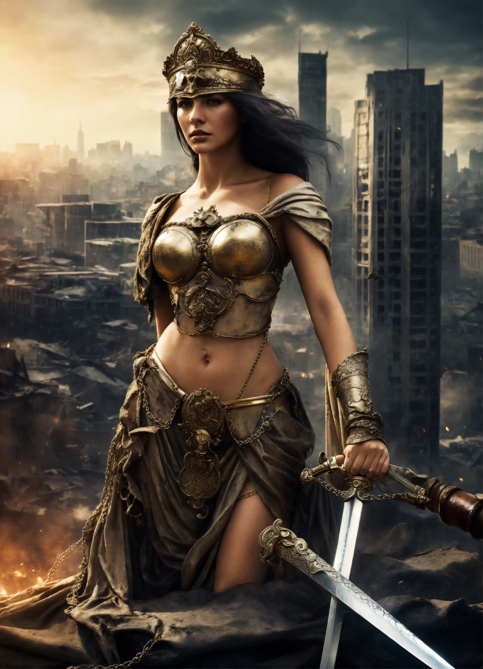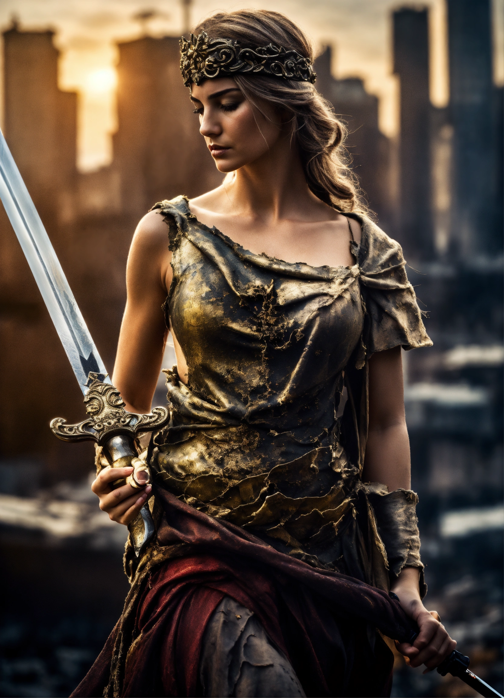 Beautiful, lady justice with blindfold, scales of justice, sword of truth, close up face, sword in hand, scales in hand, apocalyptic, tattered, ruined, city scape background, dramatic, close up, from waist up