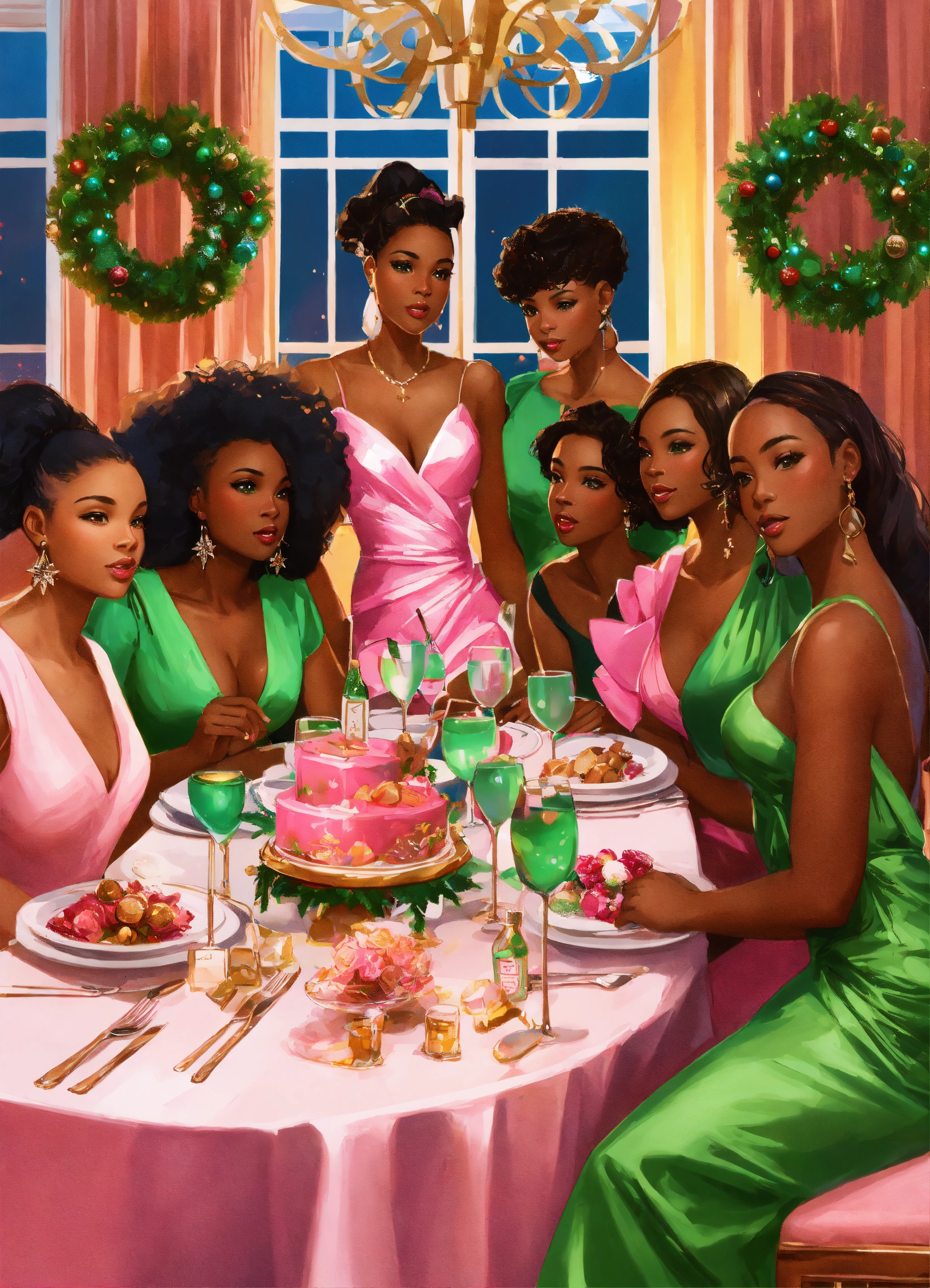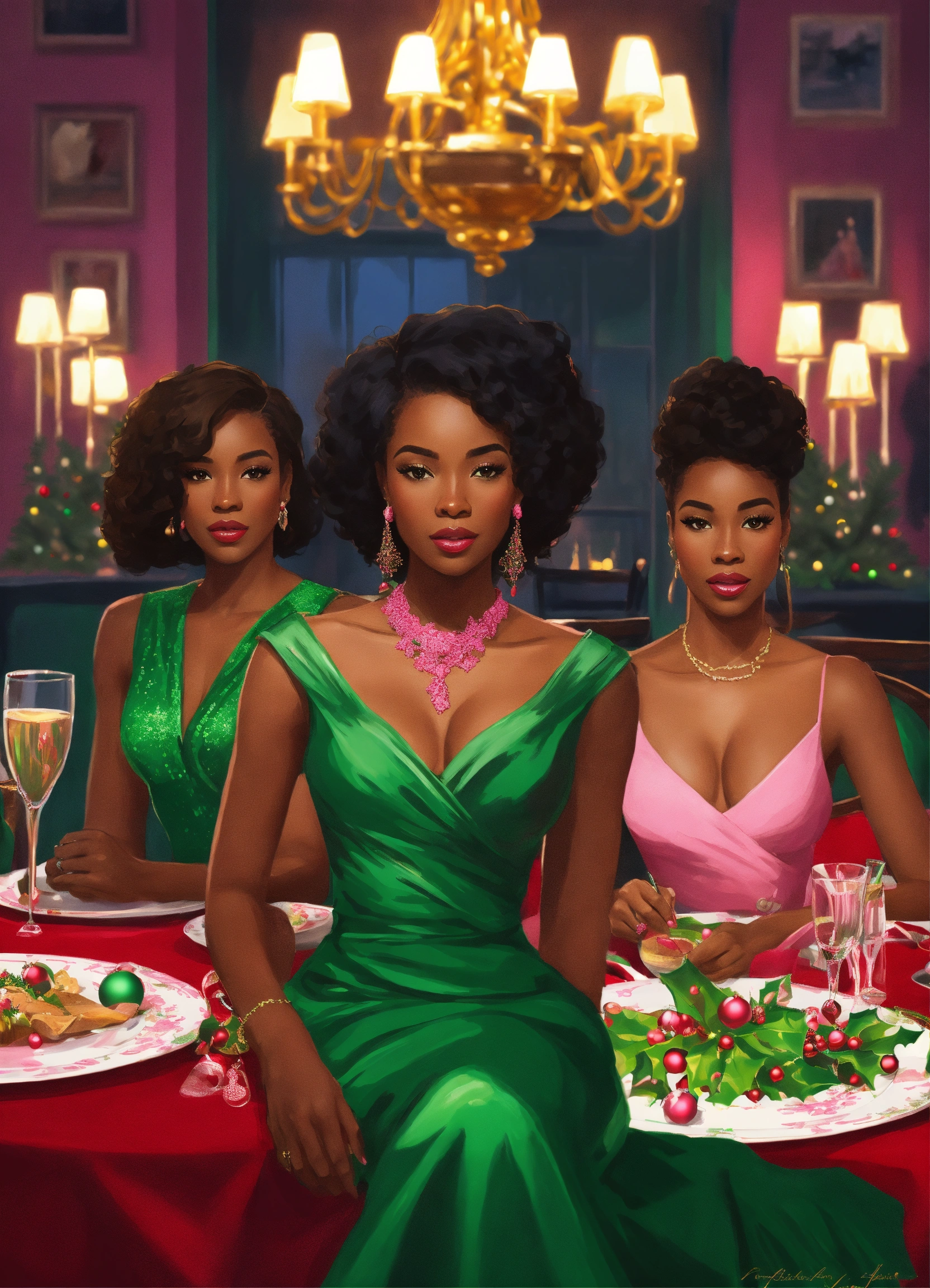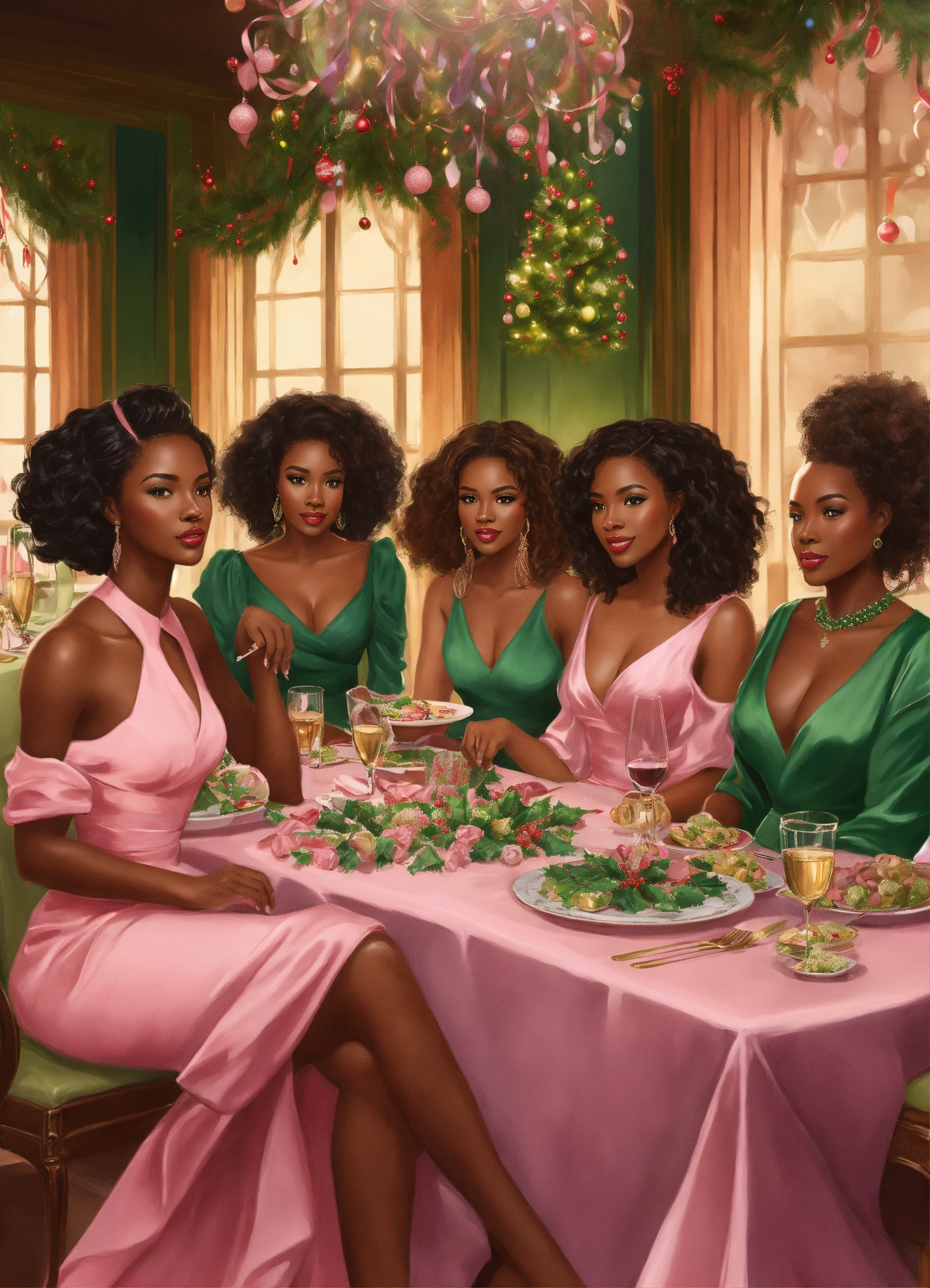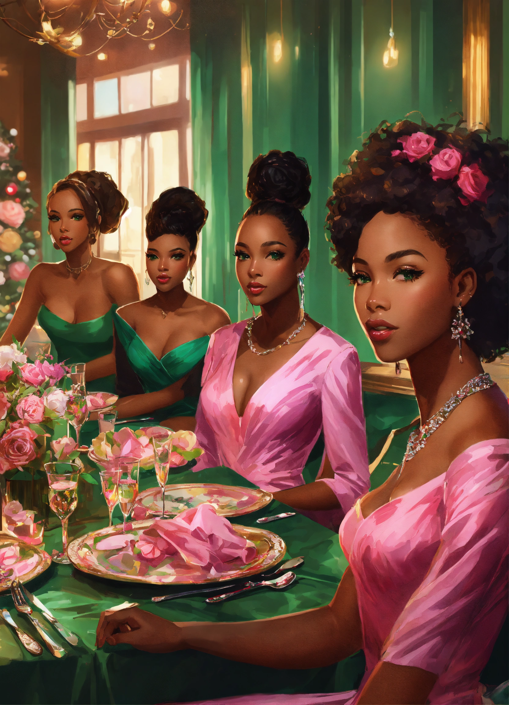 Digital painting, highly detailed, artstation, sharp focus, illustration, concept art, variety group of black american woman, different complexions, aka sorority ladies having an elegant christmas party, wearing pink and green party dresses, sitting at elegant decorated dinner table, detailed