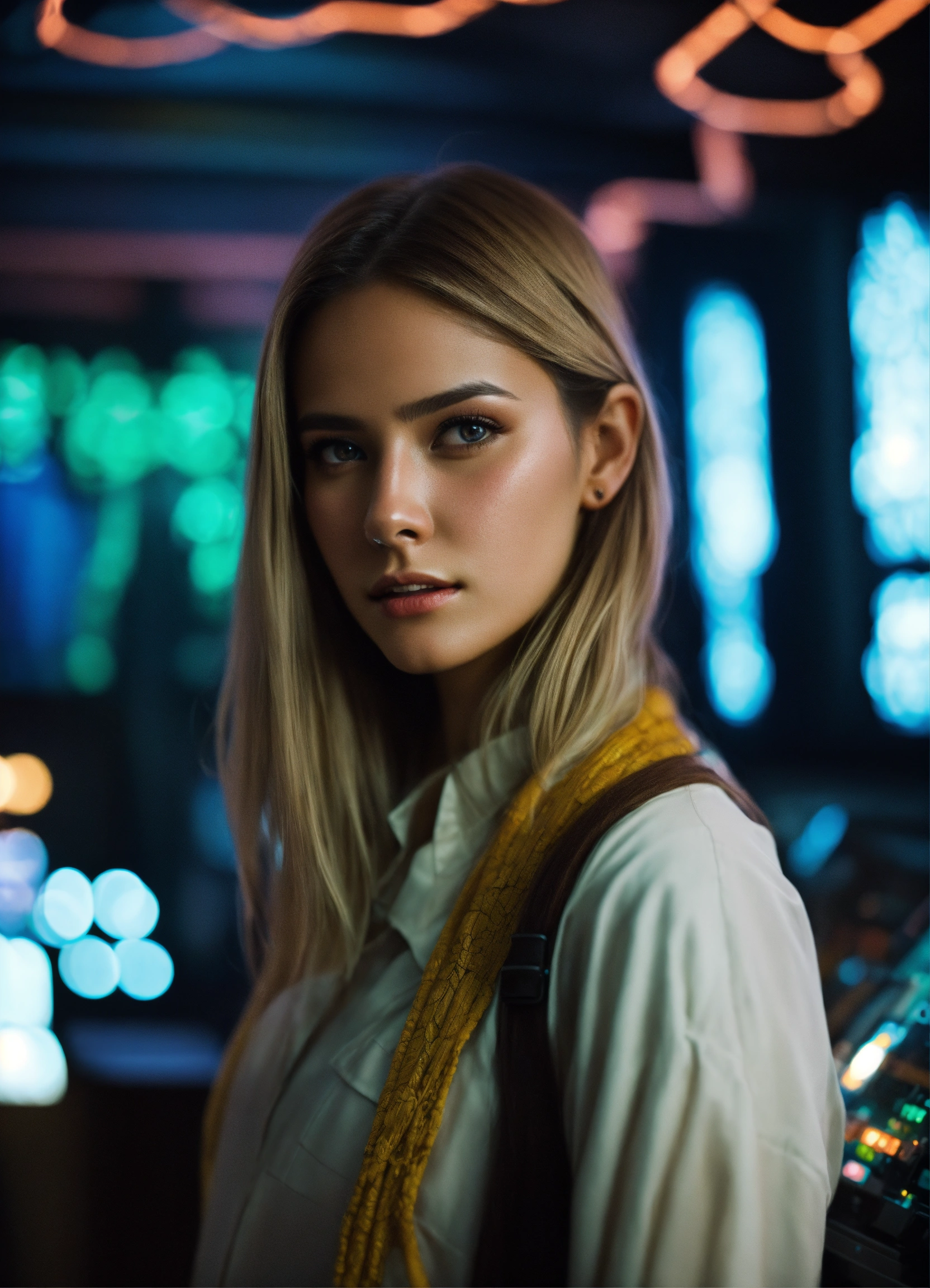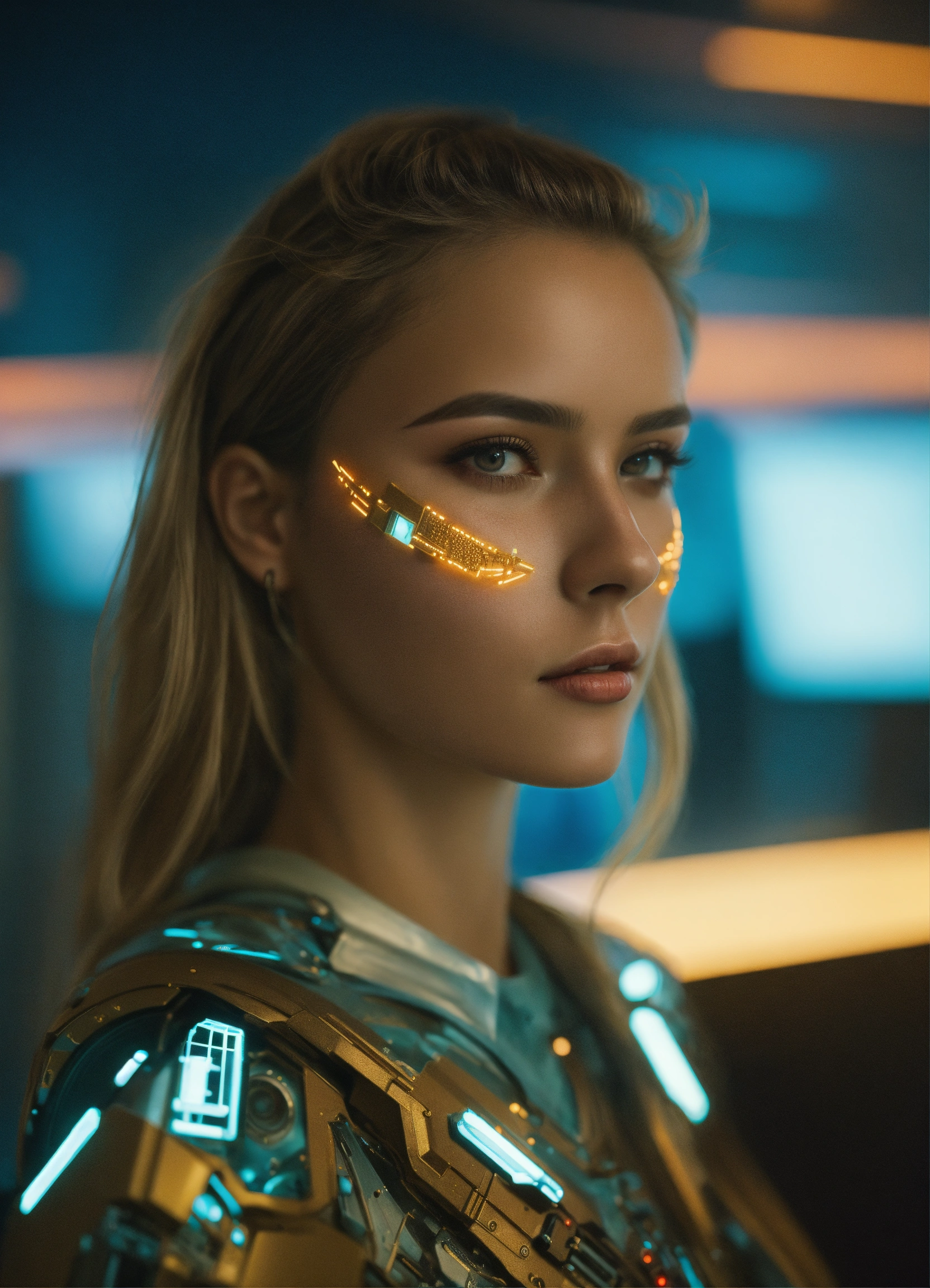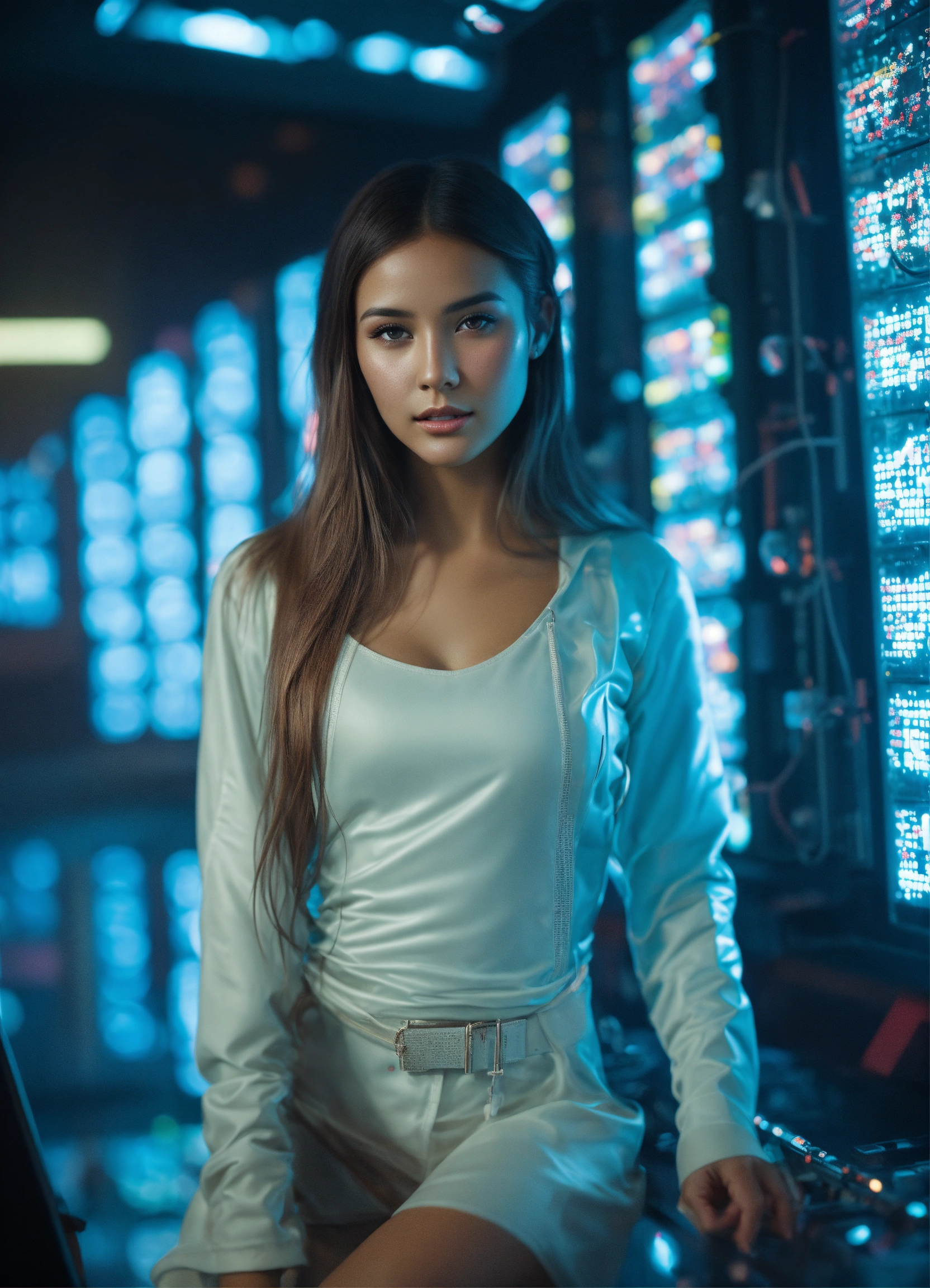 Cyberpunk, sci-fi, fantasy, kodak portra 400, 8k, soft light, volumetric lighting, highly detailed, britt marling style 3/4, portrait photo of a beautiful girl in a futuristic quantum computing laboratory + face, face is la most beautiful tanned skin and dark brown hair female star in paraguay, look straight at the camera, intricate digital painting, elegant, highly detailed, art station, concept art, soft and sharp focus, illustration