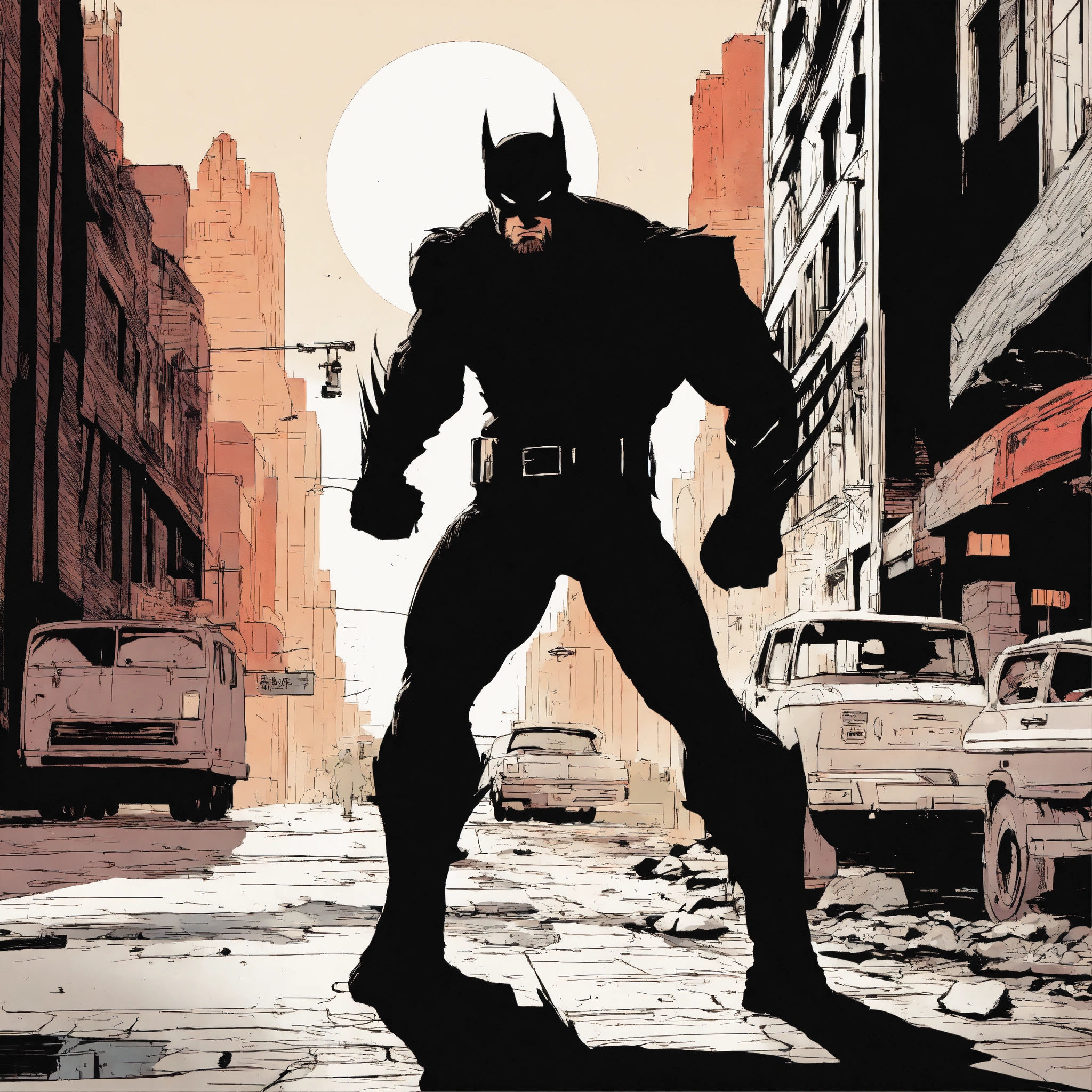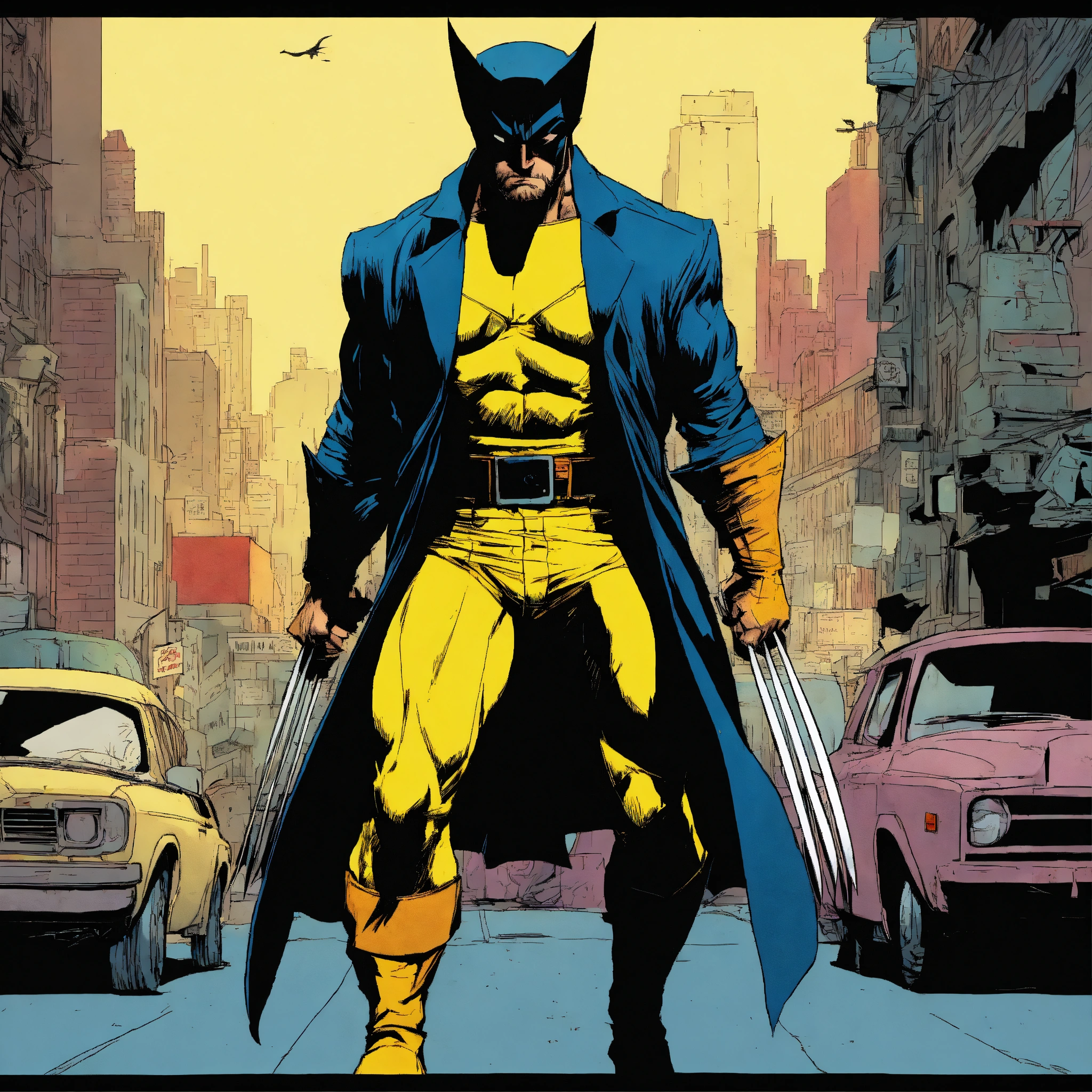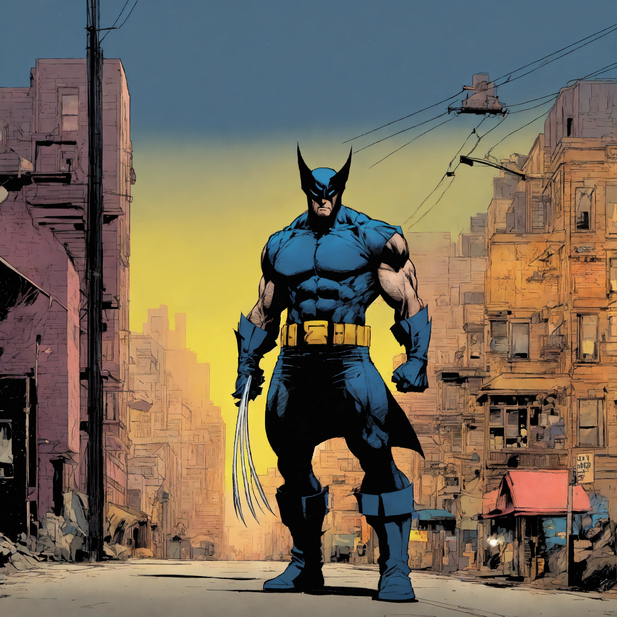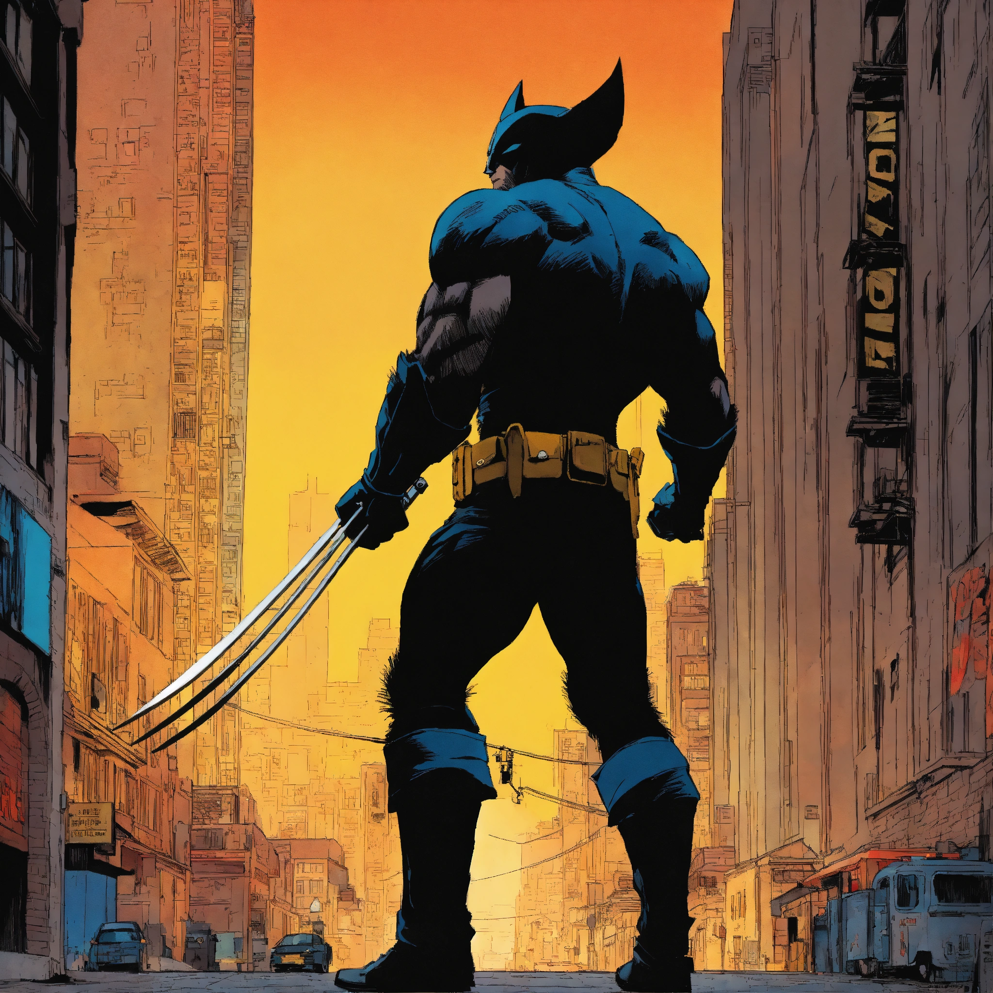 Imagine wolverine drawn minimalistically by frank miller in the vibrant, gritty streets of gotham city.