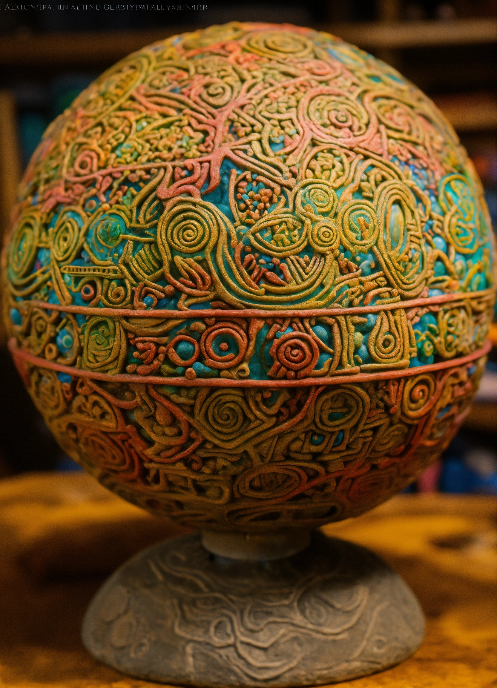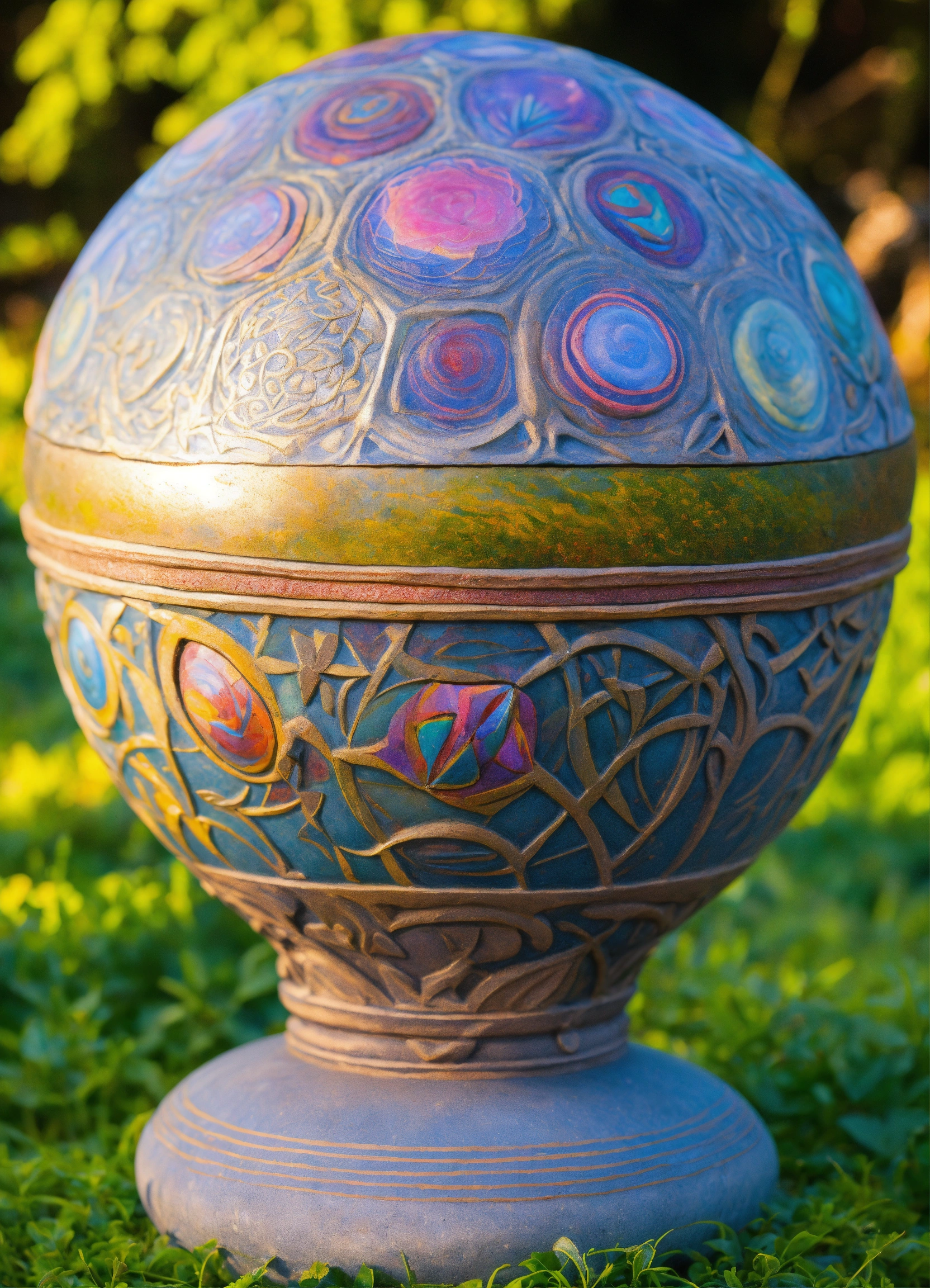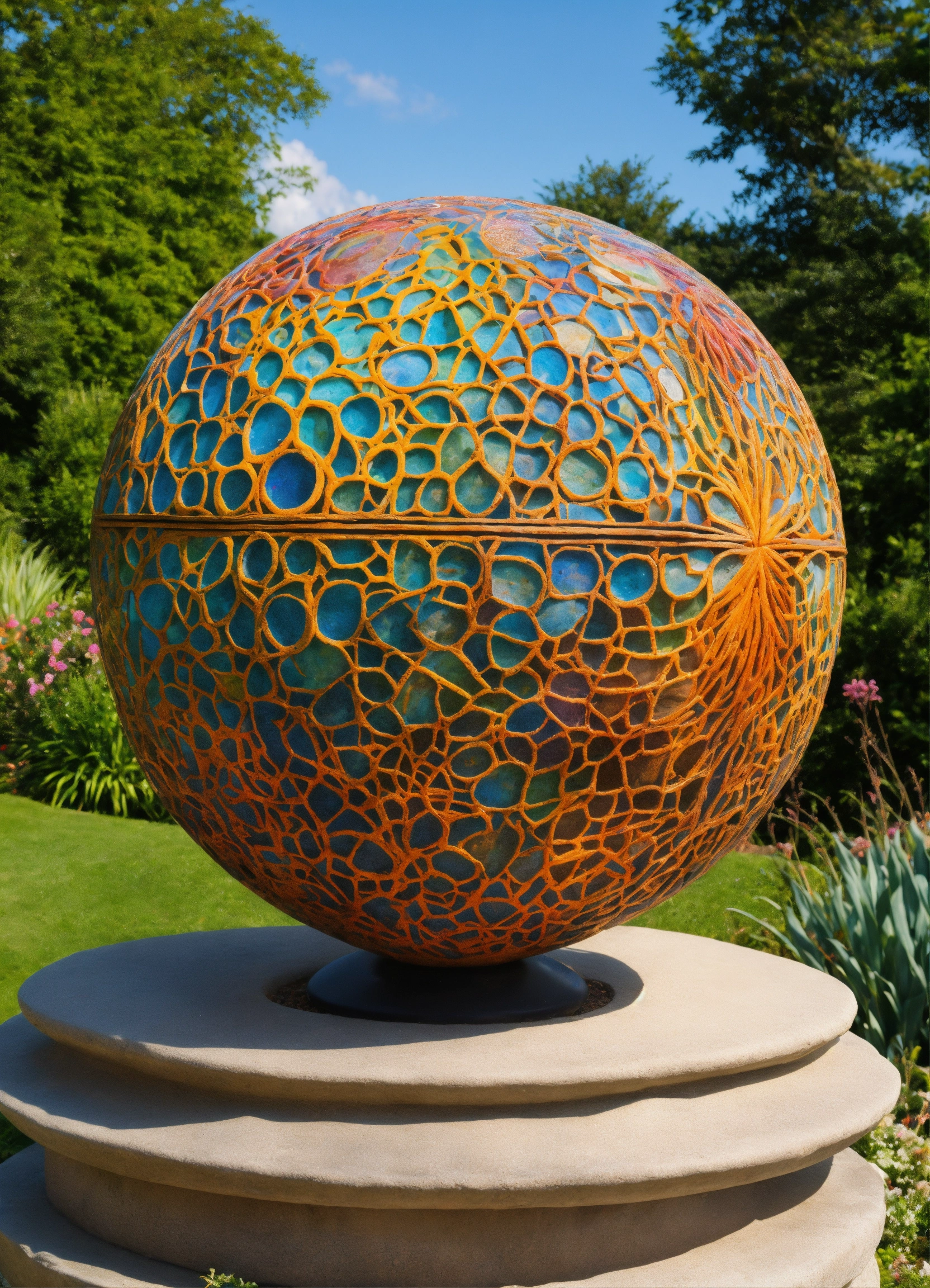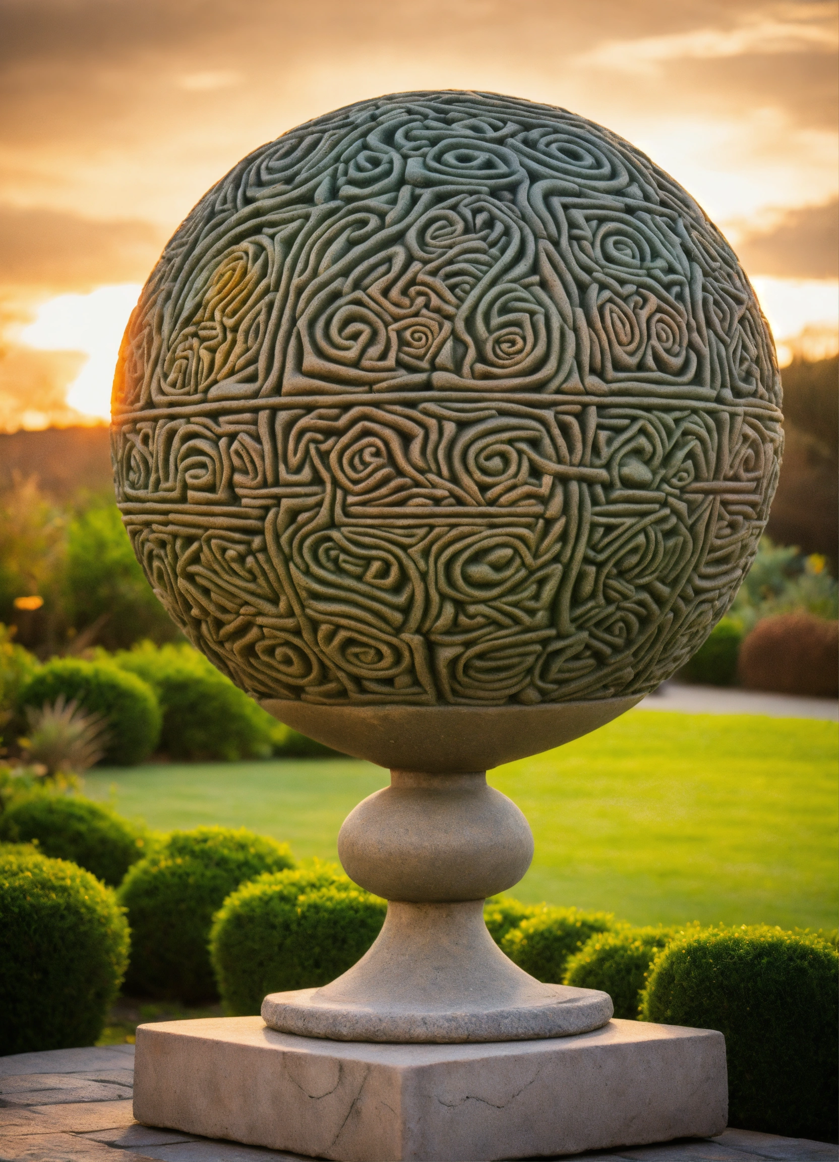 An ancient stone sphere hand made meditative sculptured garden ornament in the style of alex grey, lsd dmt