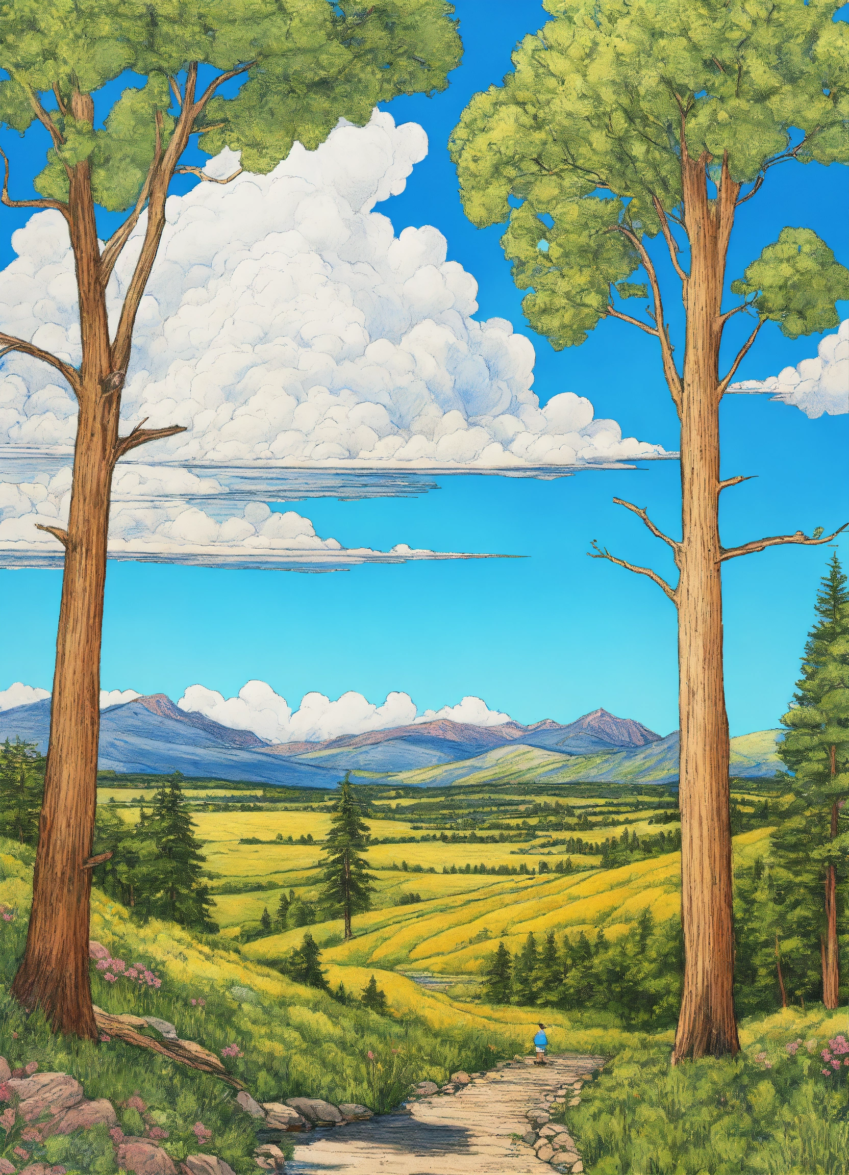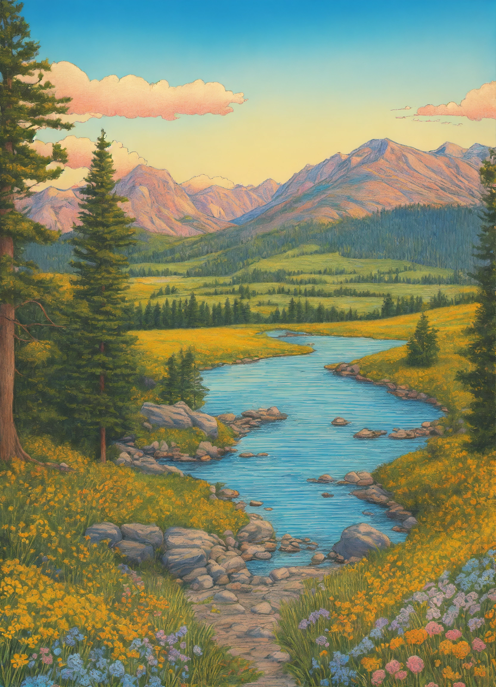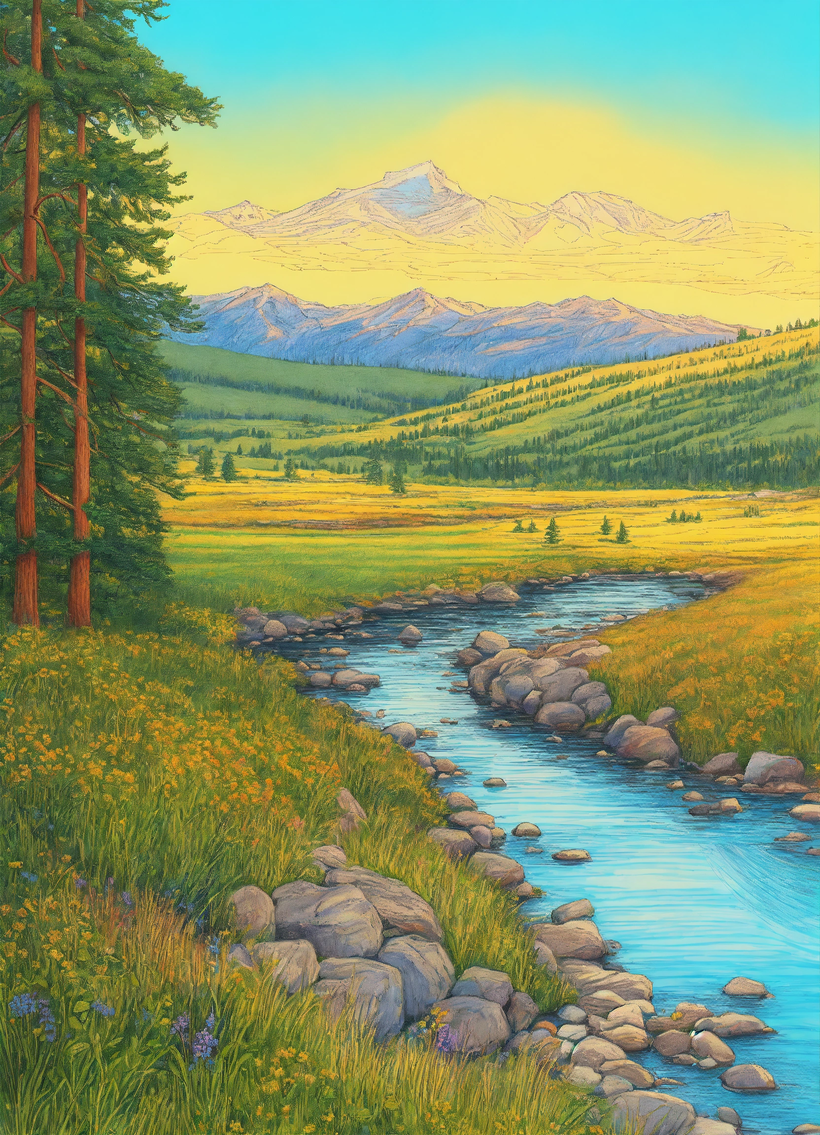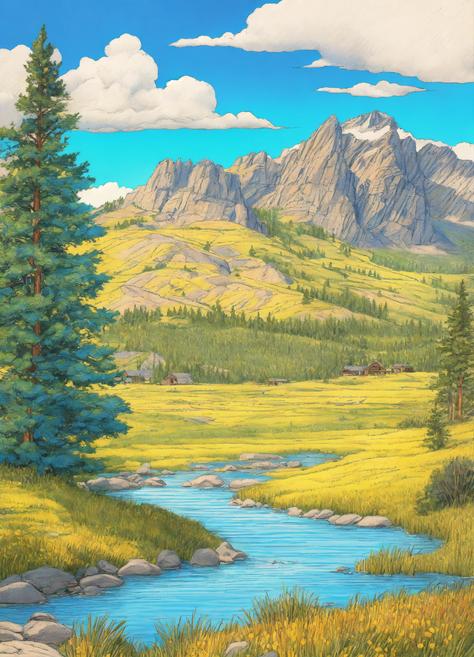Drawing a montana landscape in summer. blue sky, 8k, line drawing, clean clear lines, coloring book style, bright colors, intricate details, elegant, discreete, serene, magical, peaceful, fine detail, pastel pencils, winsor mccay style.