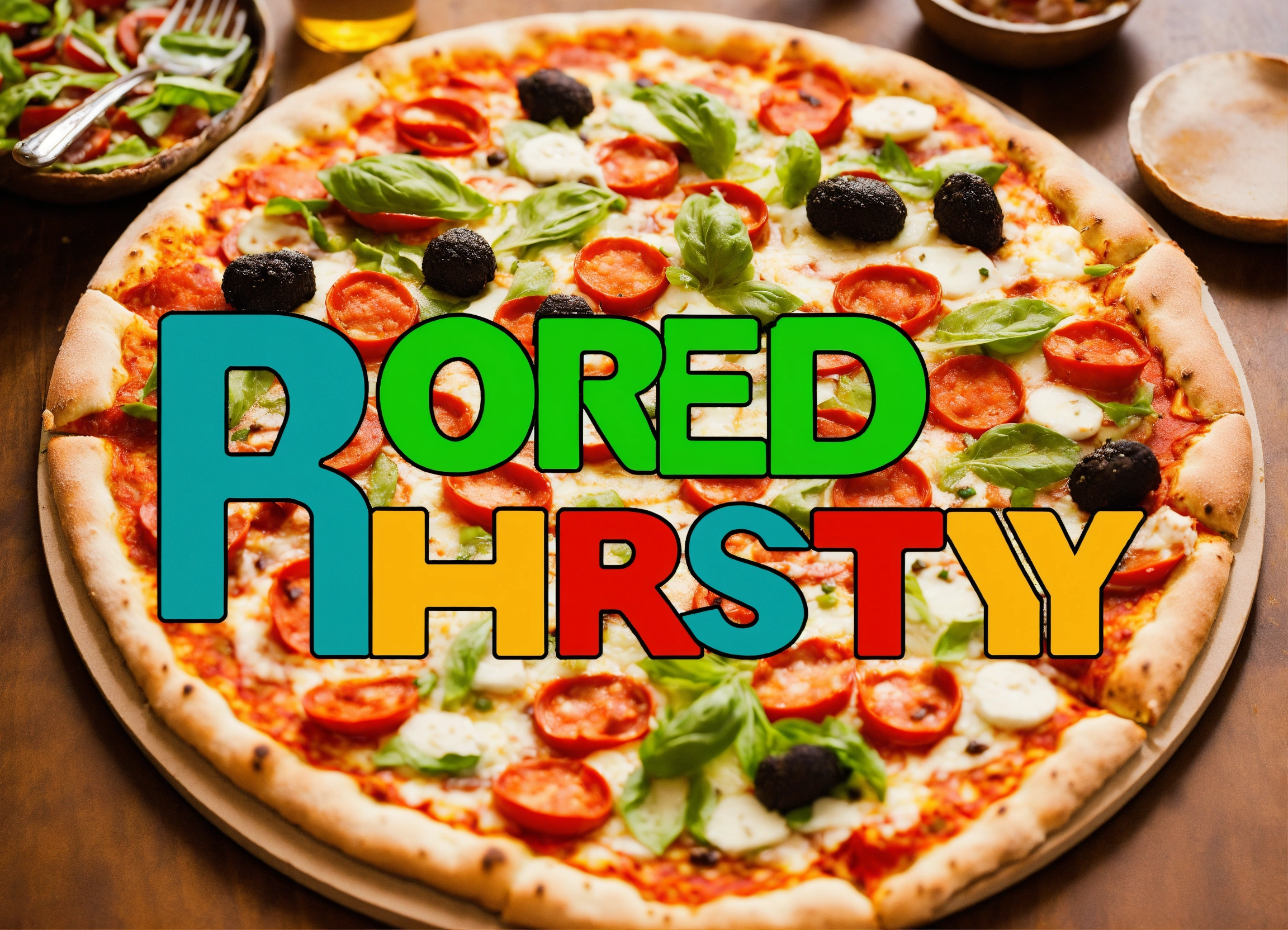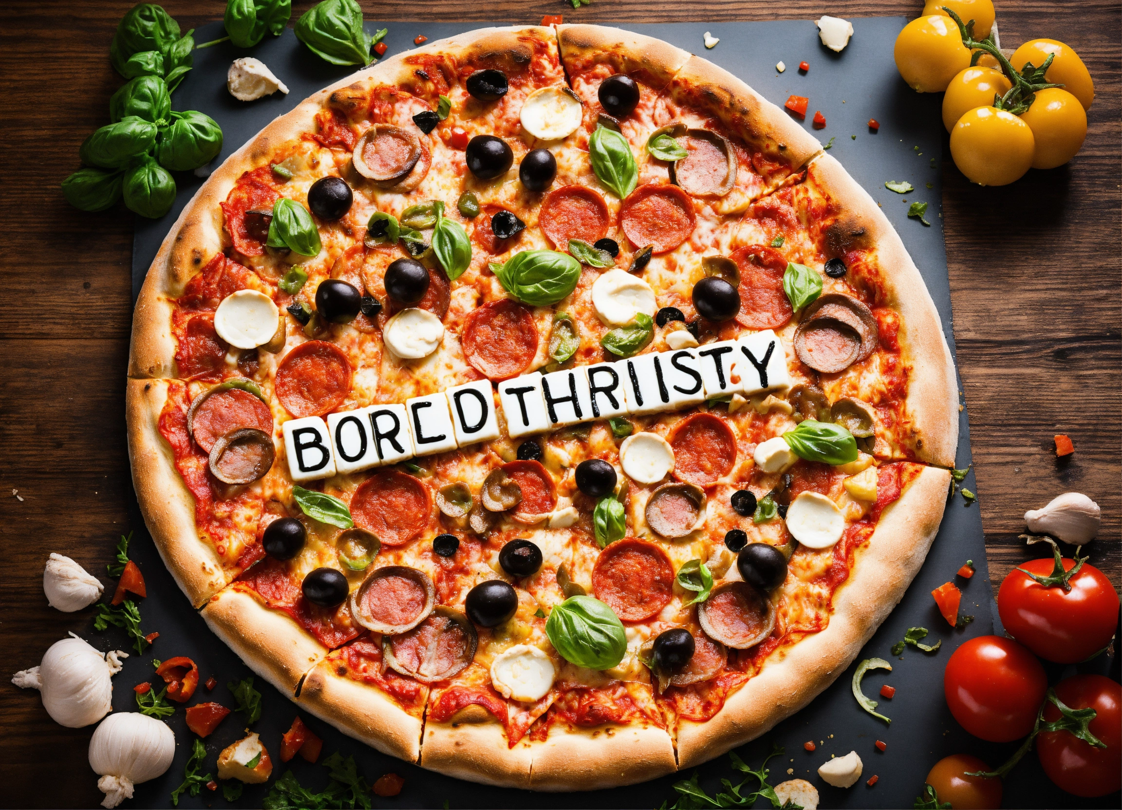 A photo of a pizza where the toppings are arranged to spell the specific words "bored and thirsty"