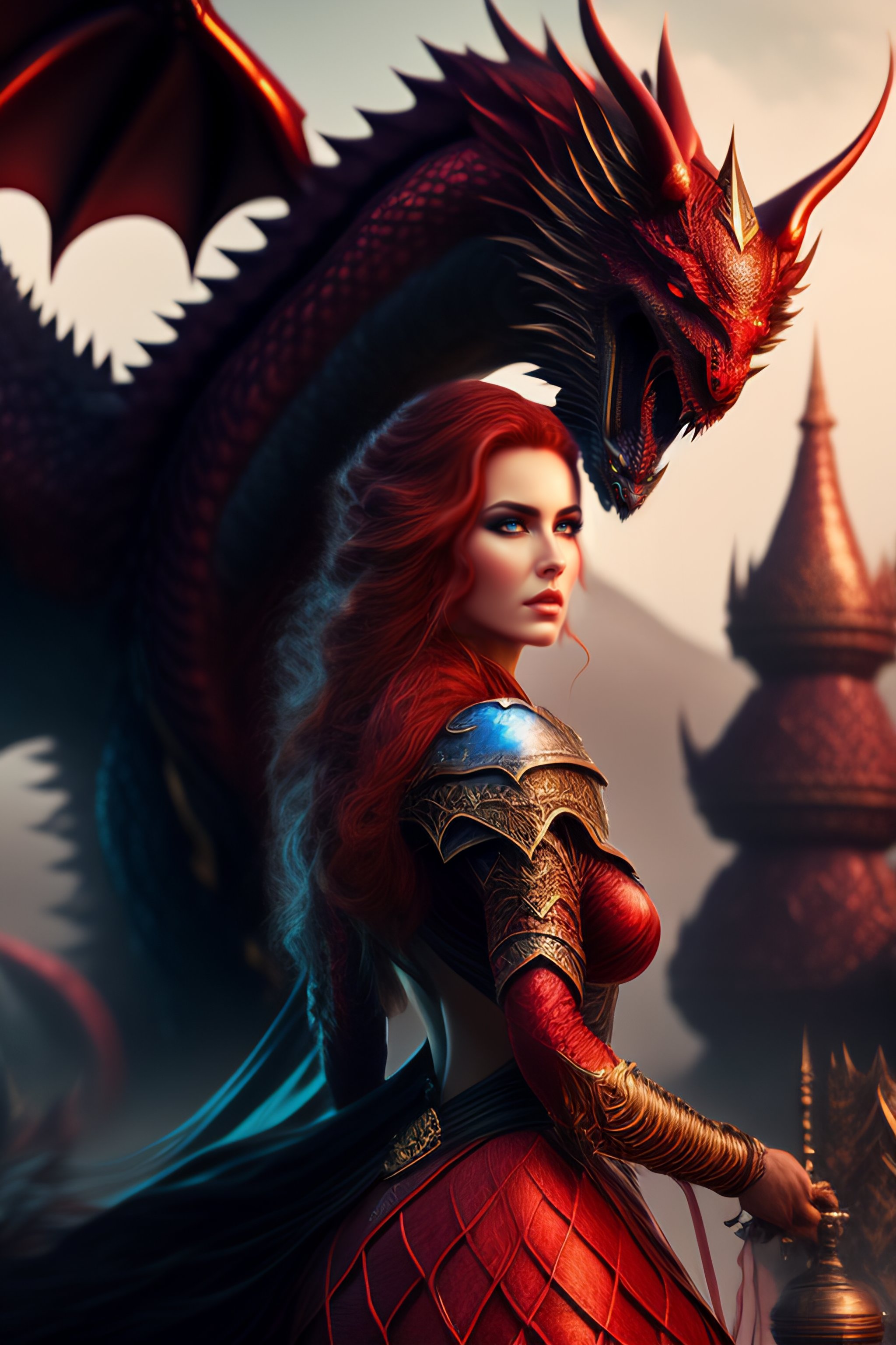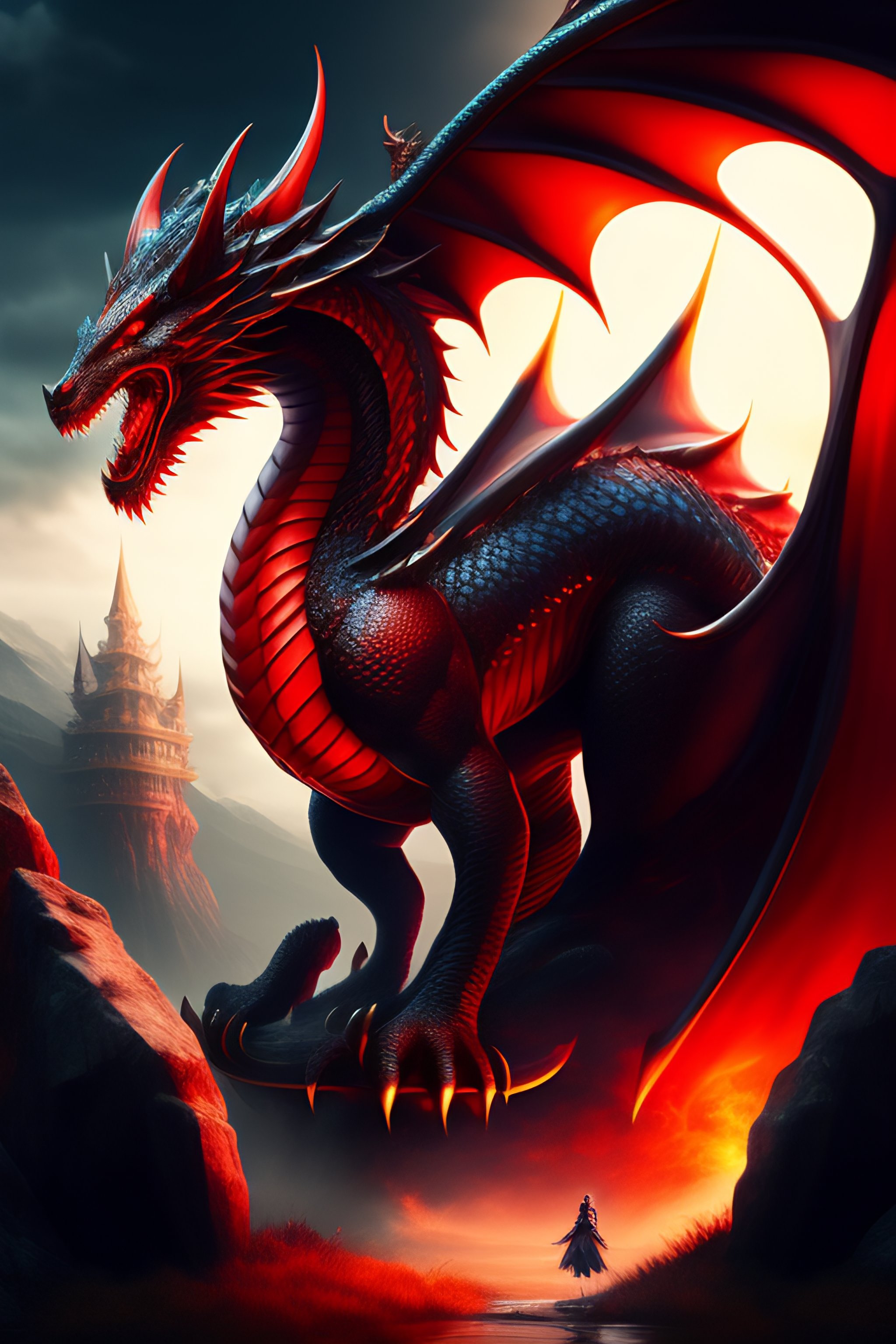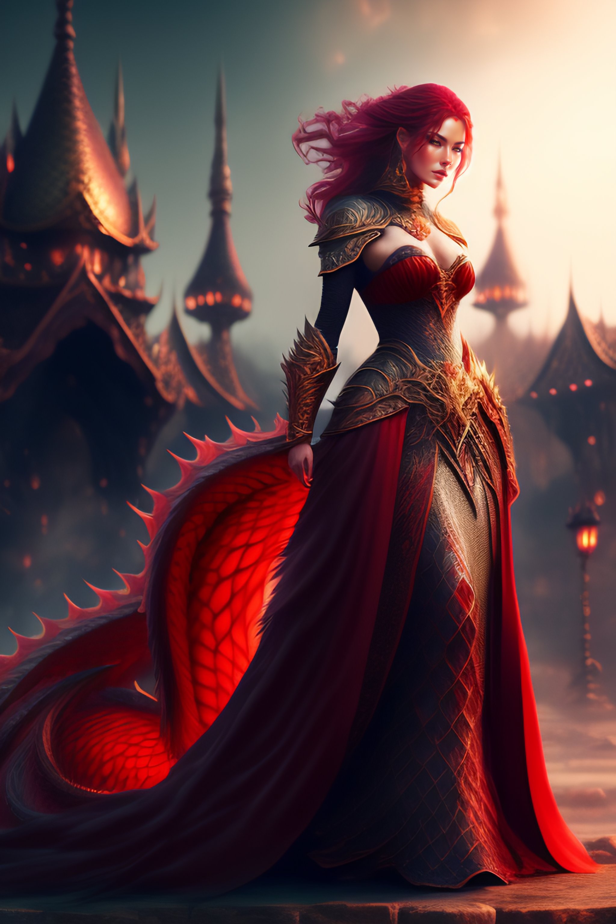 Elden ring style, dragon woman crushing things, deep focus, sharp, soft, tone mapped, volumetric lighting, 9k resolution, trending on art station, beautiful, elegant, highly detailed, huge figure, crimson scales, model shoot, landscape, fantasy village