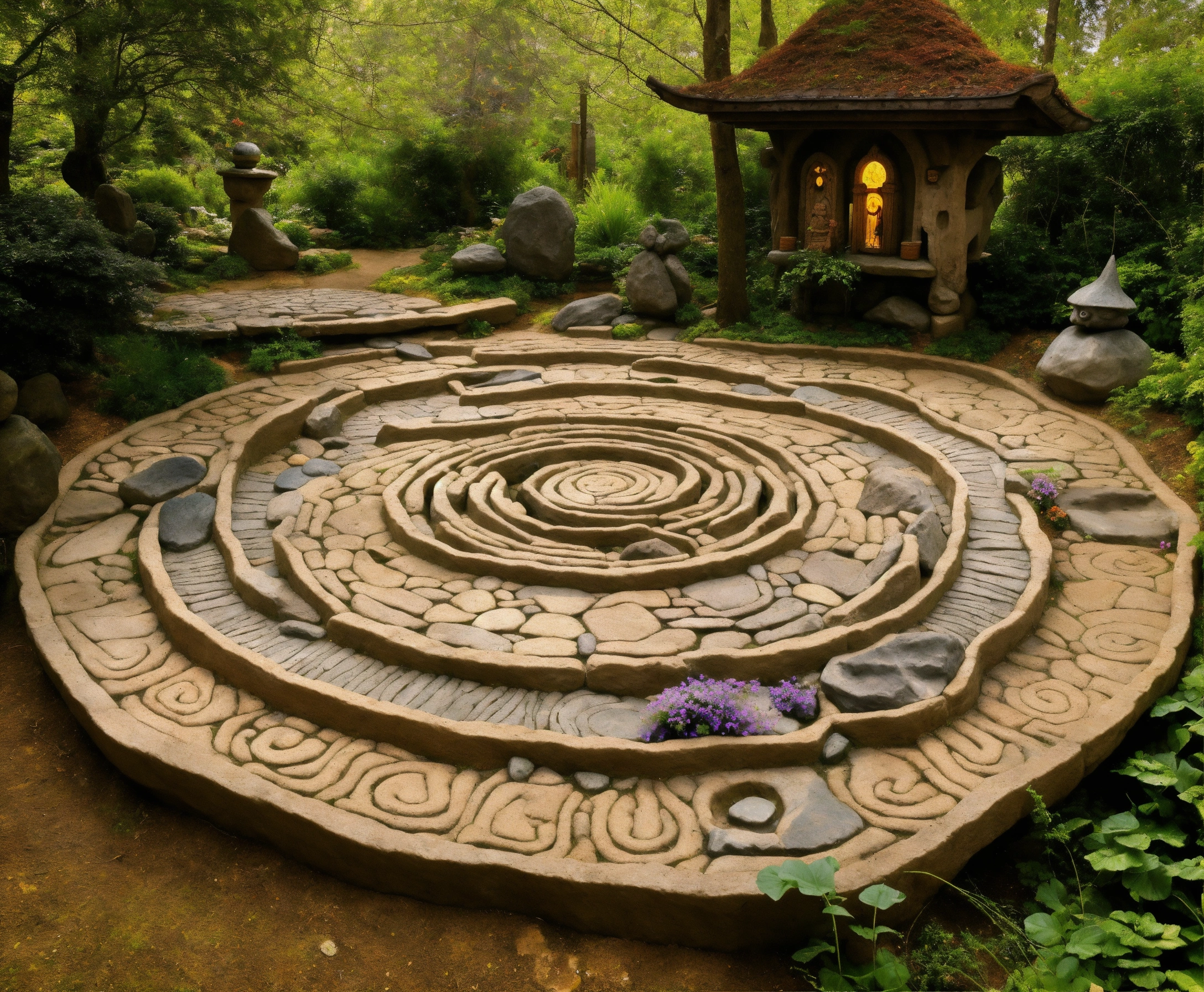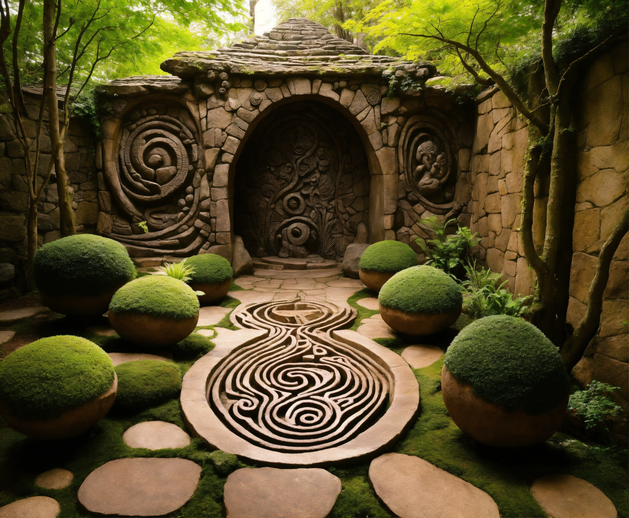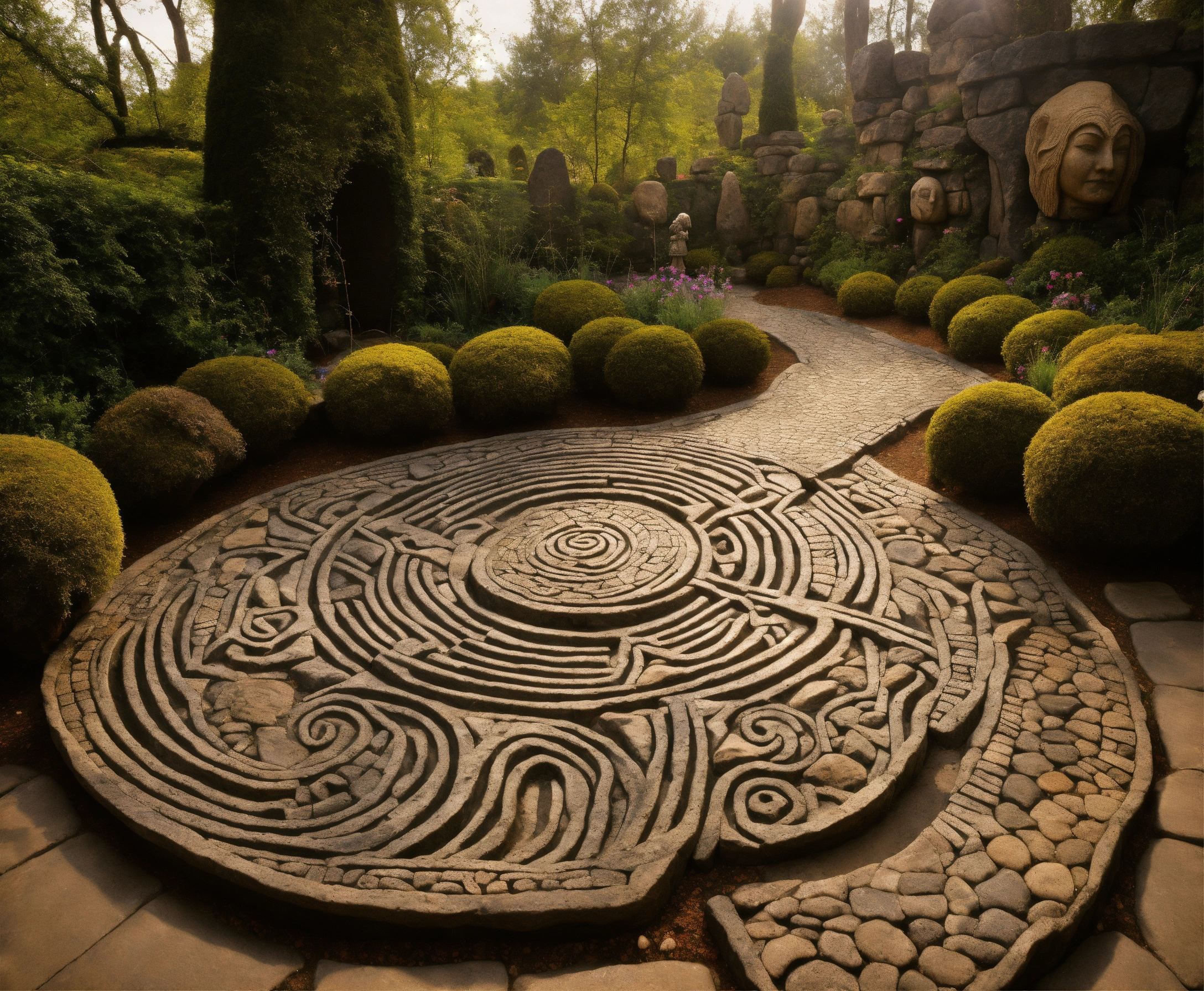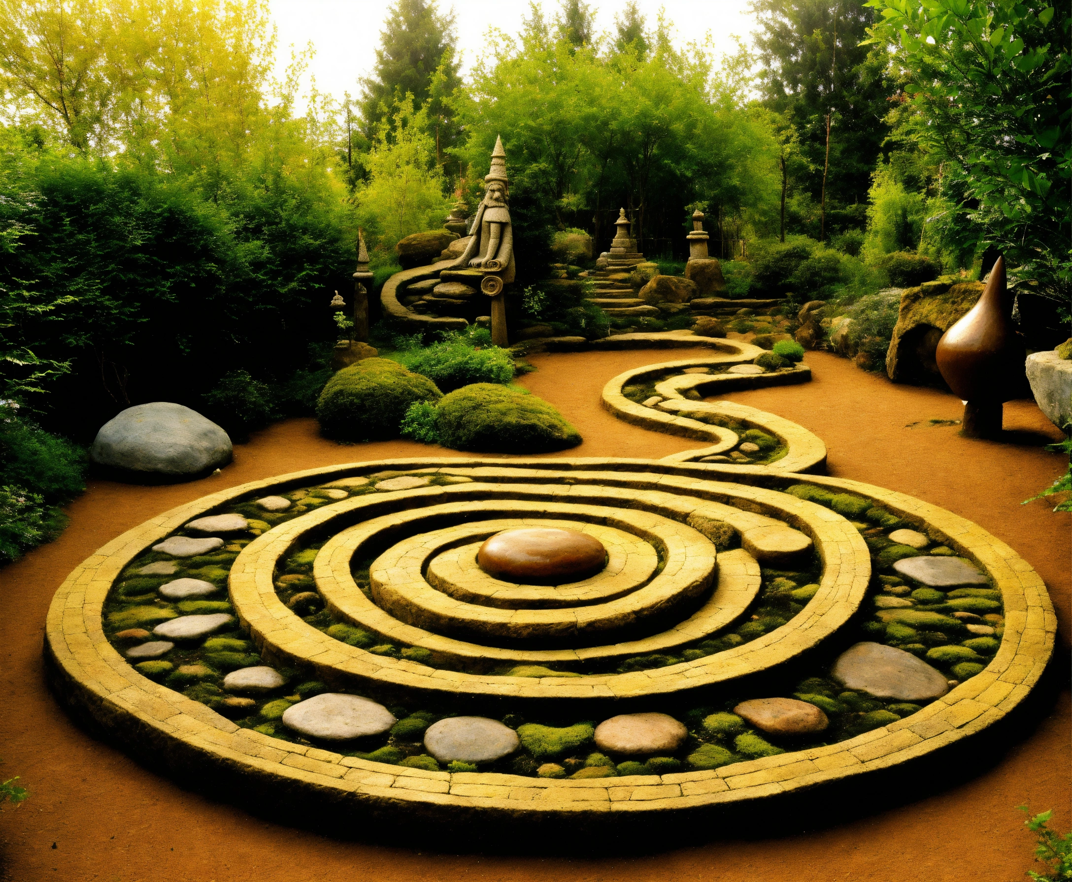 An ancient spiritual gnome inspired stone pathway rock garden.sculptured . style of alex grey/giger/brian froud. totem sculptures. patterned stone winding pathway, labyrinth.courtyard.meditative.