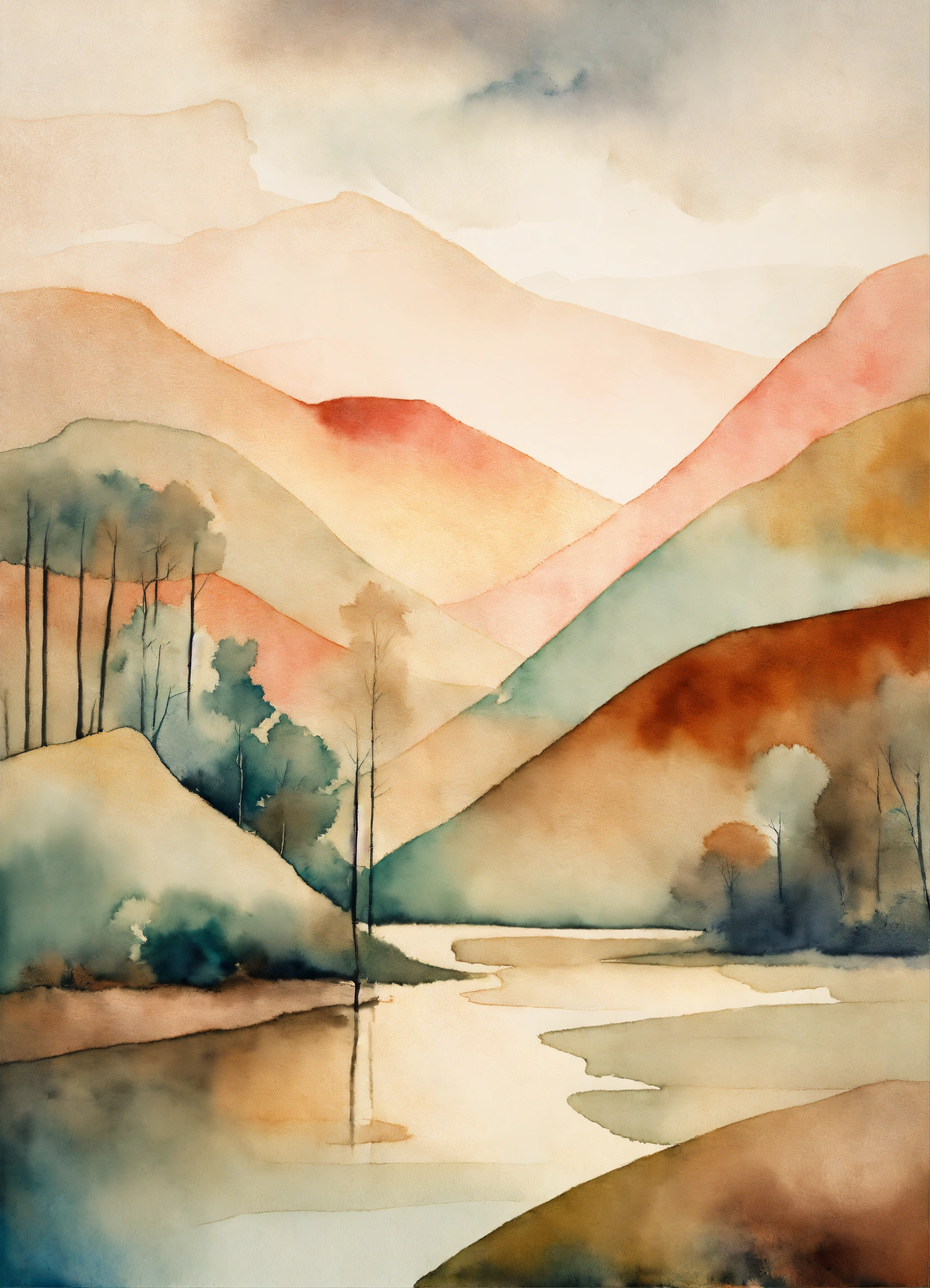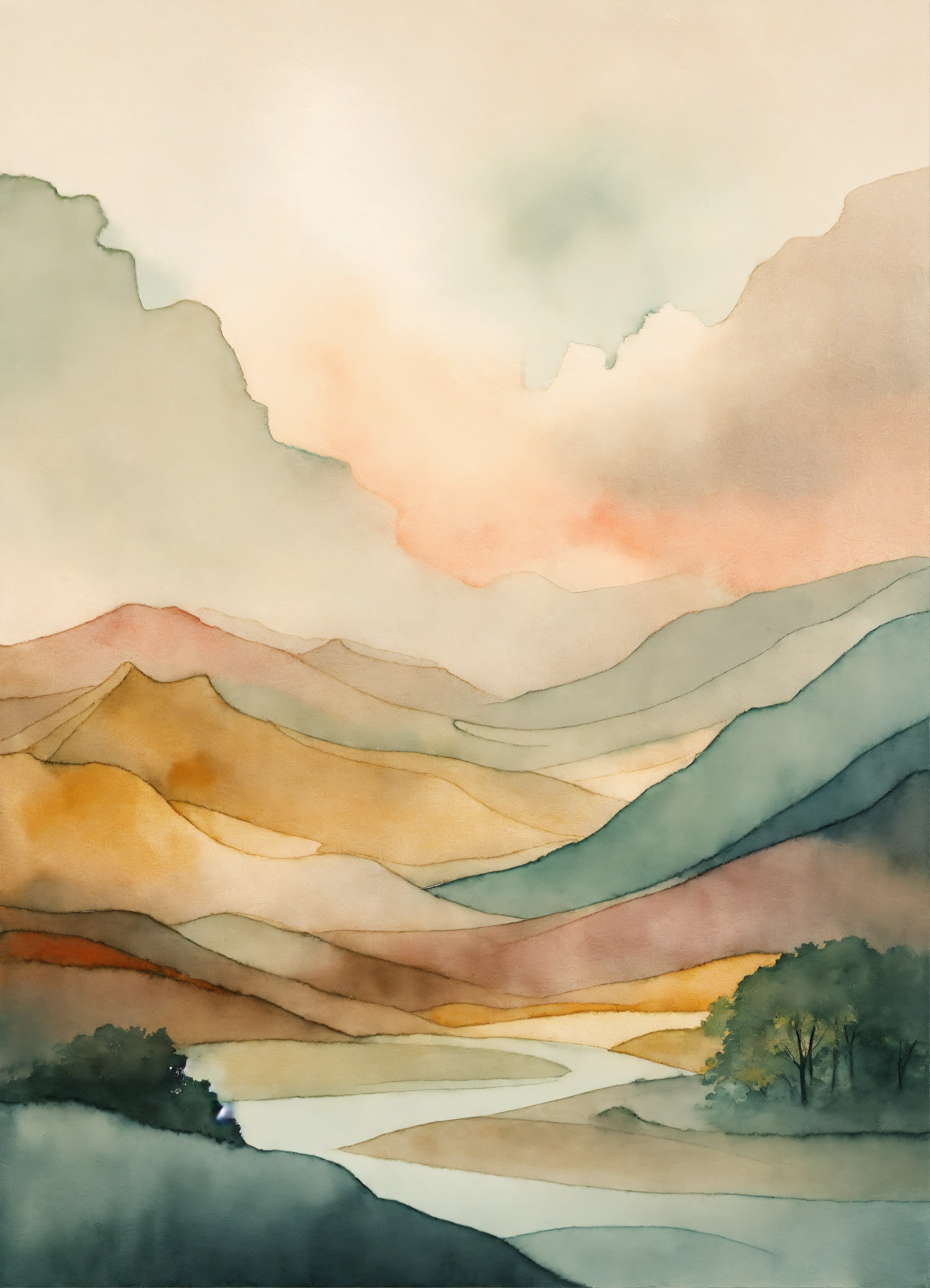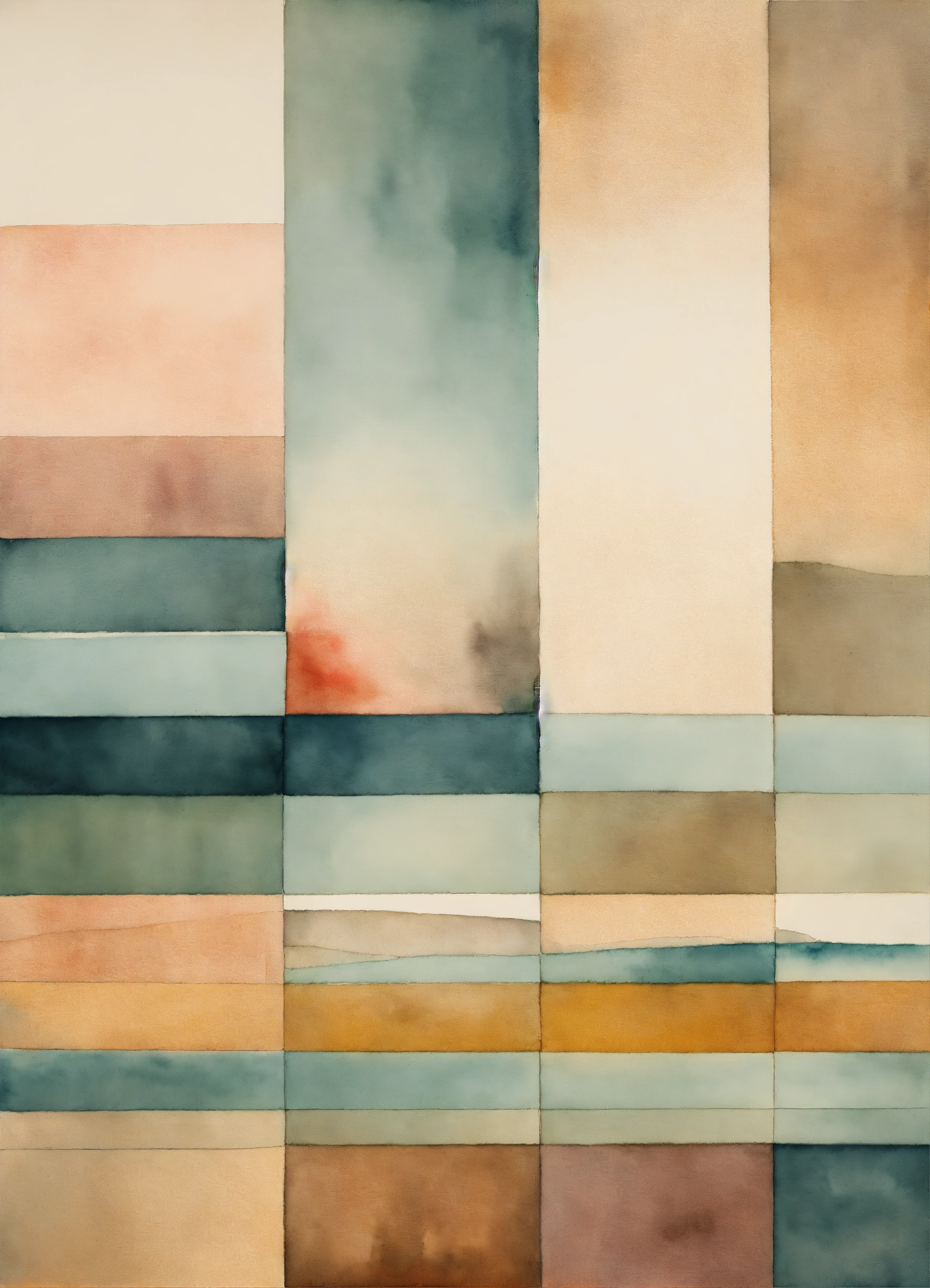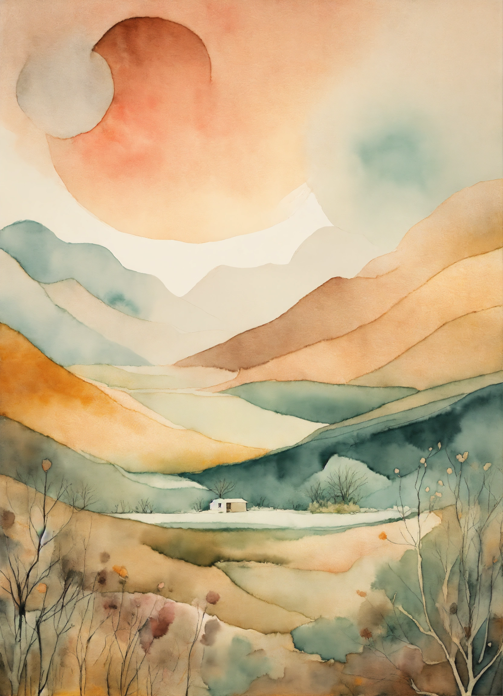 Muted tones colors surreal combination with minimalist compositions, evoking a sense of calmness, vintage drawing, abstract watercolor painting, holistic theme, european style