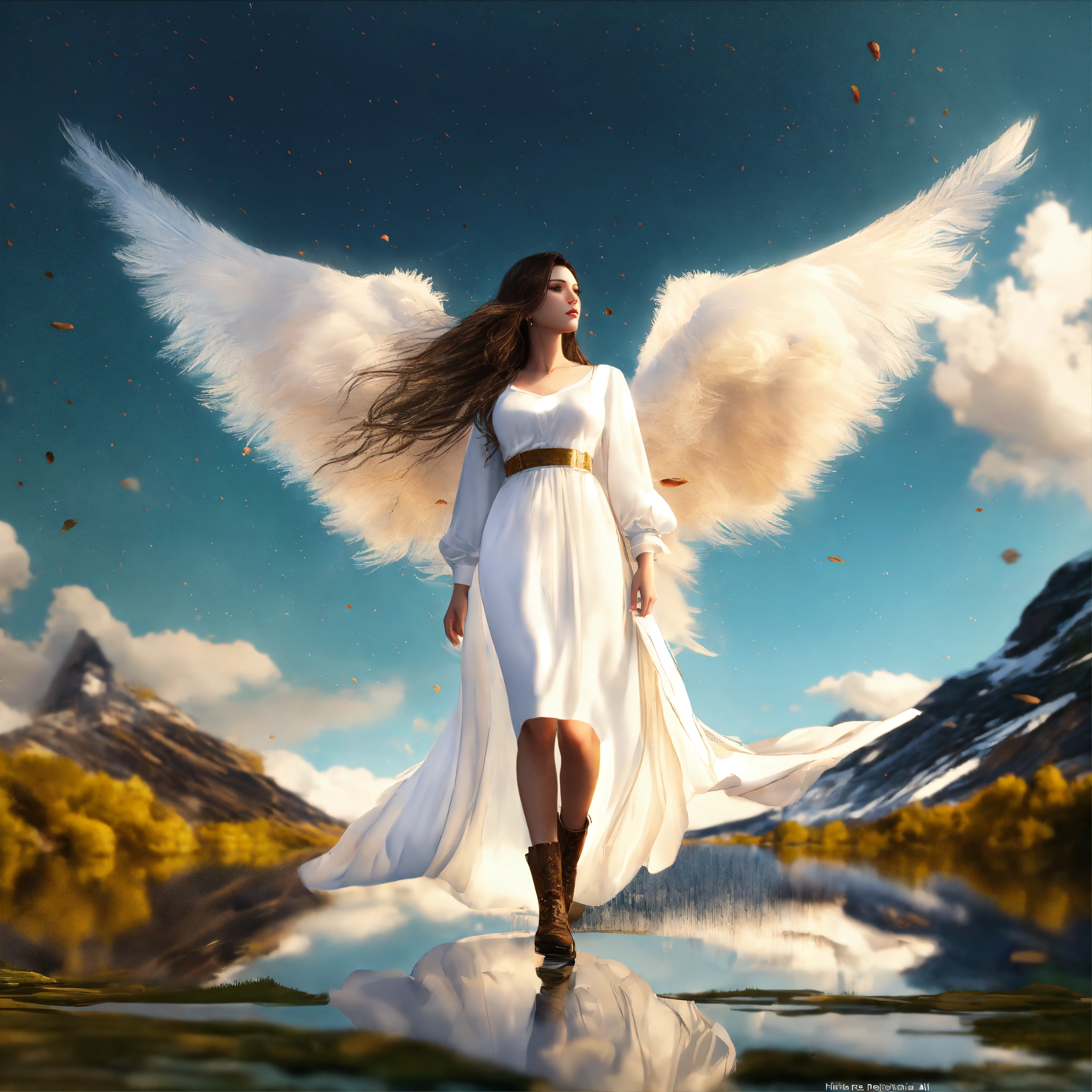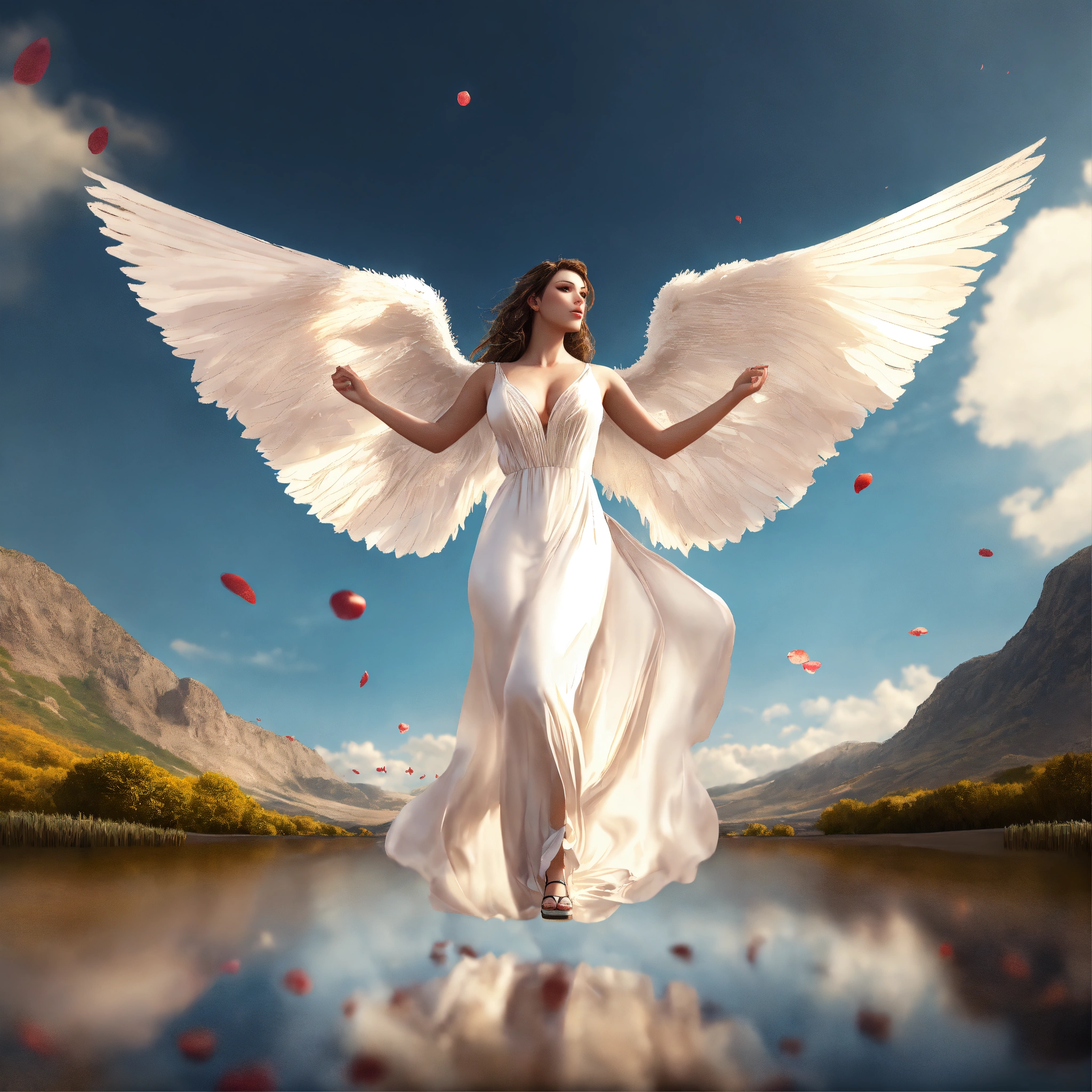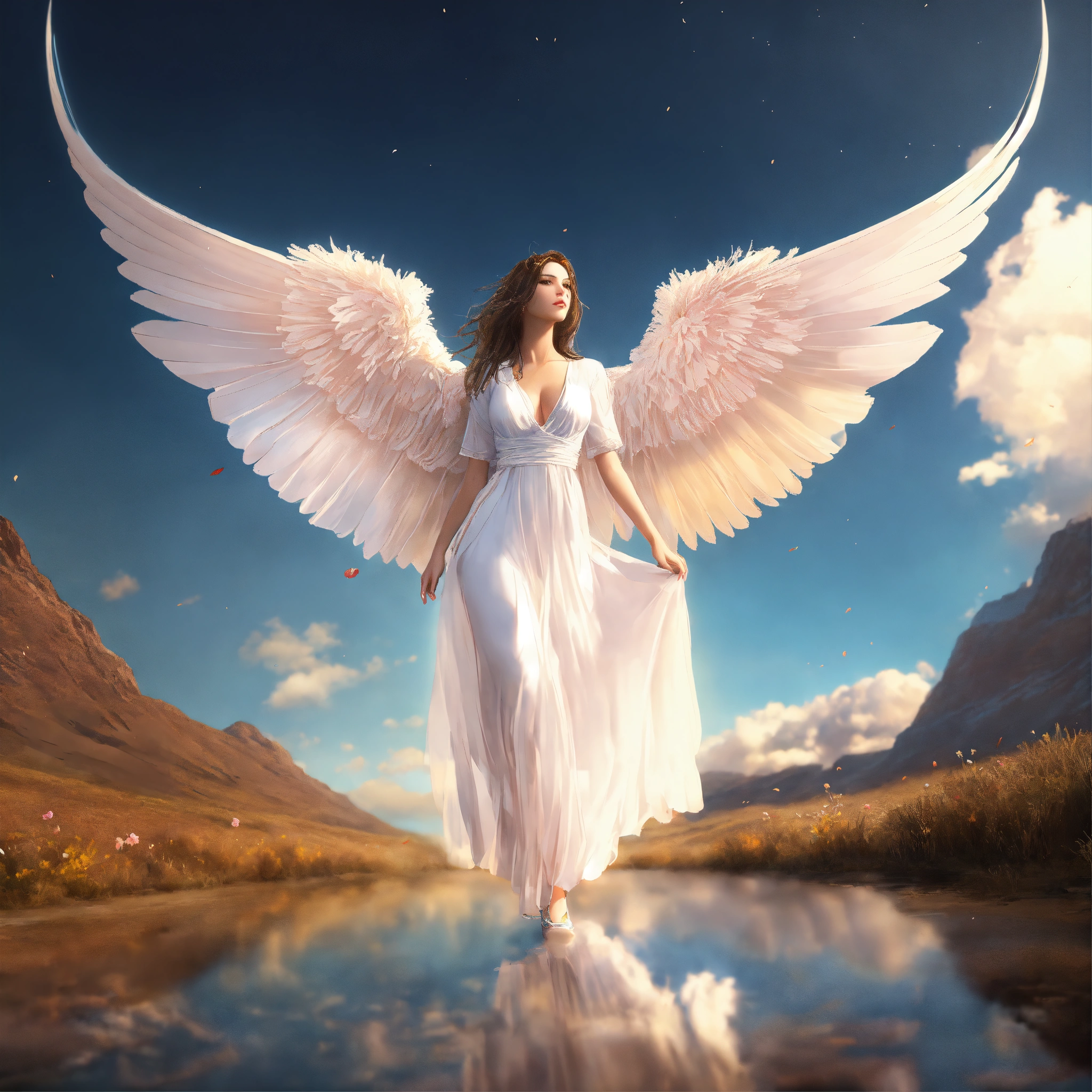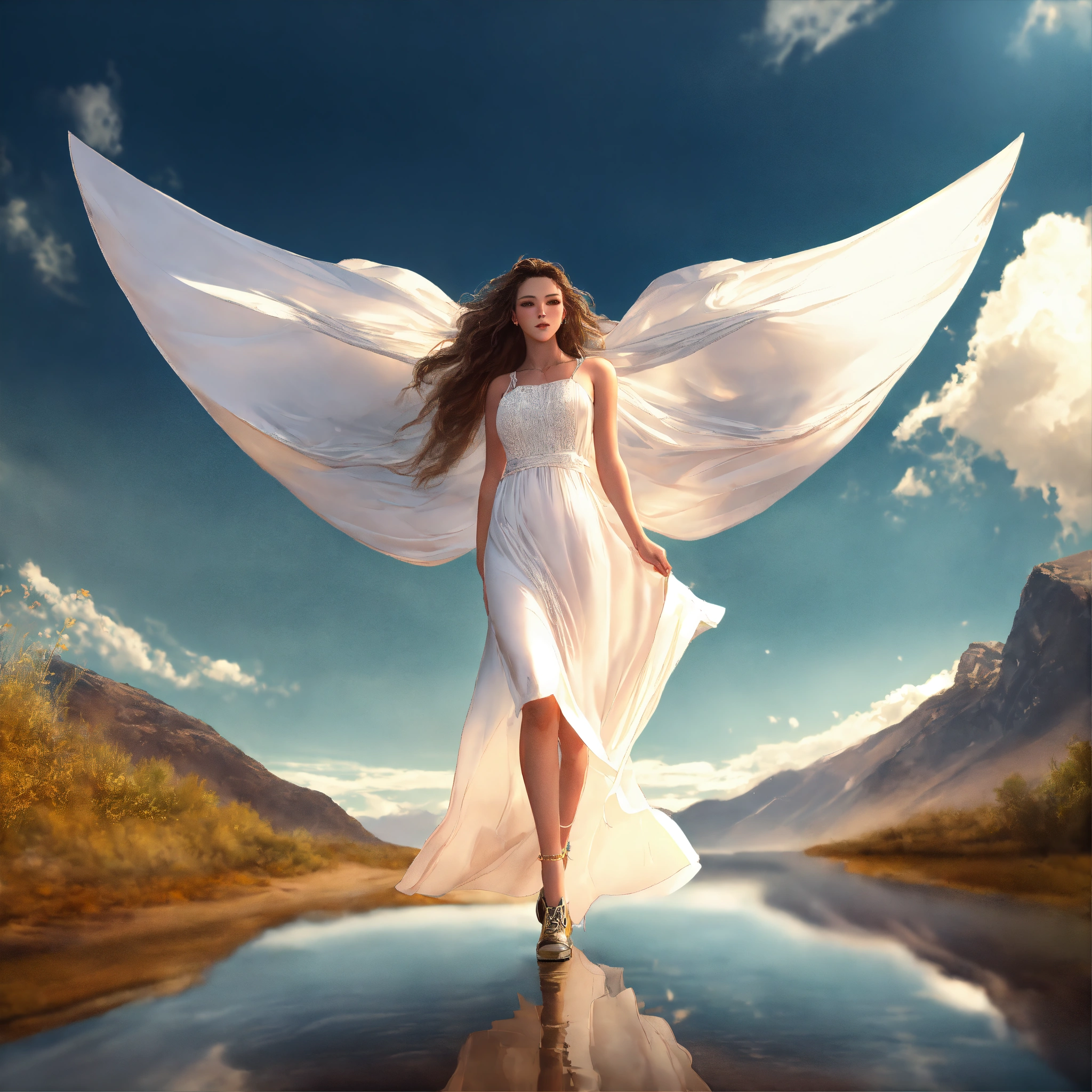 Hyper realism, poetic, romantic, long dress, realistic shading, realistic render, detailed textures, photorealistic, wide shot, landscape