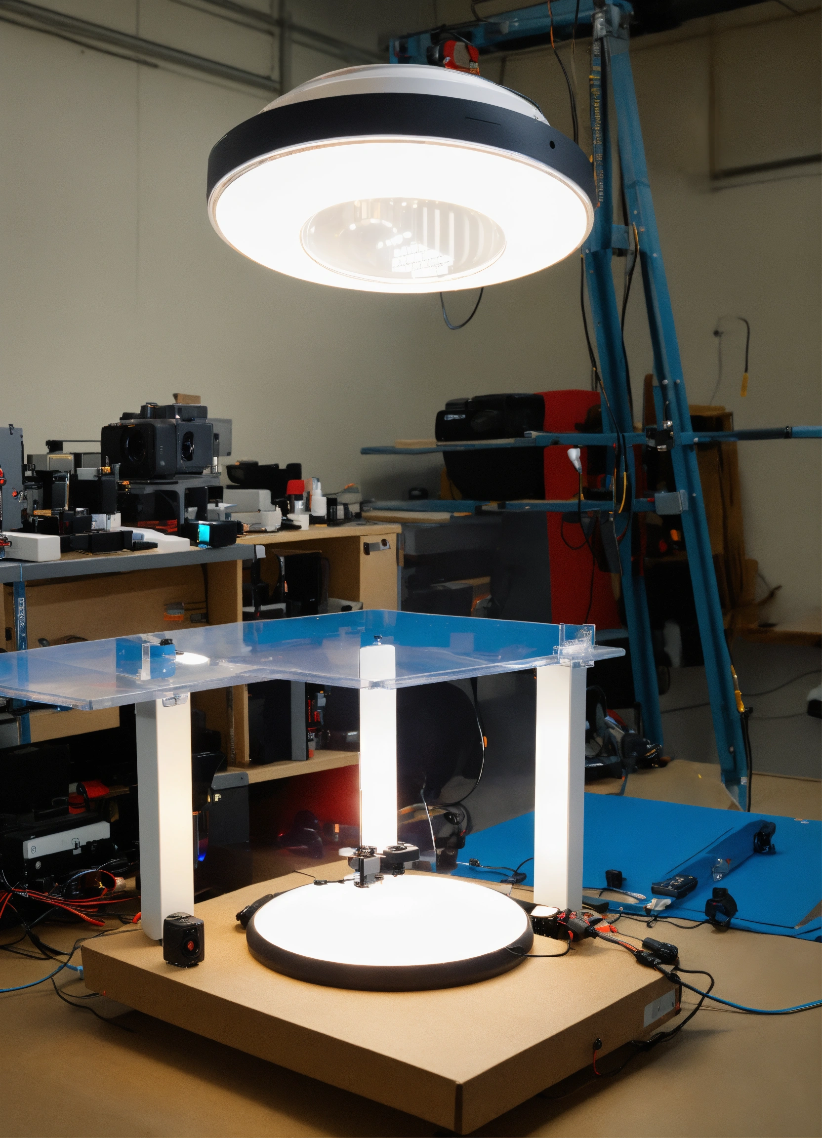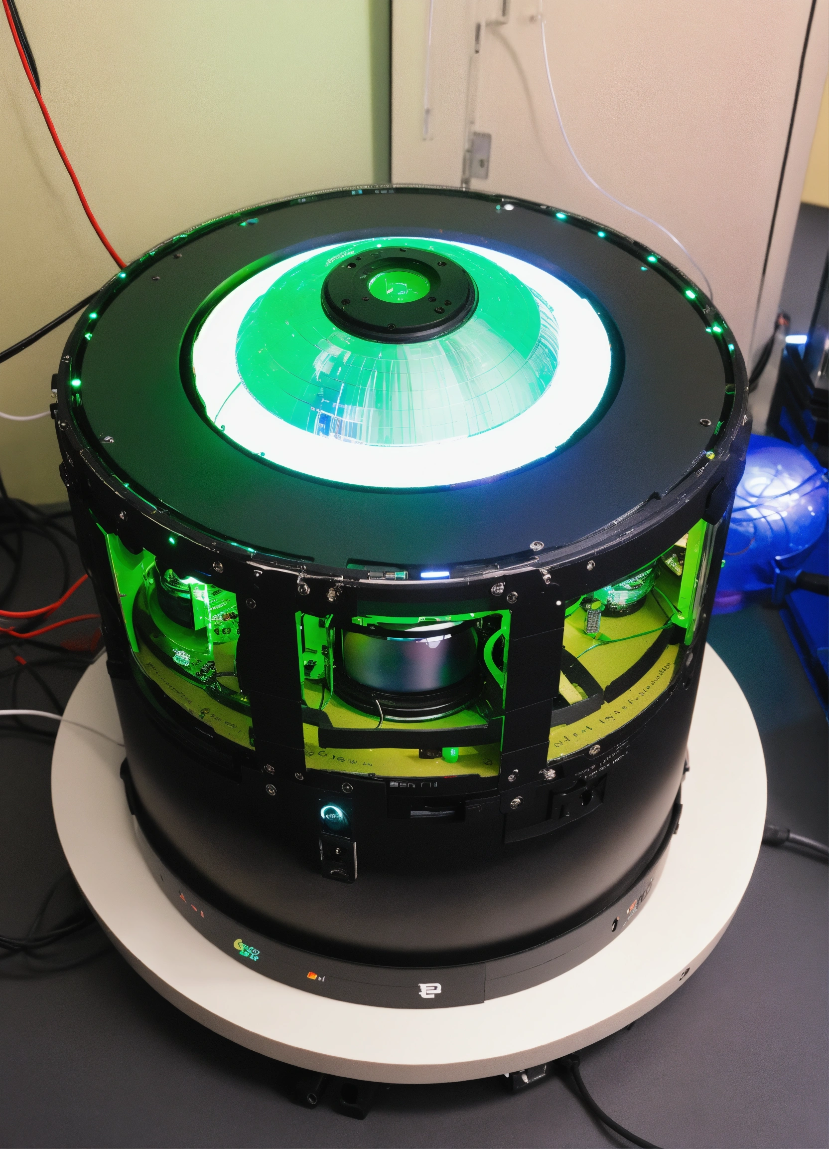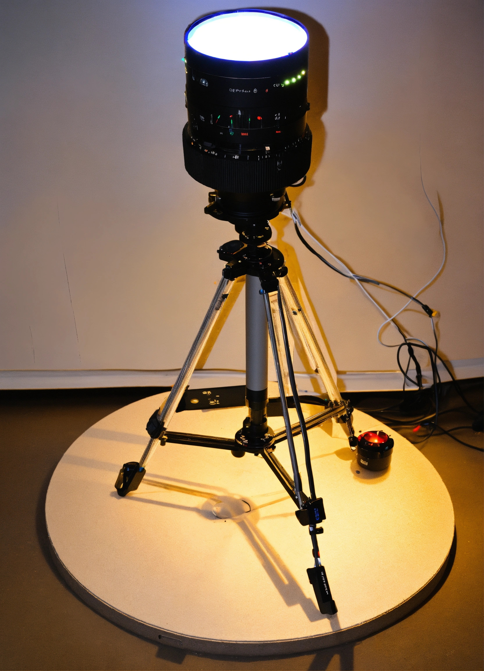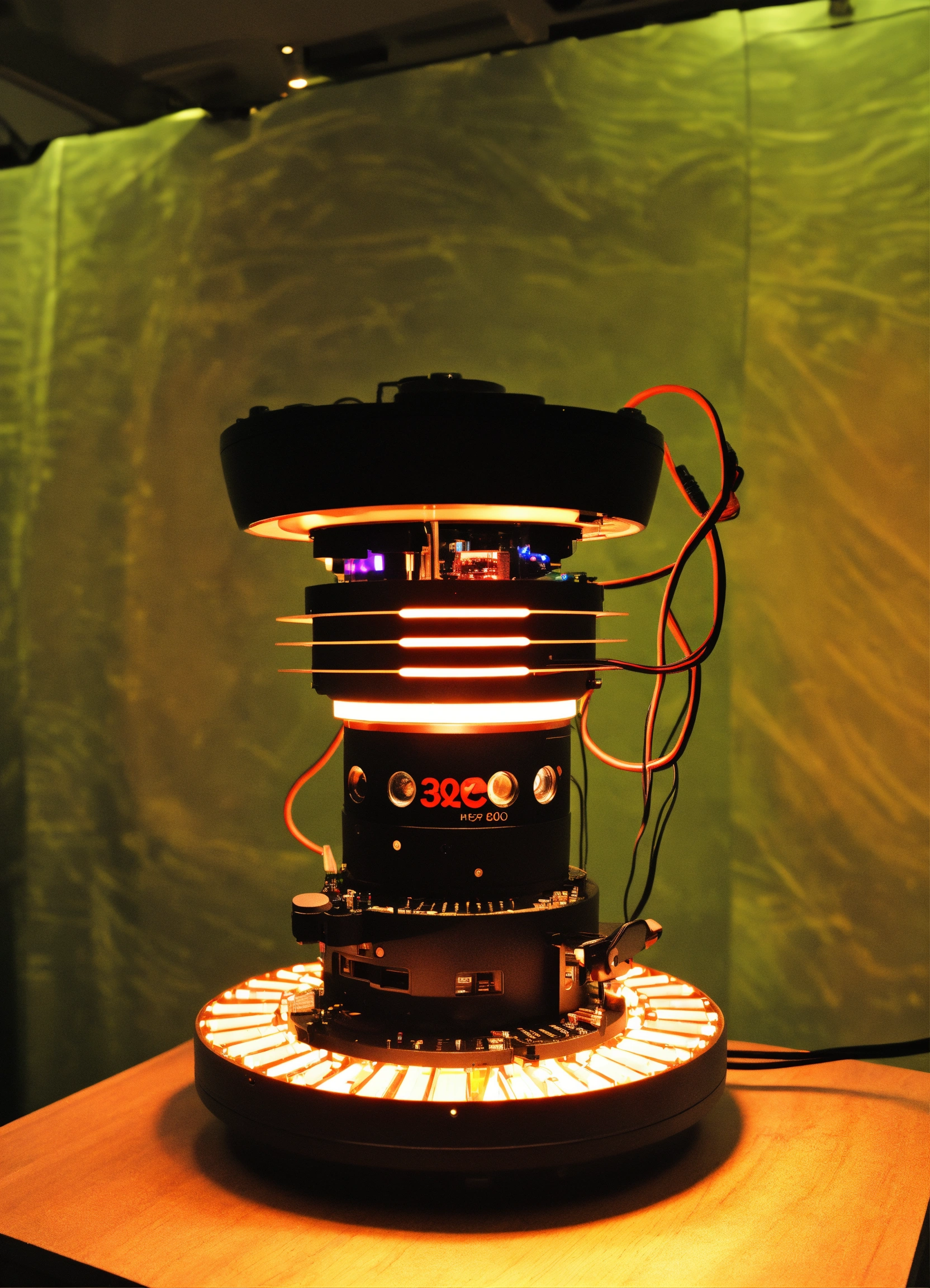 A prototype for a "360-degree camera" used for small products photography.about 50cm high and 40cm diameter. led lights on all lags, multiple digital cameras are on the inner side of the device facing inward.