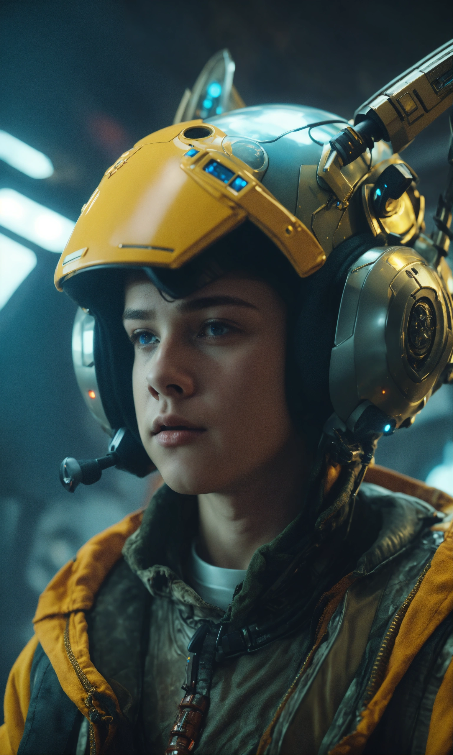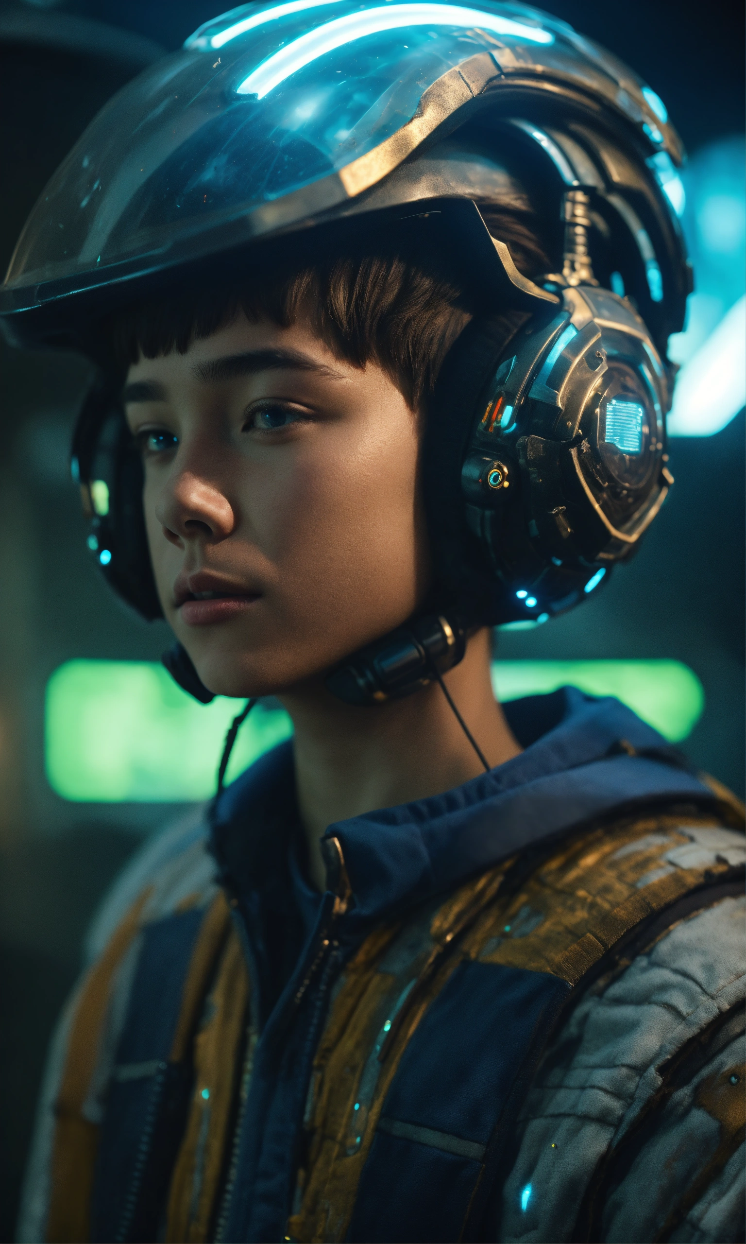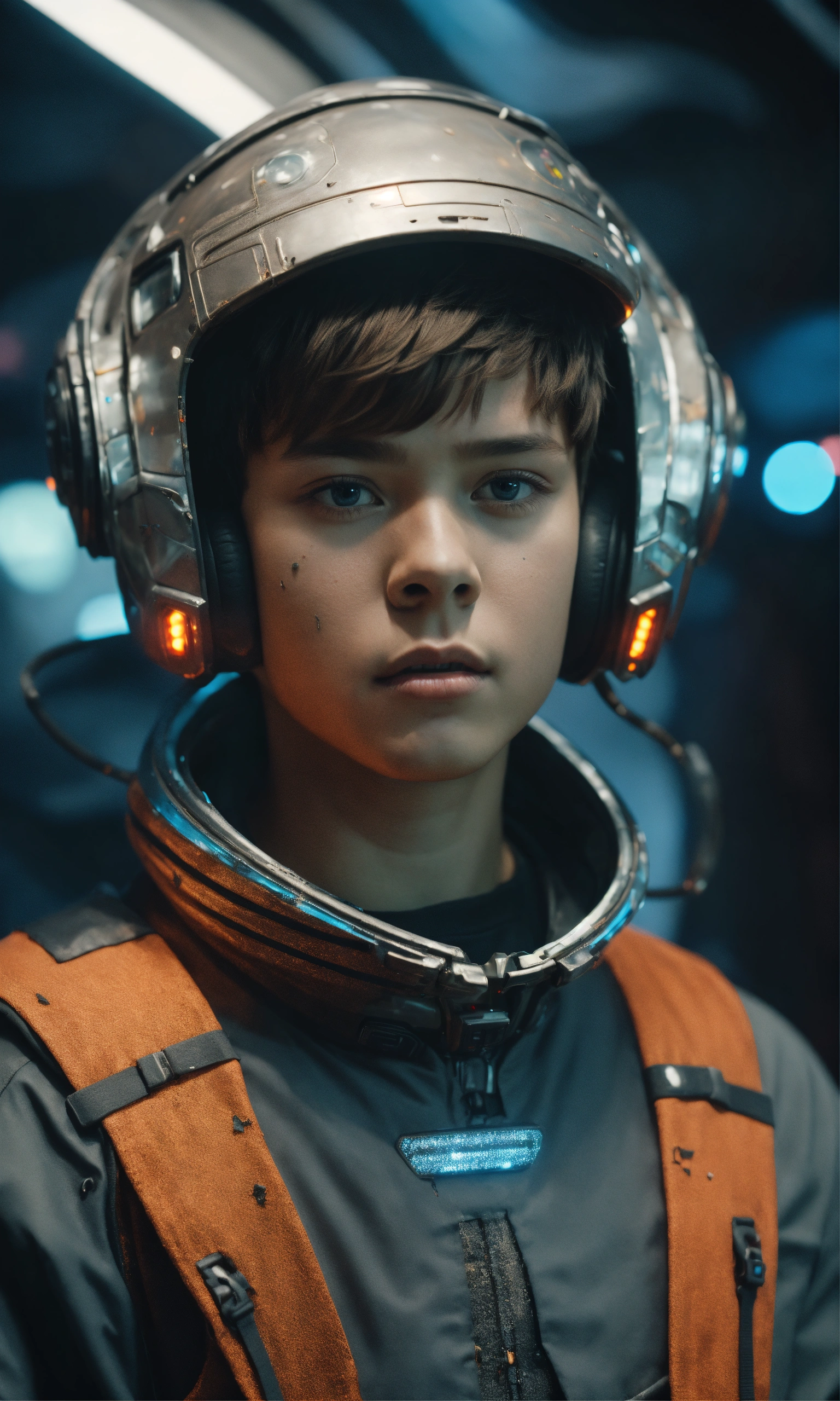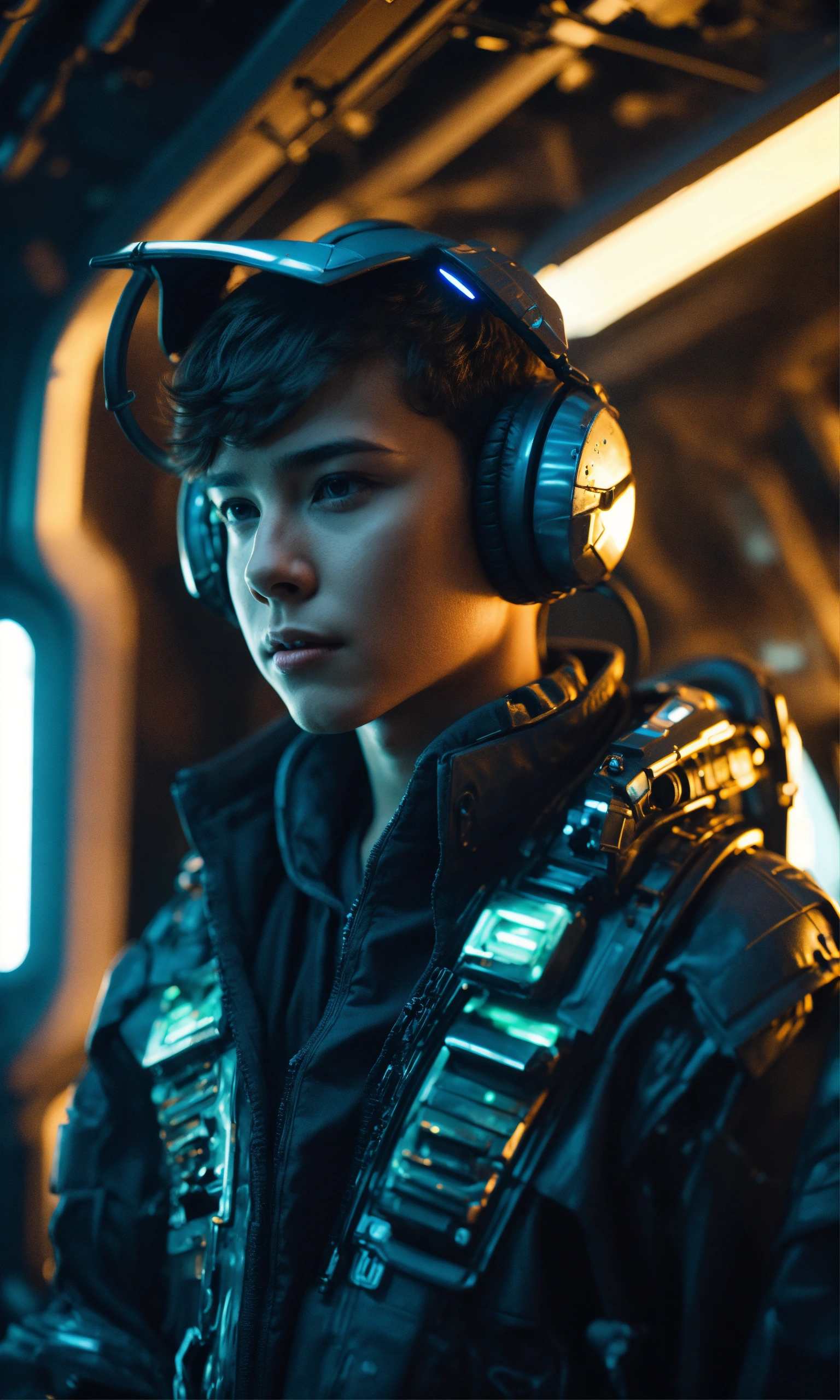 Full shot of a boy wearing detailed alien ear antennas with futuristic clothing in wrecked starship, futuristic, sci-fi, realistic, 8k