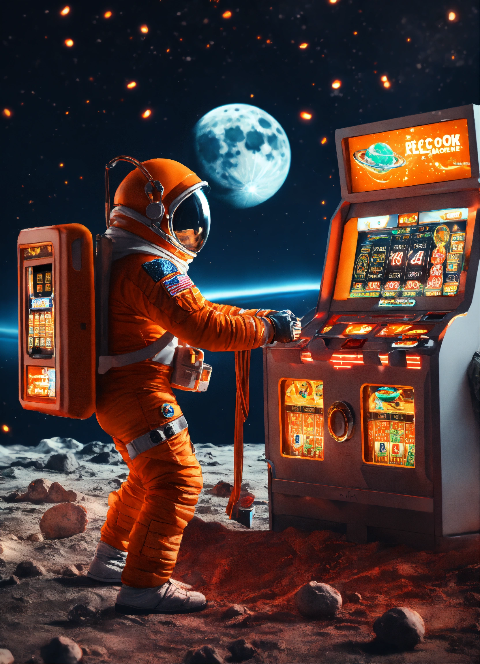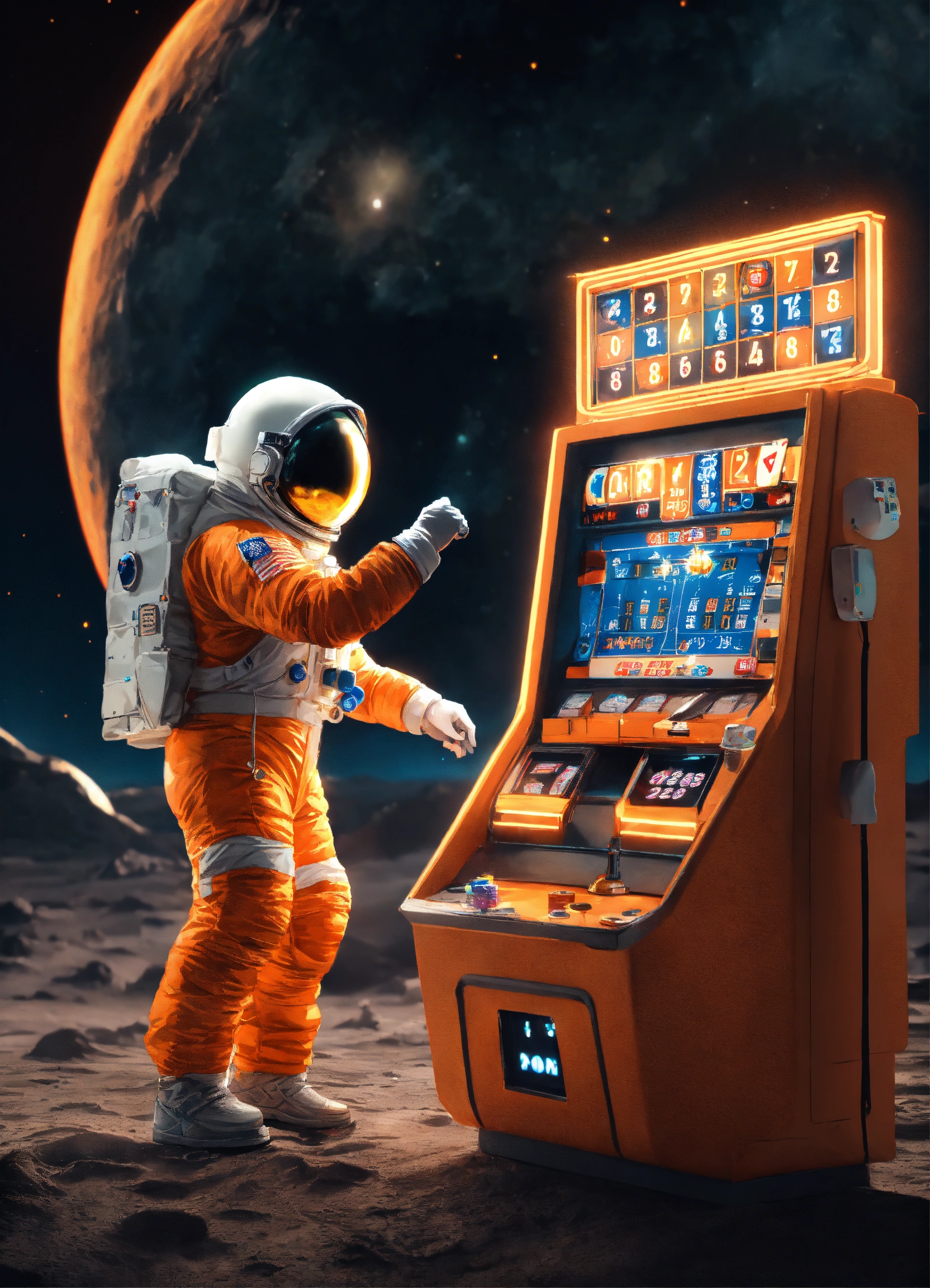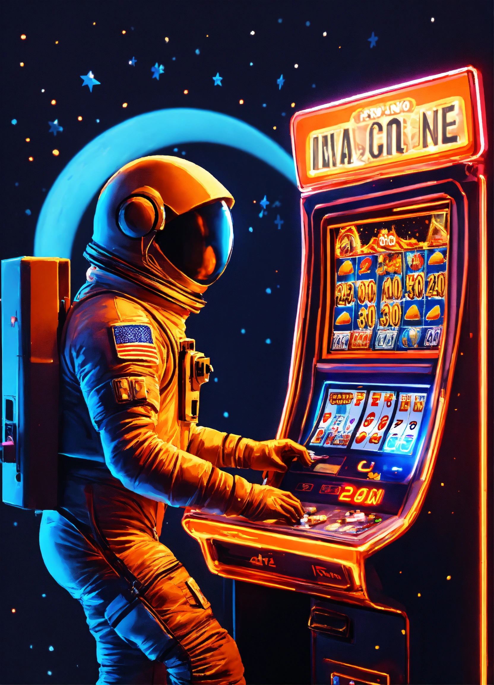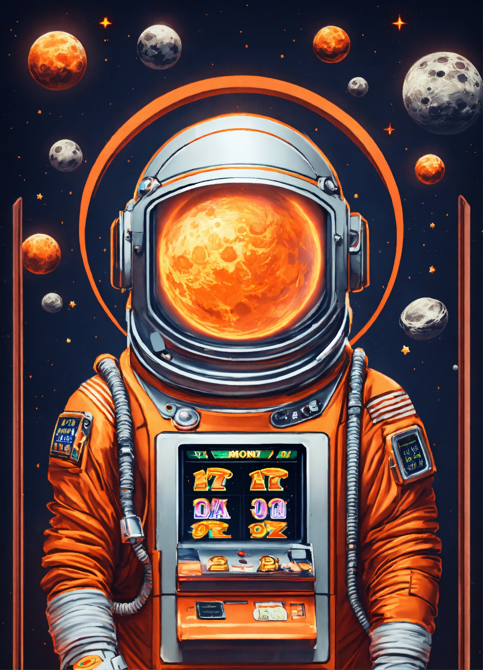 Cute astronaut playing casino slot machine on the moon and win jackpot orange and gray neon 8k